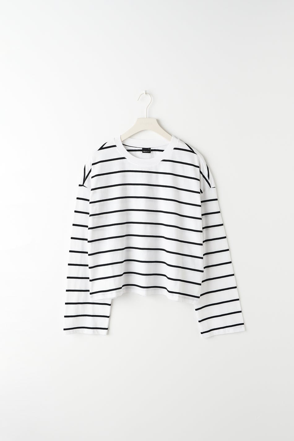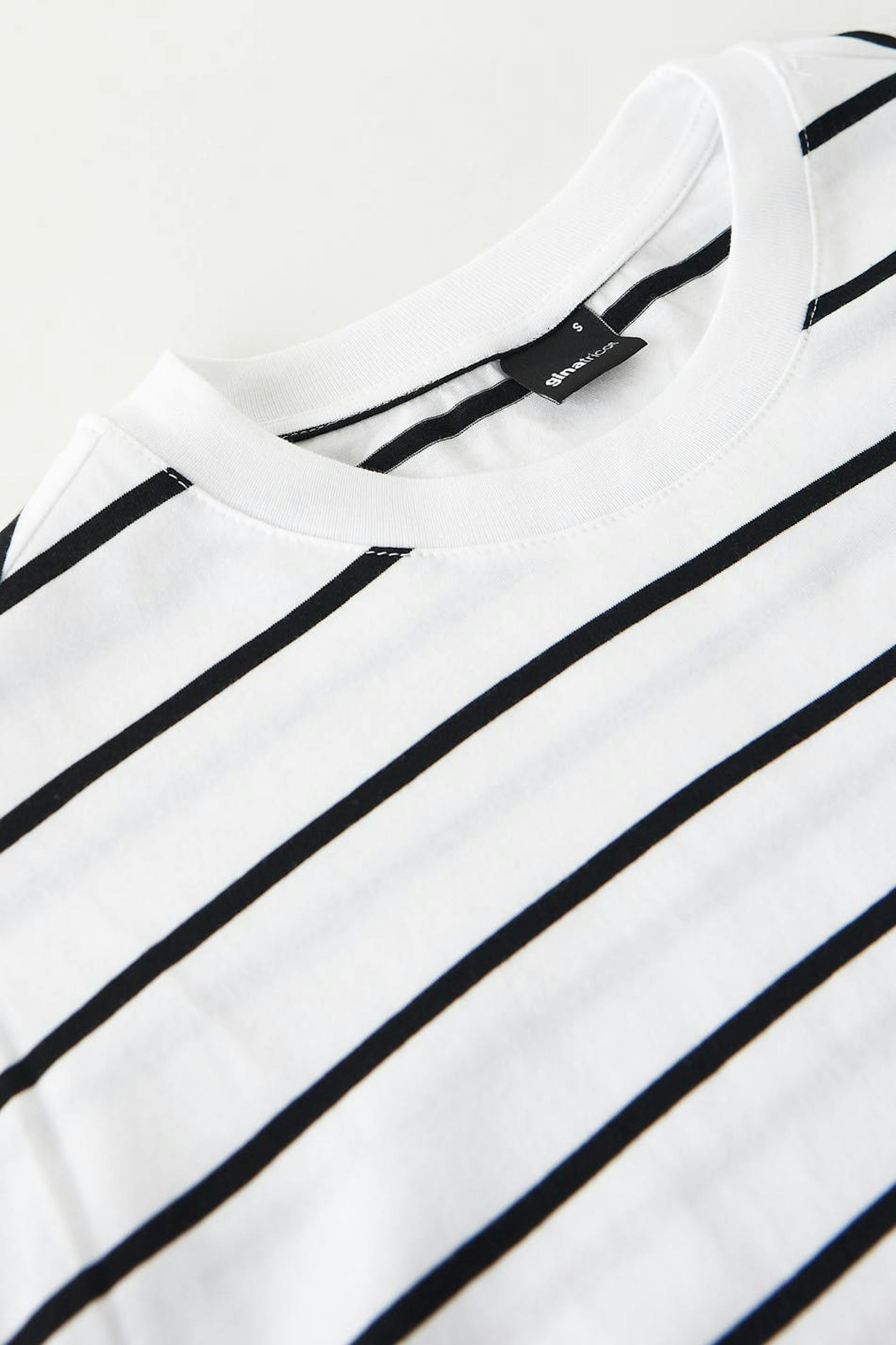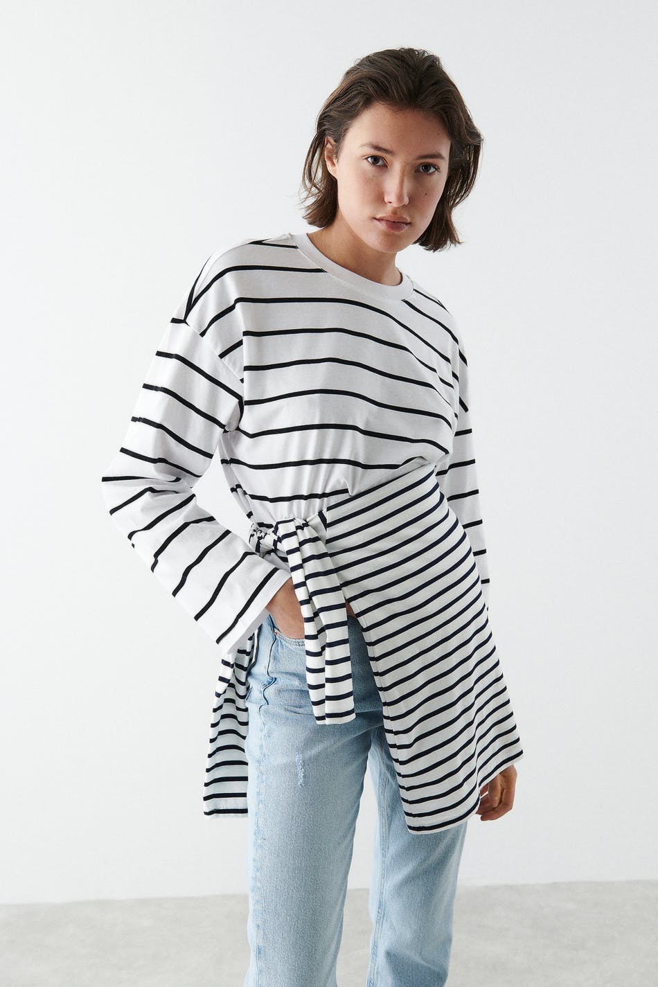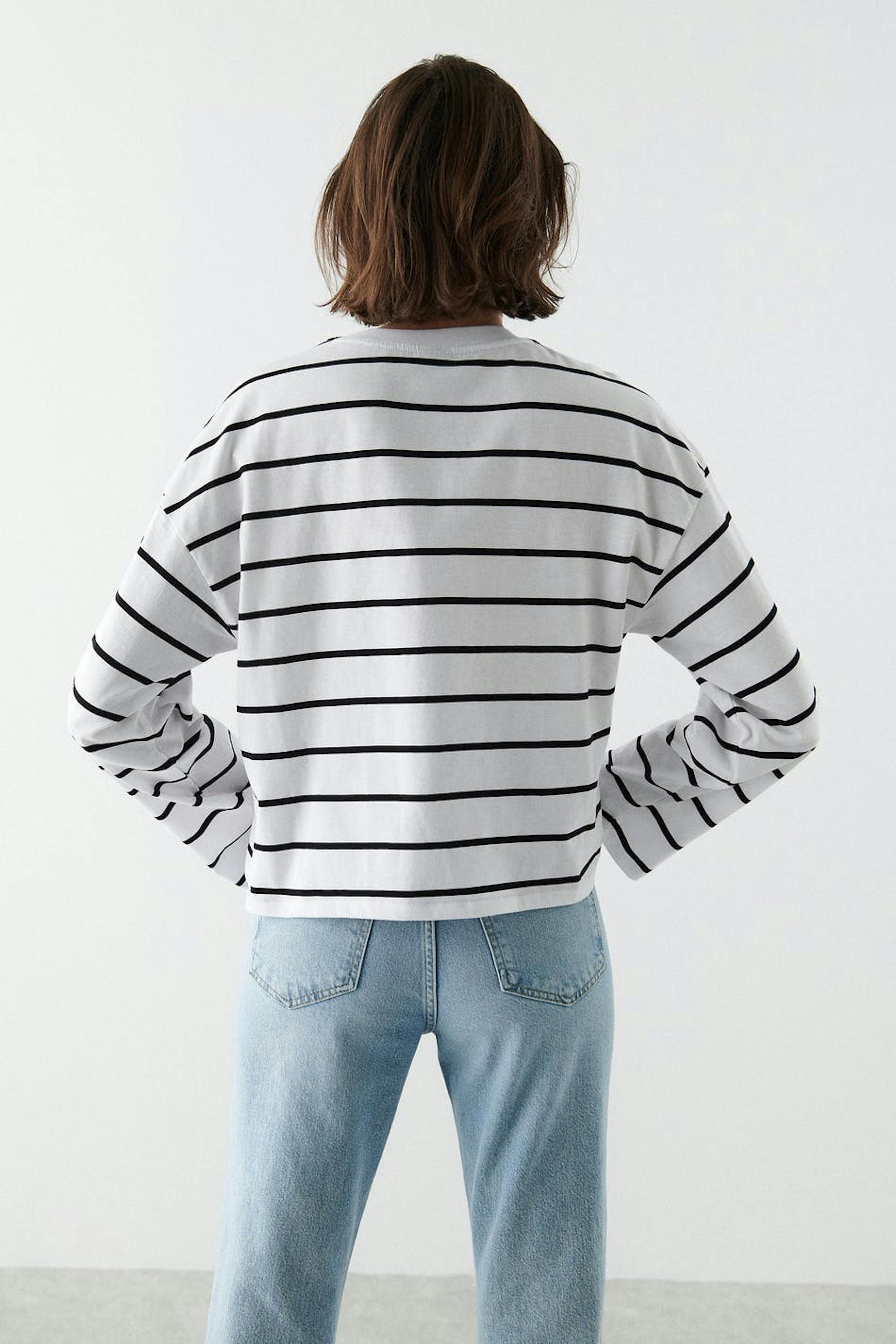 Gestreepte t-shirt met lange mouwen met een overmaatse pasvorm. Het t-shirt is wit, zwart en boxy. Het is gemaakt van tricot en heeft een ronde halslijn.