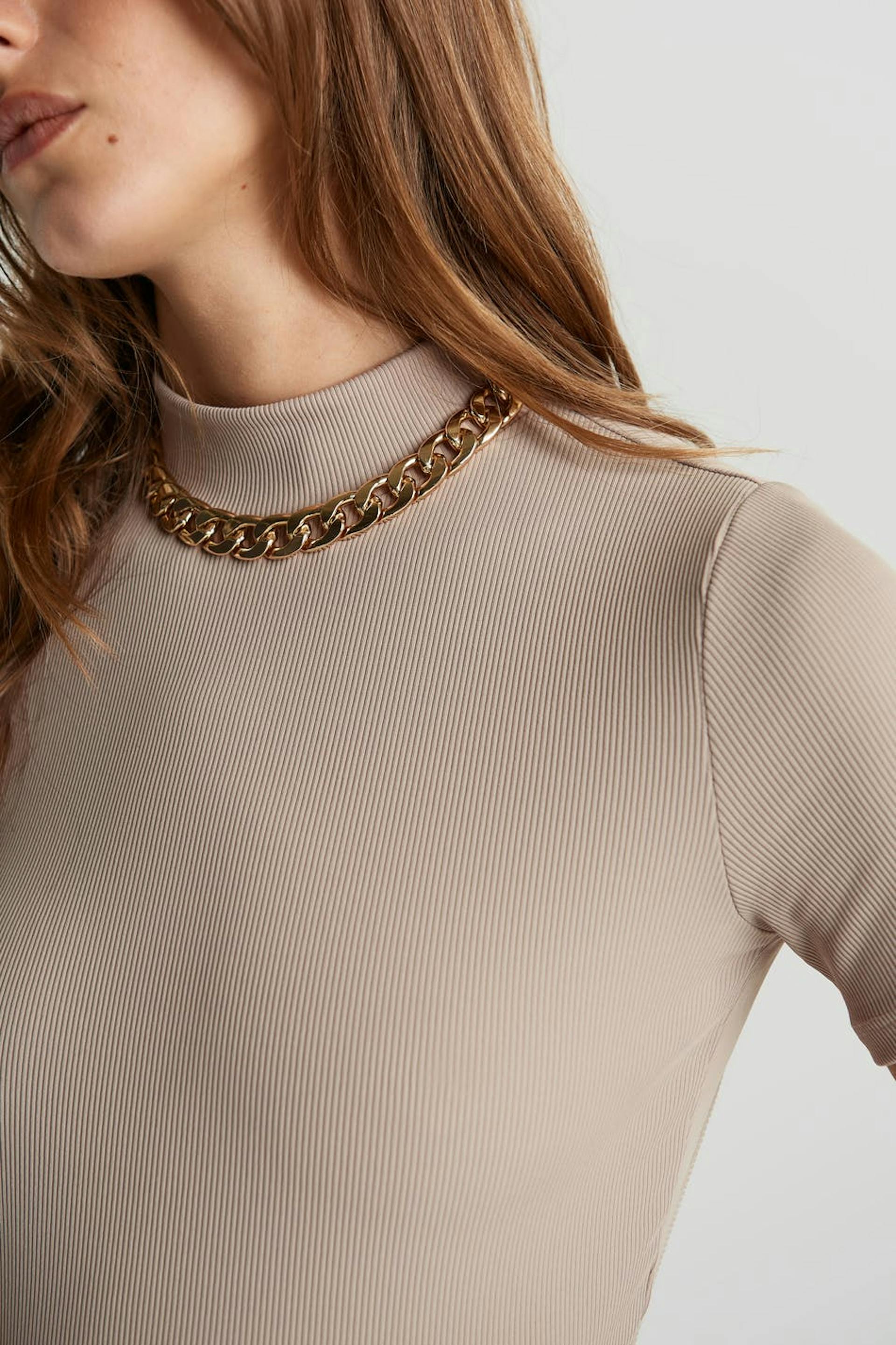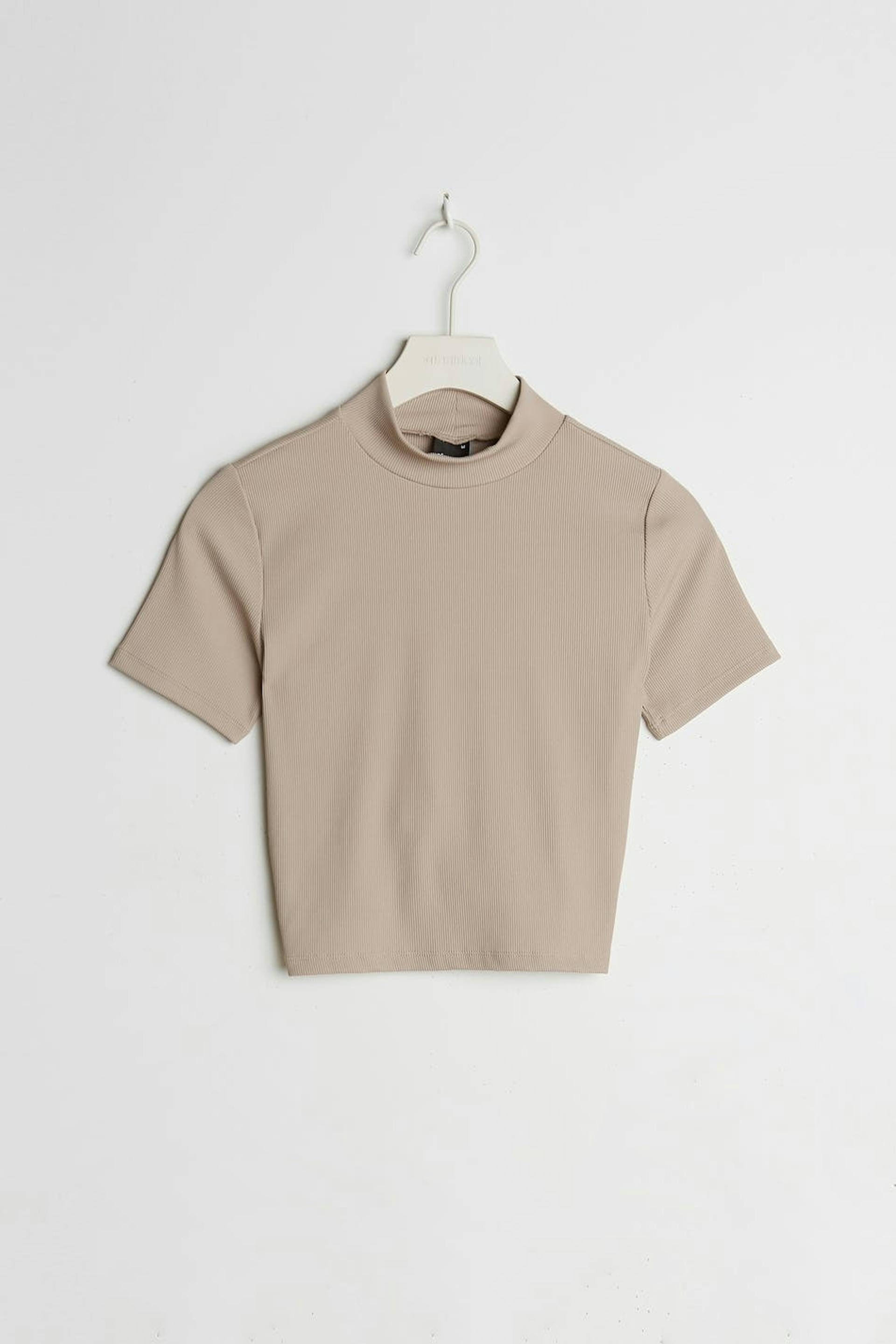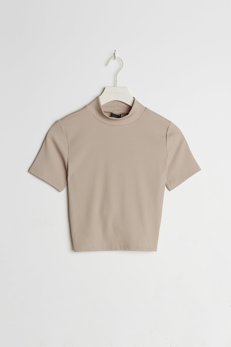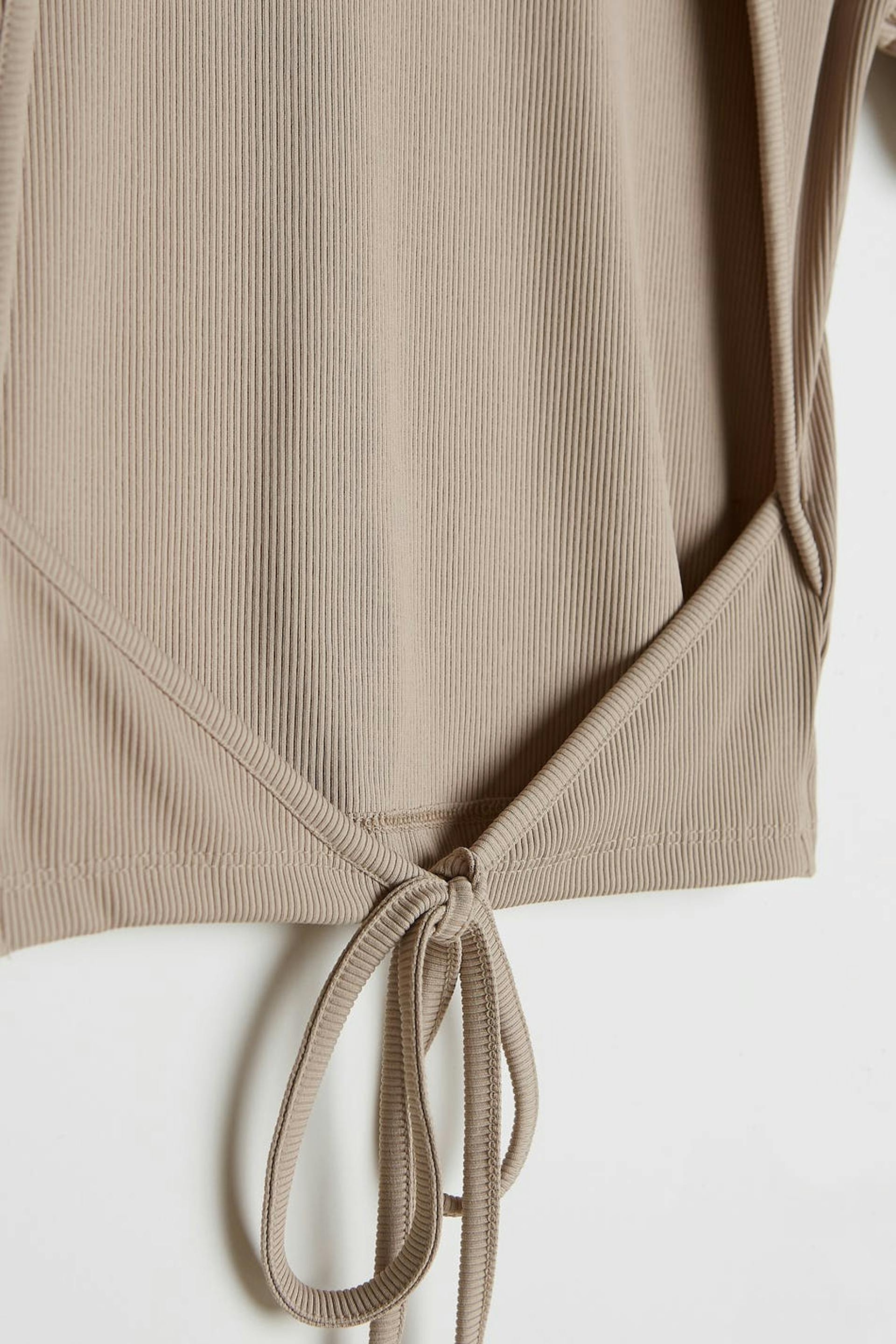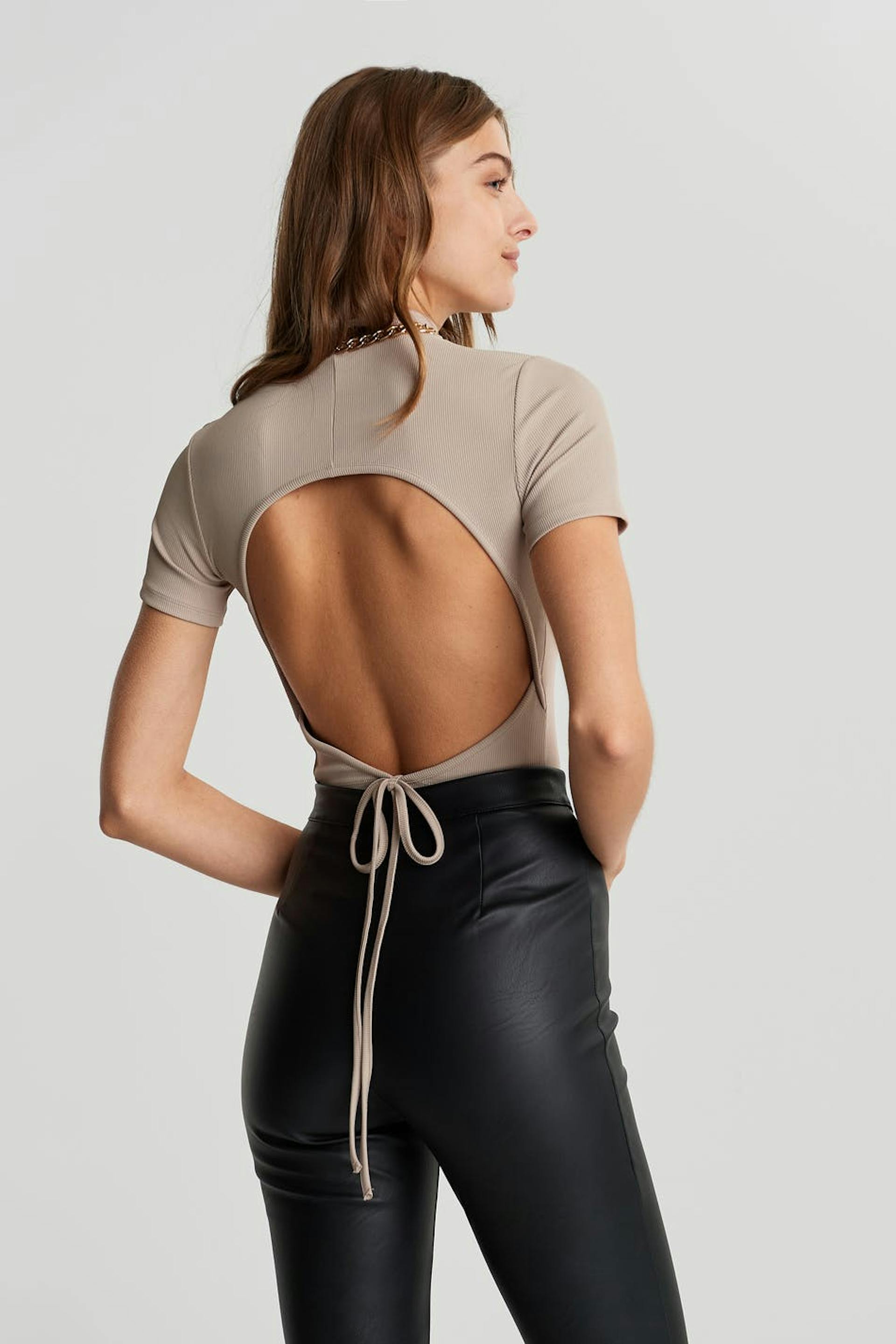 Top met korte mouwen en een nauwsluitende pasvorm. De top is beige en zacht en heeft een blote rug ontwerp. Het heeft een hoge hals en een zelfbinder aan de onderrug.