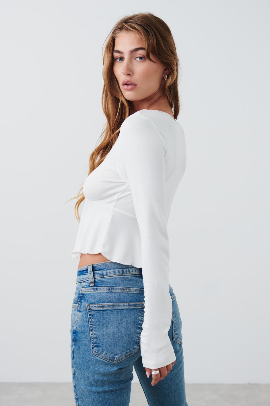 Topje met lange mouwen van tricot met details van kant aan de voorkant en aan de halslijn. Het topje is wit en heeft decoratieve zoom detail onder de boezem. Het heeft nauwsluitende pasvorm, v-hals, boog detail aan de voorkant en afgesneden lengte.