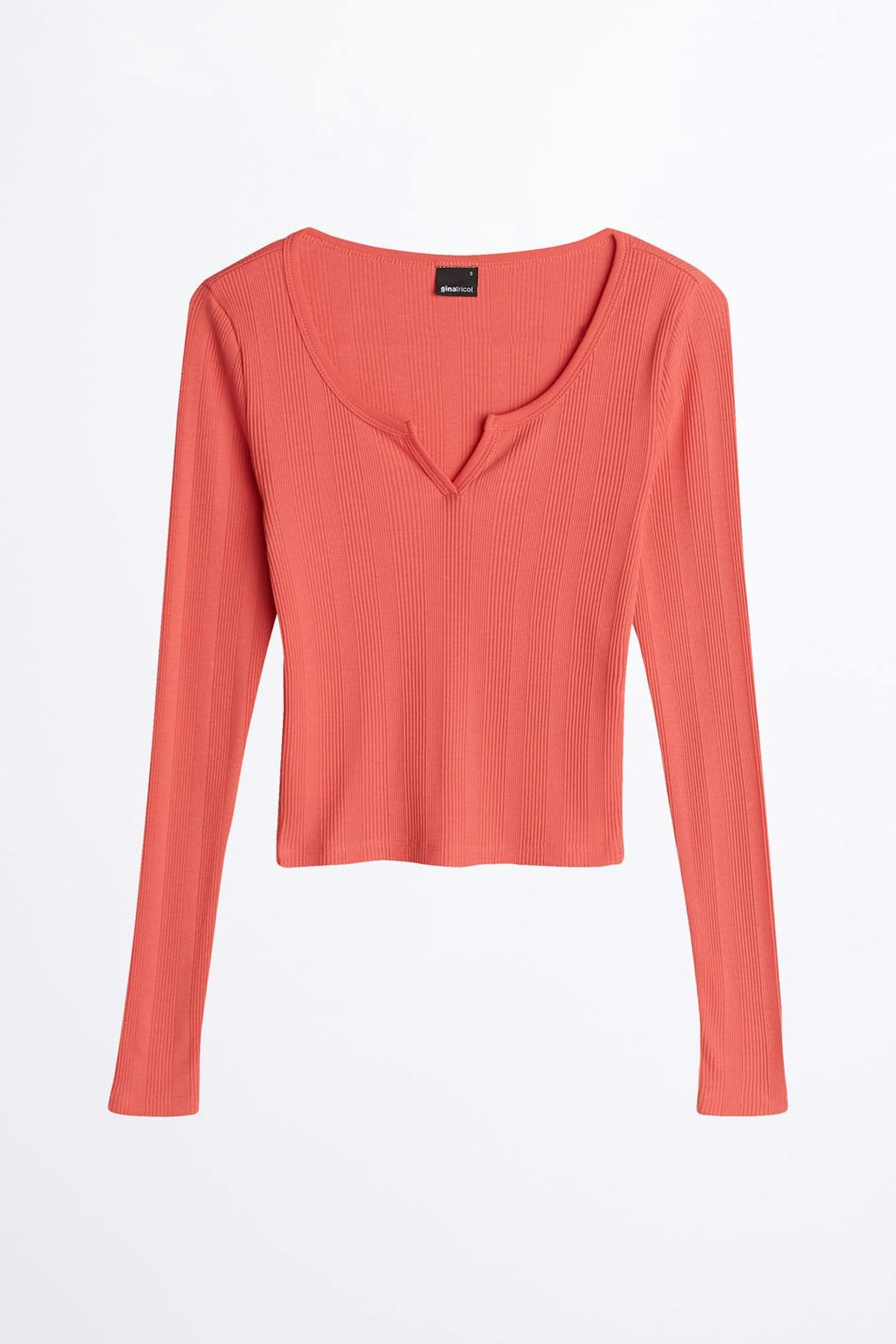 Geribbelde top met een nauwsluitende pasvorm. De top is oranje en heeft lange mouwen. Het heeft een ronde neklijn met een smalle v-hals.
