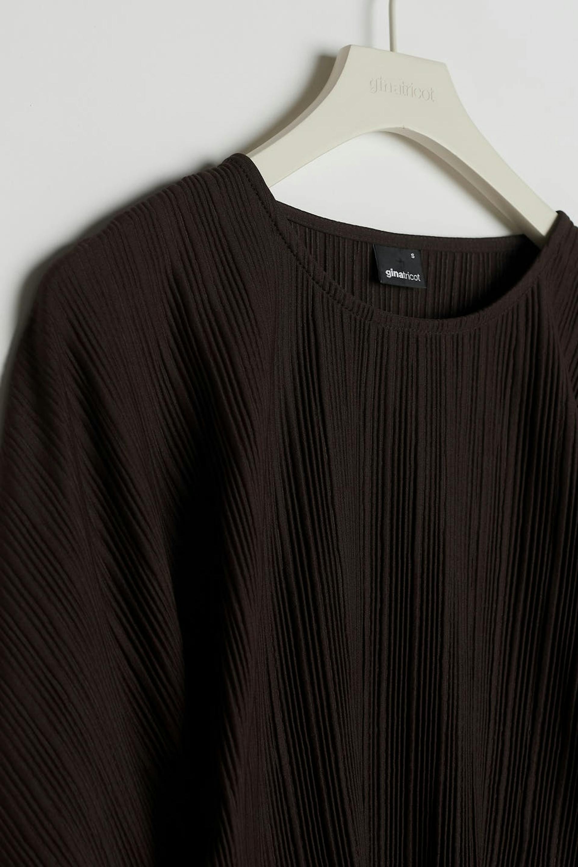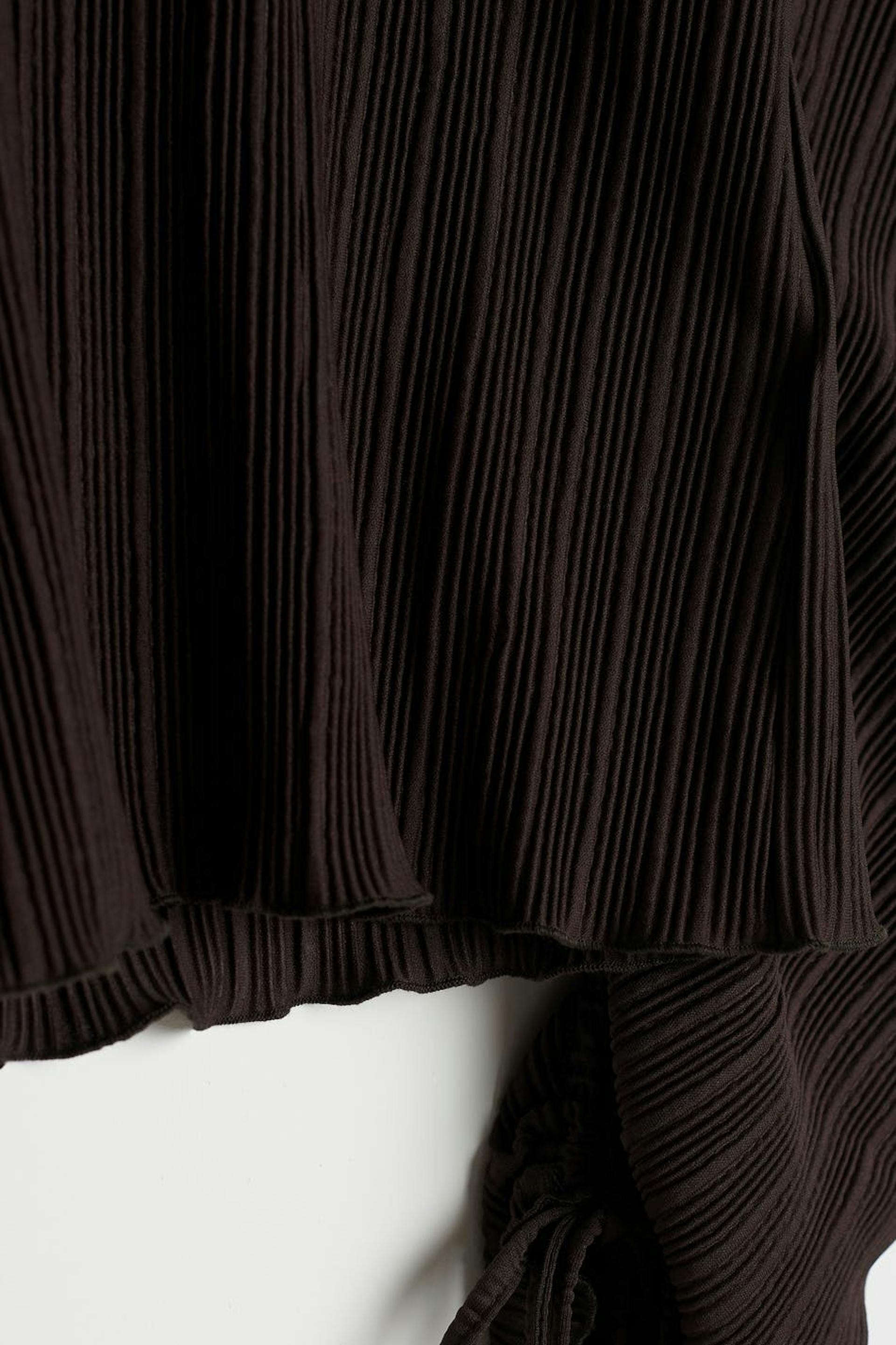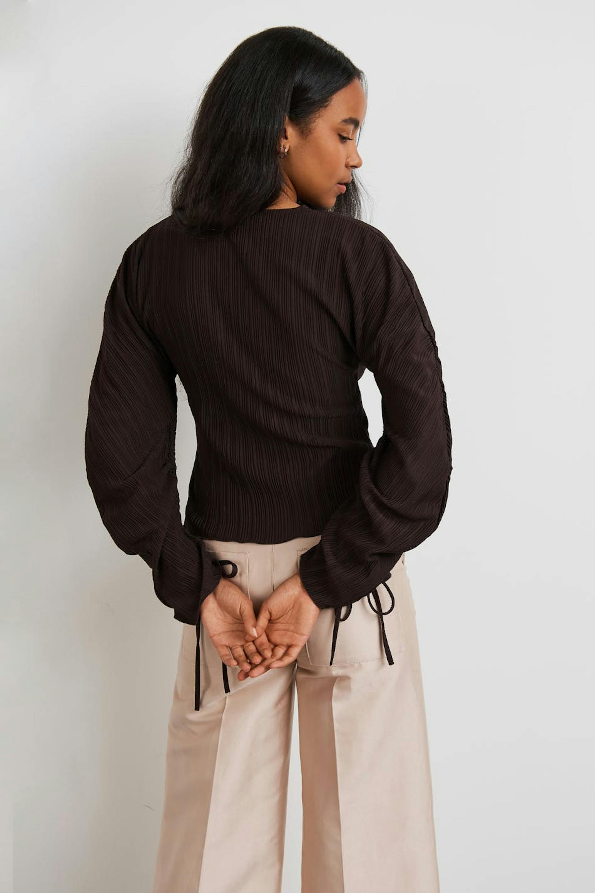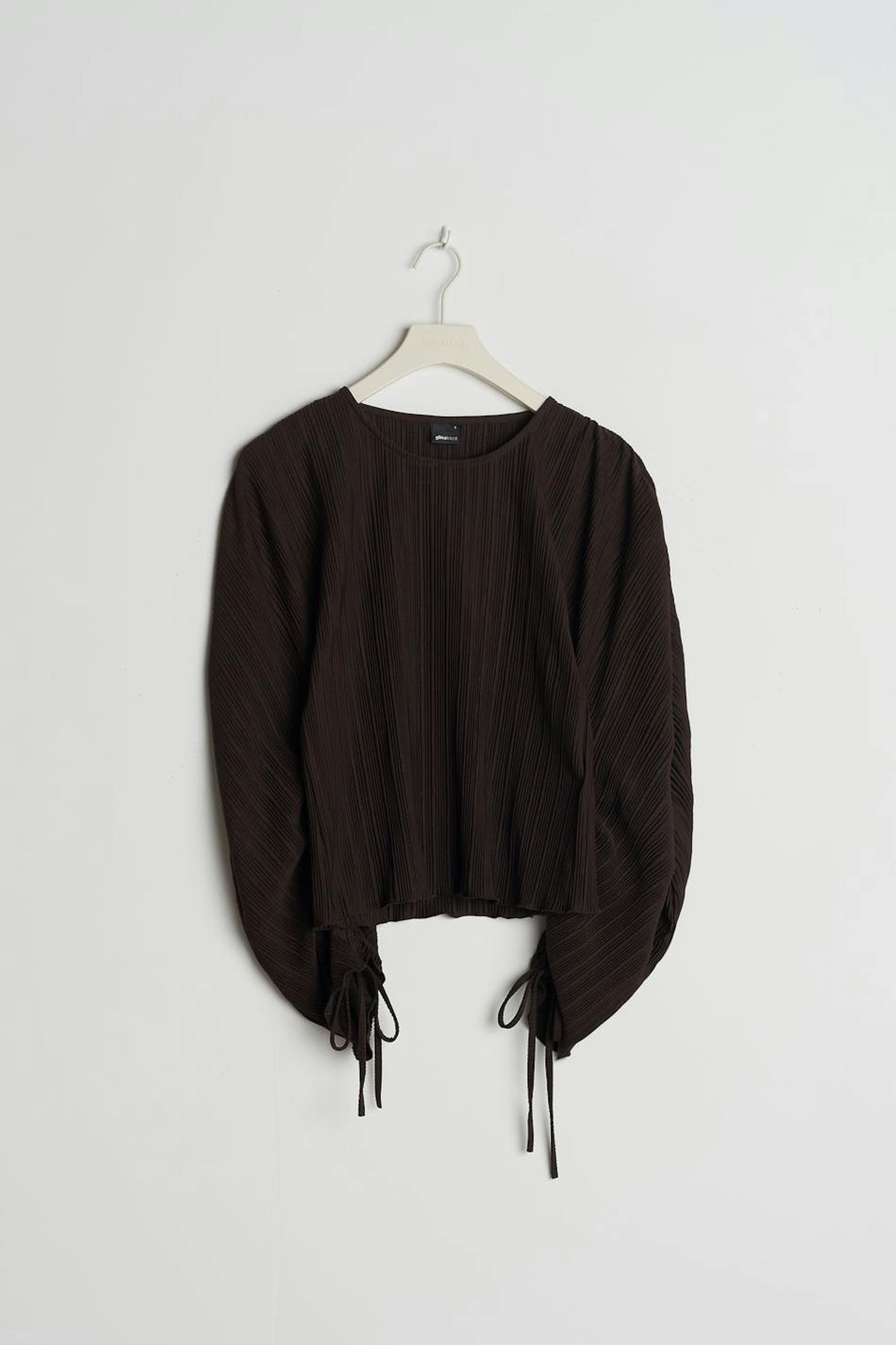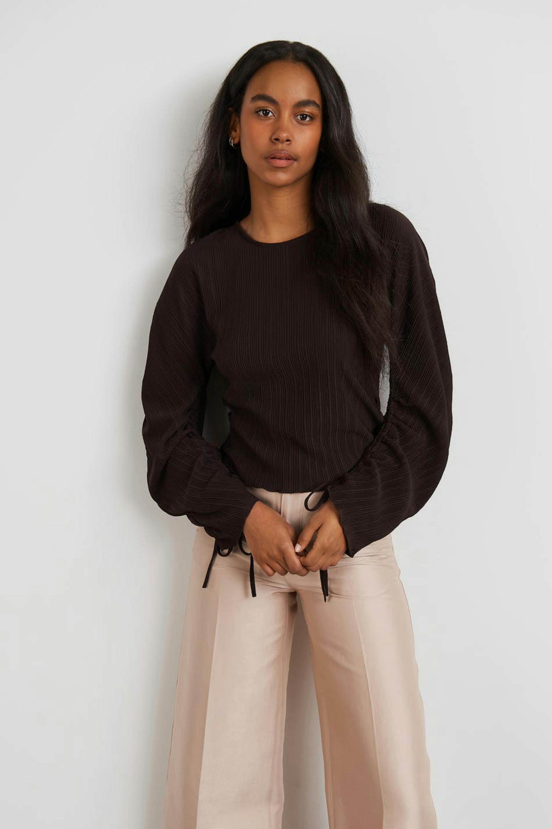 Geplisseerd topje met een normale pasvorm. Het topje is bruin en heeft een ronde halslijn. Het heeft een verstelbaar trekkoord op de mouwen met een zelfbinder aan de uiteinden van de mouwen en een kortere lengte.
