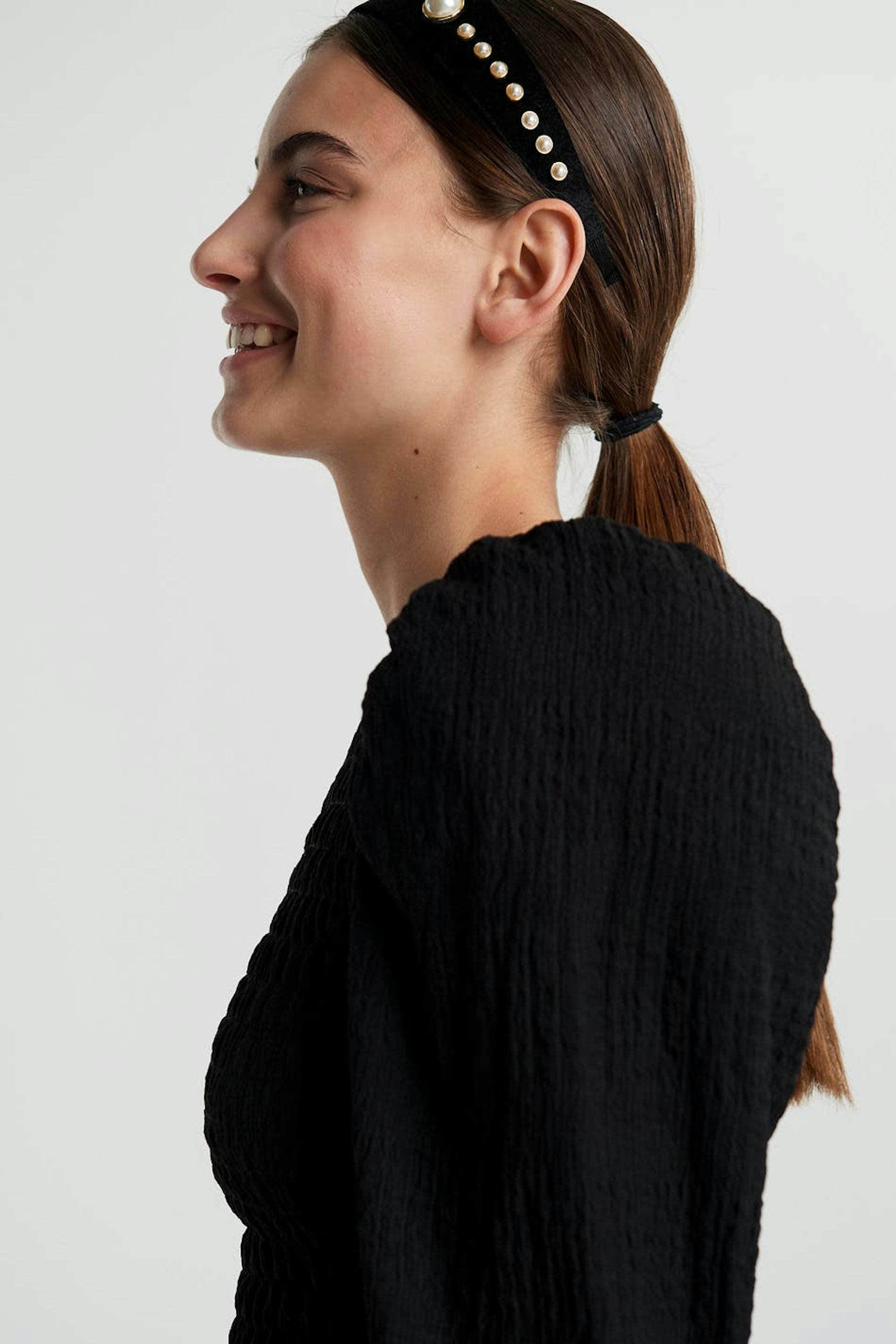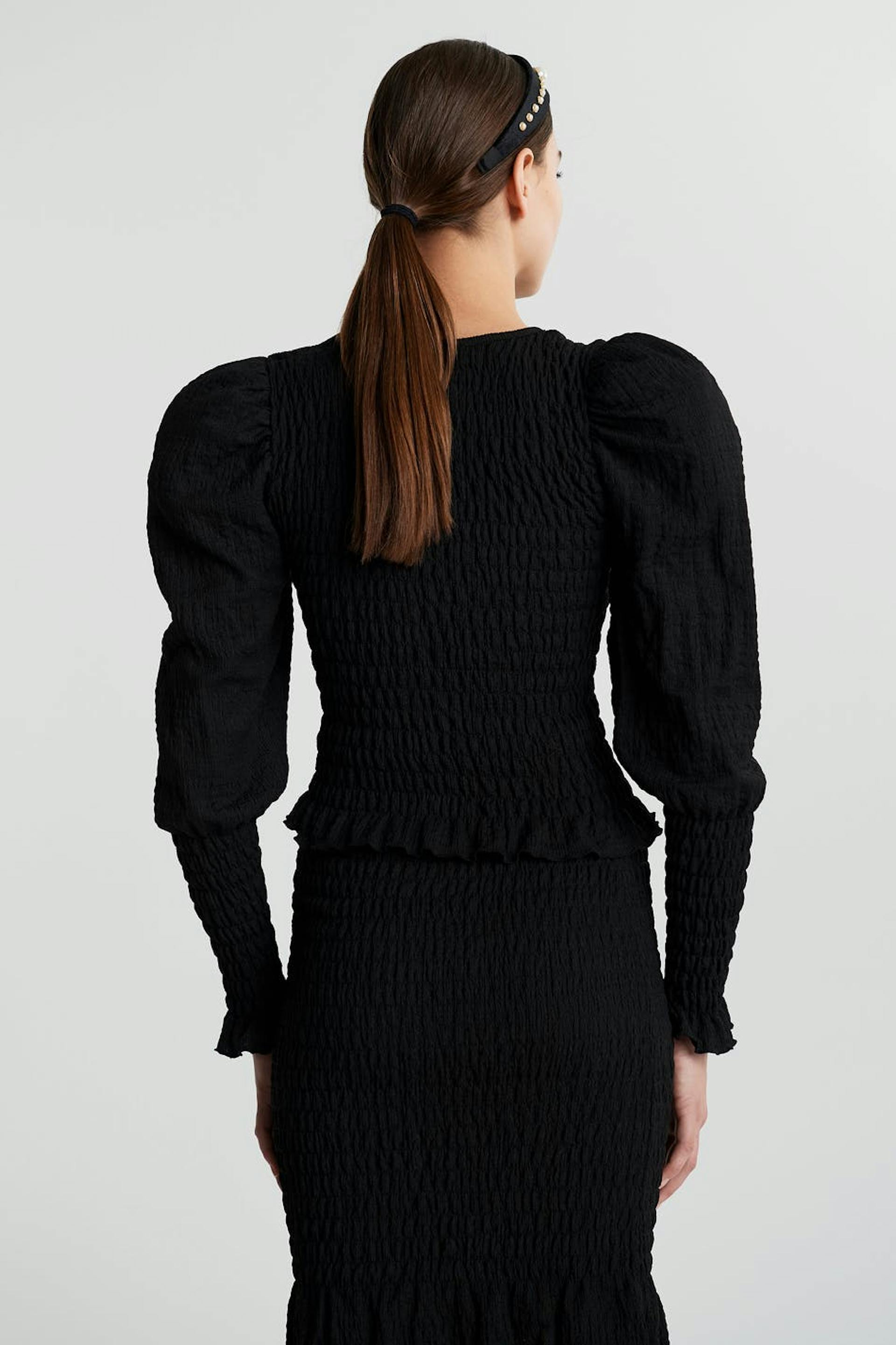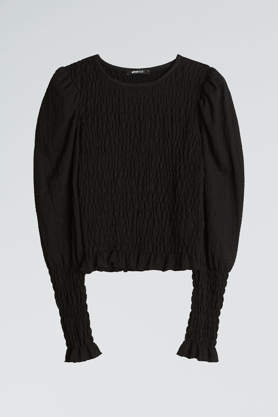 Jersey top with smock at body and sleeves. Puff sleeve. Tight fit. Part of a set. Supplier: Kardem Tekstil San ve Tic A.S. Production unit: Kardem Kesan Fabrikasi