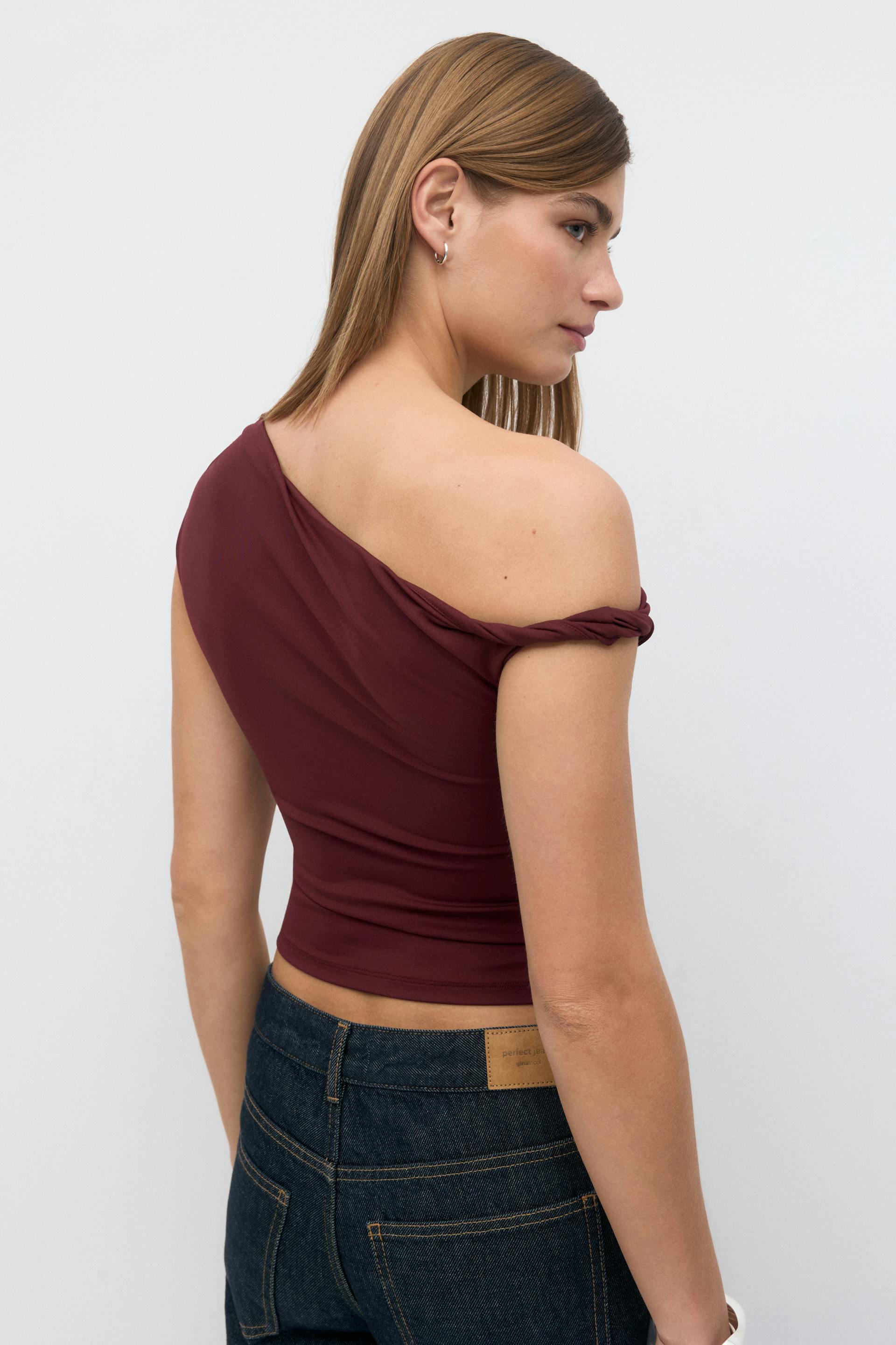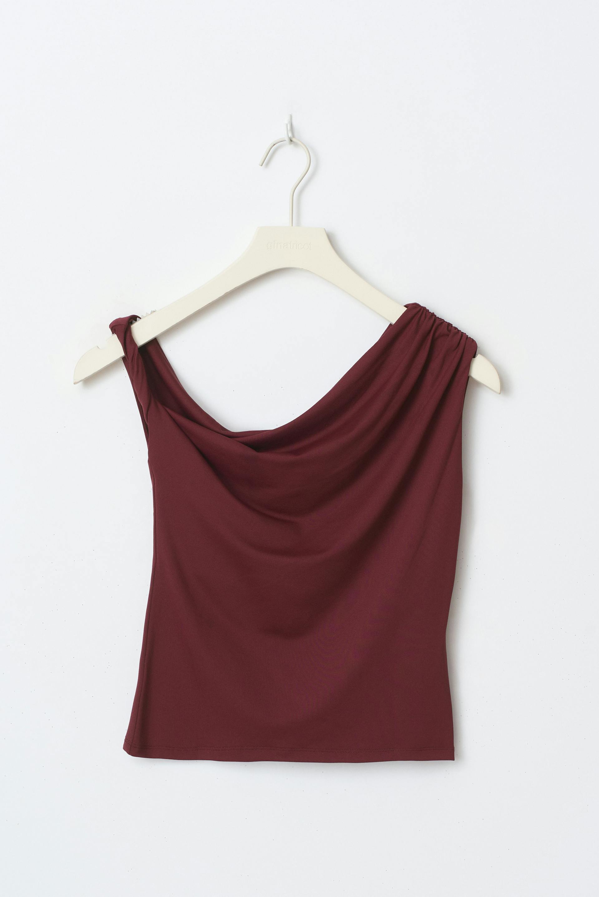 One shoulder topje met gedraaide schouderriem. Het topje is wijnrood en heeft asymmetrische neklijn.