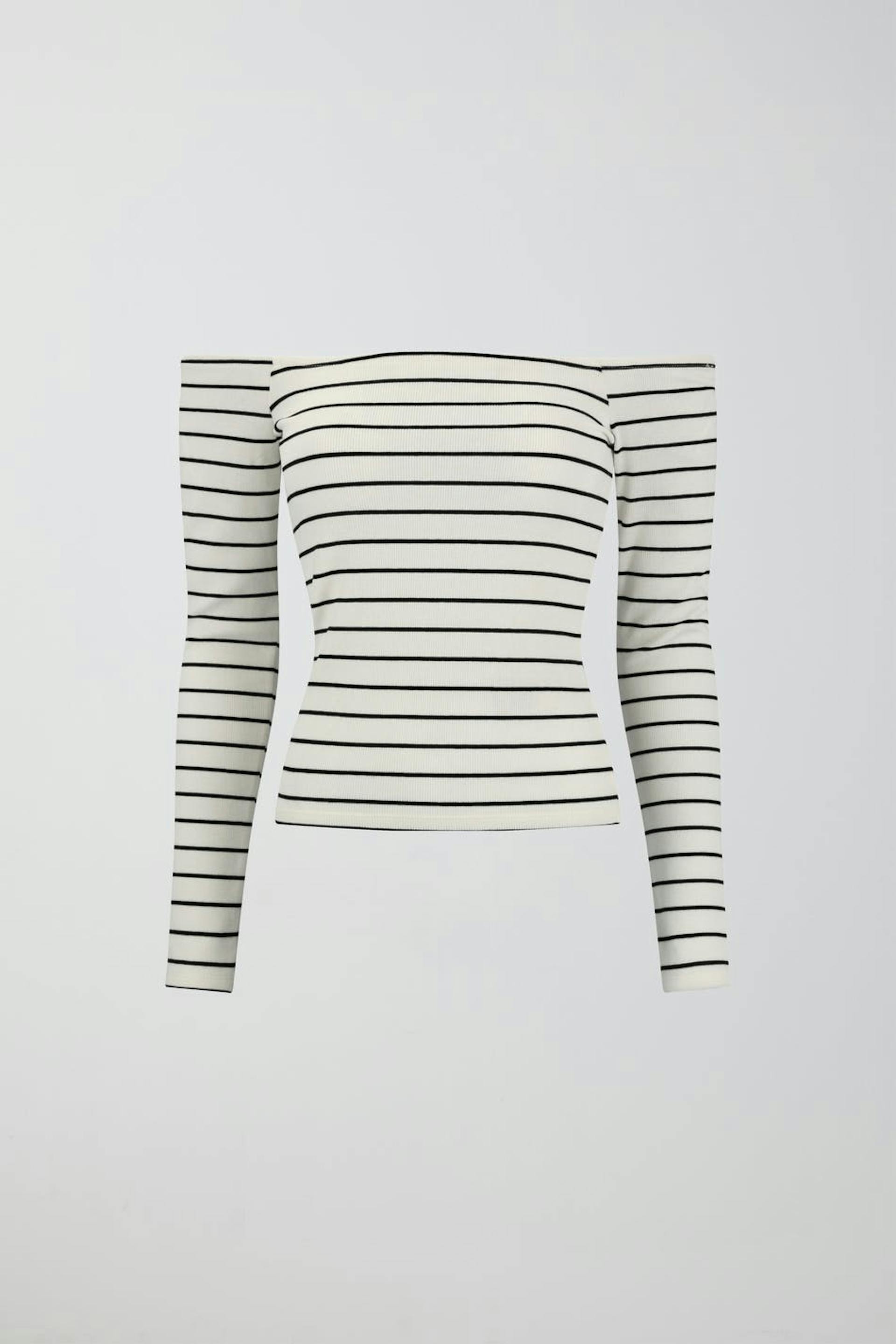 Off shoulder topje met lange mouwen van tricot met nauwsluitende pasvorm. Het topje is zwart, wit en geribbeld.