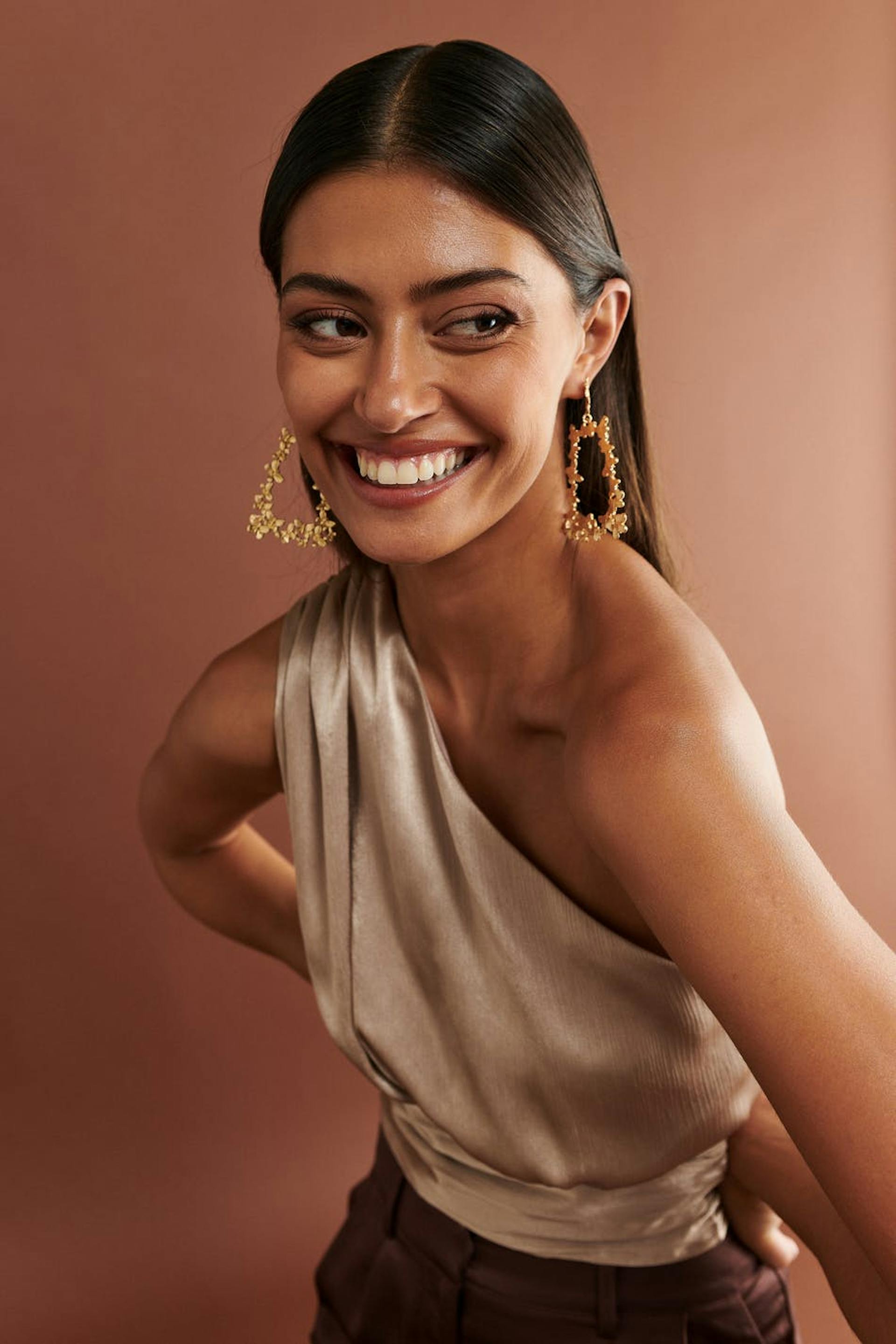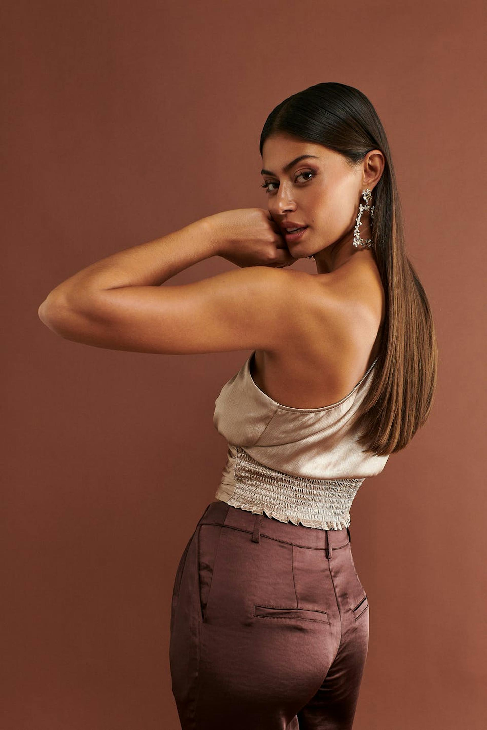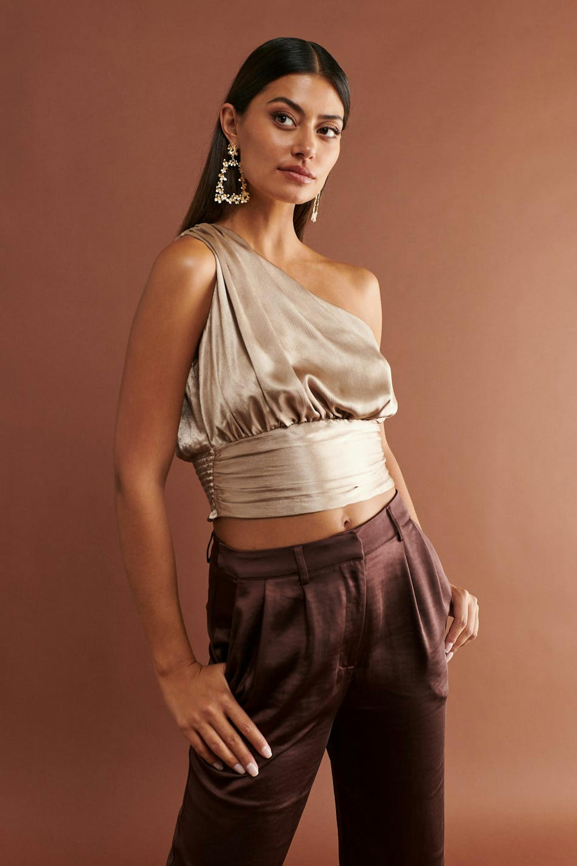 Afgesneden one shoulder topje van satijn met vergaard effect. Het topje is perfect voor het feest, beige en mouwloos. Het is perfect voor het feest en heeft smokwerk achter en een gekreukt materiaal.