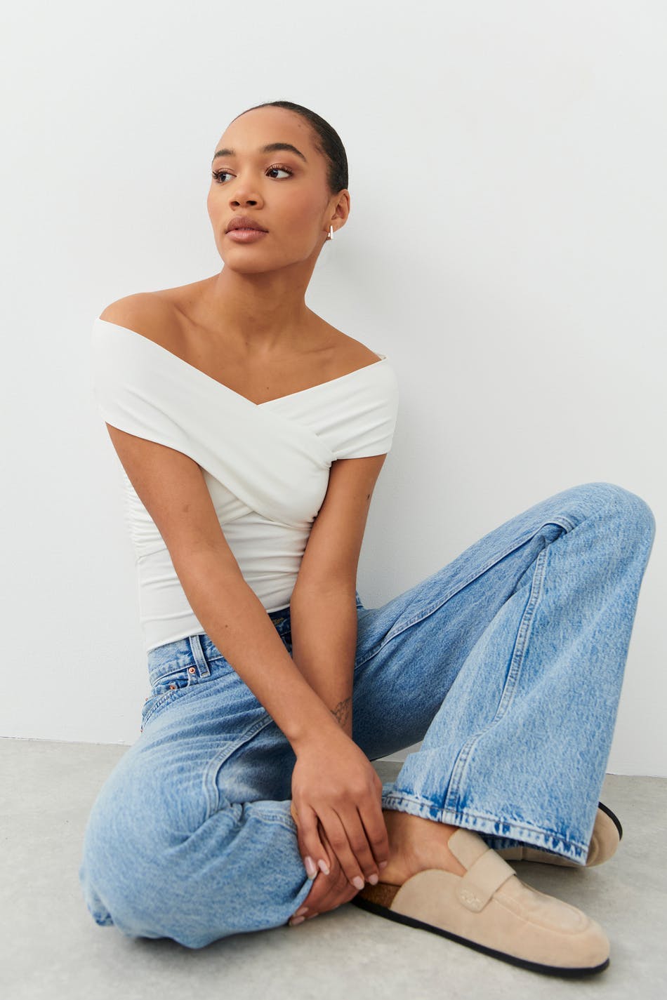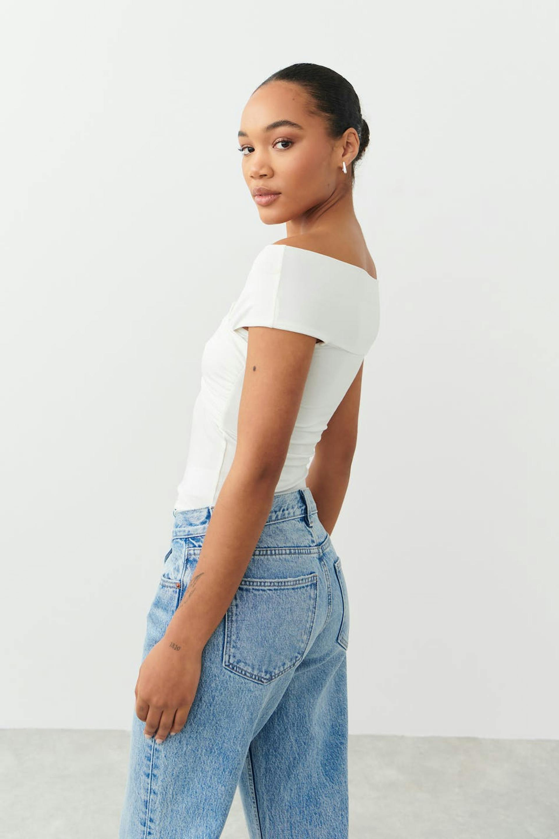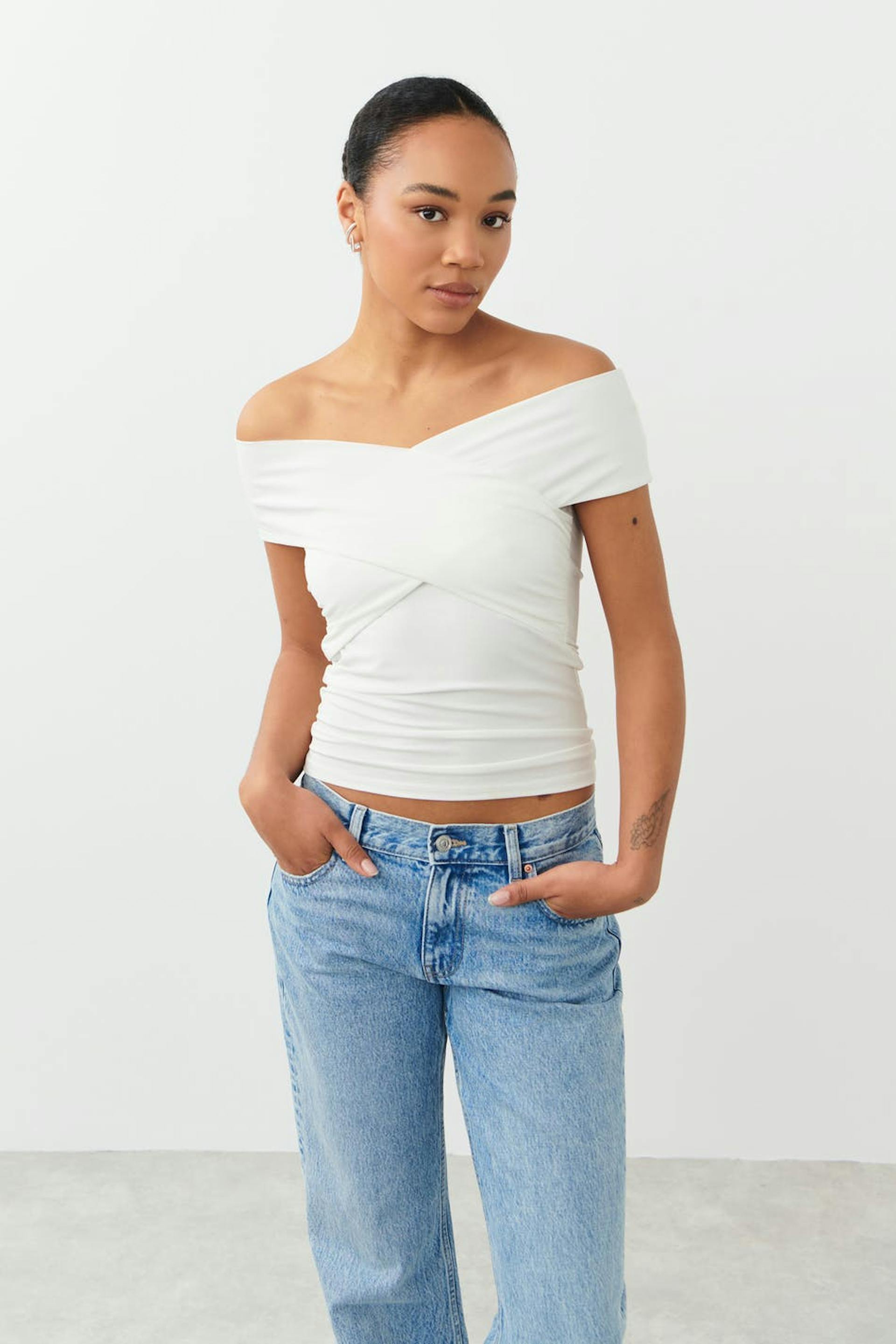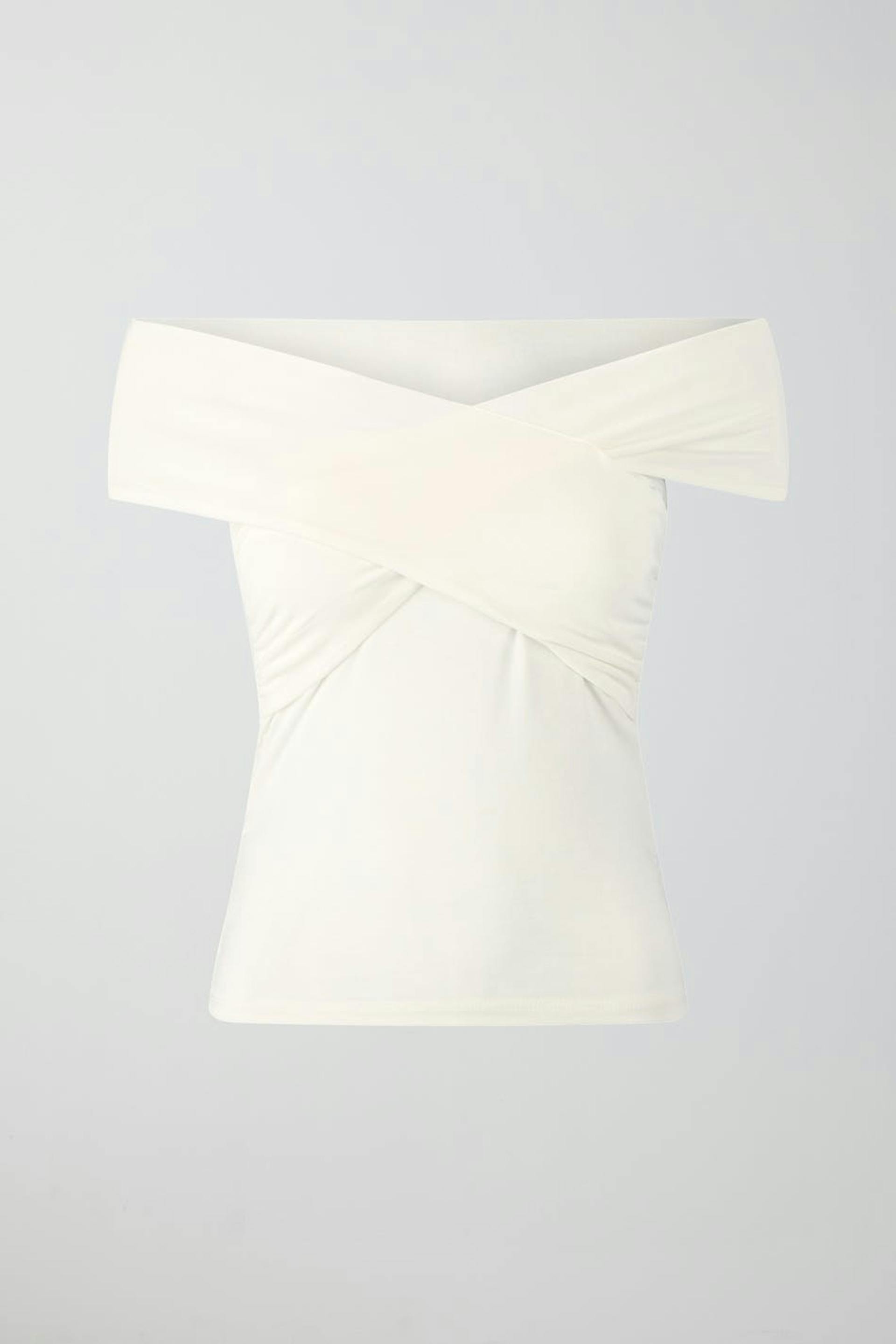 Soft touch – second skin comfort. Zacht off shoulder topje met omslagdoek aan de voorzijde. Het topje is wit en heeft nauwsluitende pasvorm.
