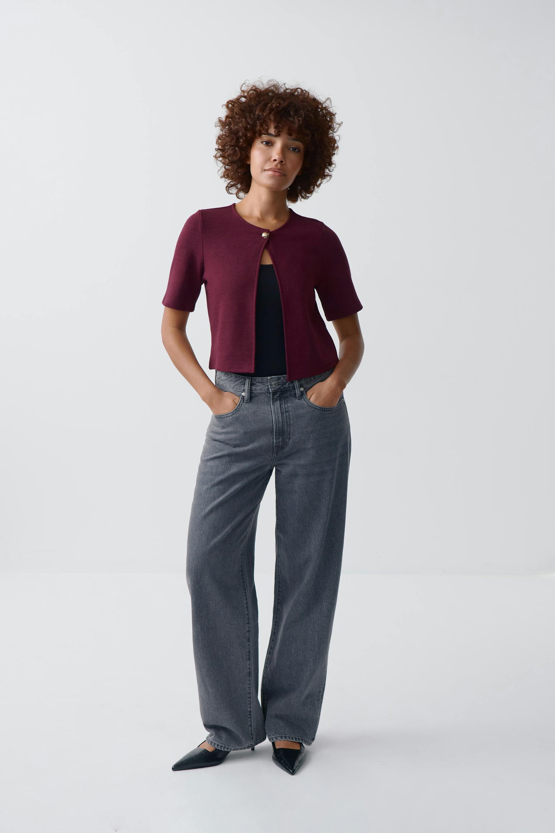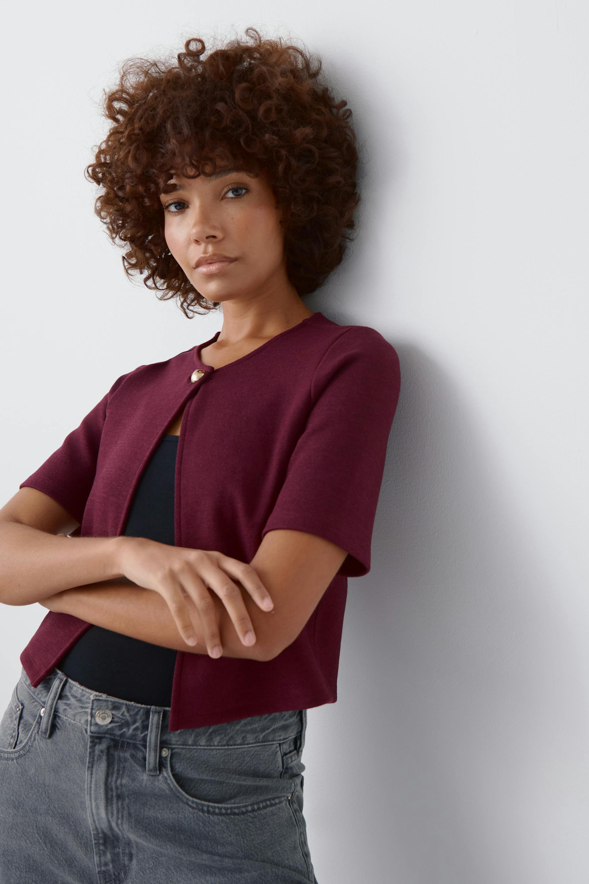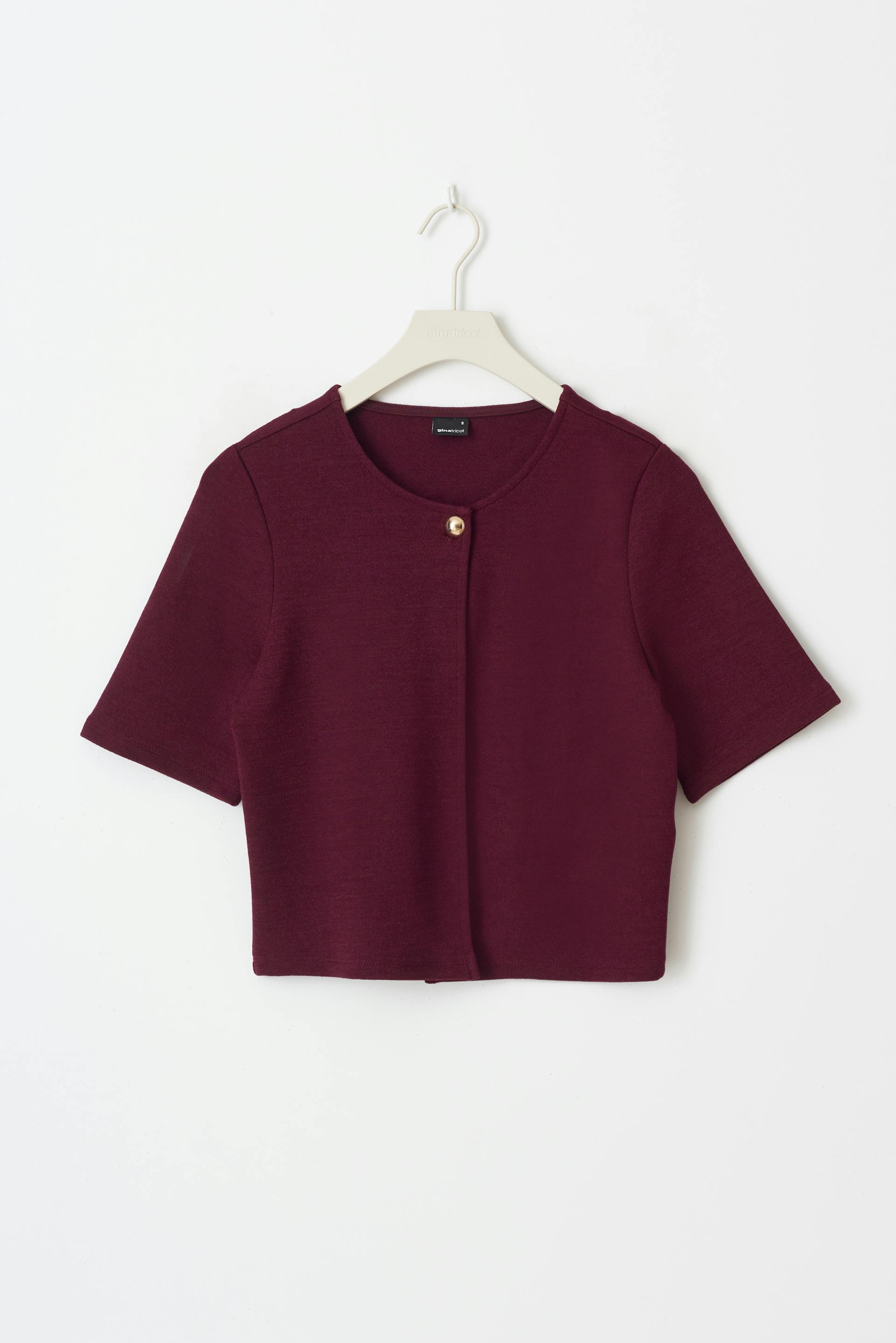 Topje met korte mouwen van zware jersey met gouden knop aan de bovenkant. Het topje is wijnrood en heeft ronde halslijn. Het heeft opening aan de voorkant, normale pasvorm en korte lengte.