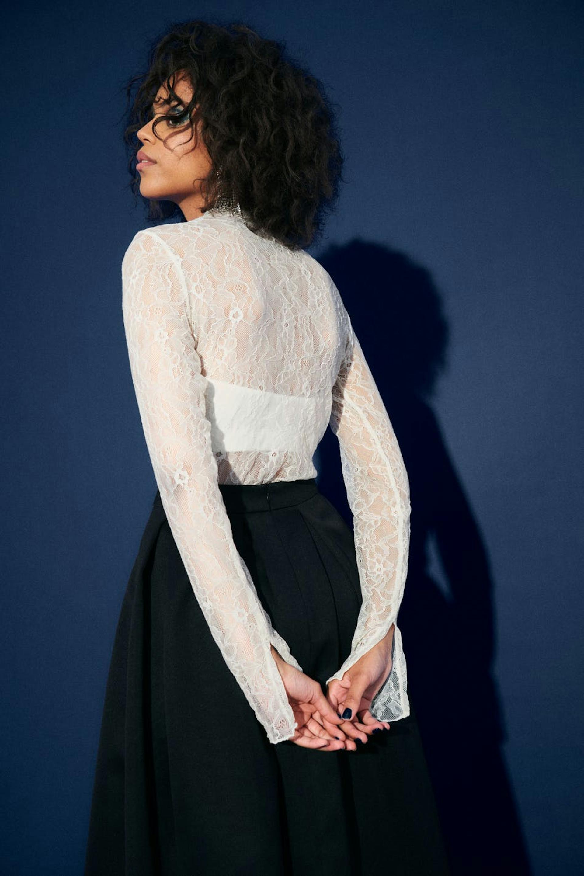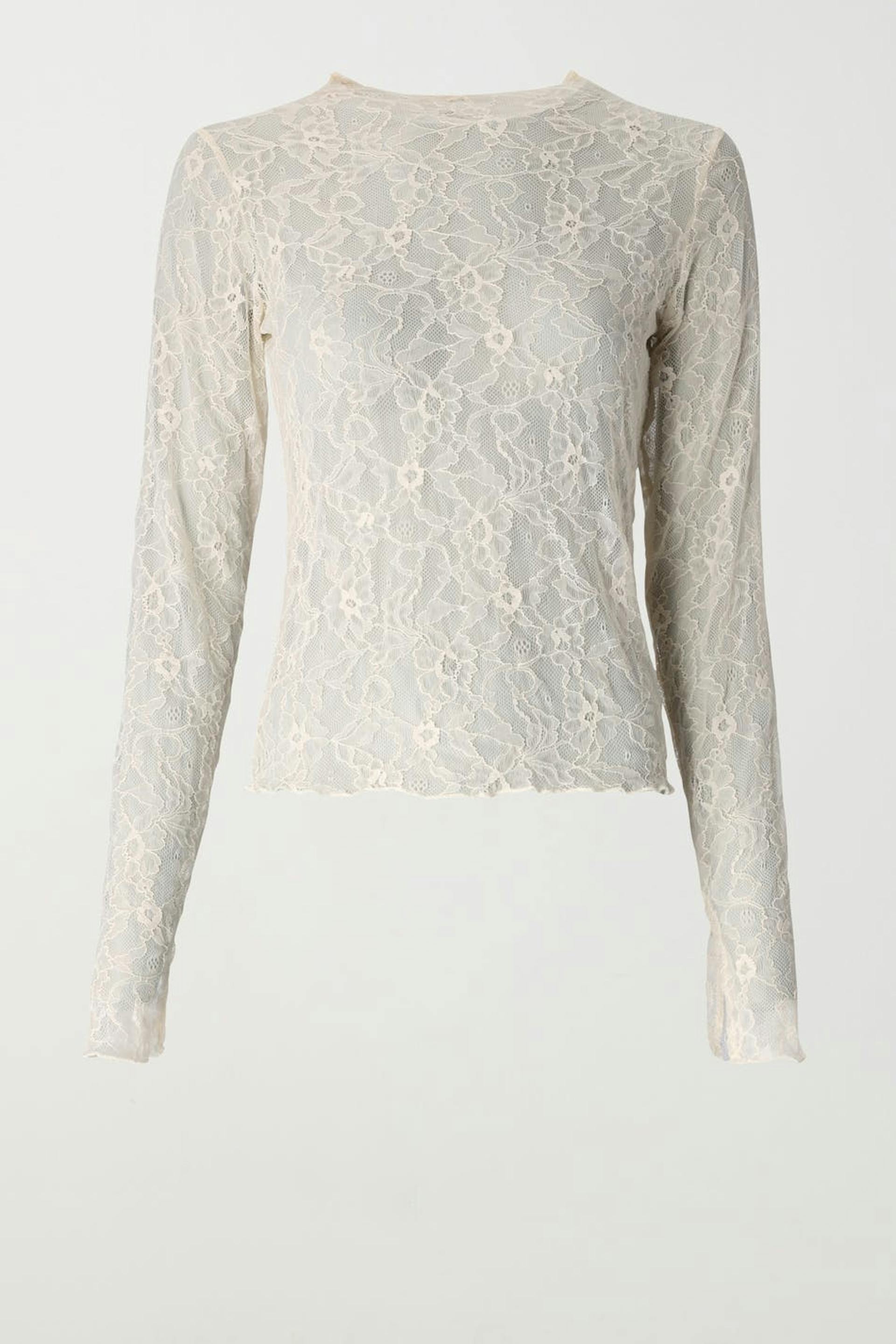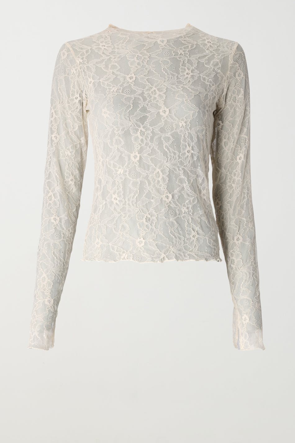 Kanten topje met hoge halslijn. Het topje is wit en heeft normale pasvorm. Het heeft gegolfde zoom en spleet aan de uiteinden van de mouwen.