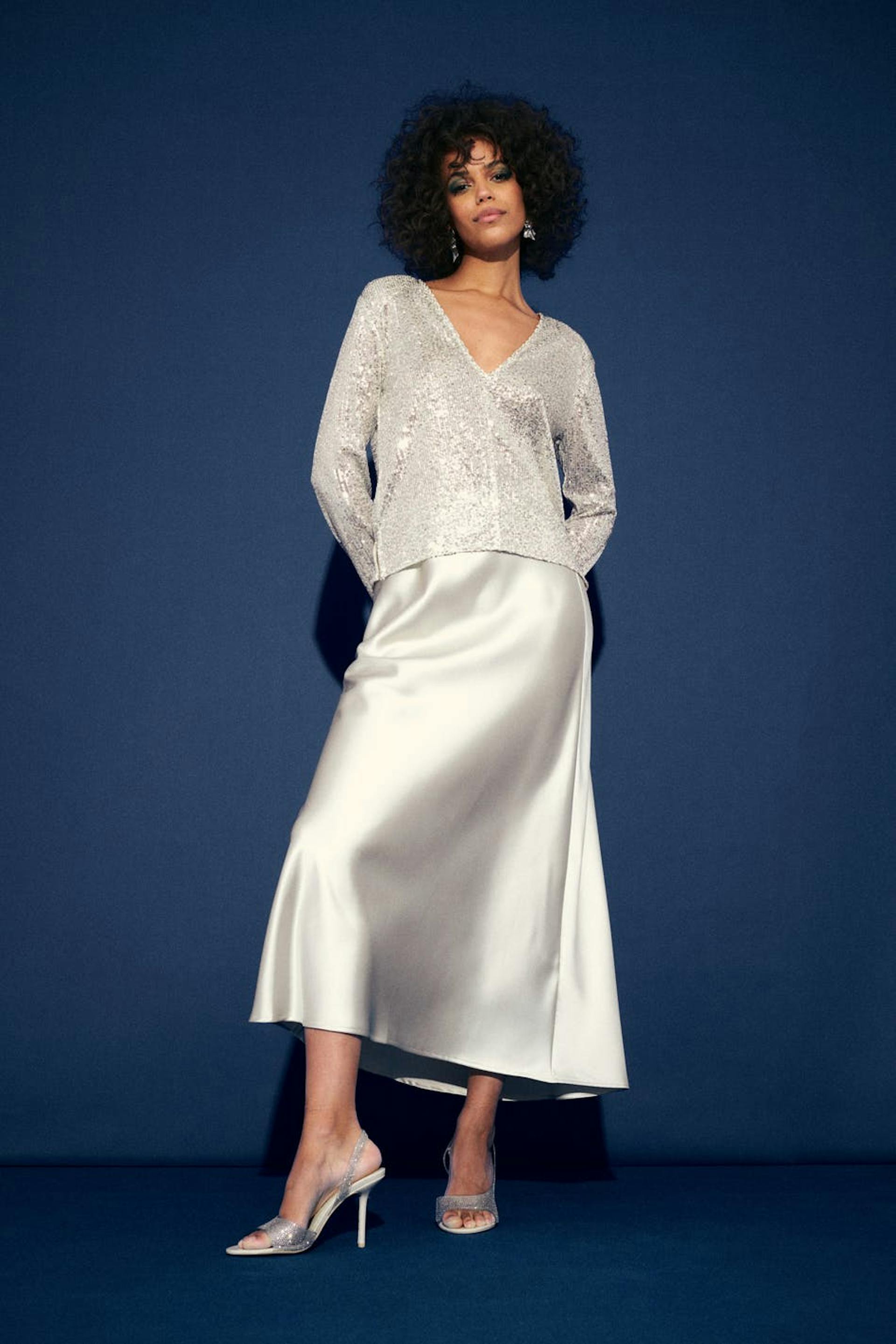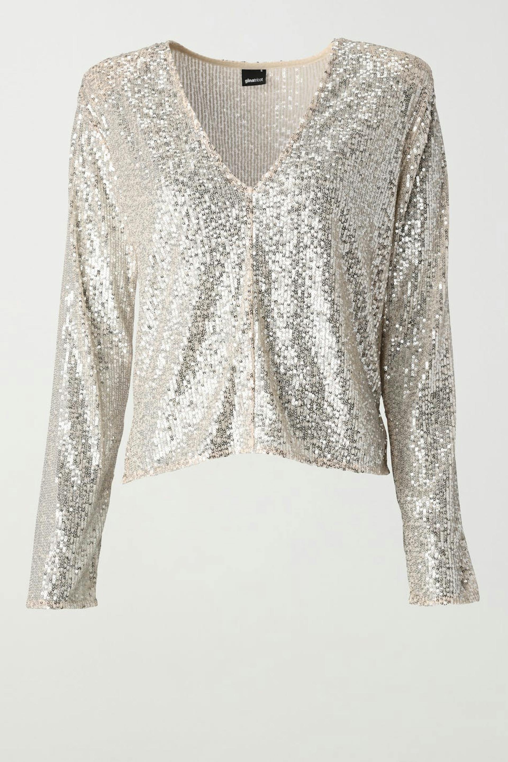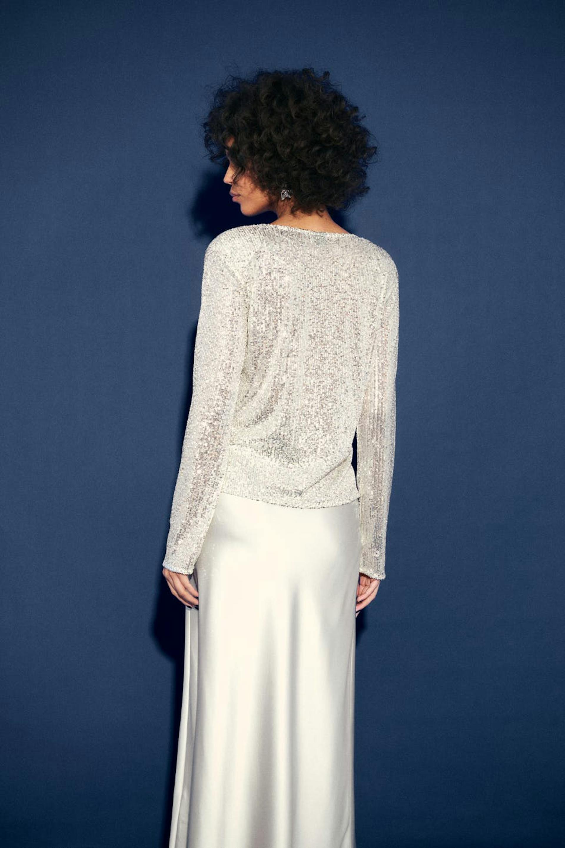 Topje met pailletten met lange mouwen met v-halslijn. Het topje met pailletten is zilverkleurig en heeft schoudervullingen. Het heeft overmaatse pasvorm.
