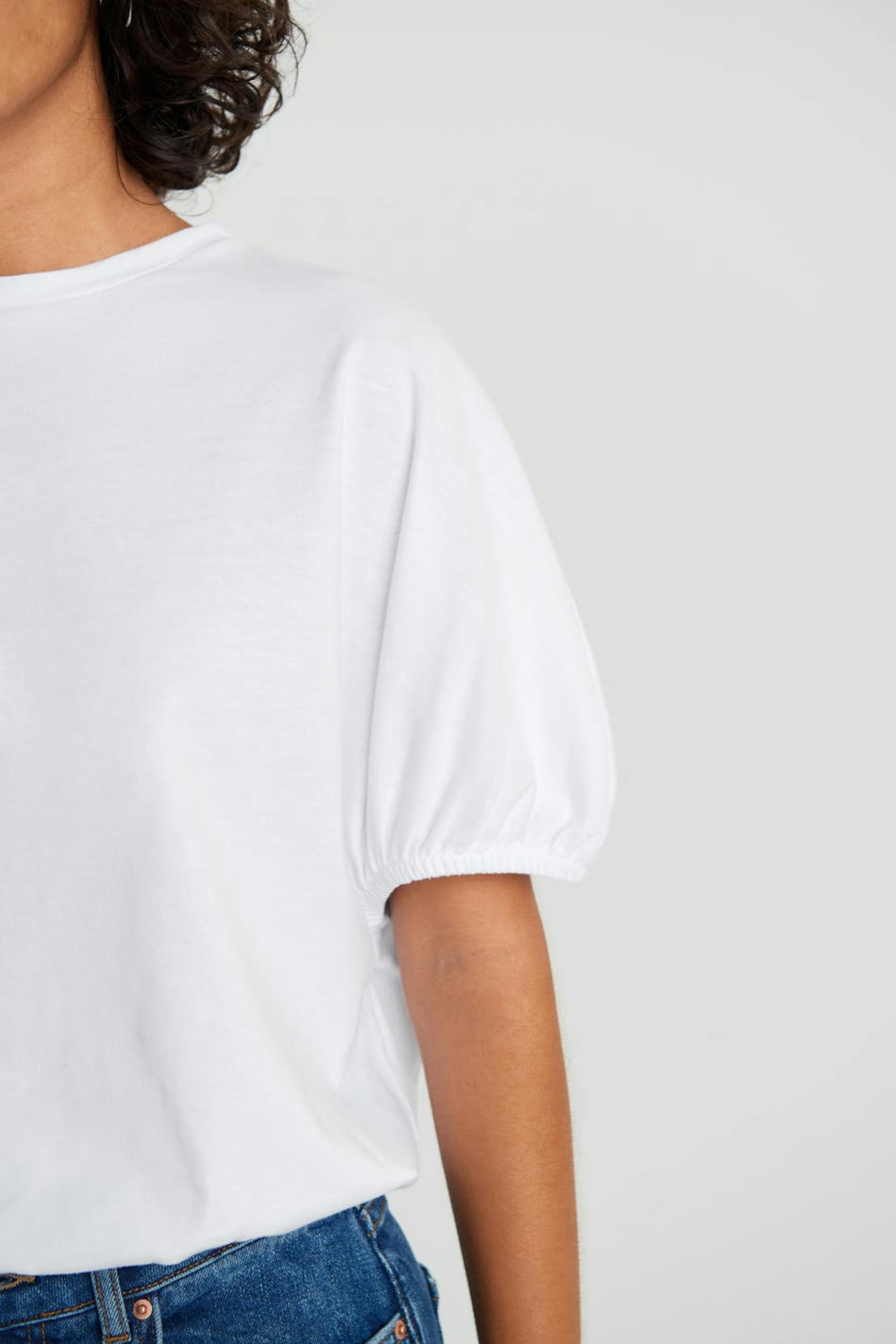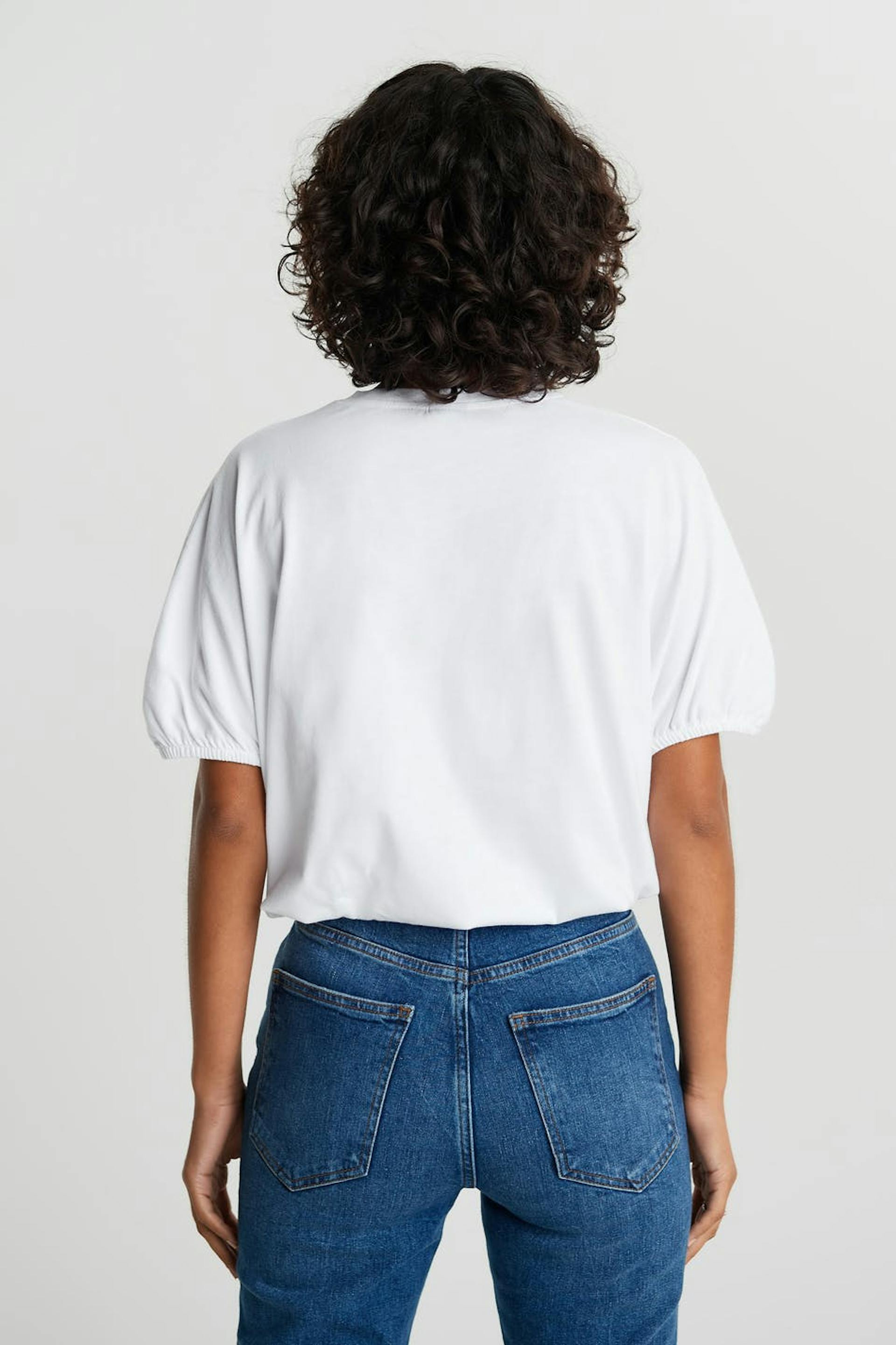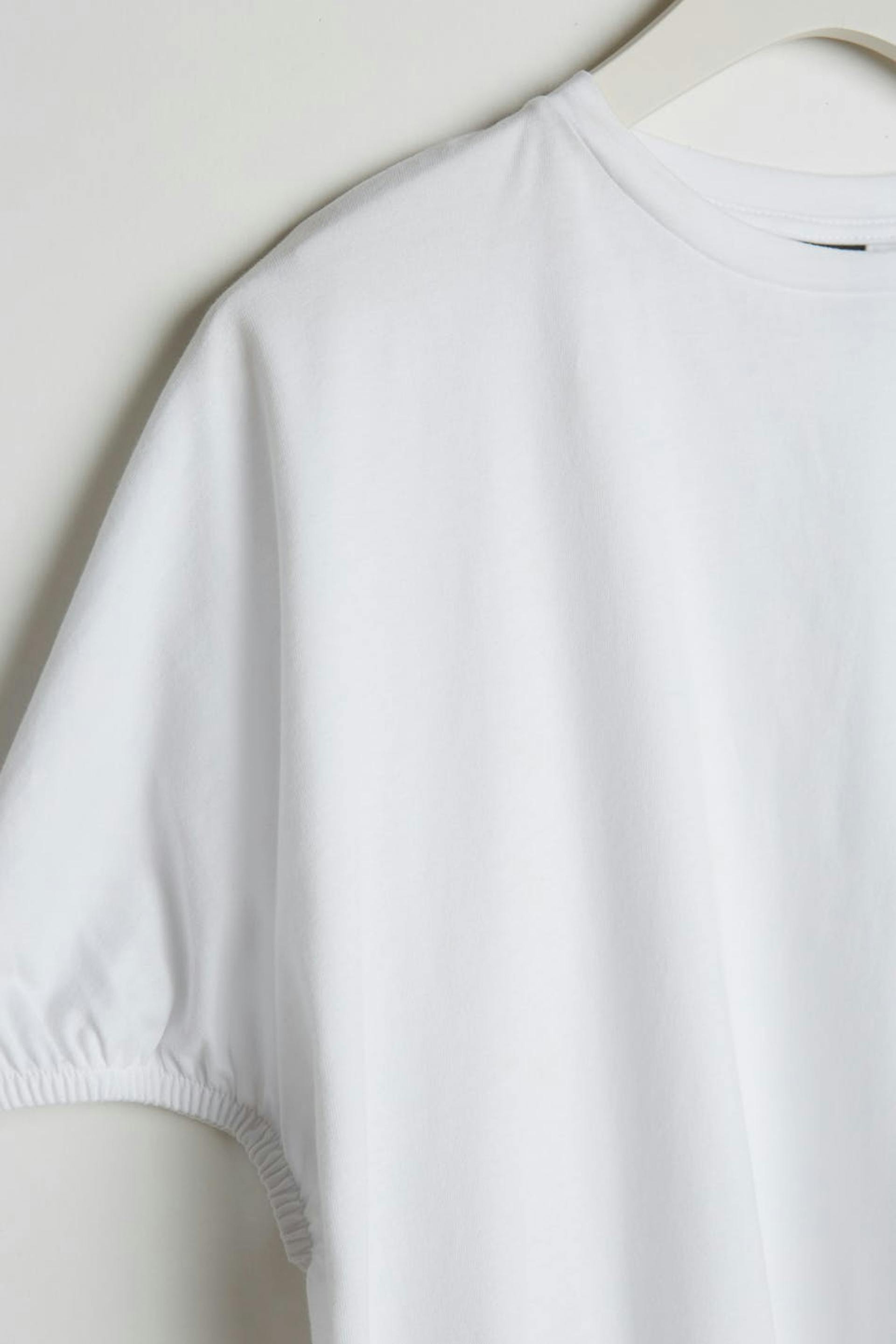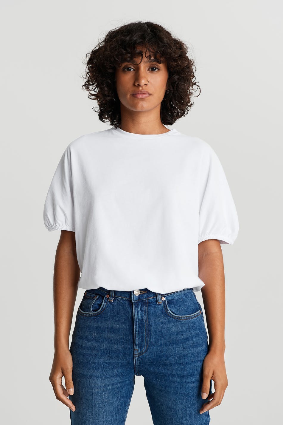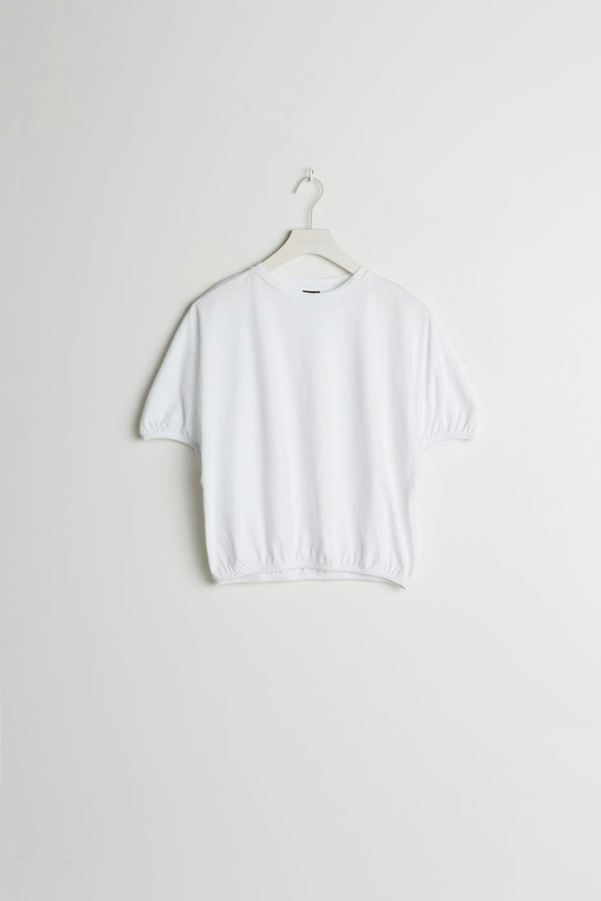 Oversized top with cropped length. Gathering at aleeve end and at bottom.