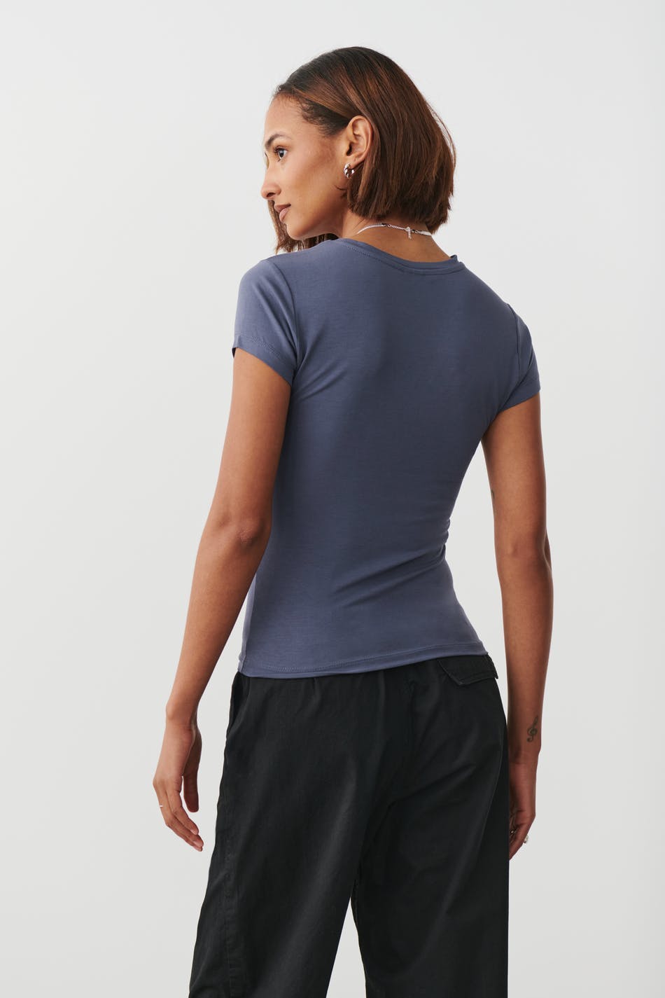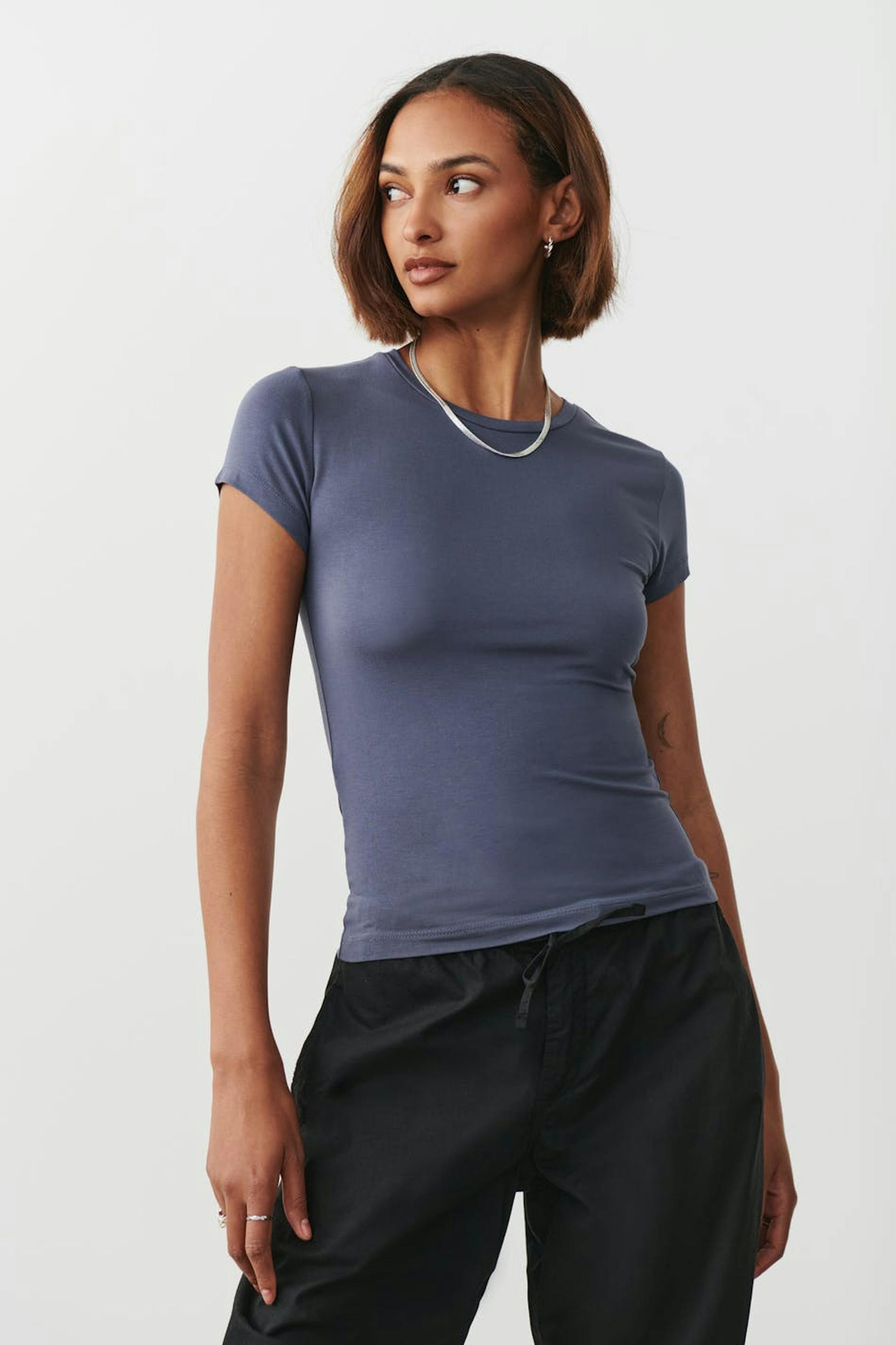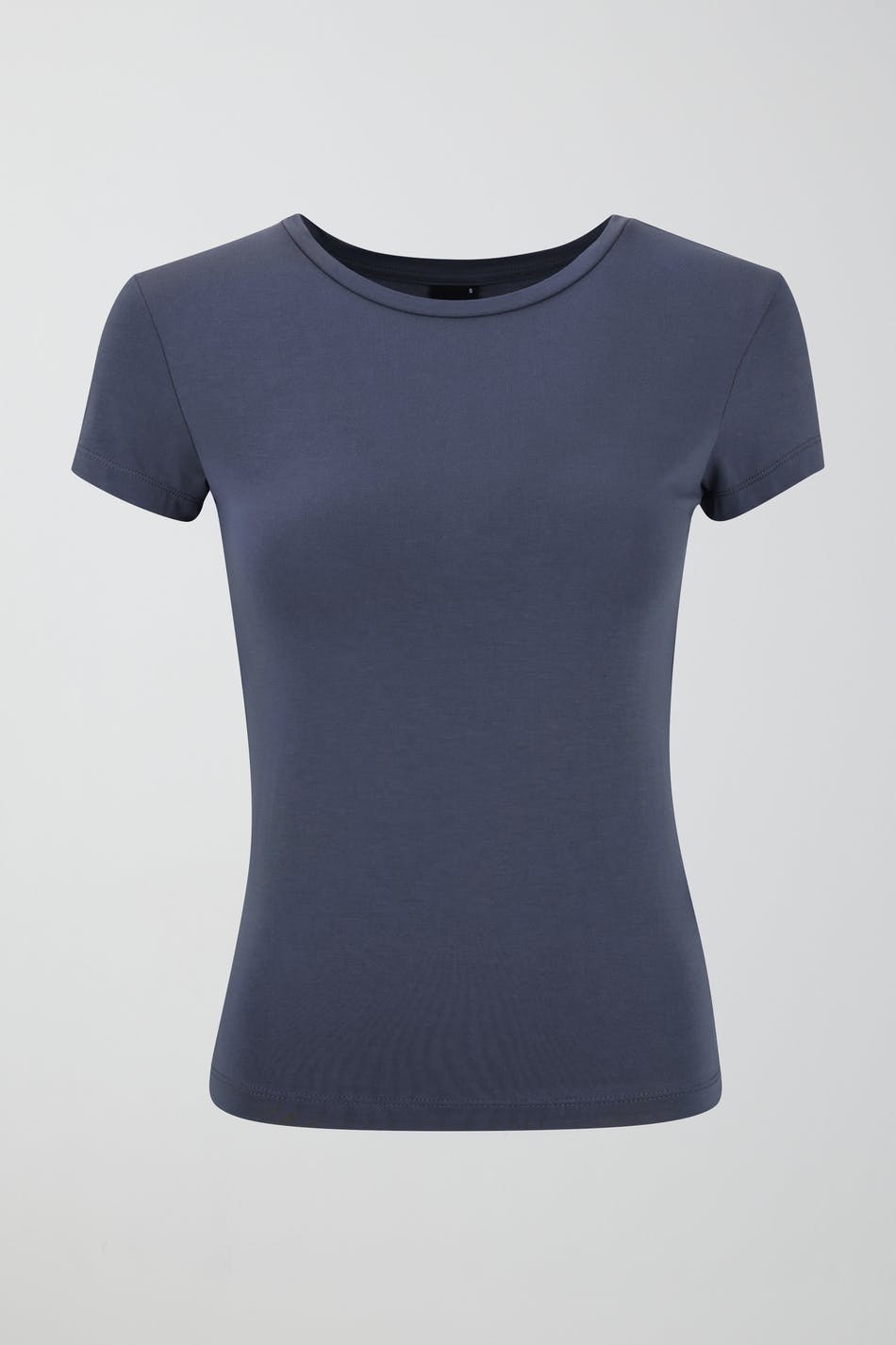 Soft touch – second skin comfort. Nauwsluitend topje met ronde hals. Het topje is blauw en heeft korte mouwen.