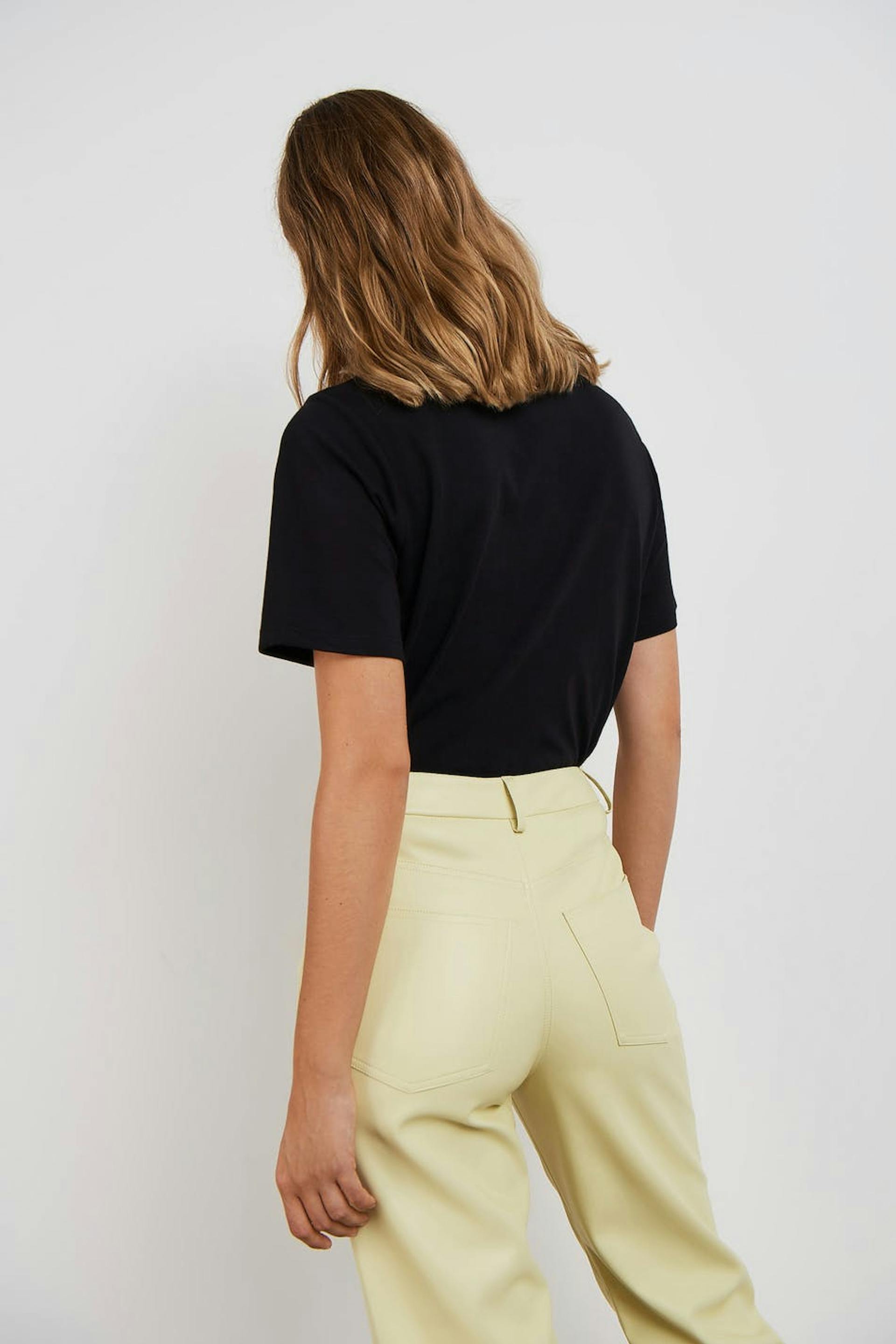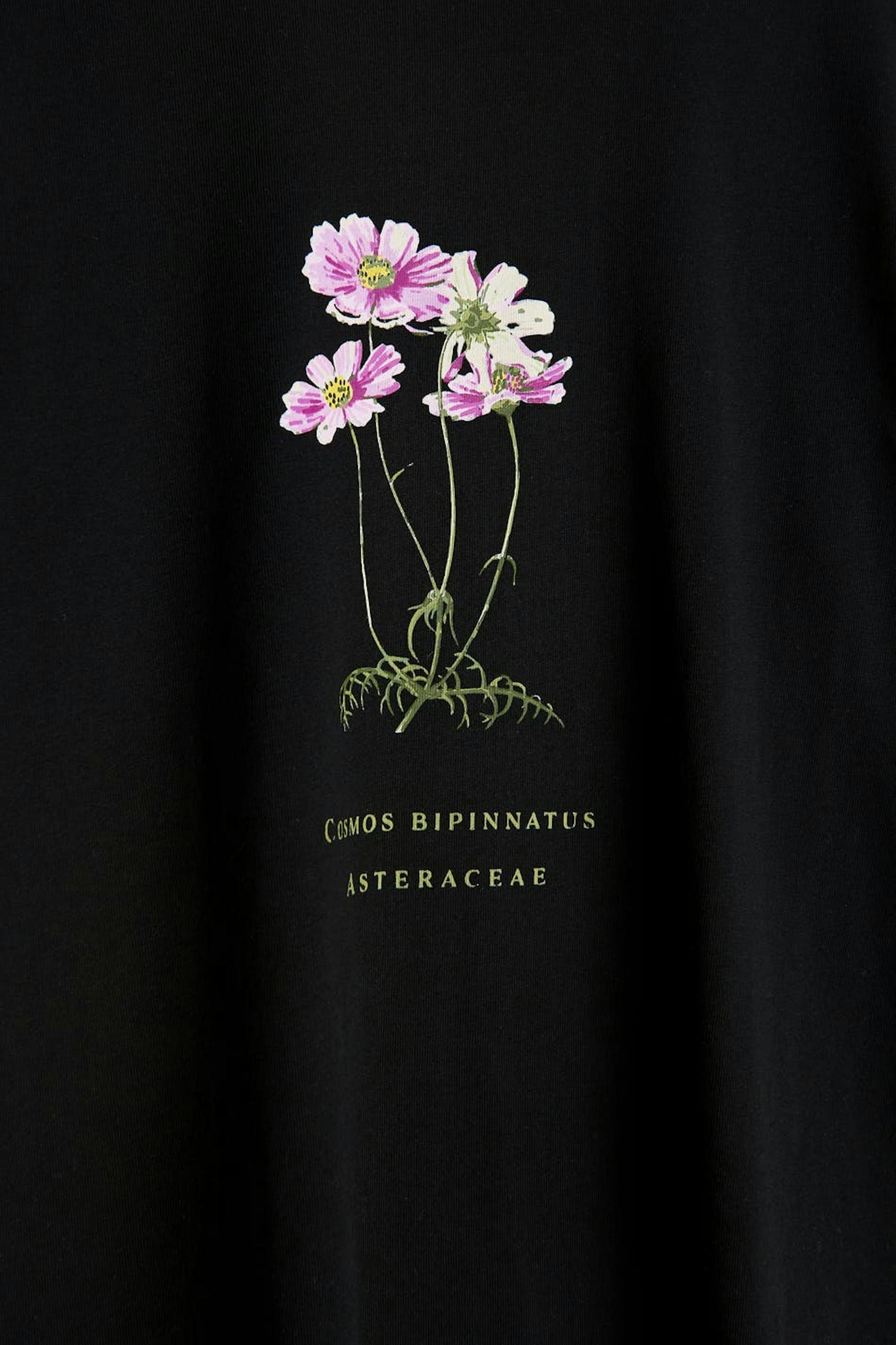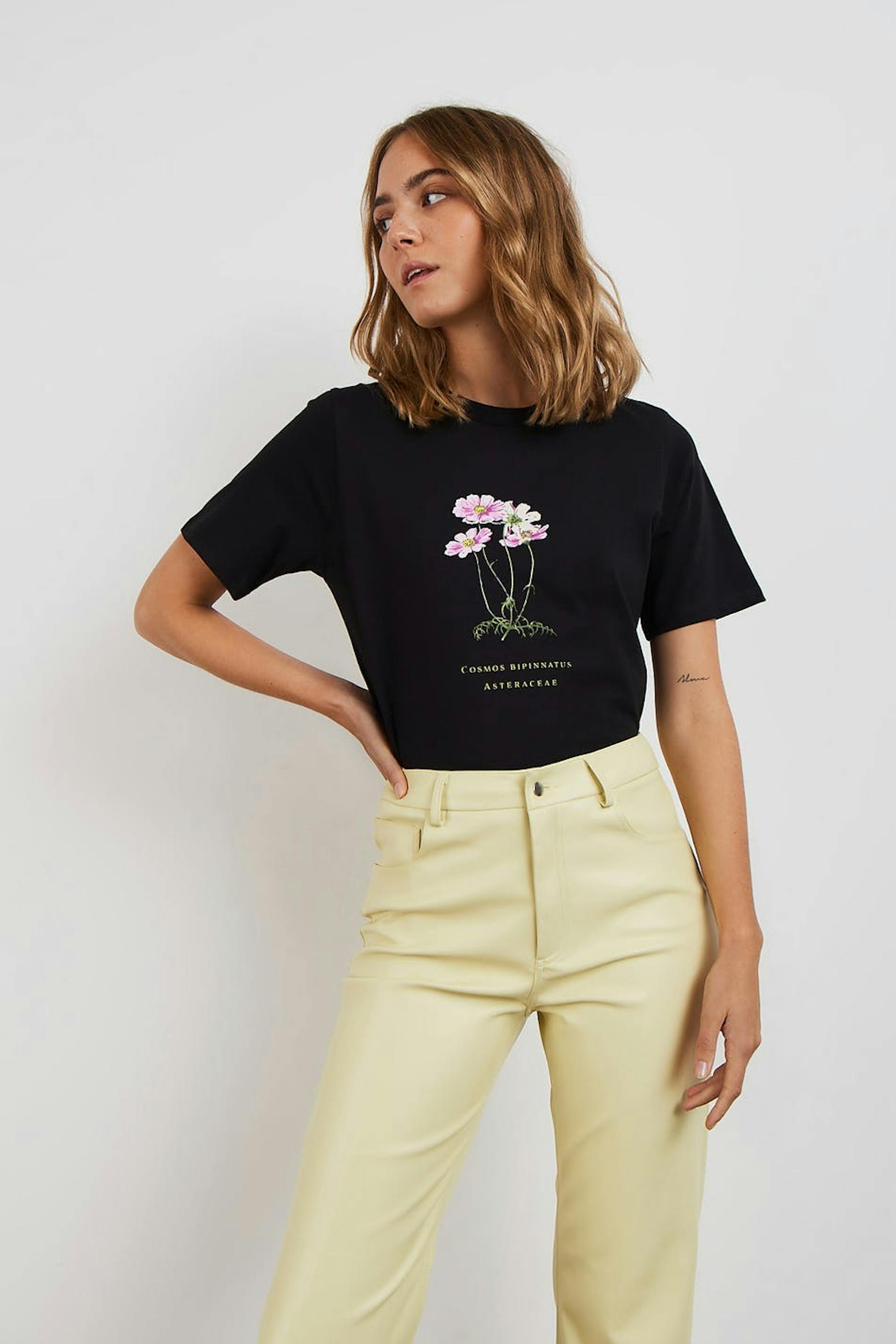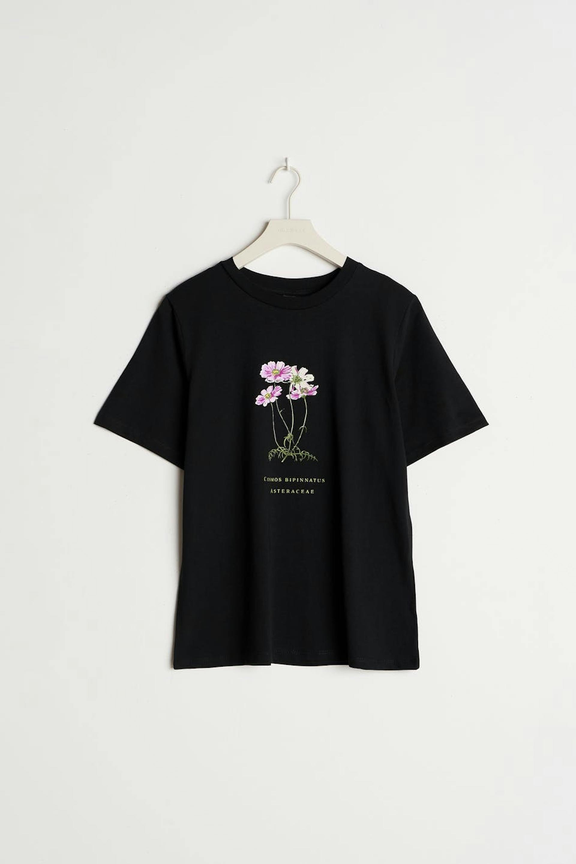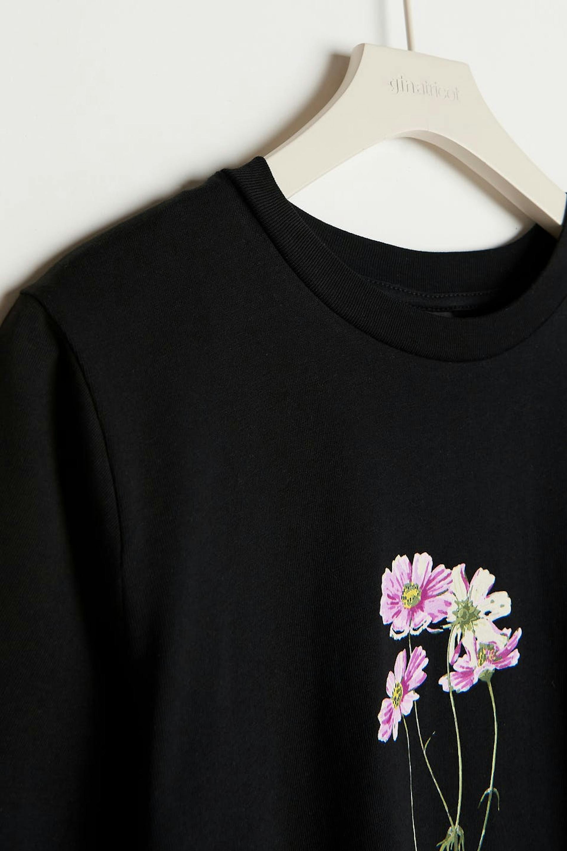 T-shirt met korte mouwen met een overmaatse pasvorm. Het t-shirt is zwart en heeft een bloemige print aan de voorkant. Het is gemaakt van tricot en heeft een geribbelde neklijn.