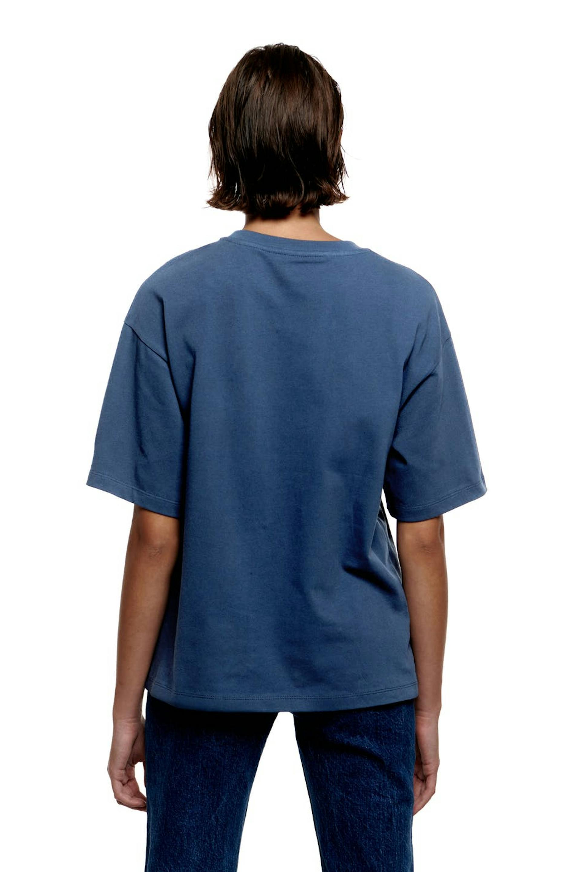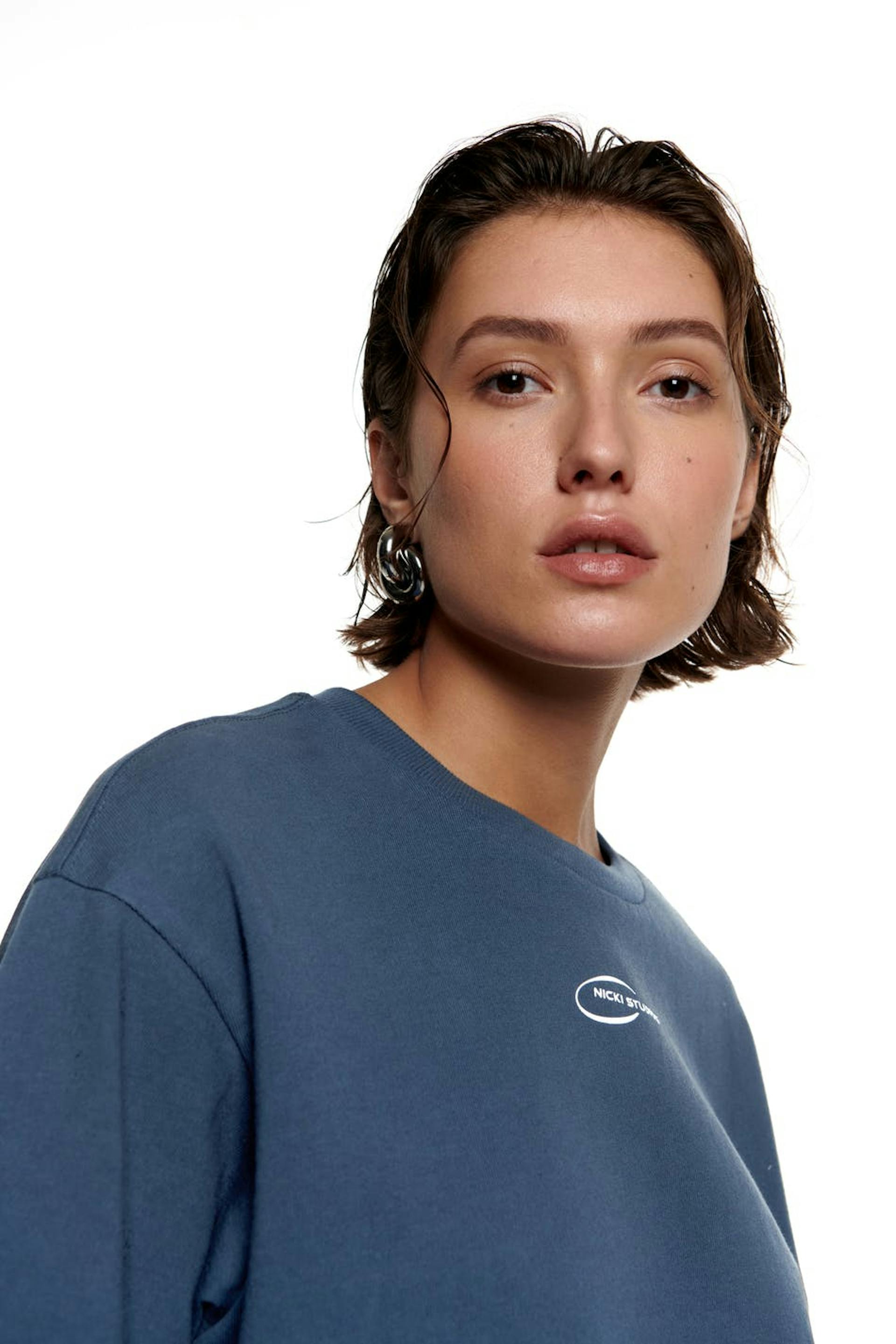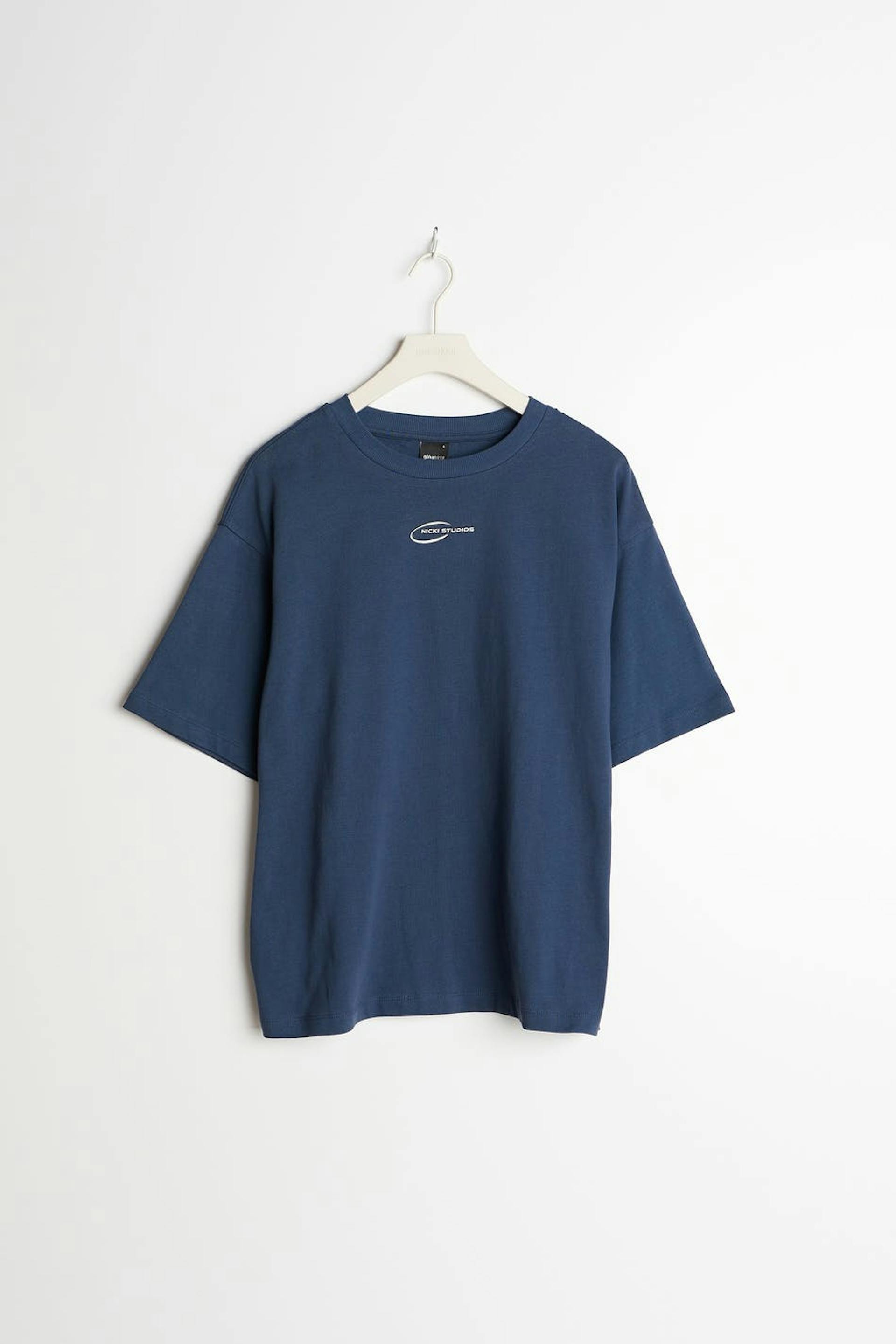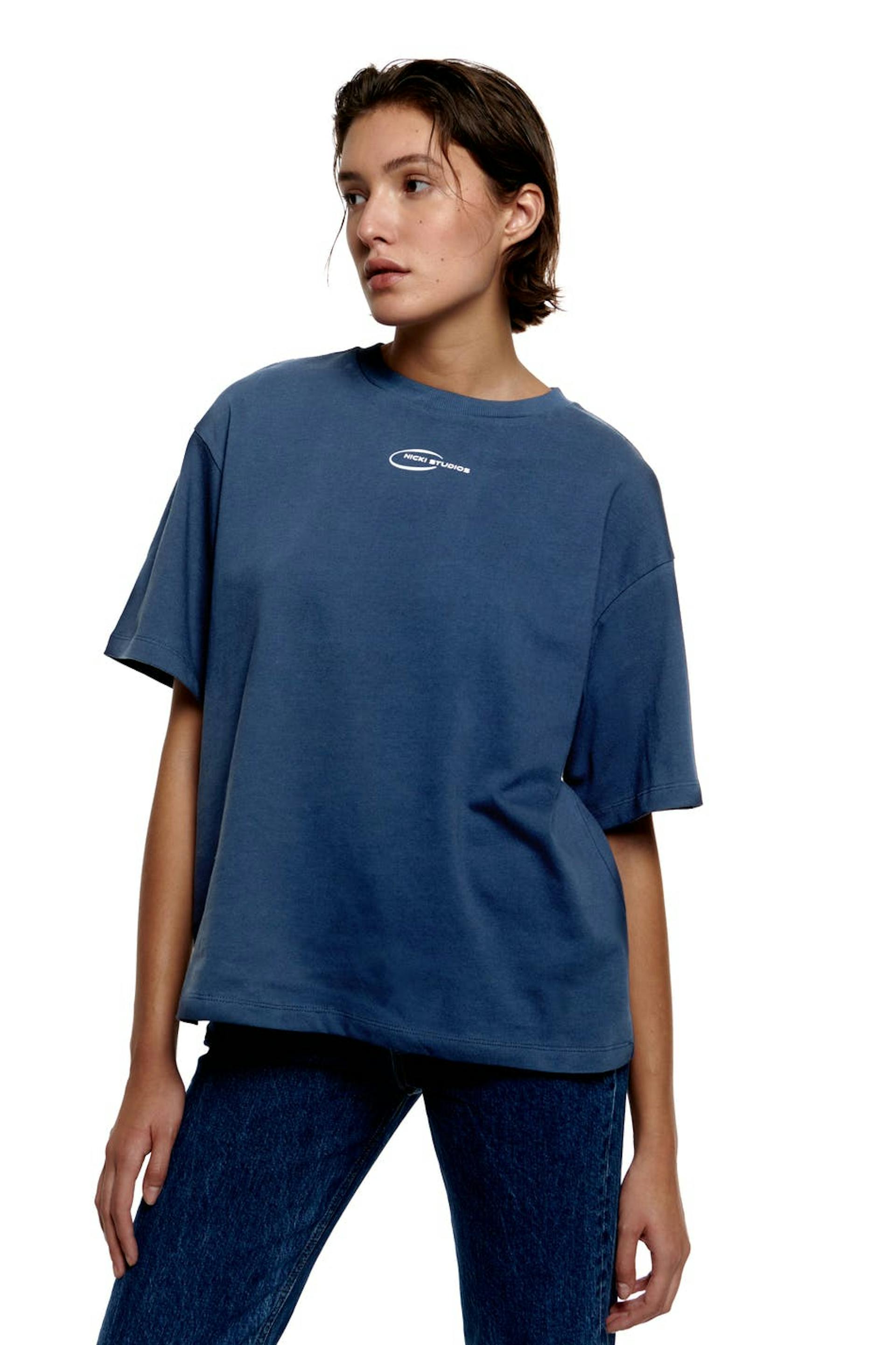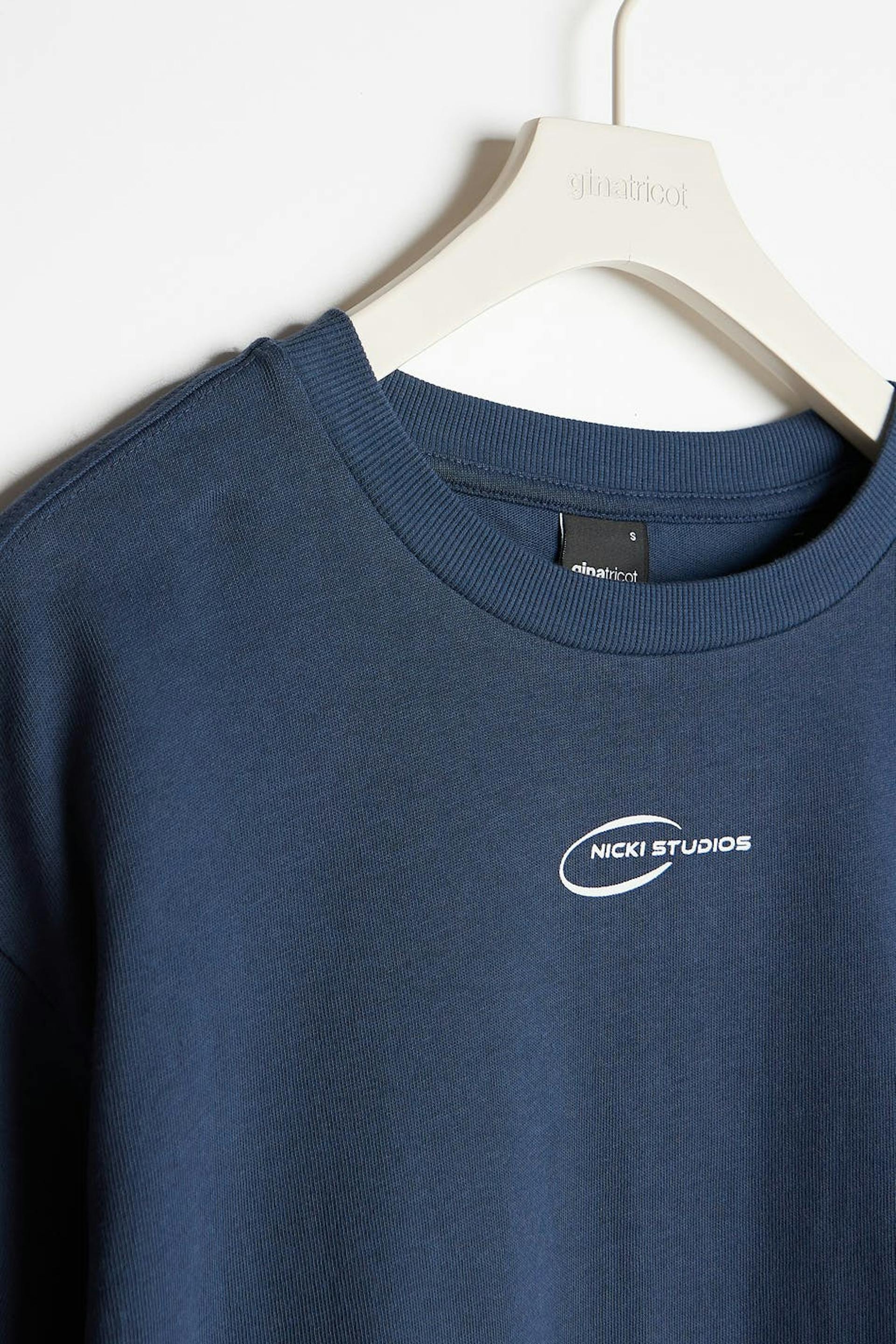 Nicki Studios X Gina Tricot. T-shirt met korte mouwen met een overmaatse pasvorm. Het t-shirt is blauw en heeft een logoprint aan de voorkant.