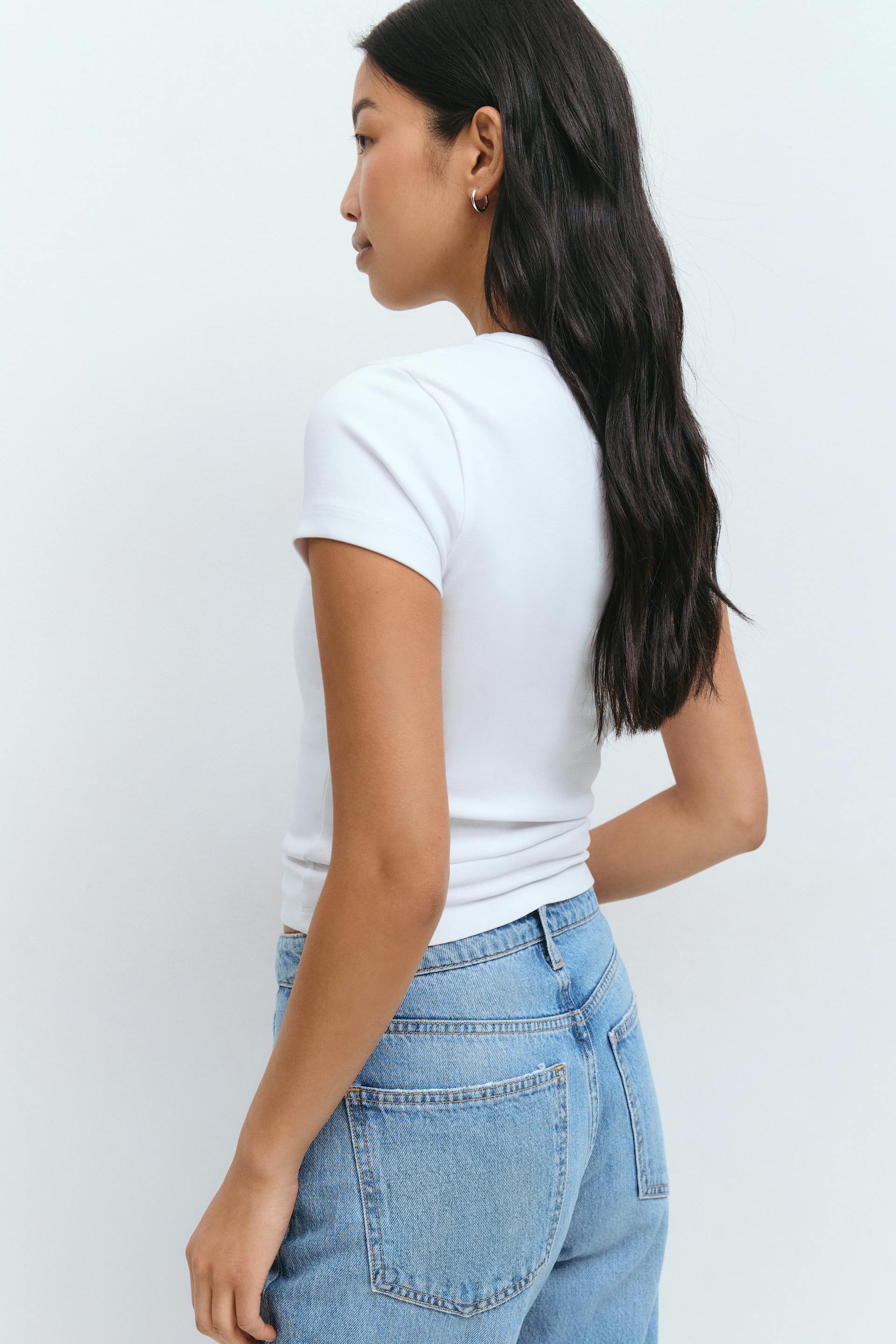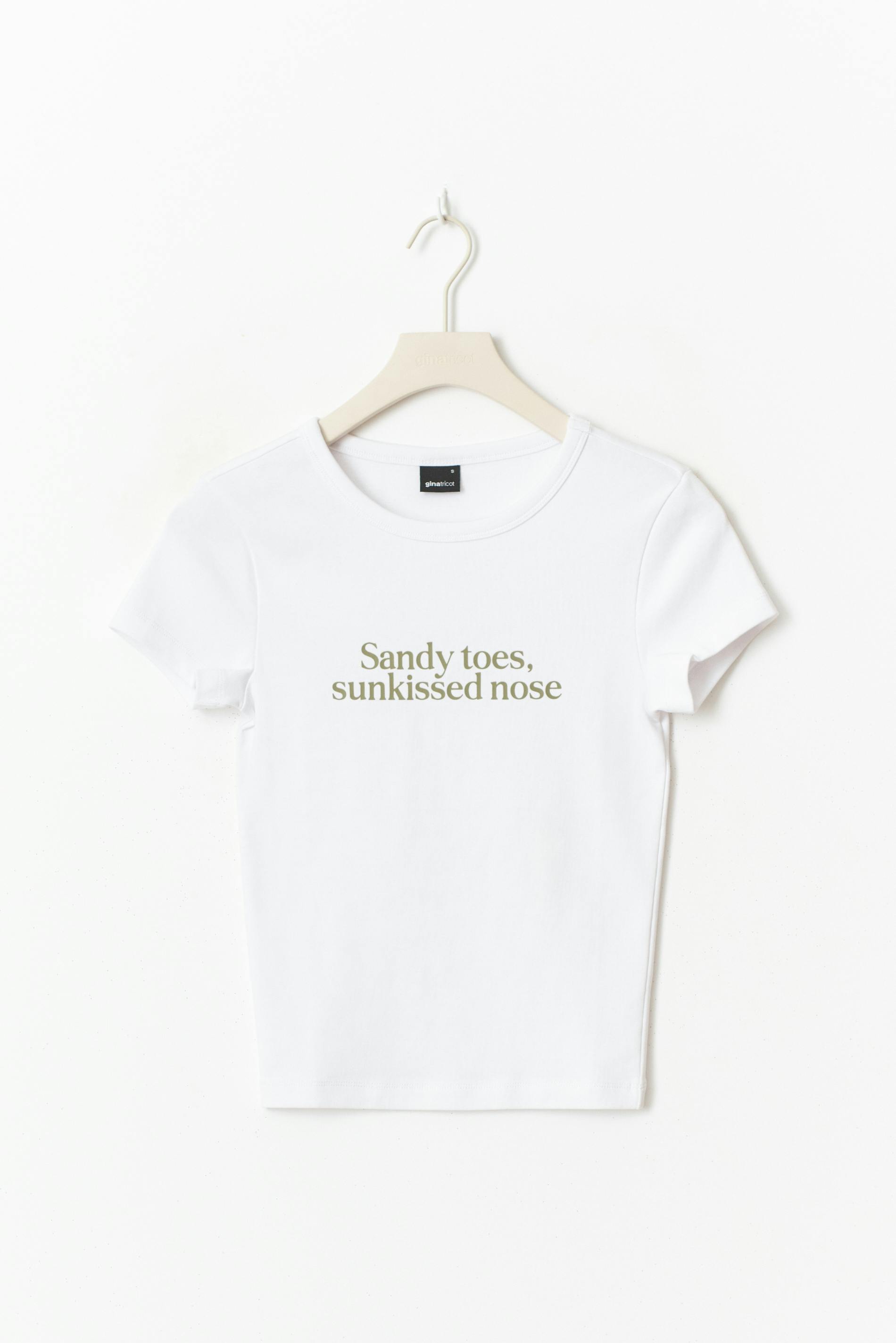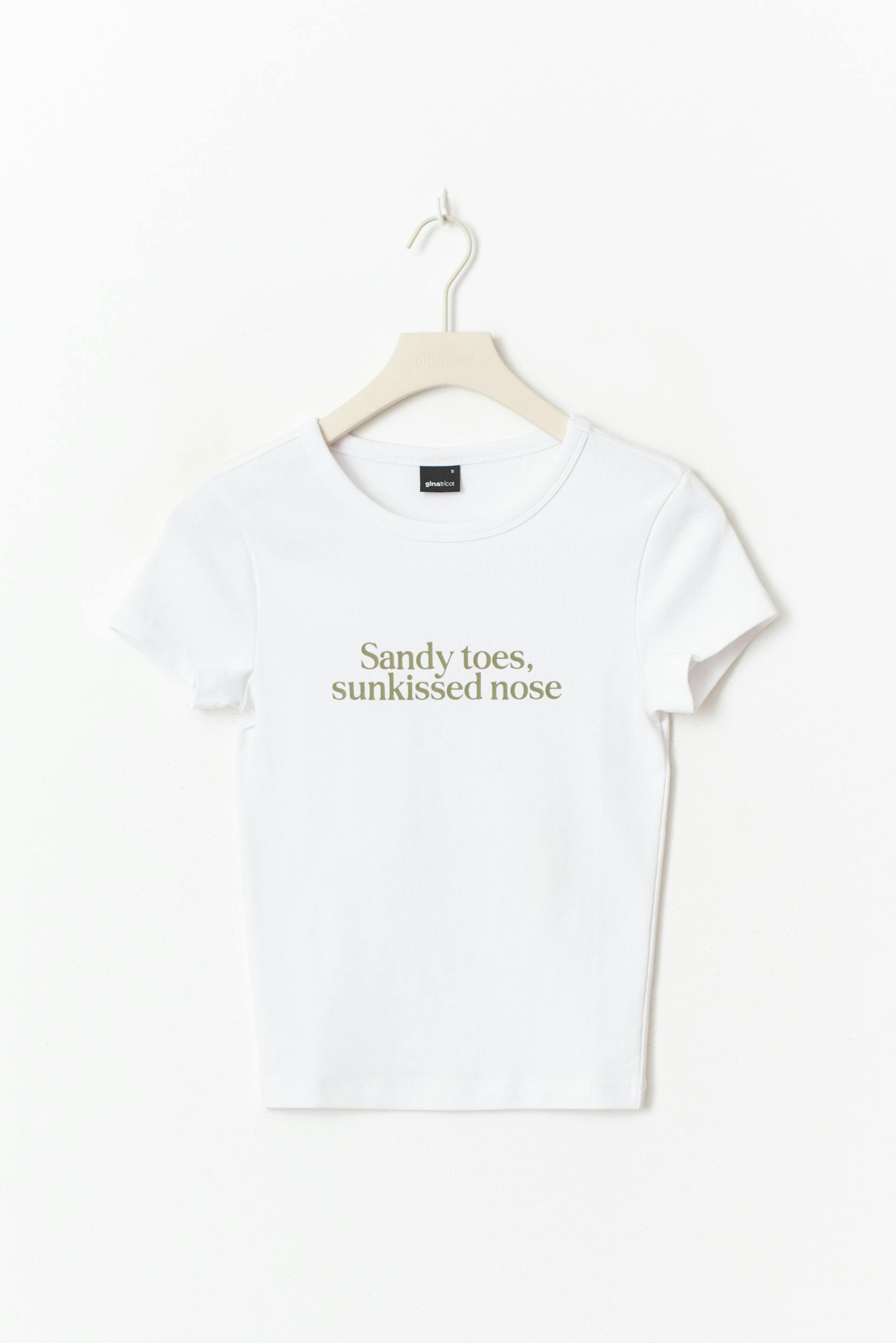 Bovenstuk met korte mouwen met print aan de voorkant. Het topje is wit en heeft nauwsluitende pasvorm. Het heeft ronde halslijn en afgesneden lengte.