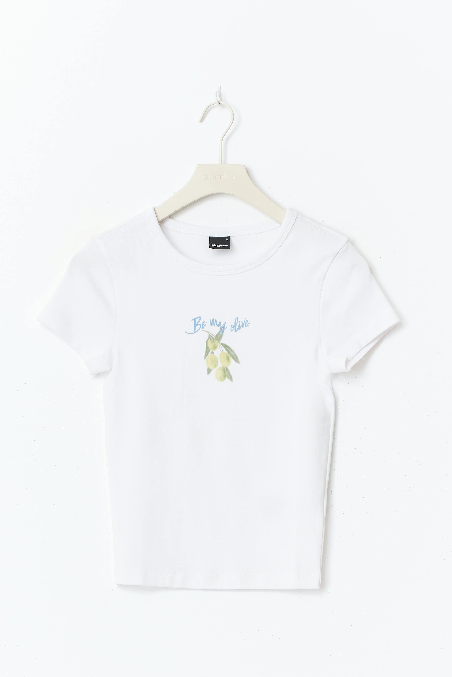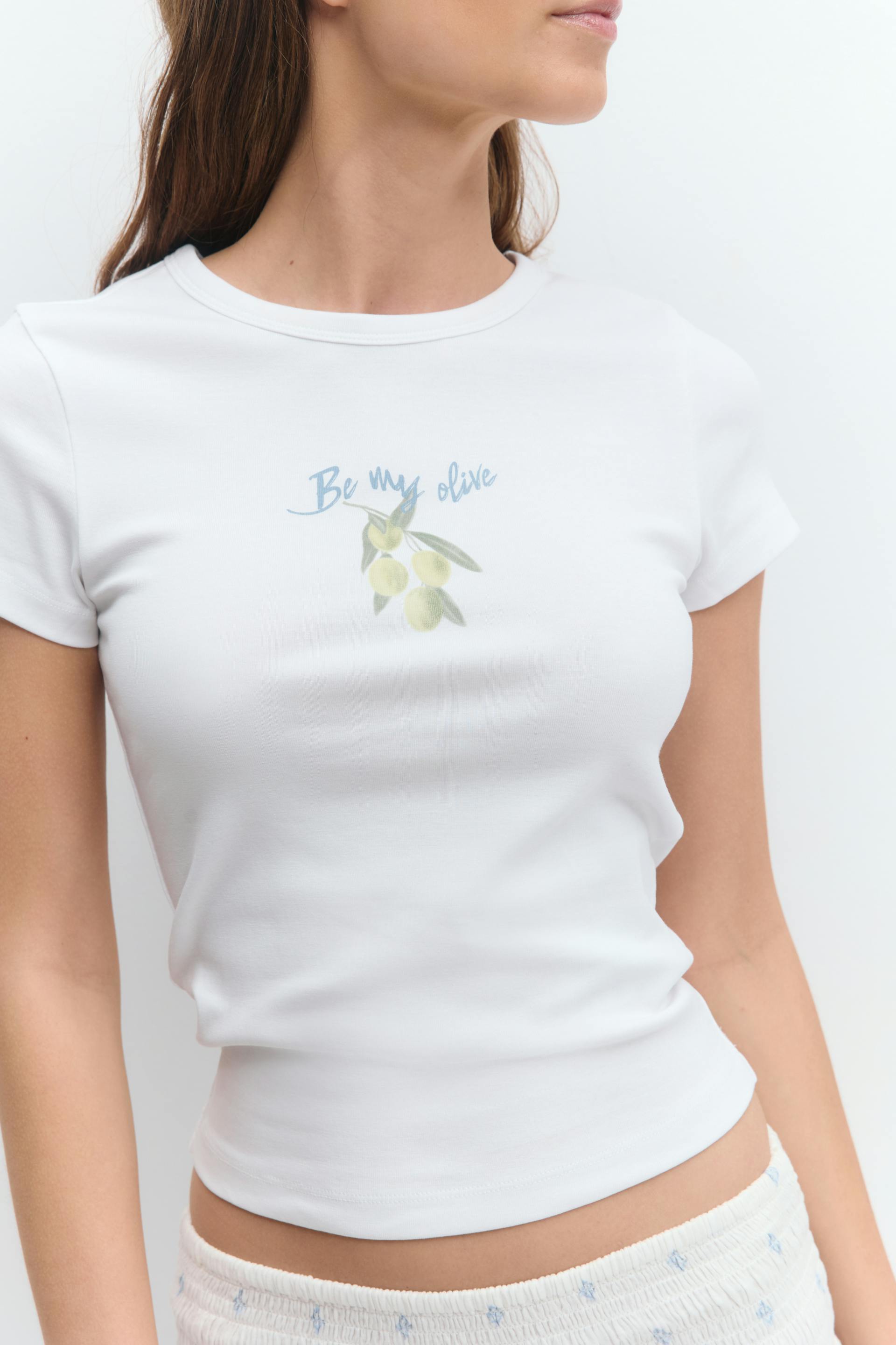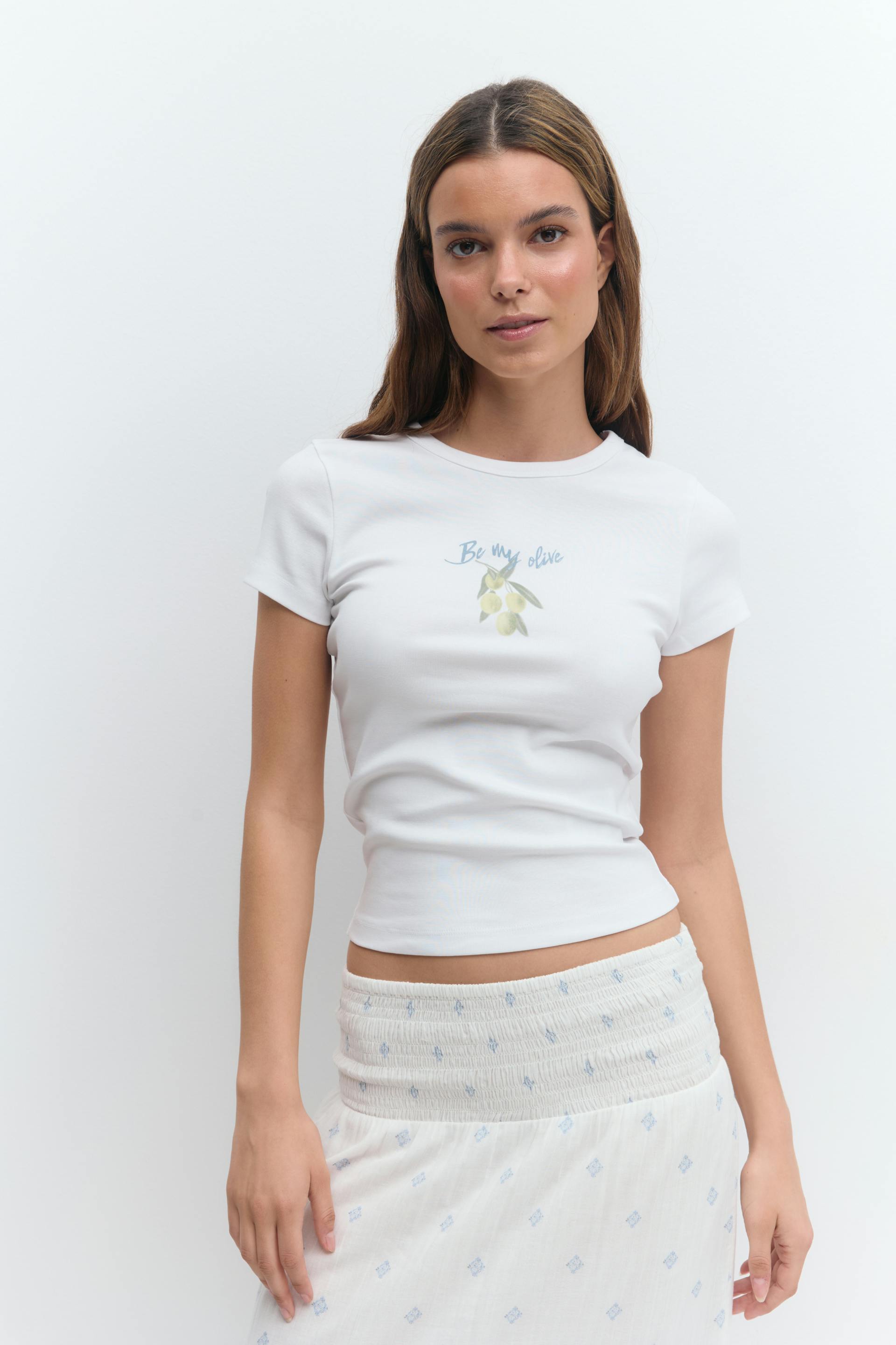 Bovenstuk met korte mouwen met print aan de voorkant. Het topje is wit en heeft nauwsluitende pasvorm. Het heeft ronde halslijn en afgesneden lengte.