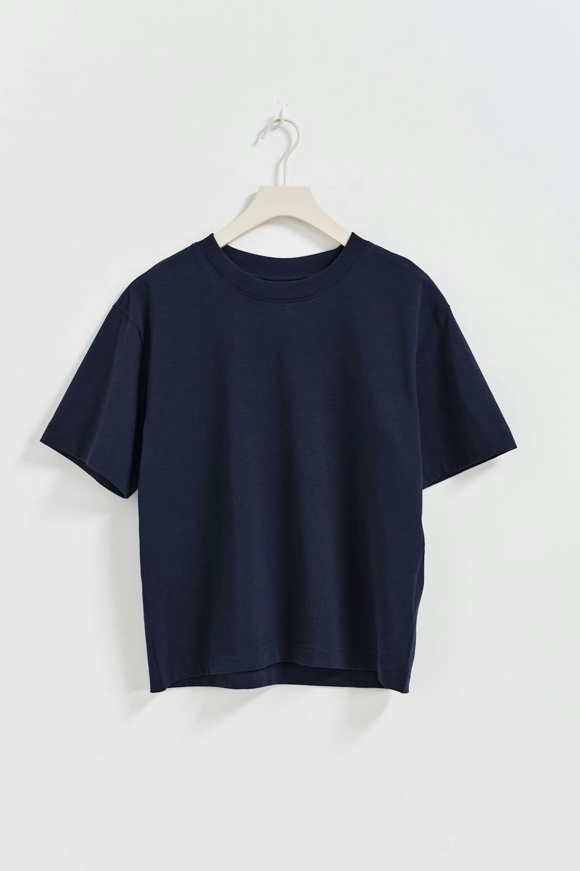 T-shirt met een overmaatse pasvorm. Het t-shirt is blauw en heeft een zacht en zwaar materiaal van katoen. Het heeft ronde halslijn, korte mouw en geribbelde manchet aan de halslijn.