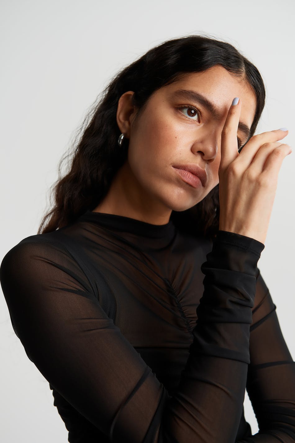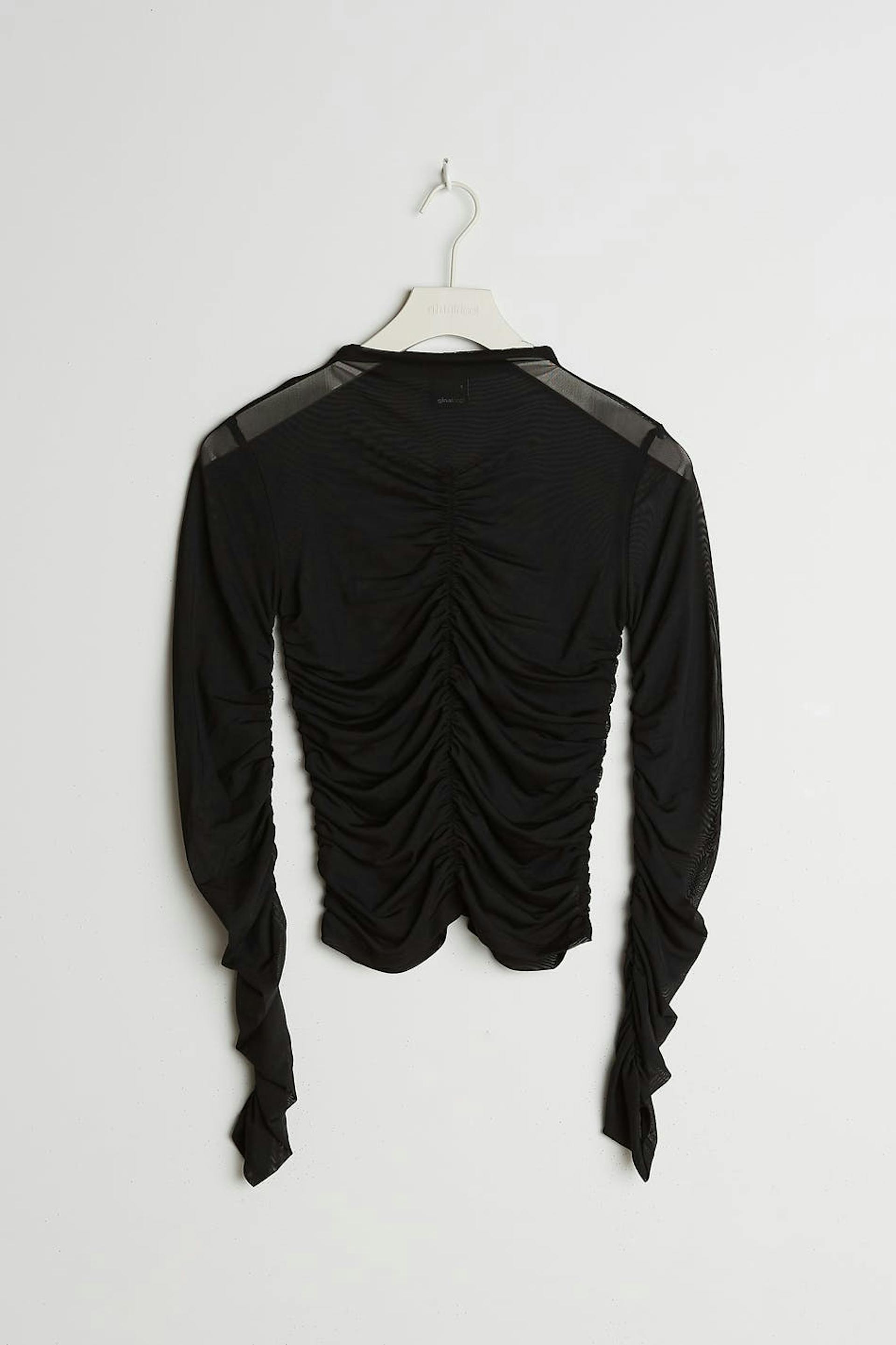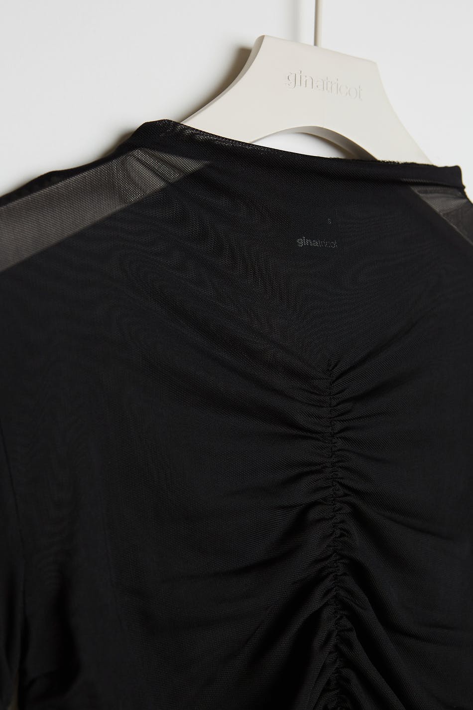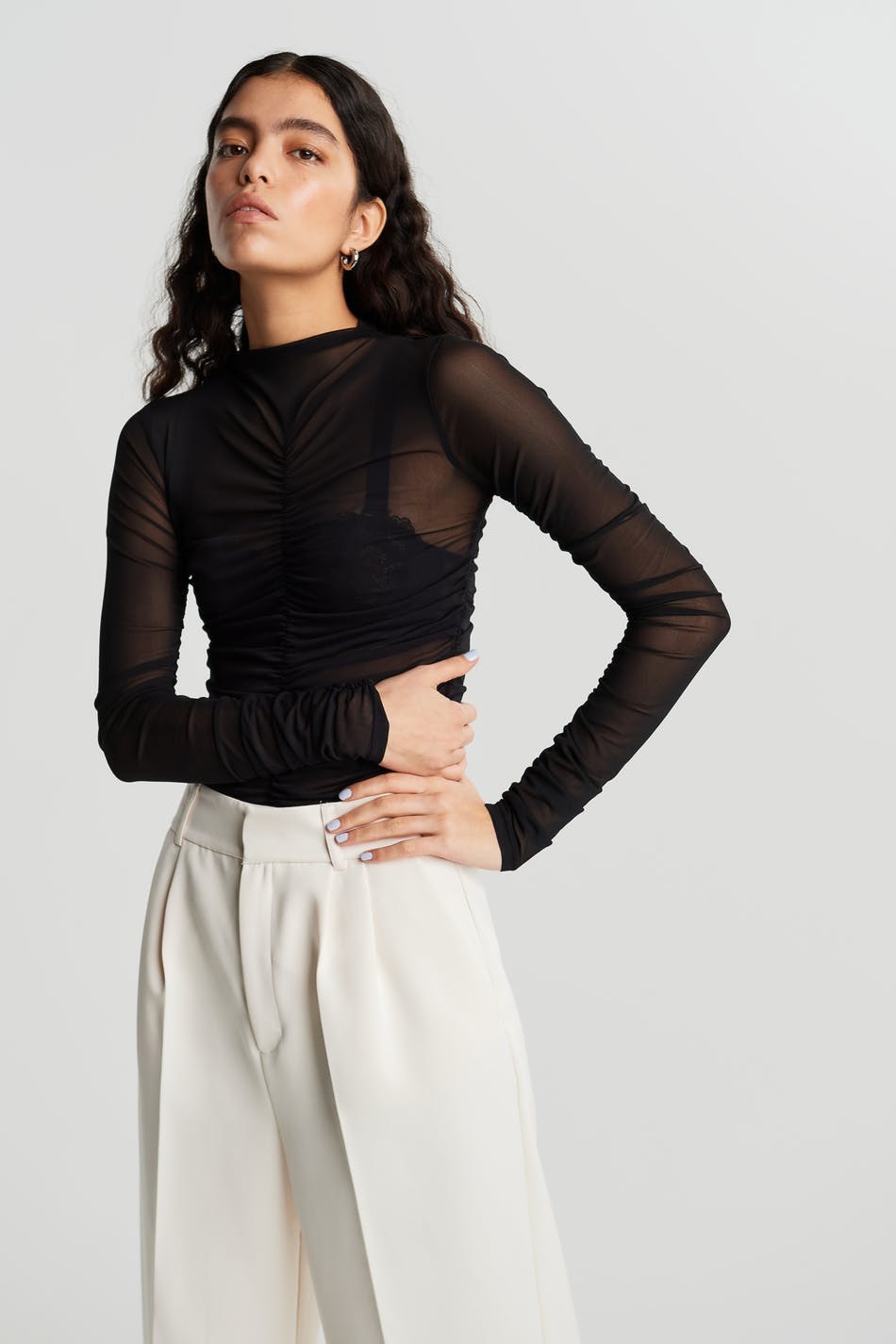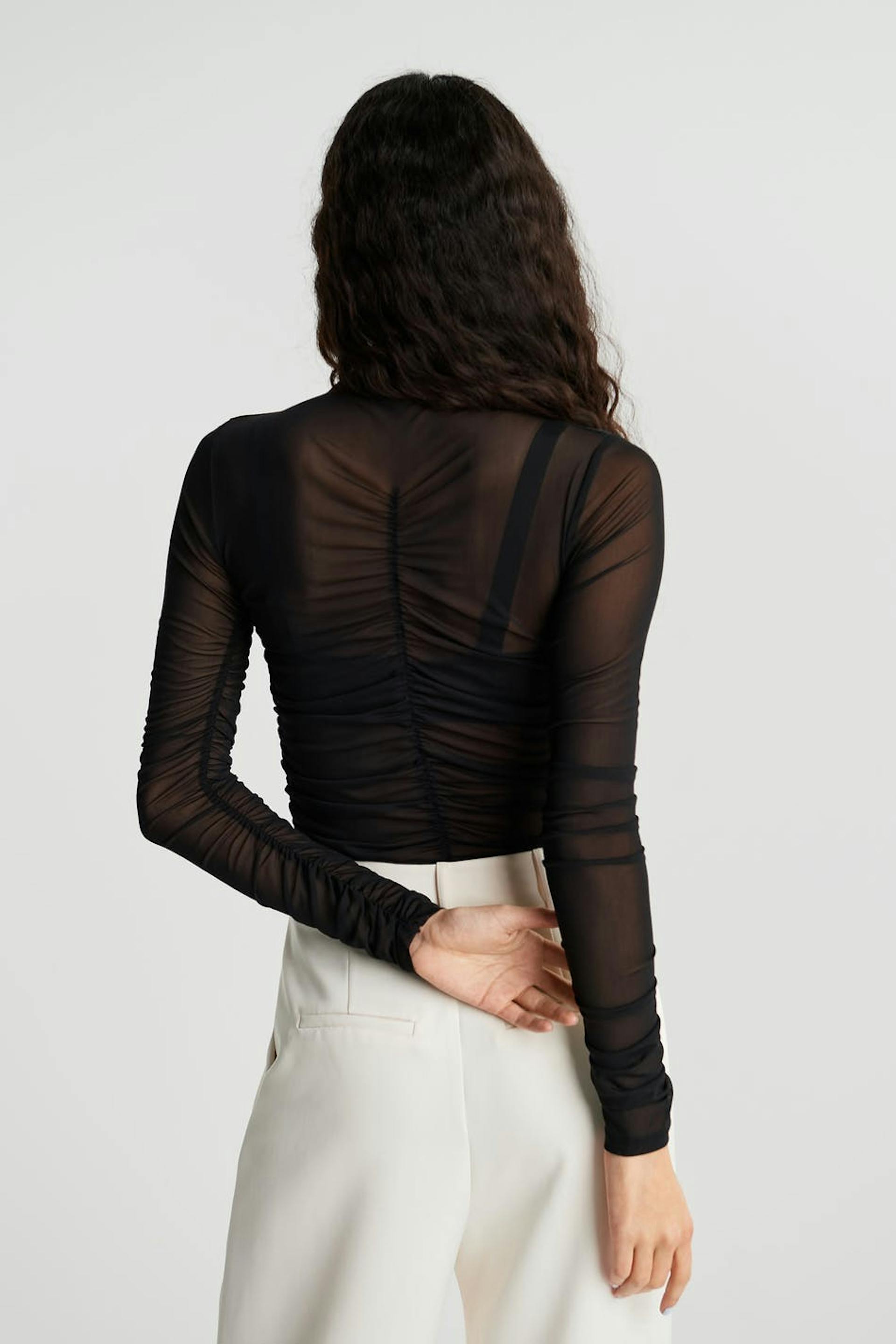 Top met lange mouwen en een ruche aan de voorkant, achter en langs elke mouw. De top is perfect voor het feest, zwart en nauwsluitend. Het is gemaakt uit mesh.