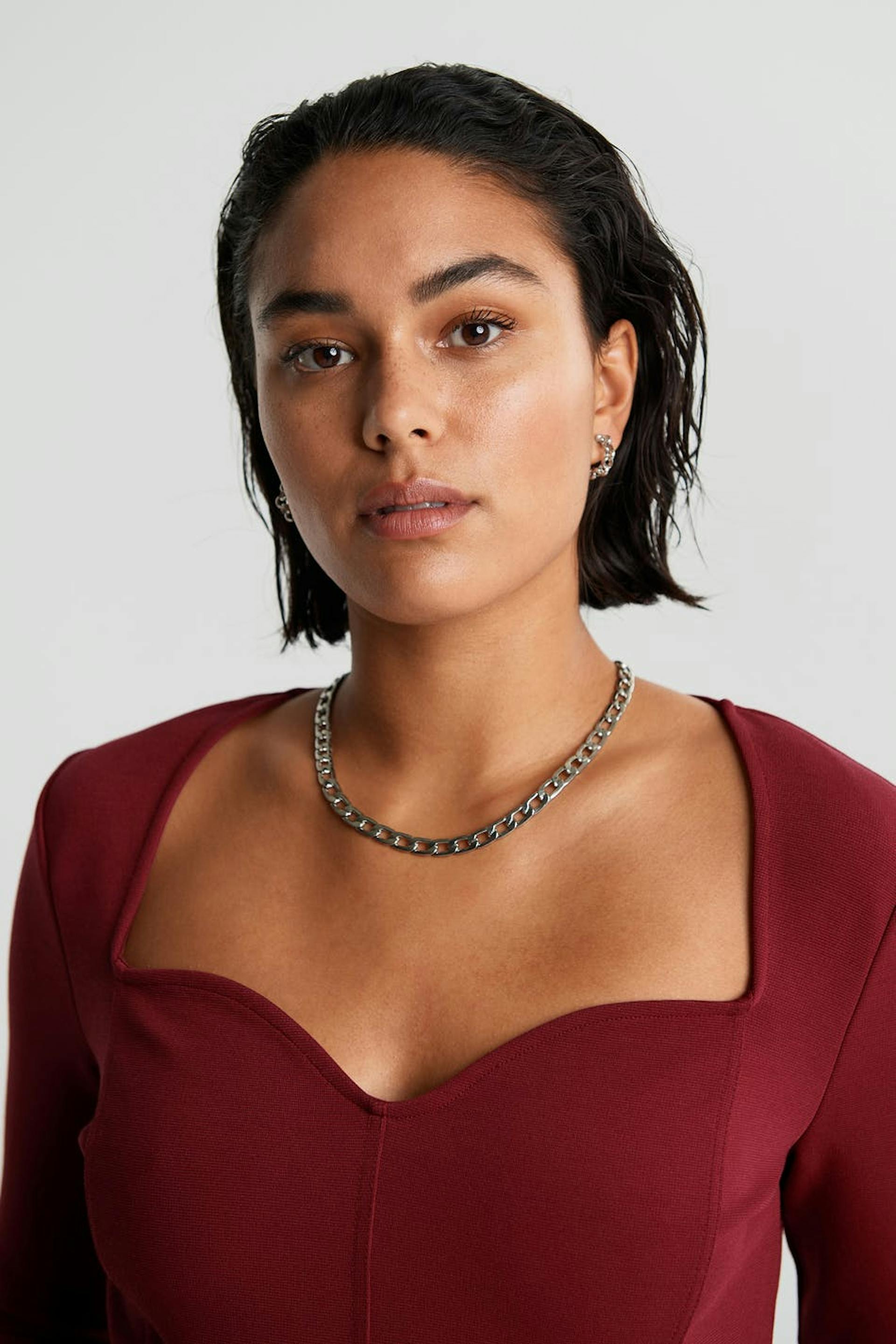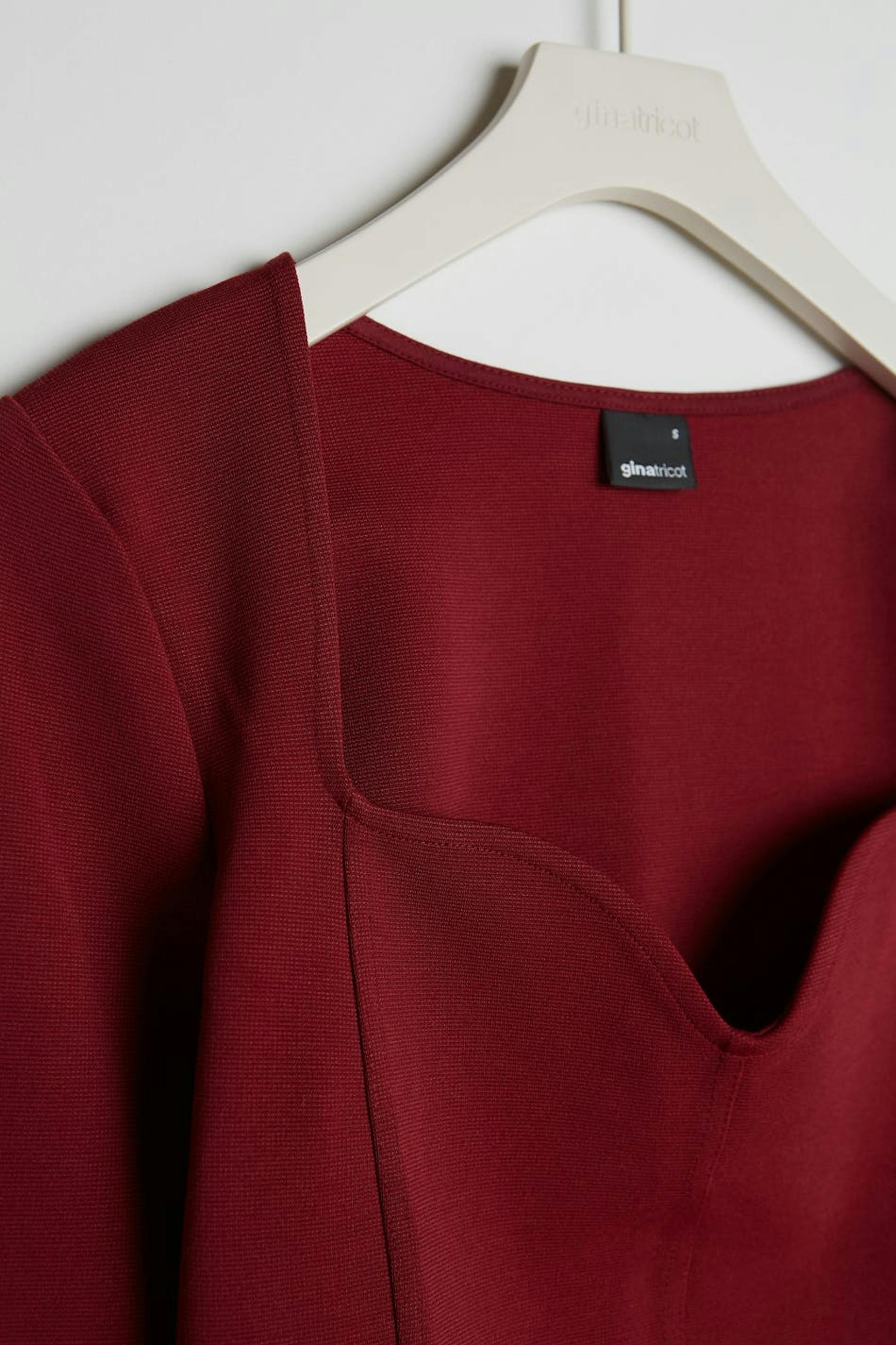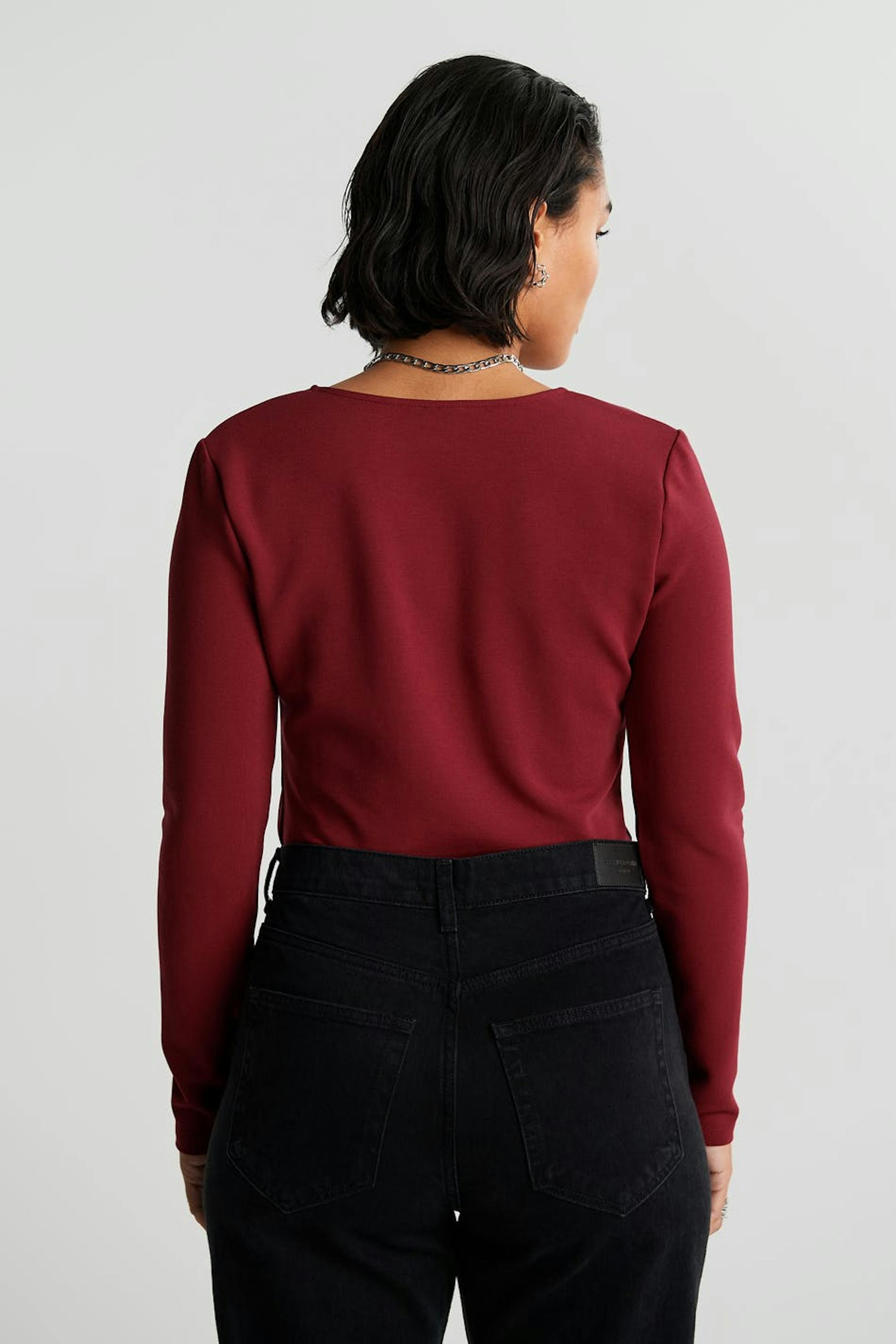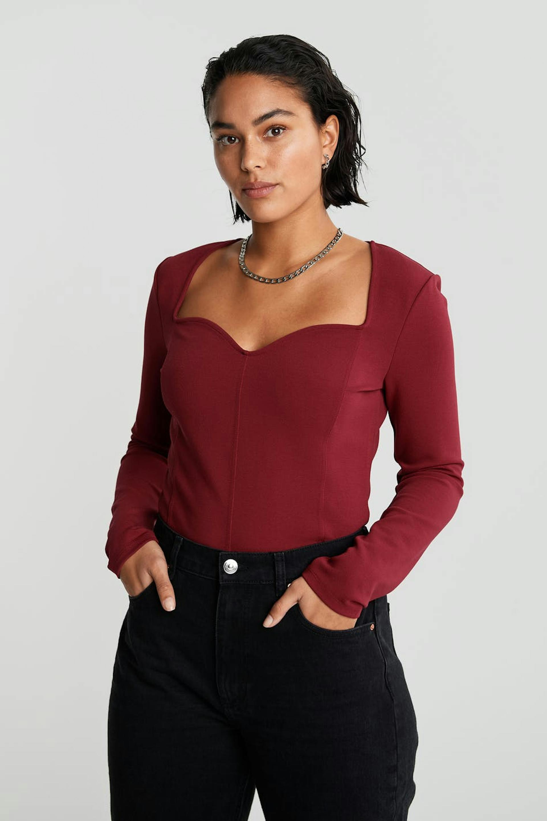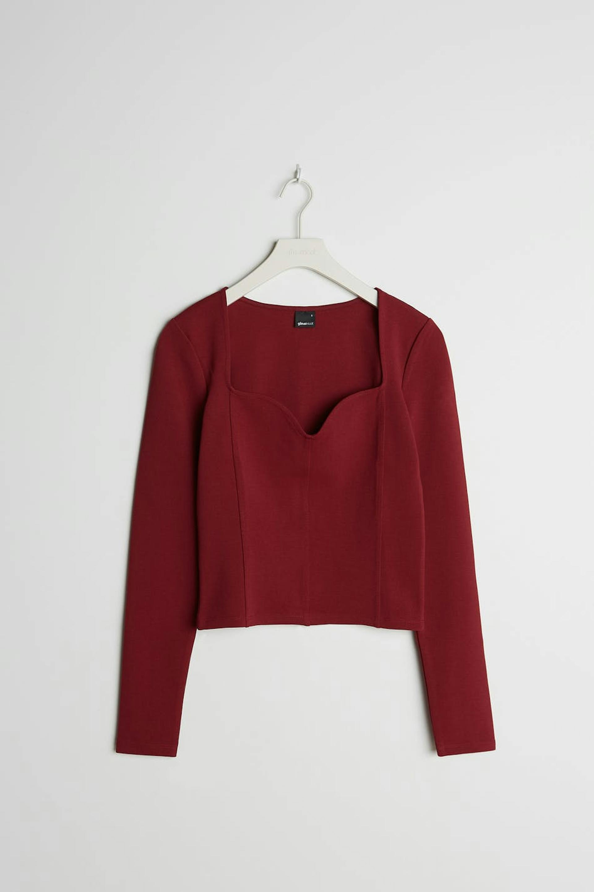 Top met lange mouwen en een nauwsluitende pasvorm. De top is rood en heeft een hartvormige hals. Het is gemaakt uit tricot en heeft zoom details langs de voorzijde.