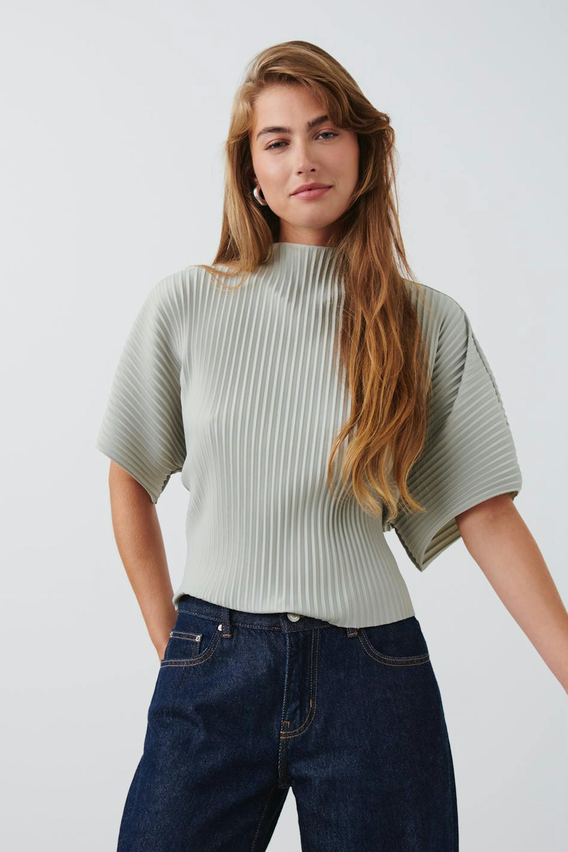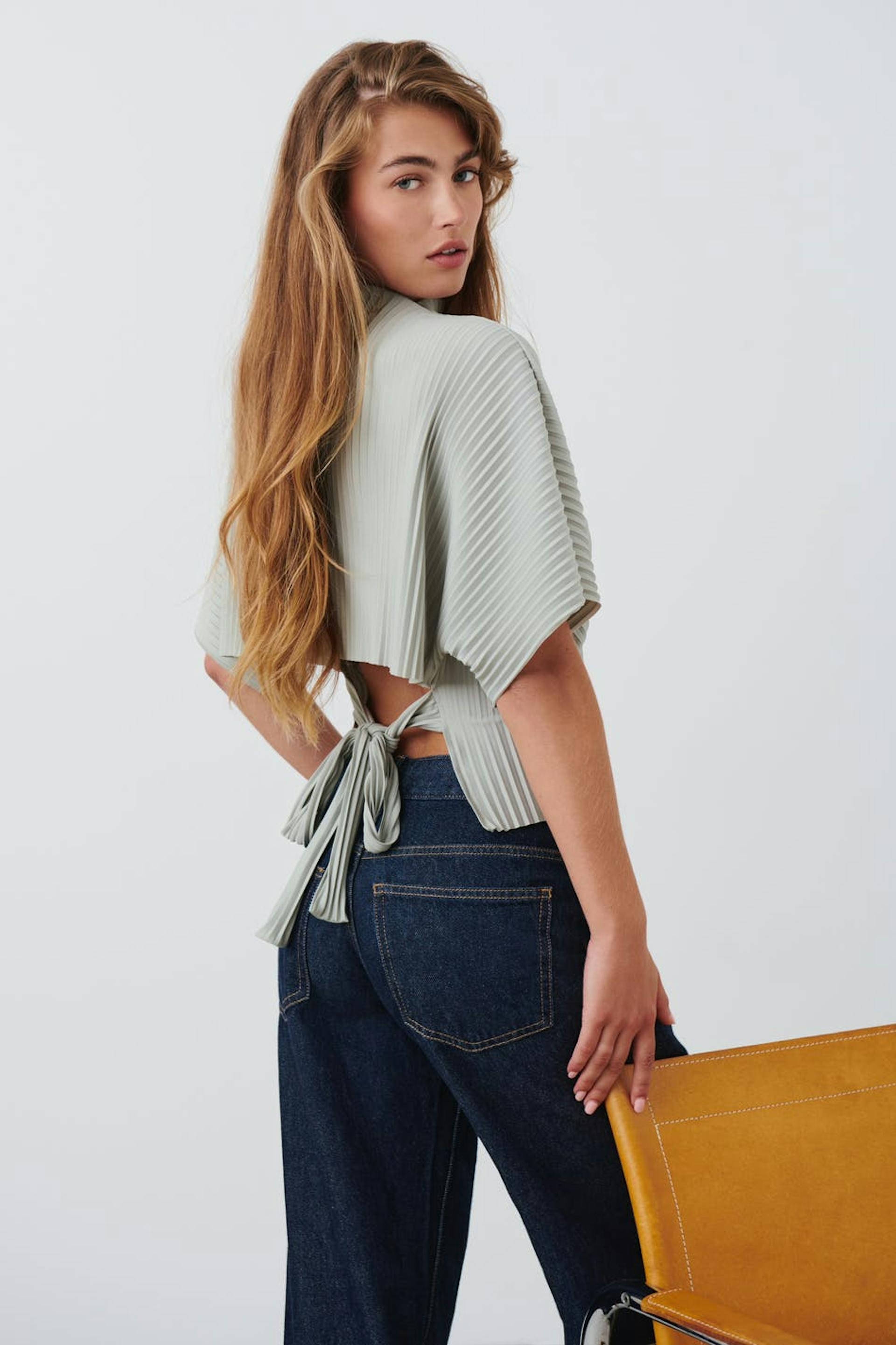 Geplisseerd topje van tricot met ruimvallende stijl. Het topje is groen, met korte mouwen en afgesneden. Het heeft trechterkraag en open rug met knoop detail.