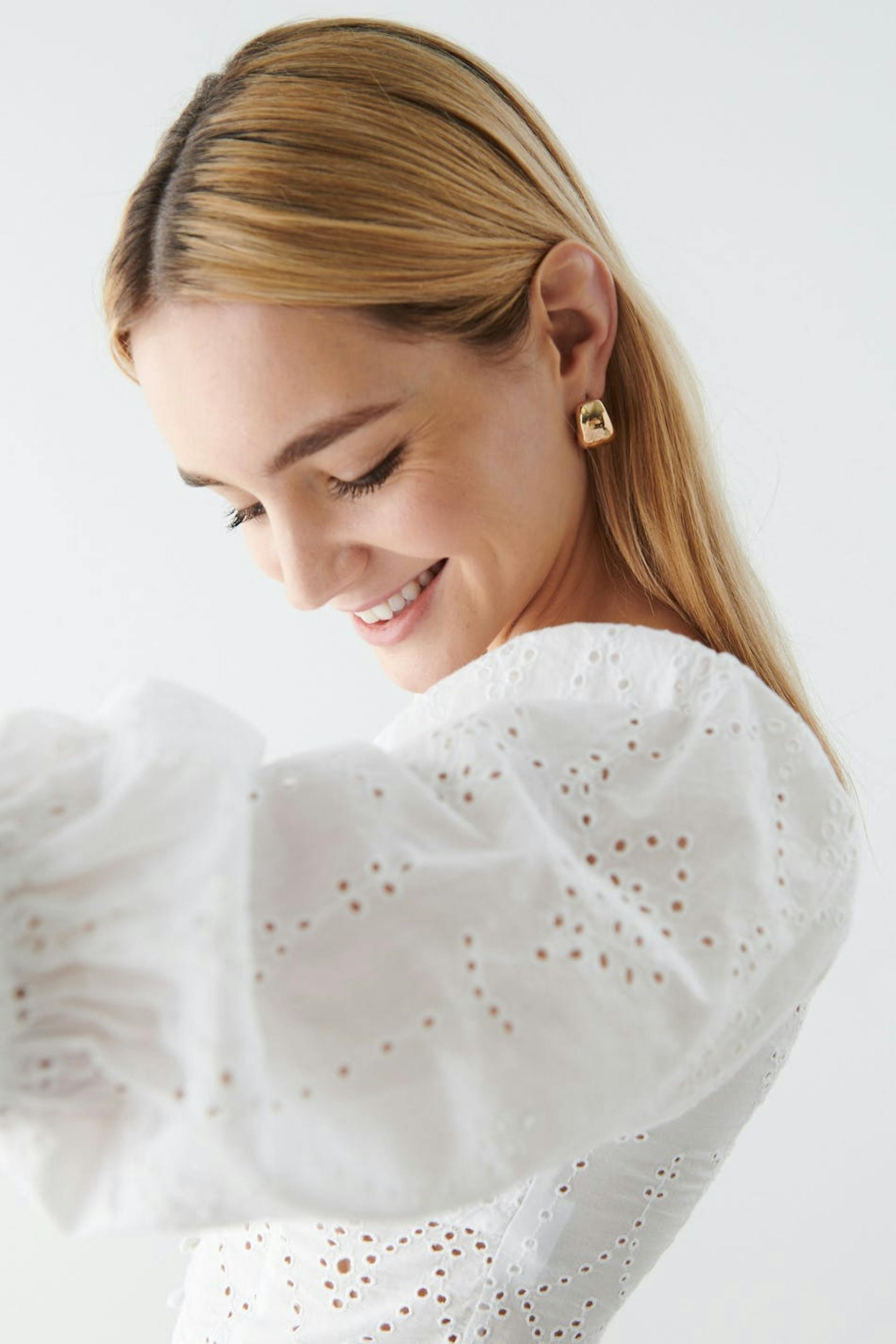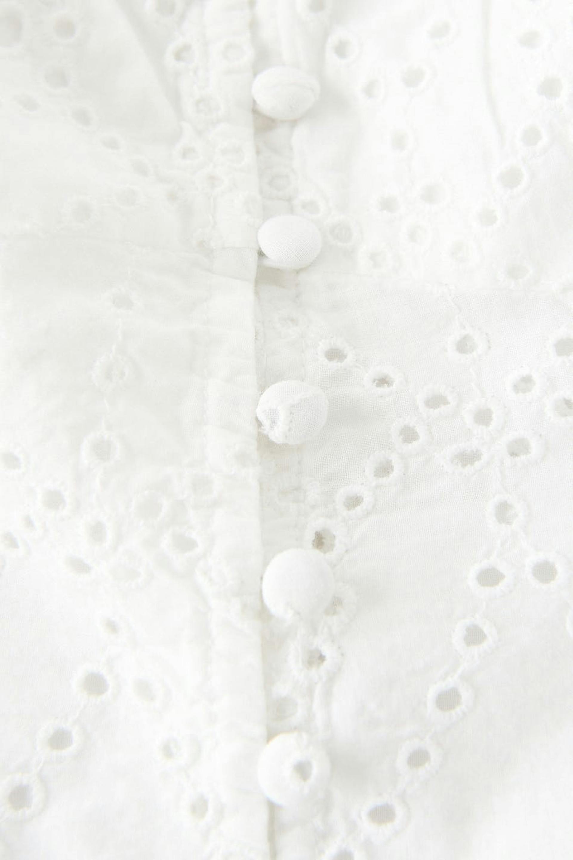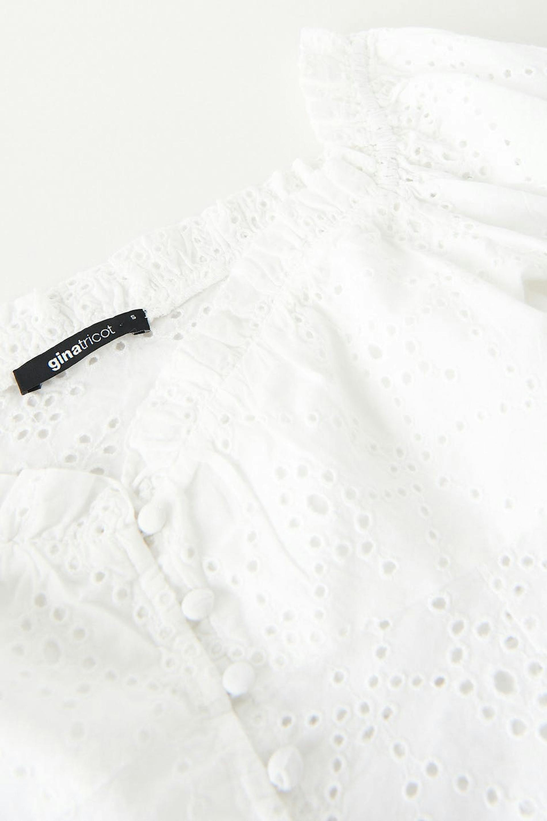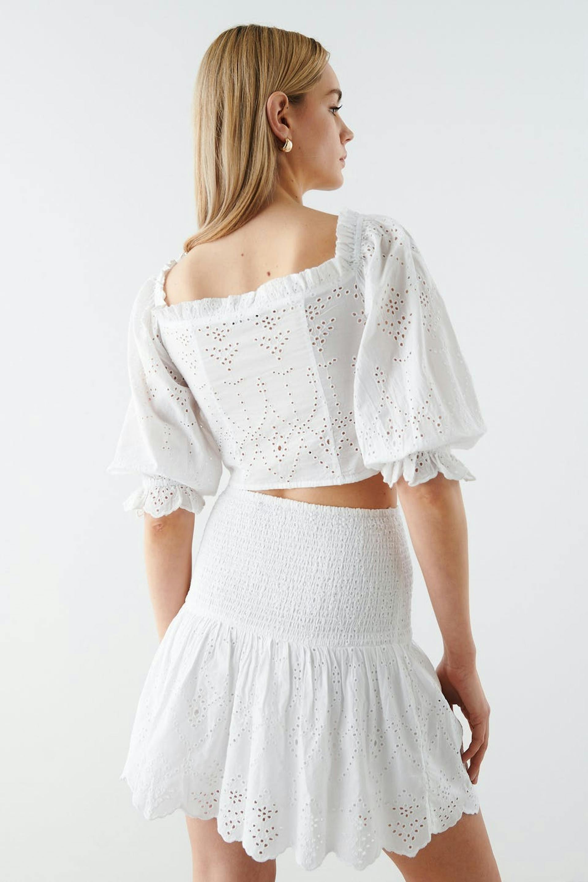 Afgesneden bustiertopje met driekwart mouwen. Het topje is wit en heeft borduurwerk met gaten. Het heeft een nauwsluitende pasvorm, details met franjes aan de halslijn, elastiek aan de schouders, knooppas aan de voorkant en ruches met elastiek aan de uiteinden van de mouwen.