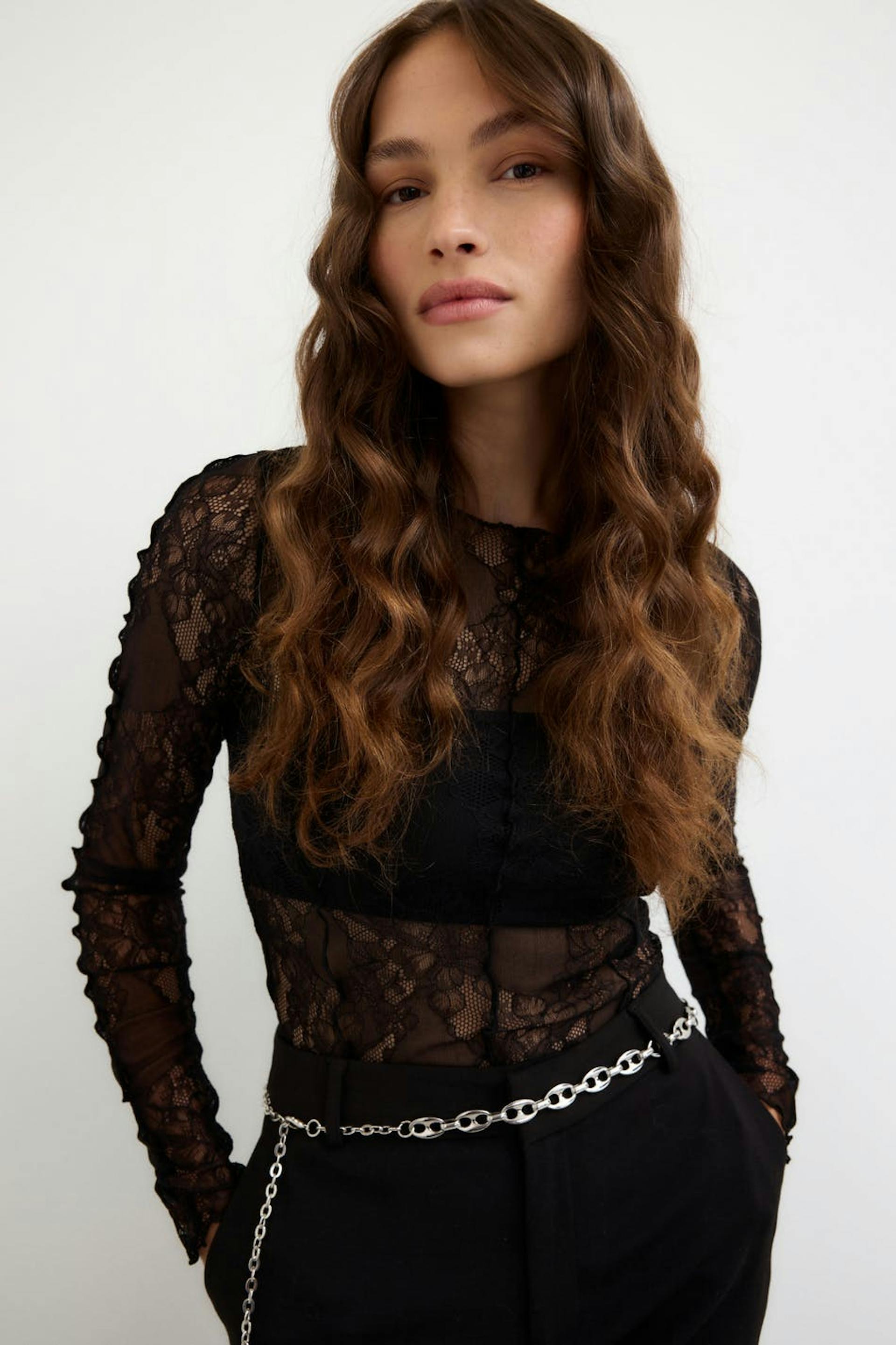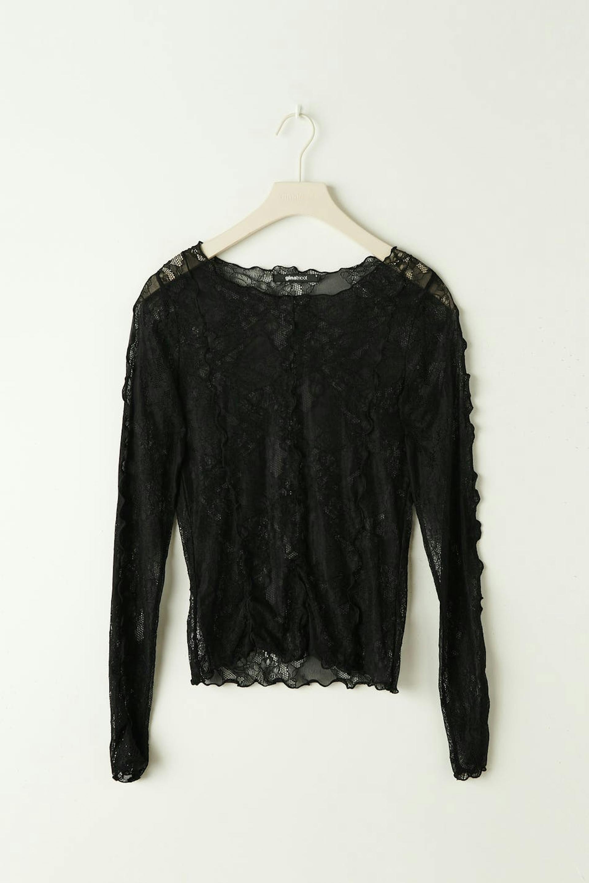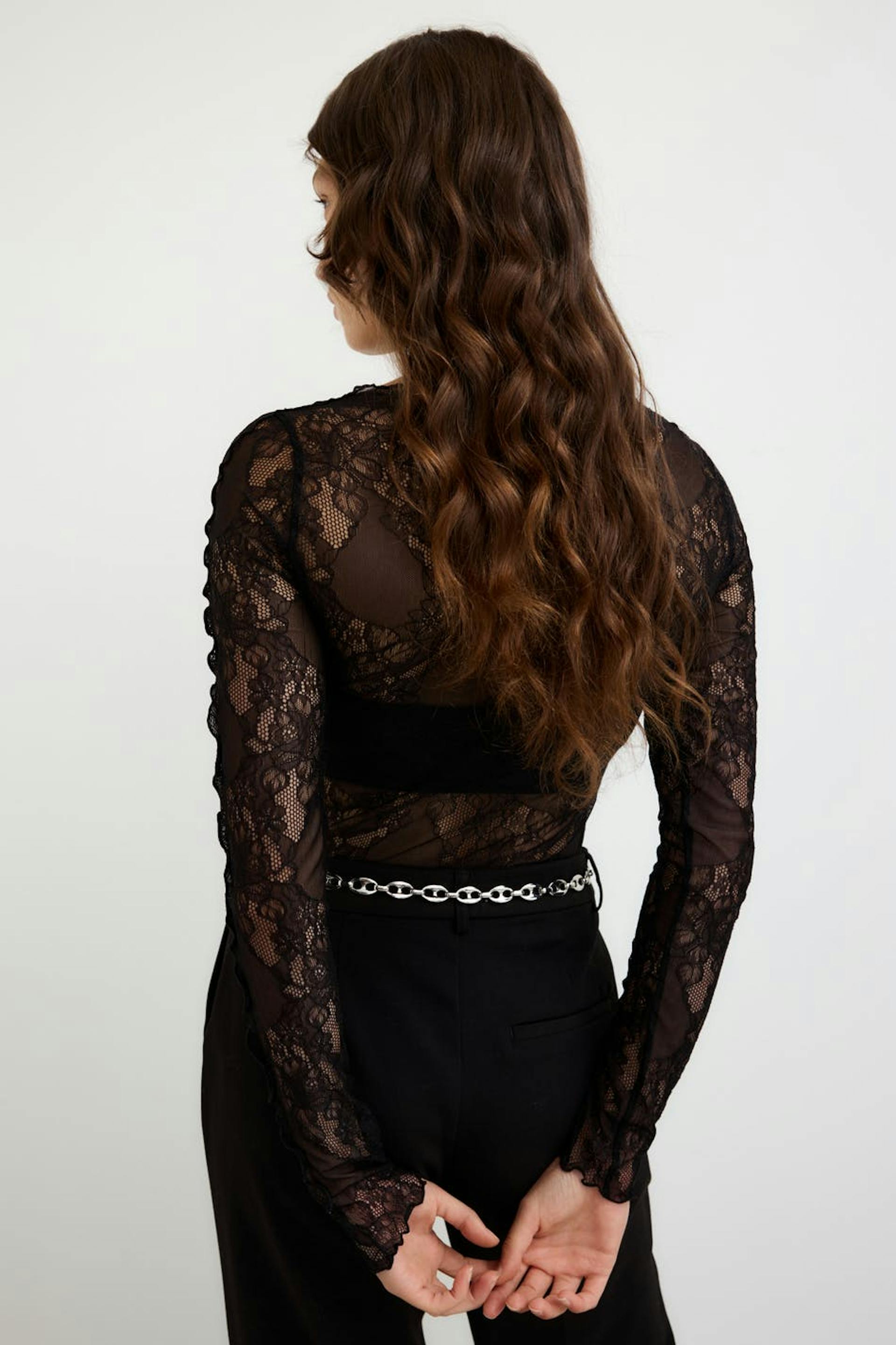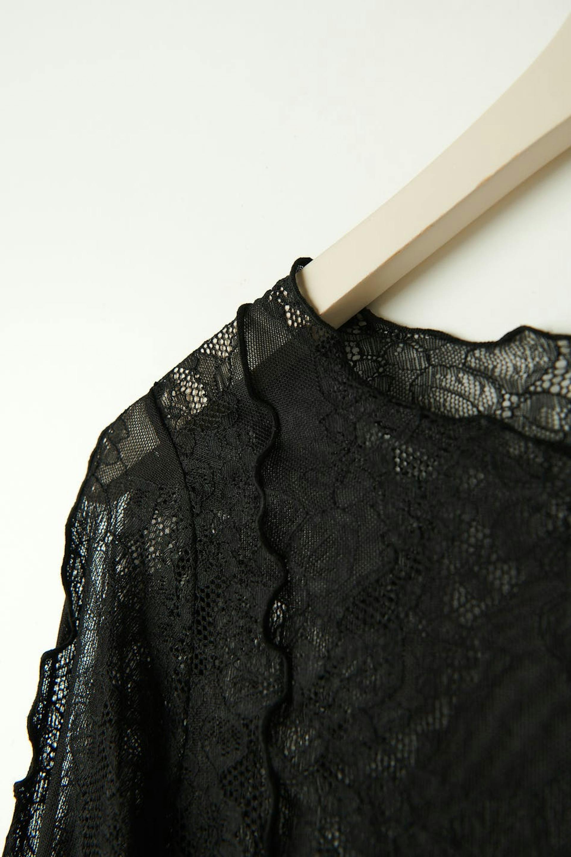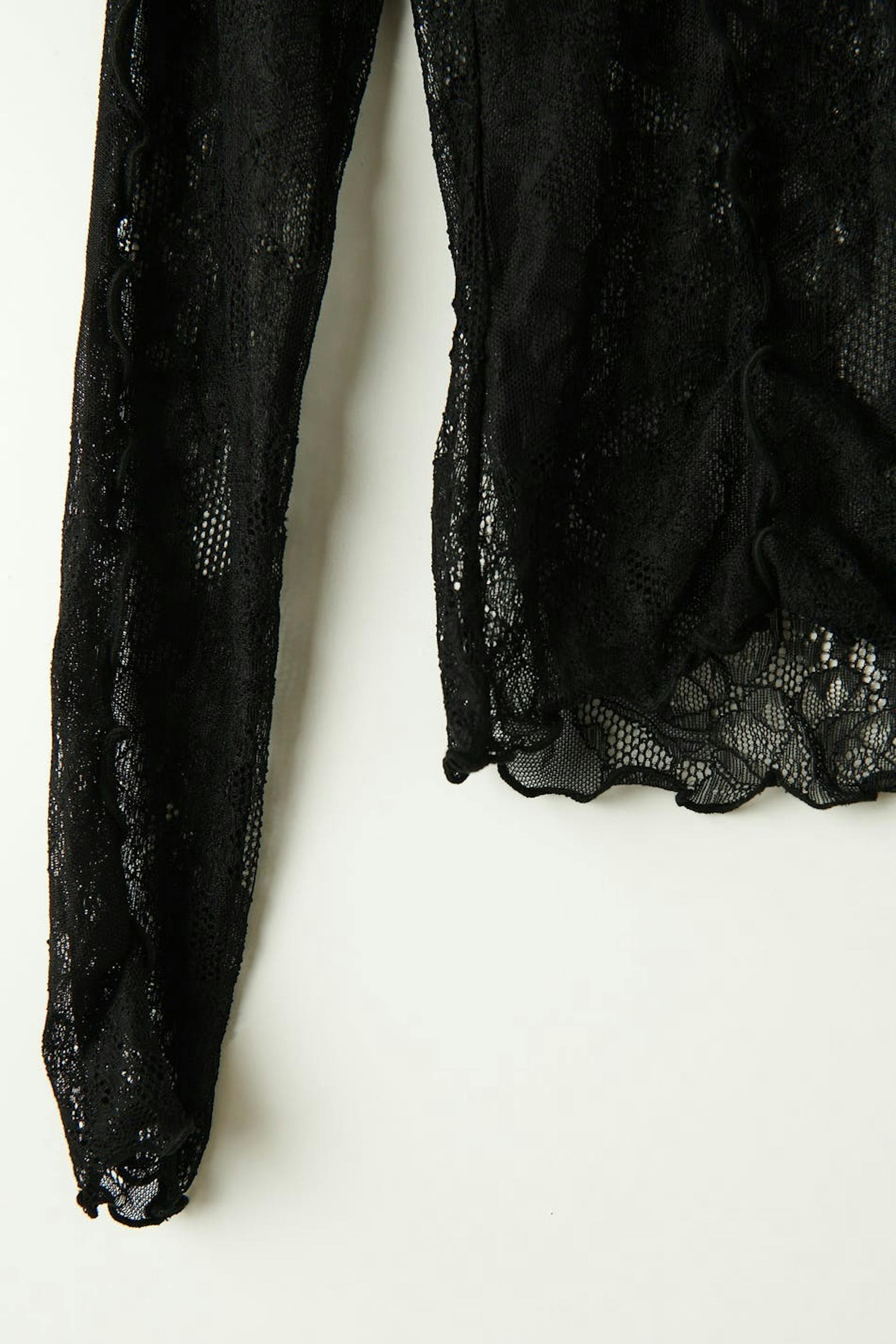 Kanten topje met lange mouwen met nauwsluitende pasvorm. Het topje is zwart en heeft gerolde kanten. Het heeft ronde halslijn.