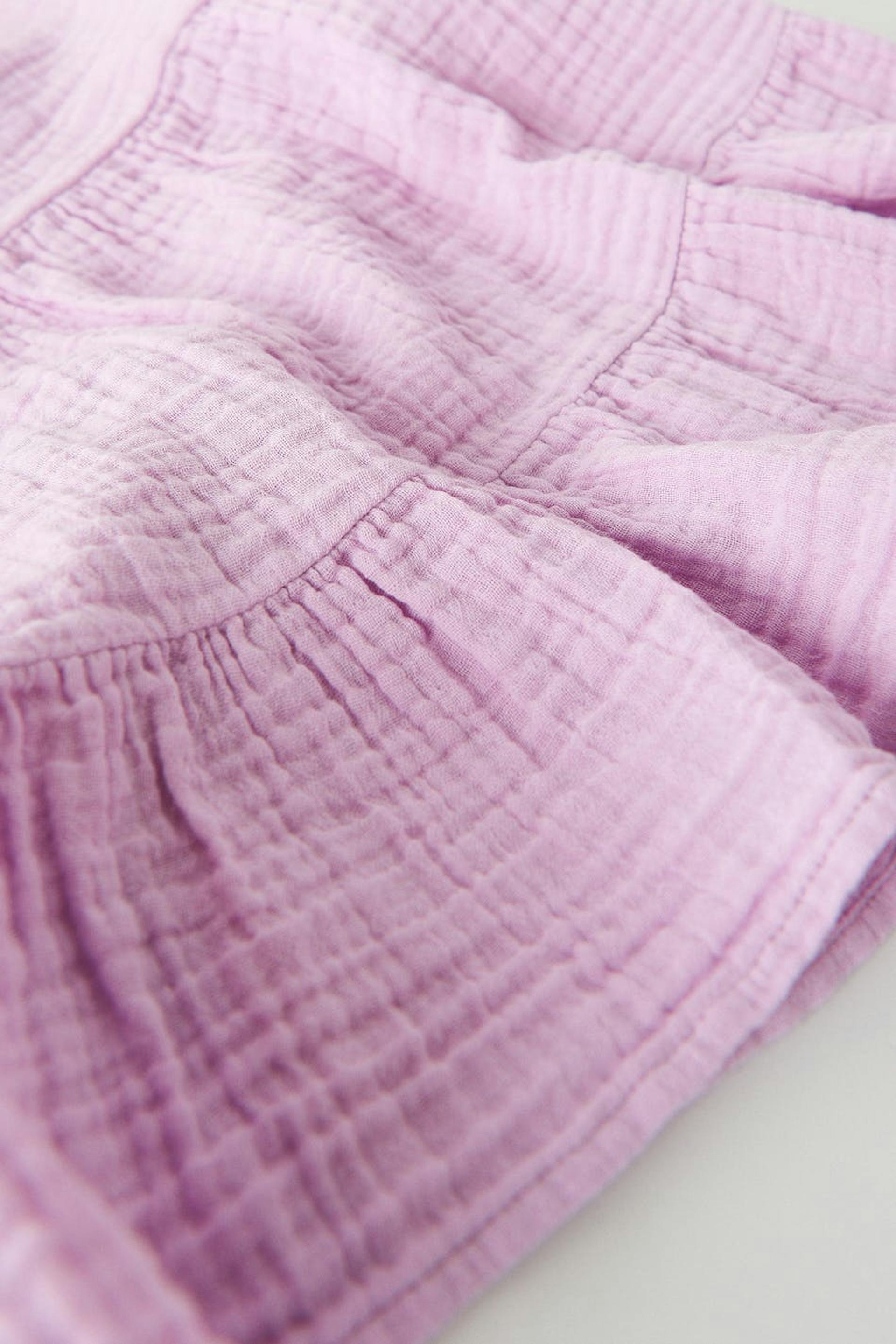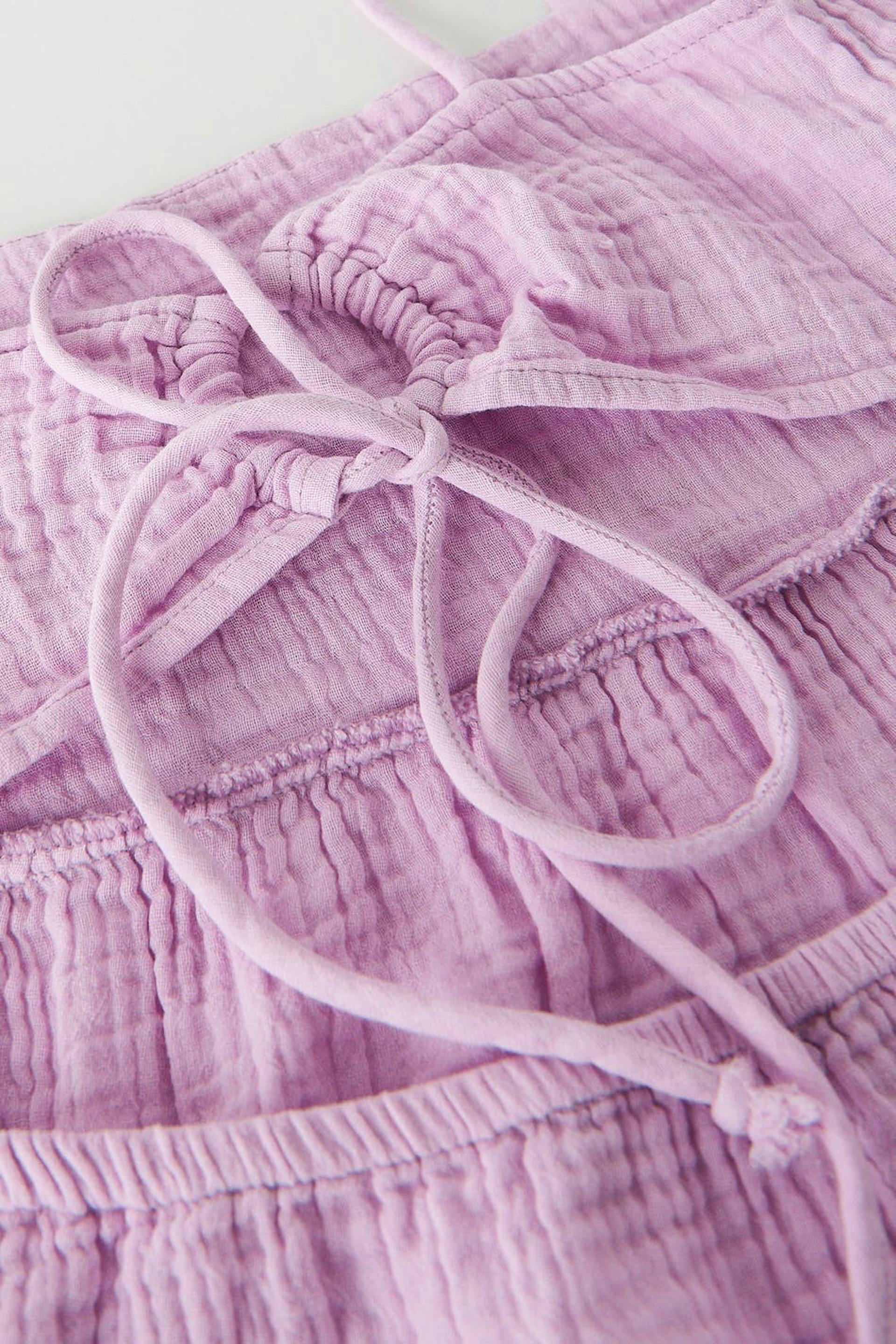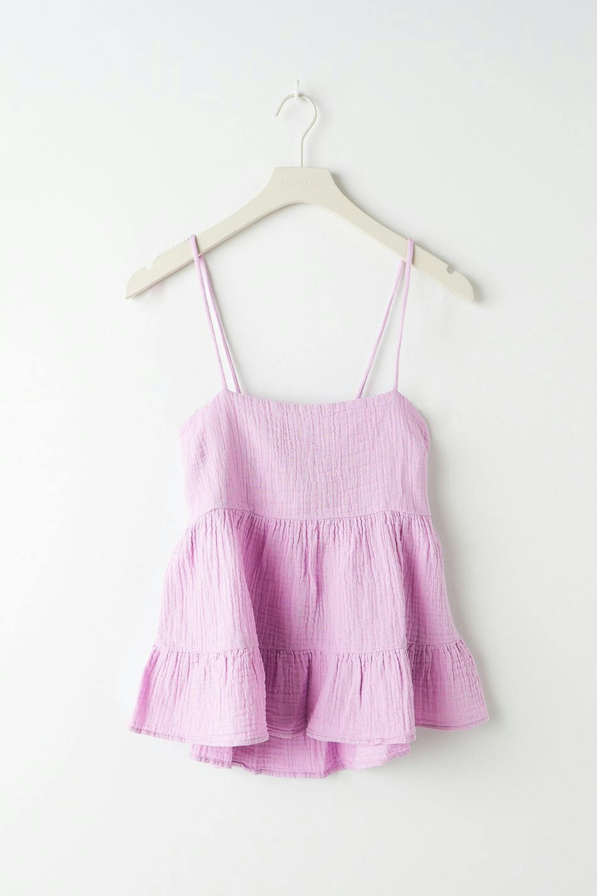 Korte tank met een a-lijnontwerp. De tank is paars en heeft volanten aan de onderkant. Het heeft een strikband op de rug, dunne schouderriemen en dubbelgeweven katoen kwaliteit voor een zacht en comfortabel gevoel.