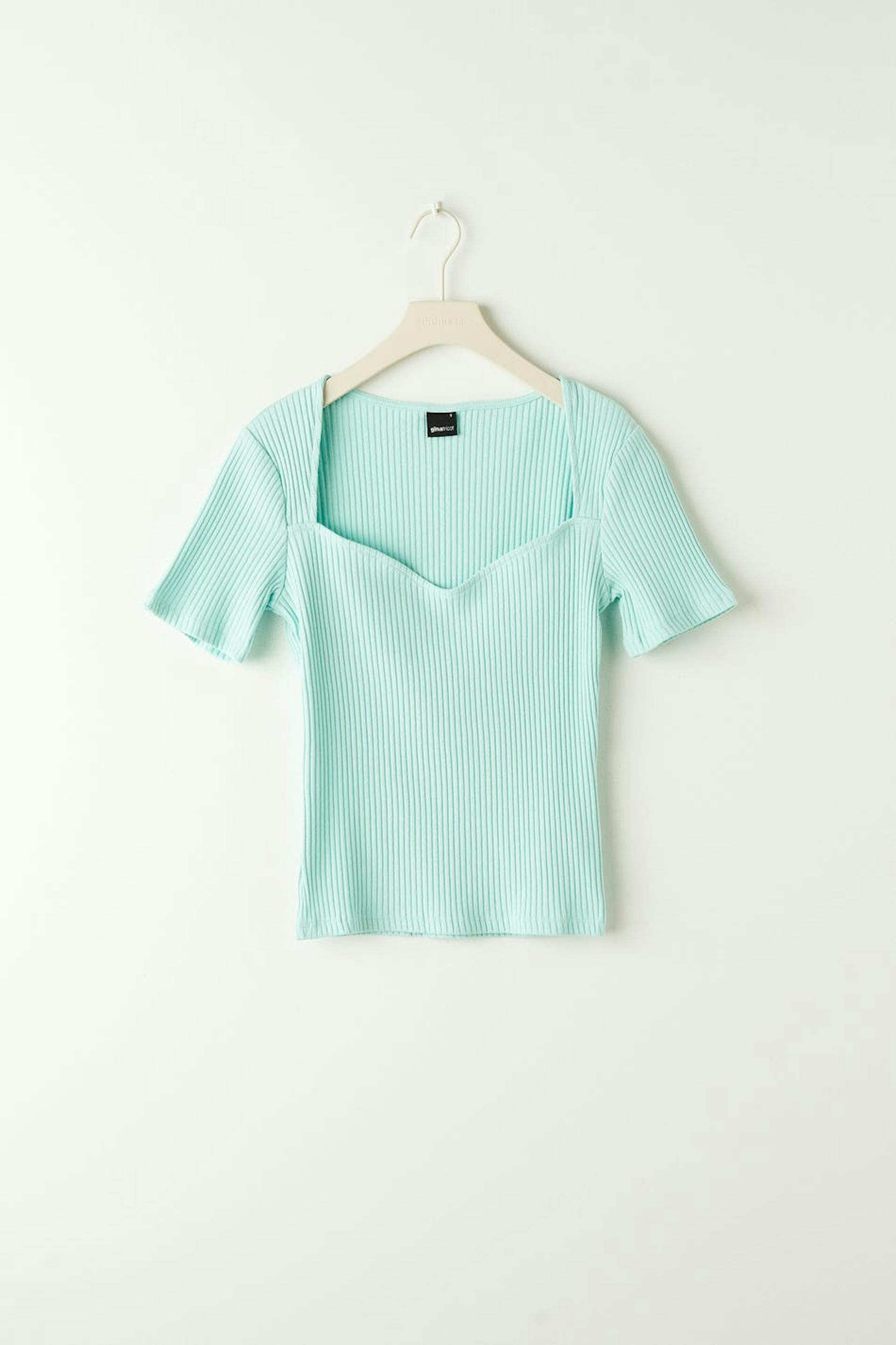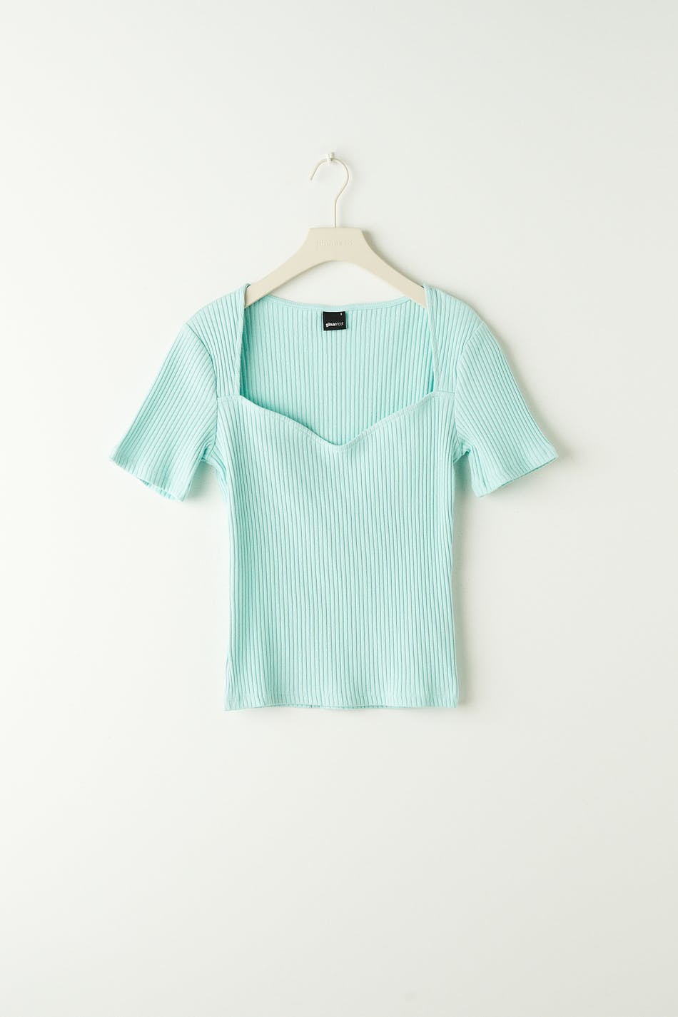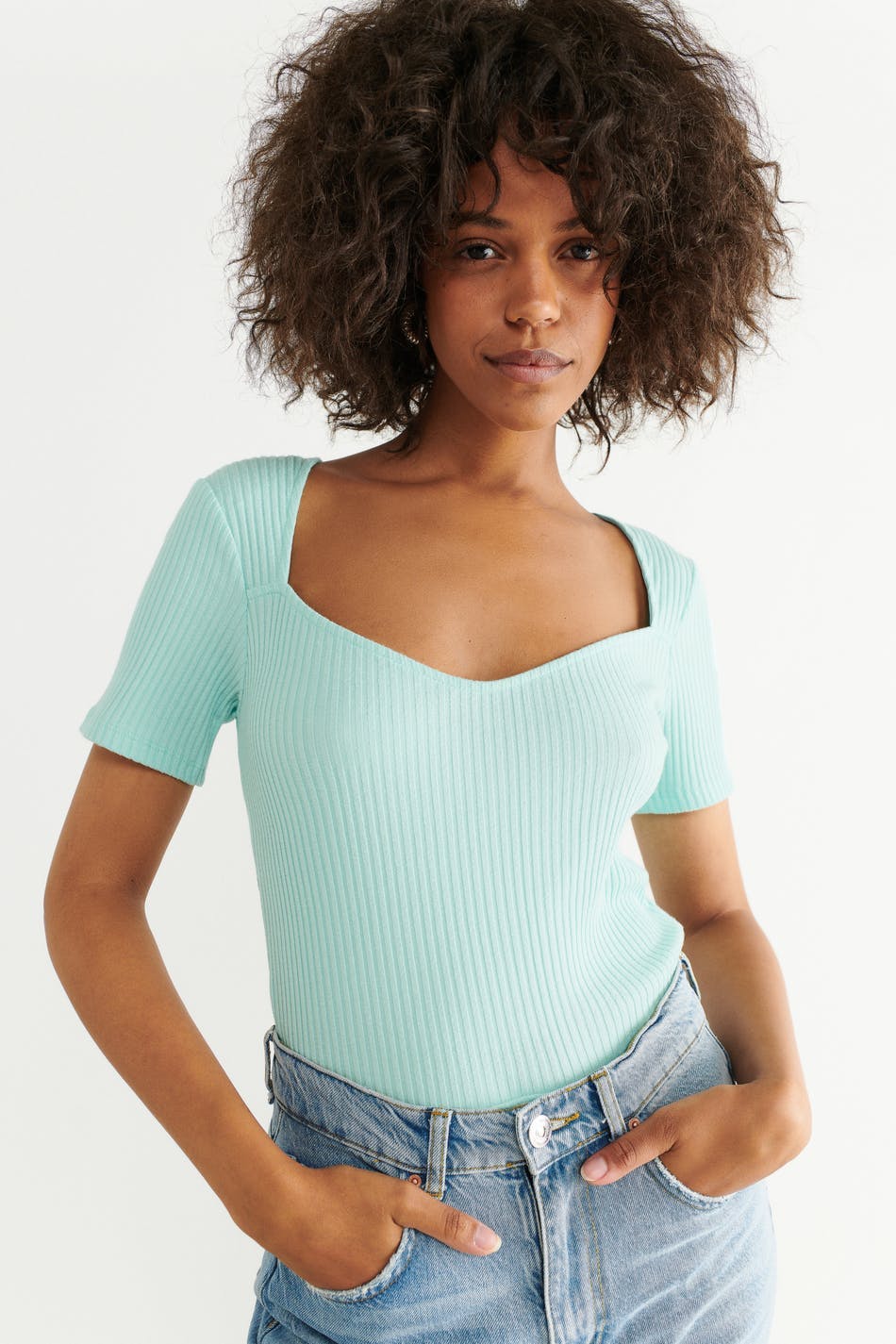Geribbeld topje met hartvormige hals. Het topje heeft nauwsluitende pasvorm met halve mouwen.