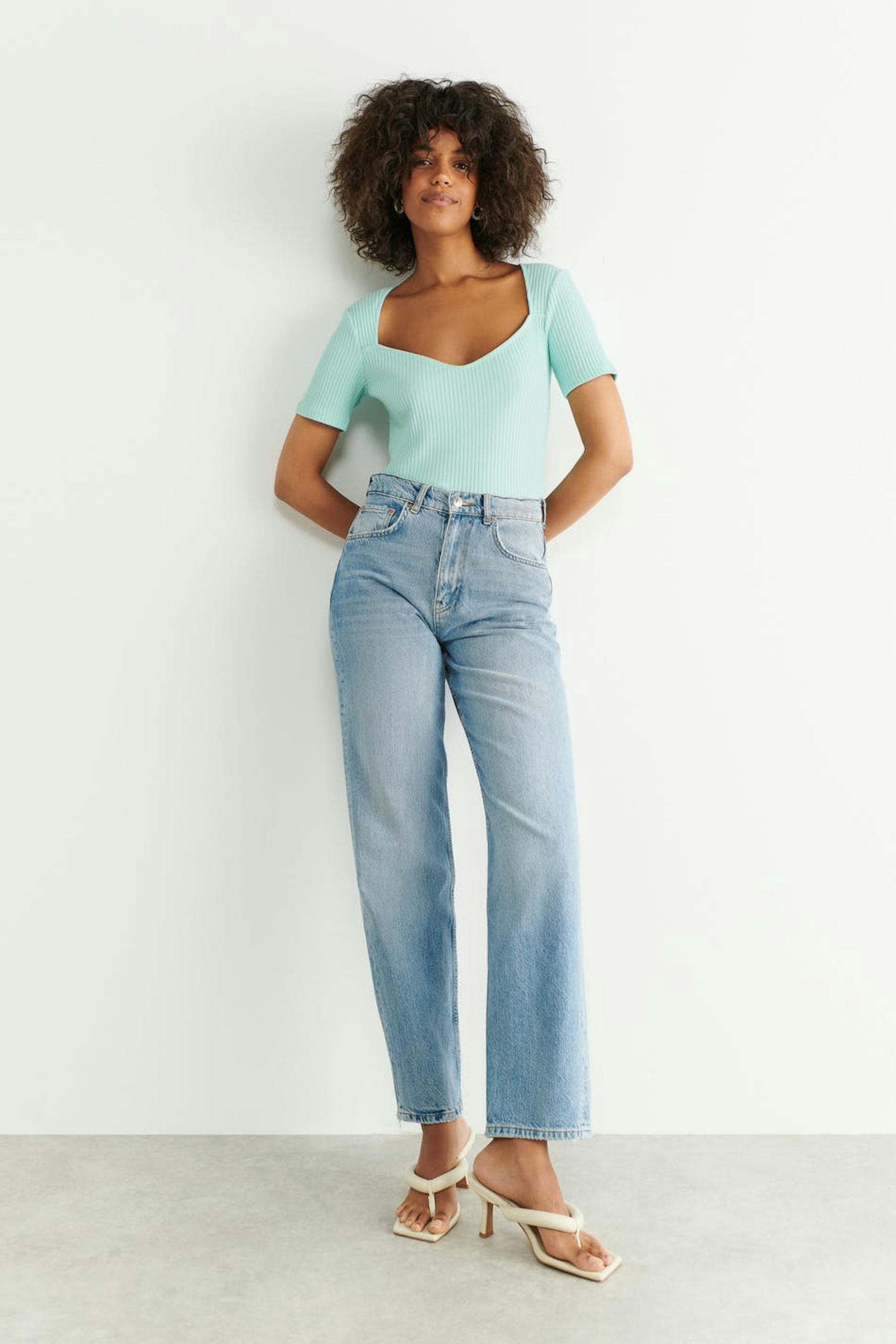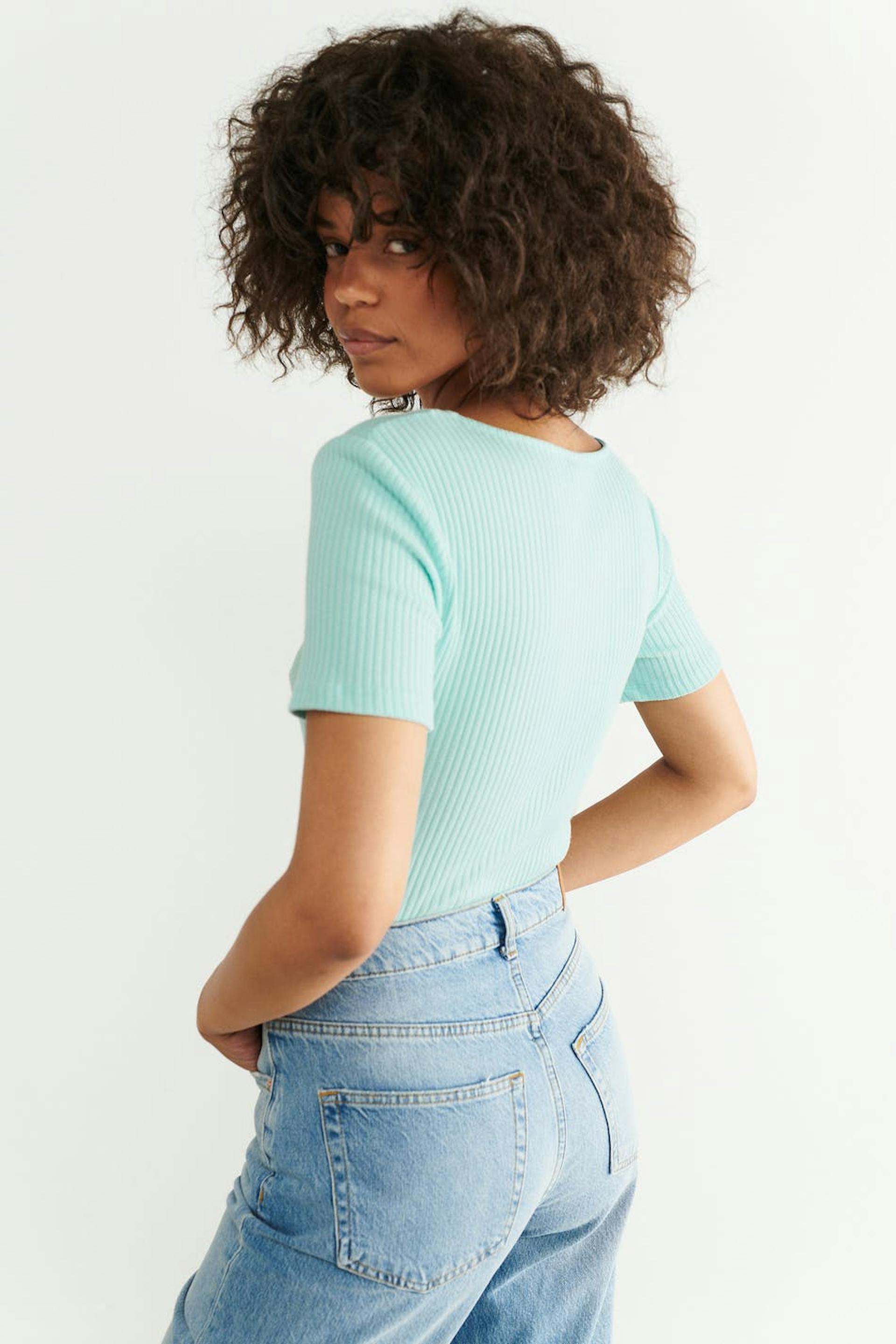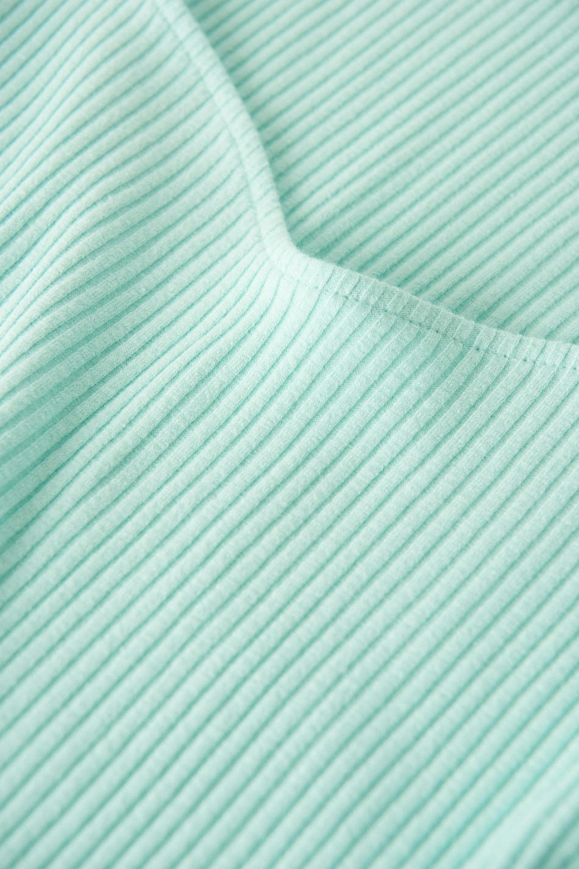 Geribbeld topje met hartvormige hals. Het topje heeft nauwsluitende pasvorm met halve mouwen.