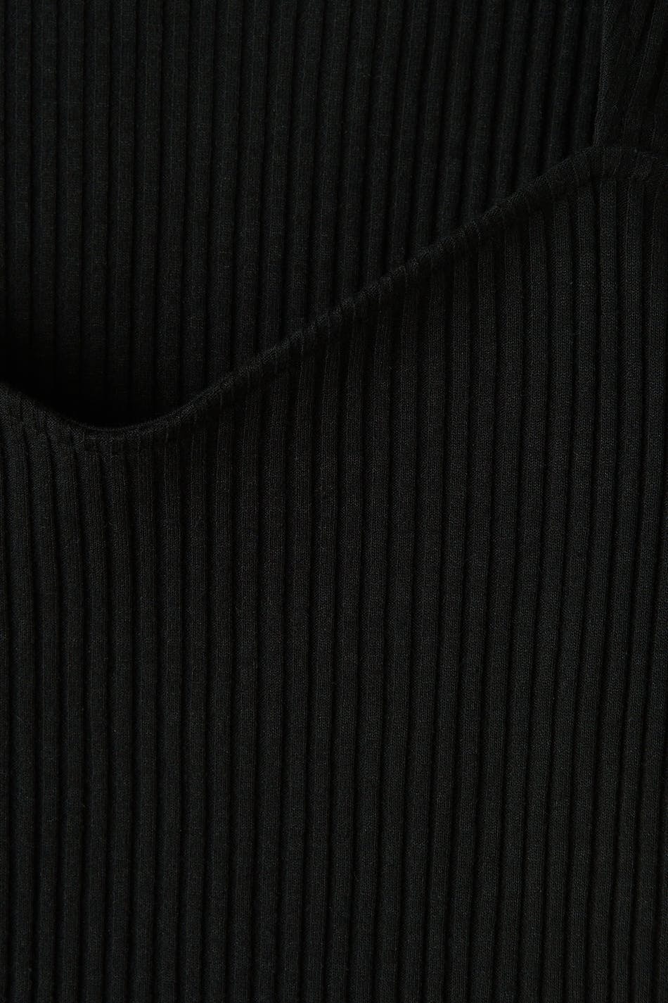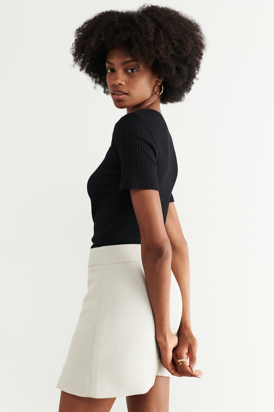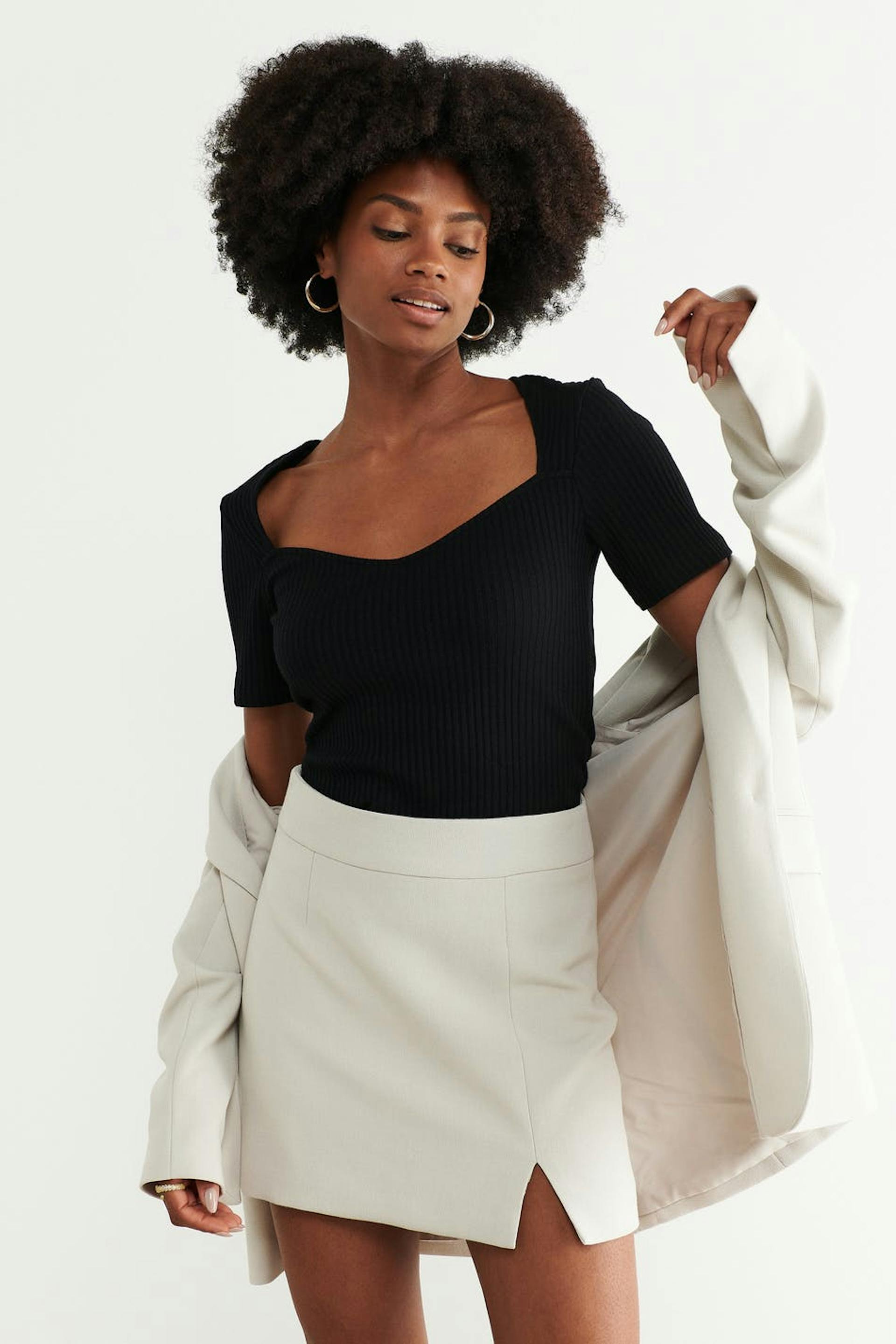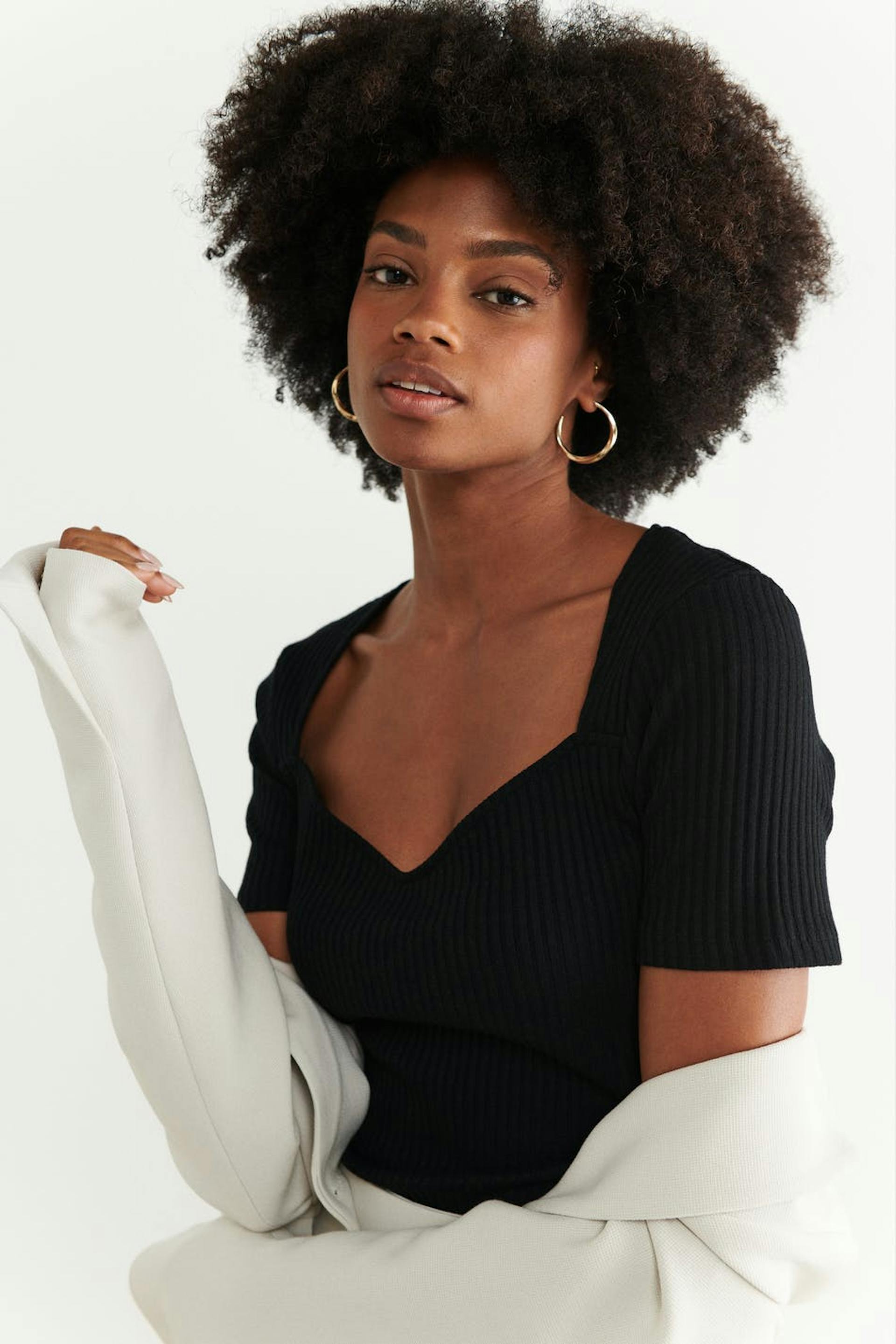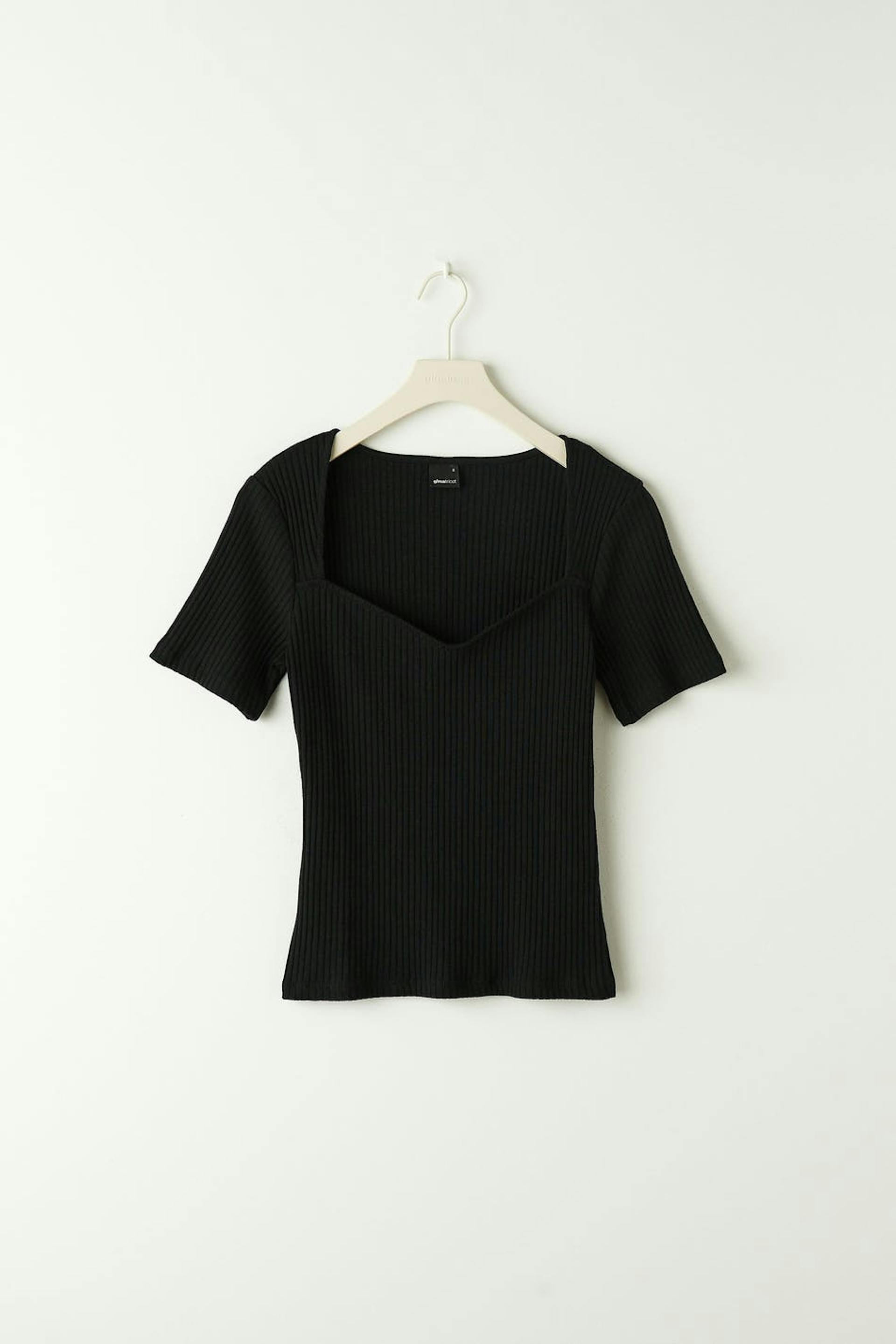 Geribbeld topje met hartvormige hals. Het topje is zwart en heeft nauwsluitende pasvorm met halve mouwen.