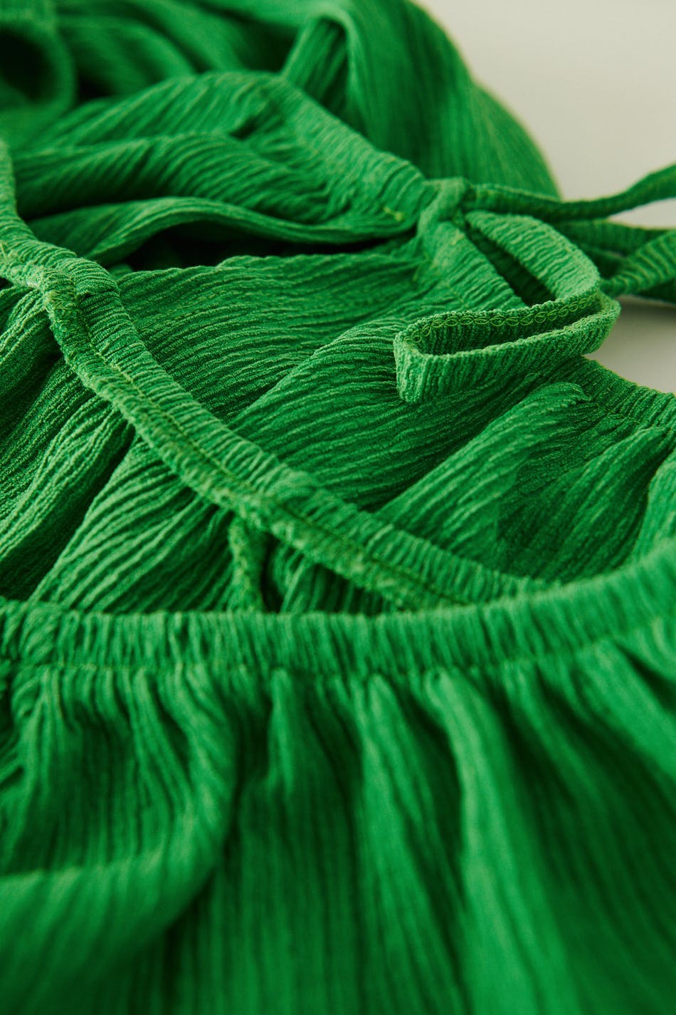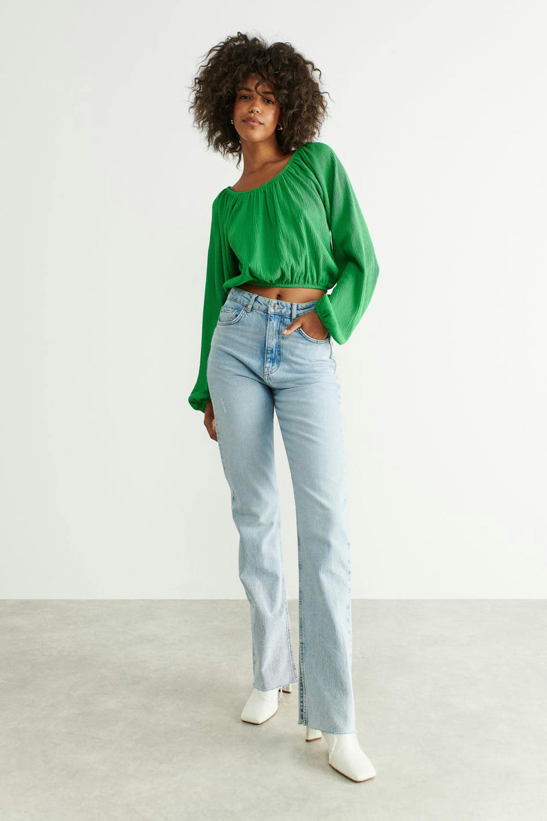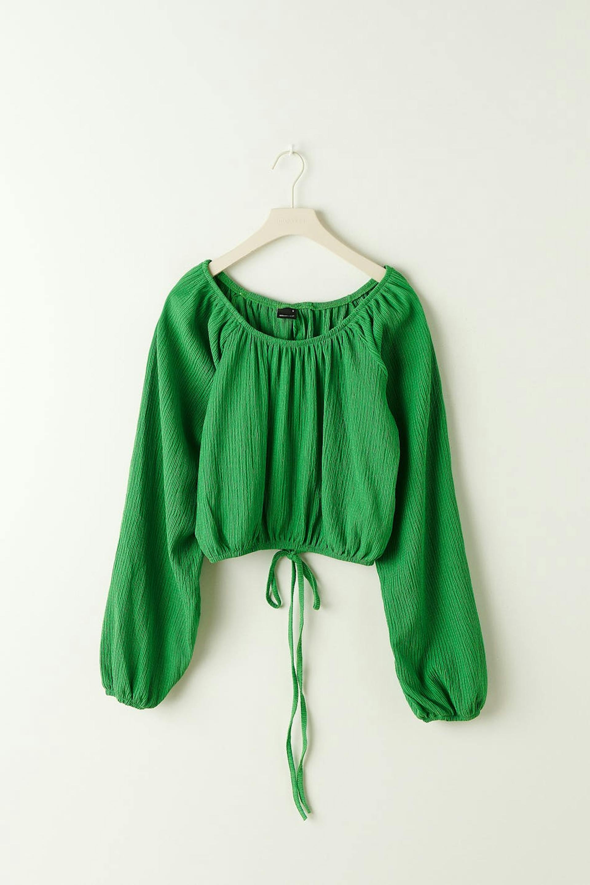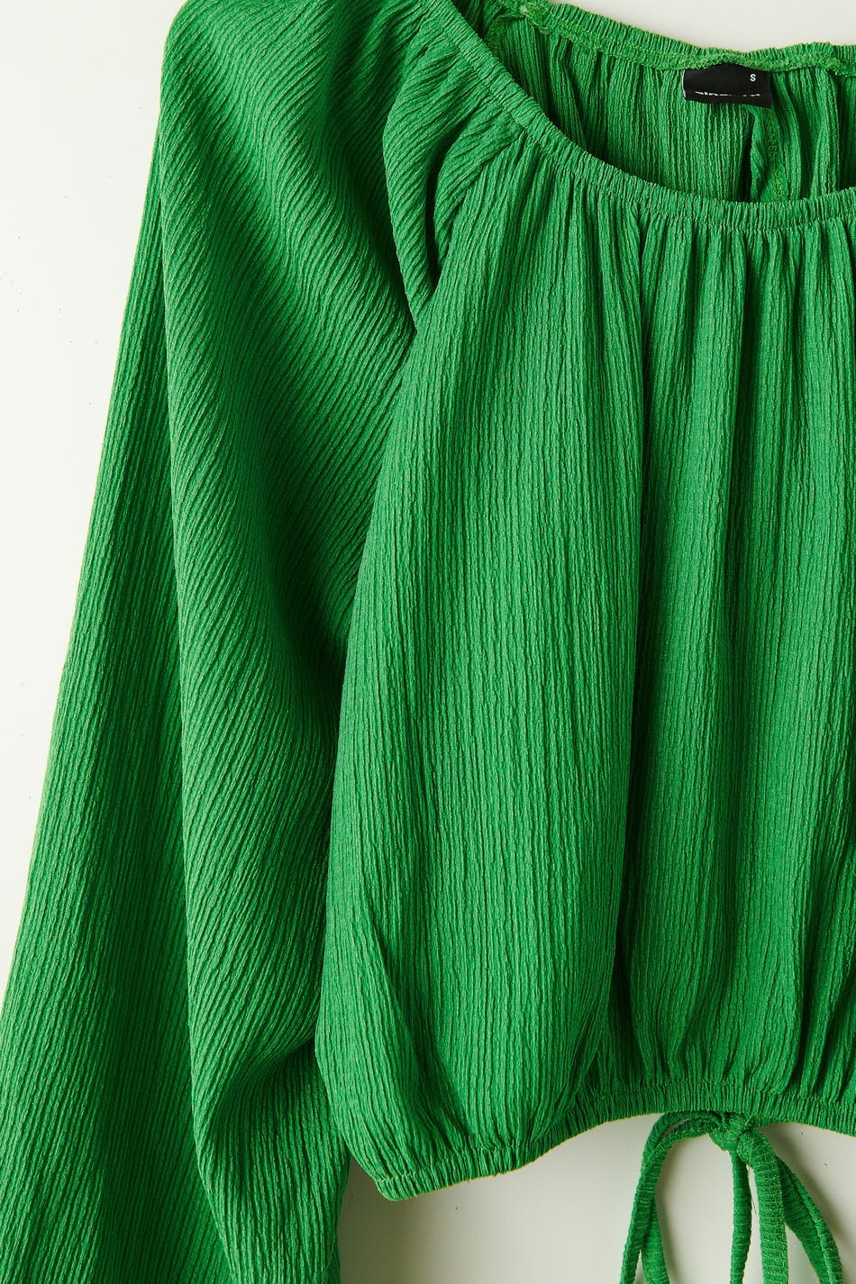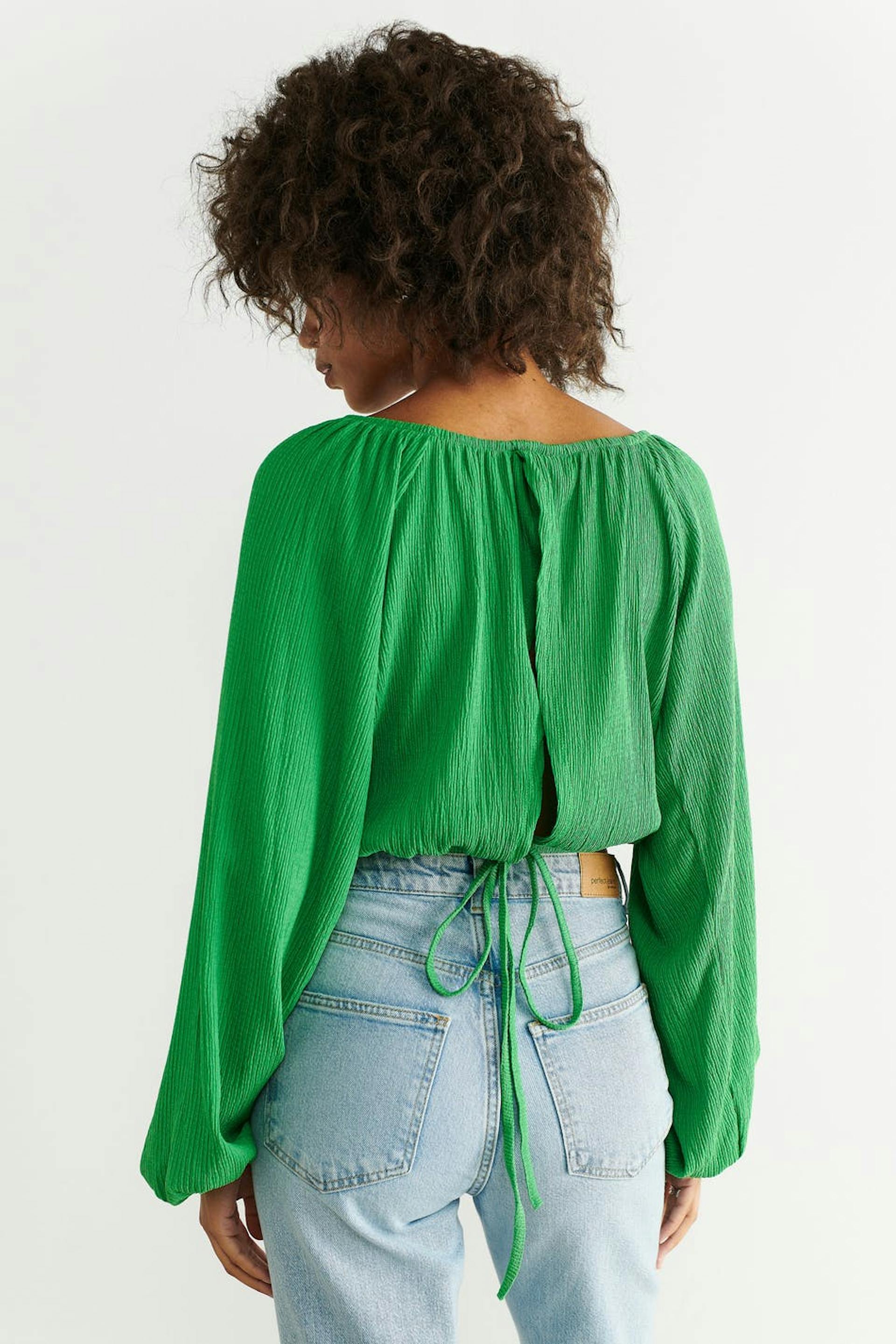Topje met lange mouwen met open rug. Het topje is groen en heeft ballonmouwen. Het heeft een gestructureerd materiaal, ronde halslijn en zelfbinder op de rug.