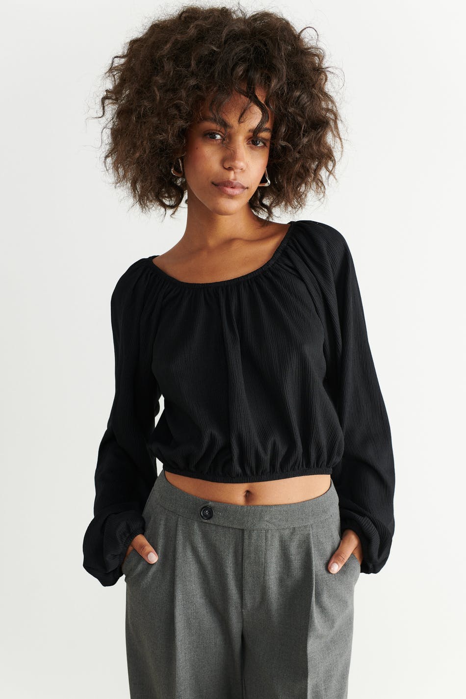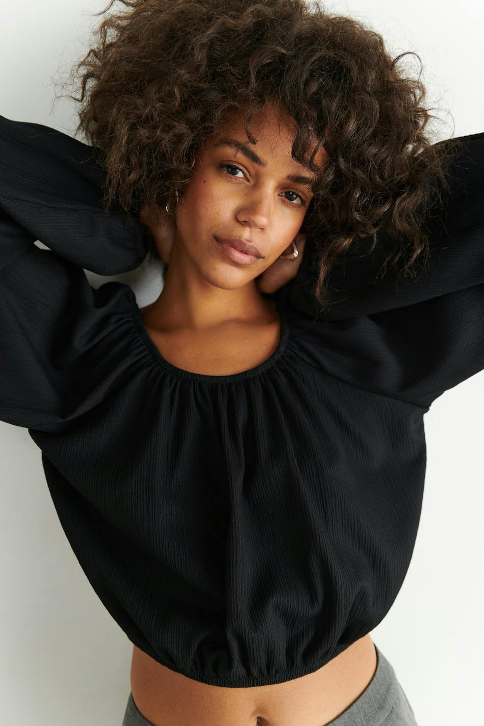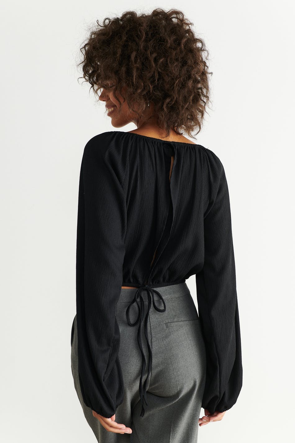 Topje met lange mouwen met open rug. Het topje is zwart en heeft ballonmouwen. Het heeft een gestructureerd materiaal, ronde halslijn en zelfbinder op de rug.