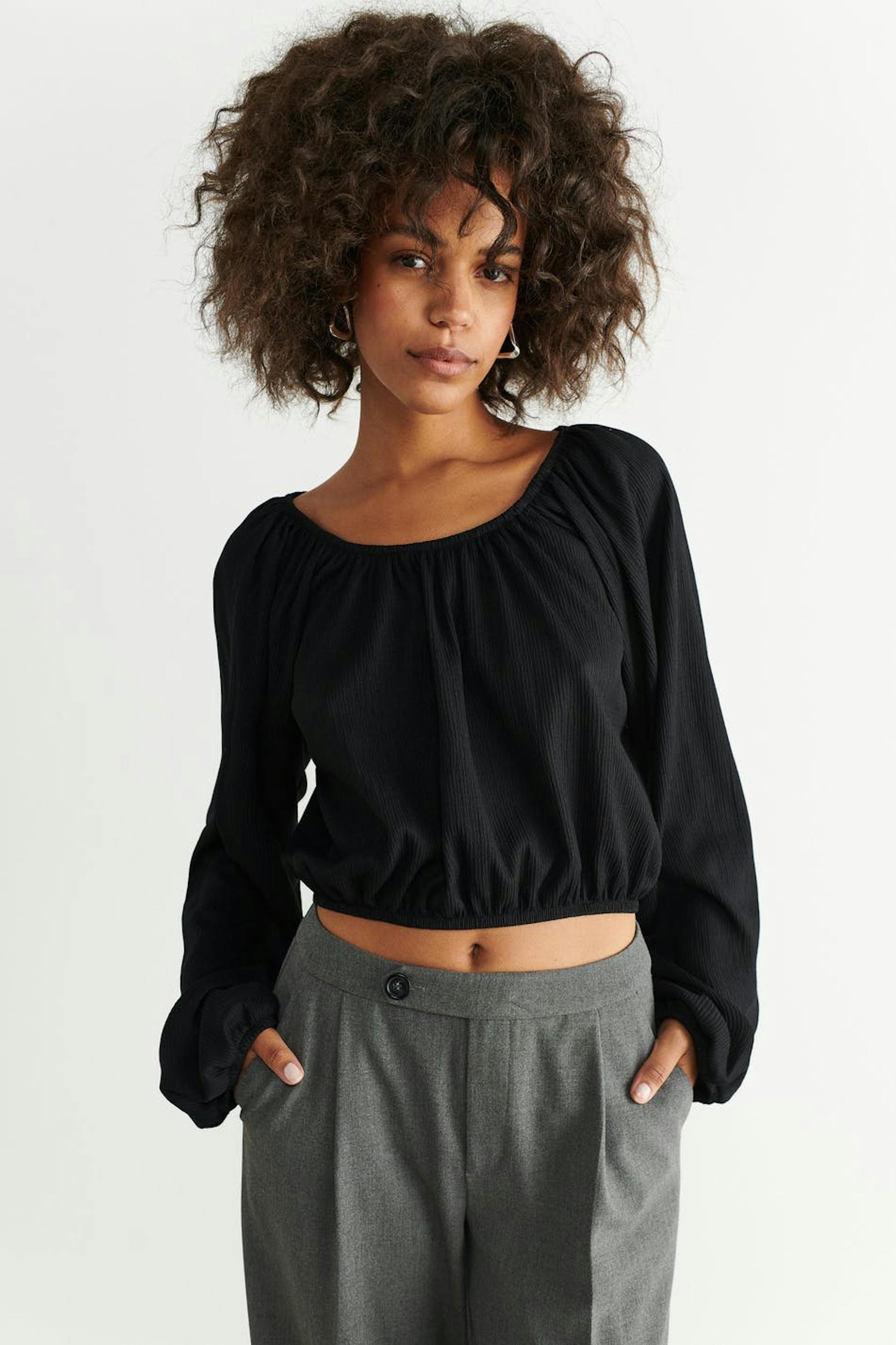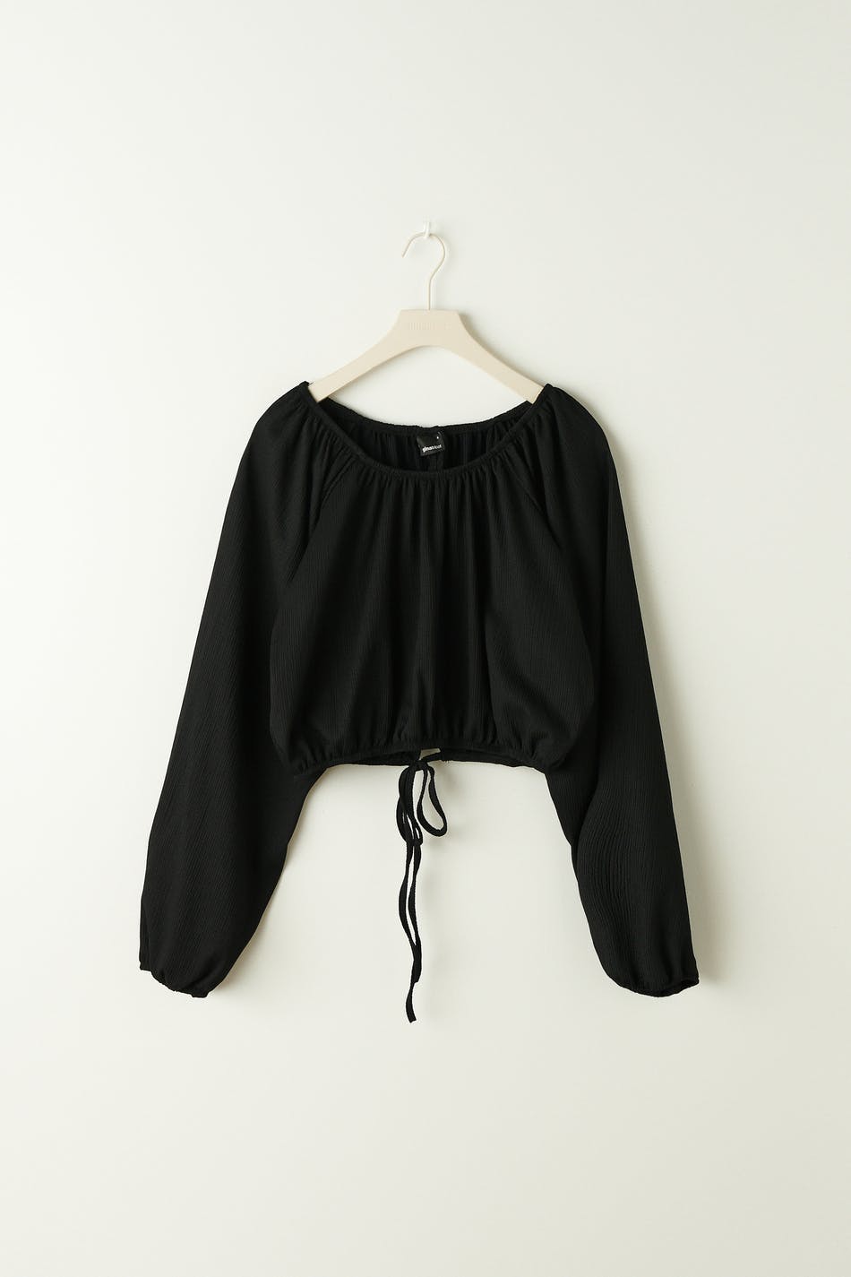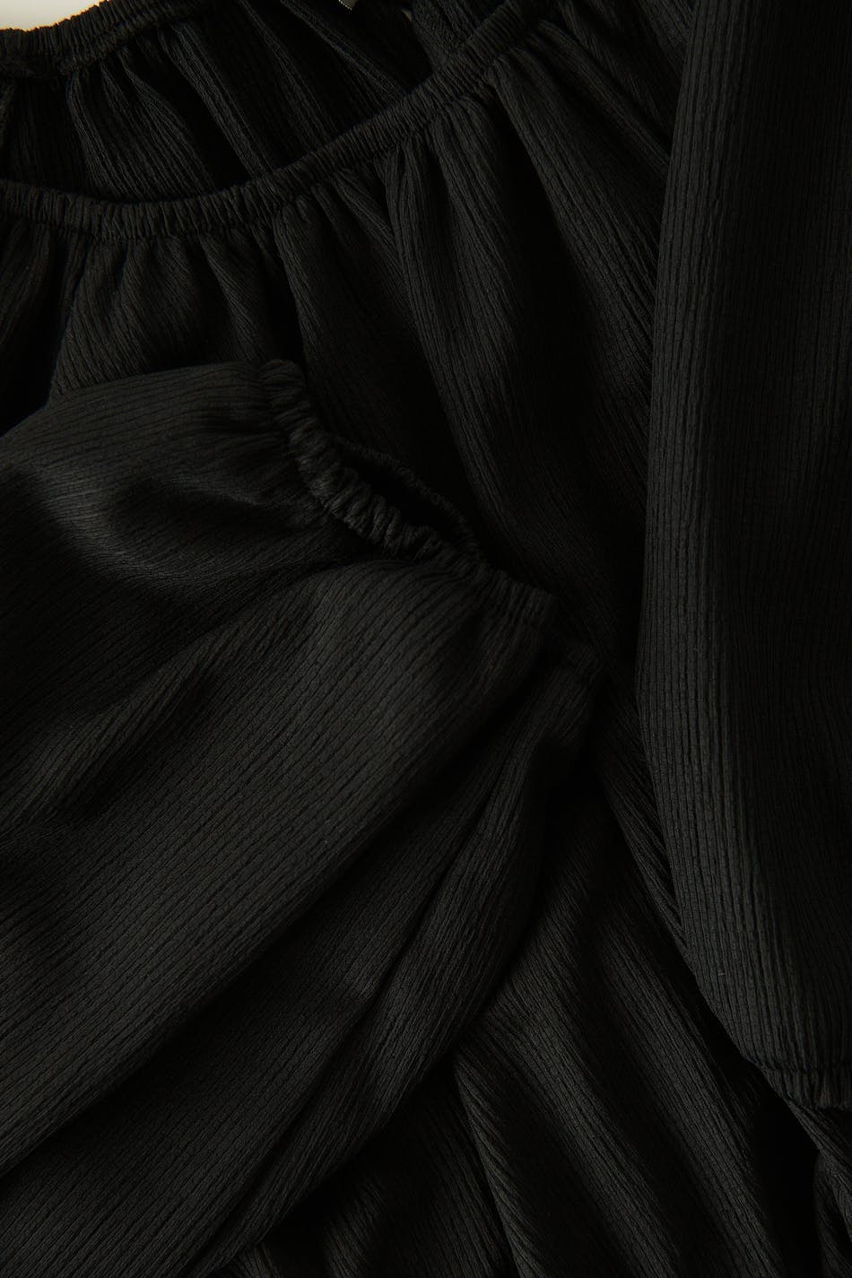 Topje met lange mouwen met open rug. Het topje is zwart en heeft ballonmouwen. Het heeft een gestructureerd materiaal, ronde halslijn en zelfbinder op de rug.