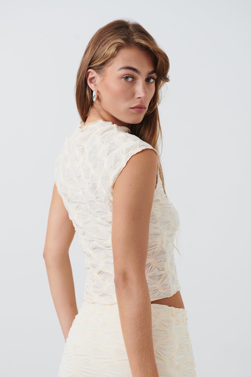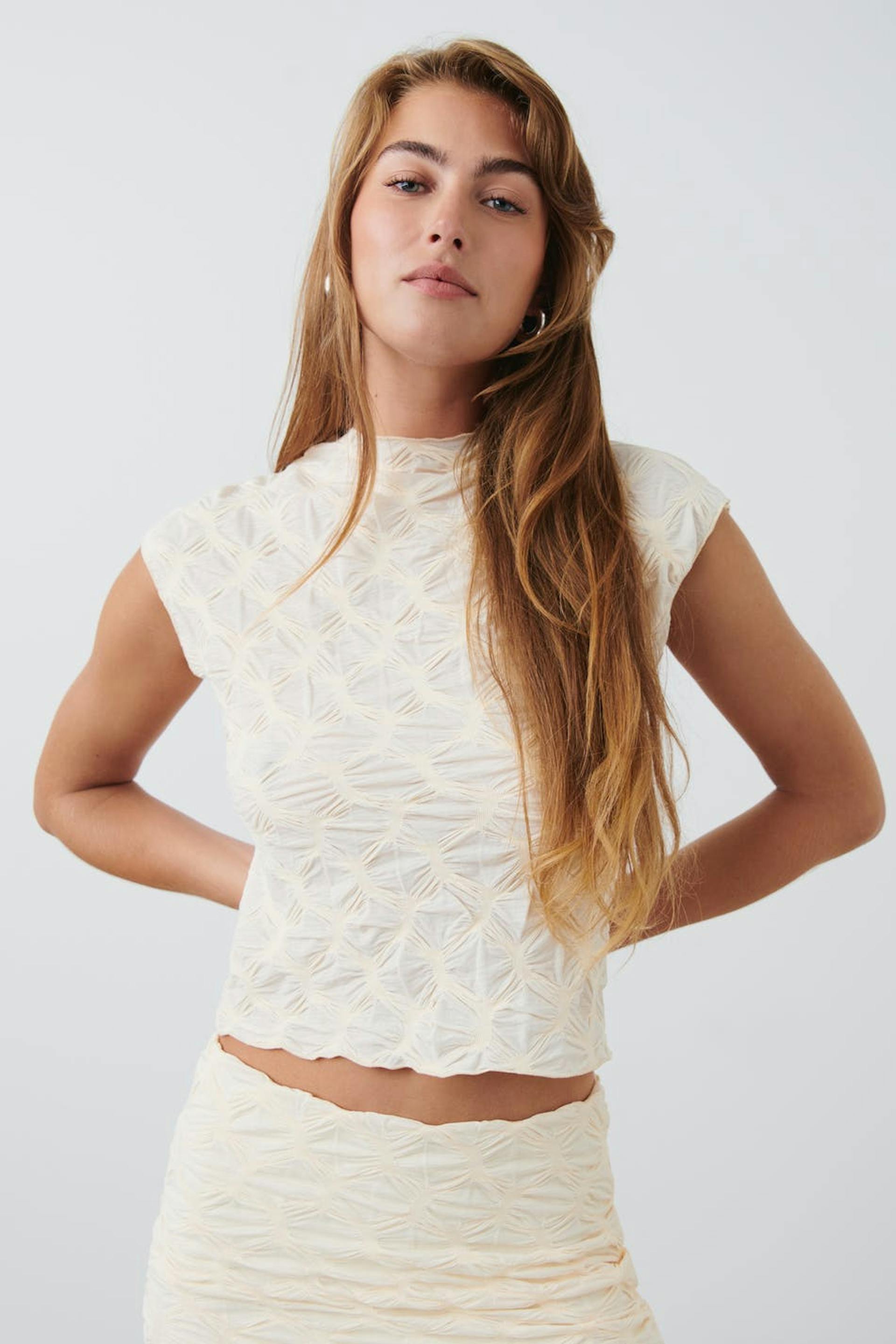 Mouwloos topje met hoge hals. Het topje is wit en heeft nauwsluitende pasvorm. Het heeft elastische kwaliteit met textuur.