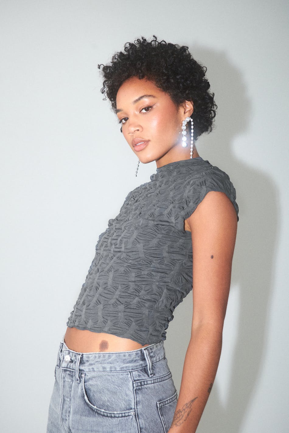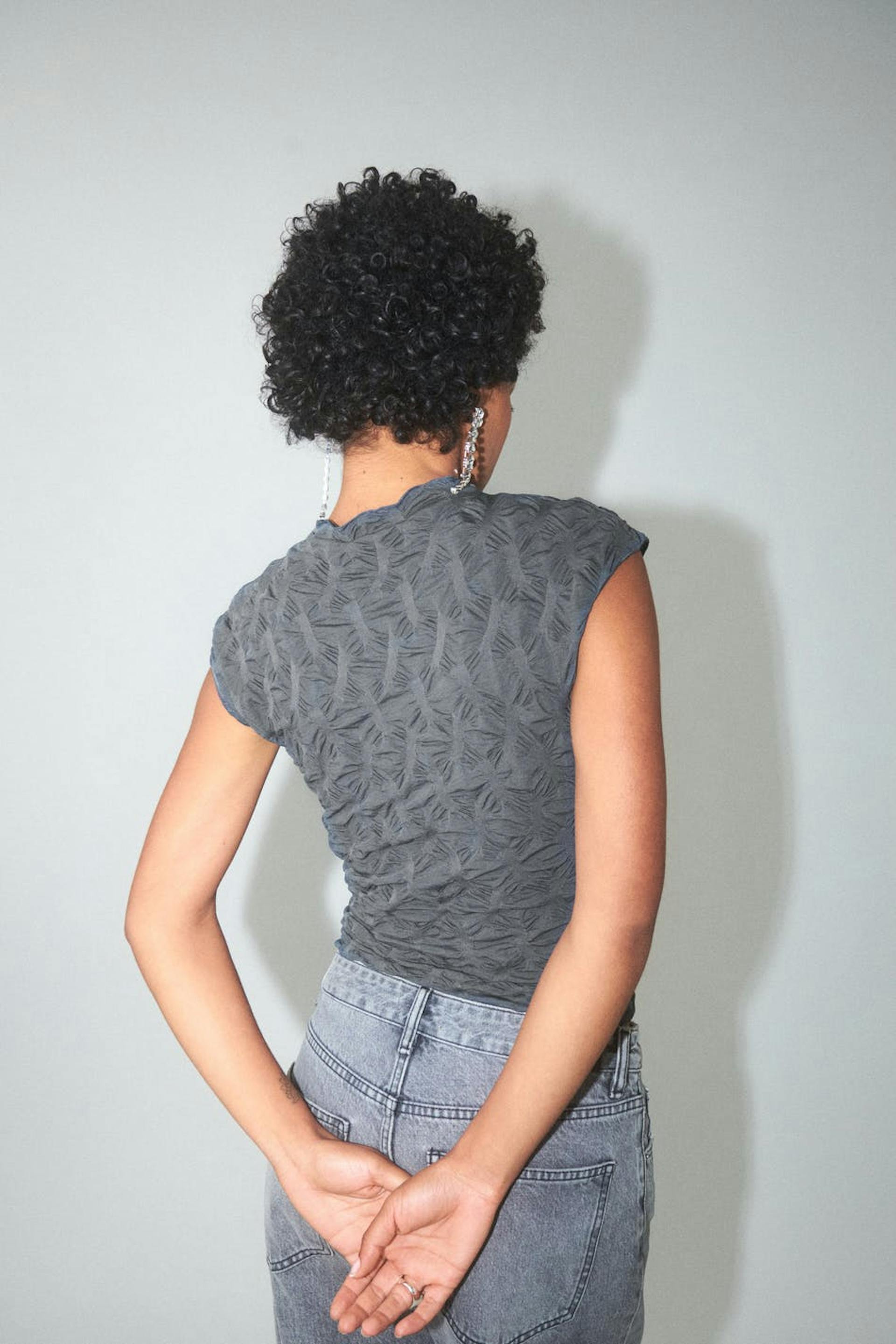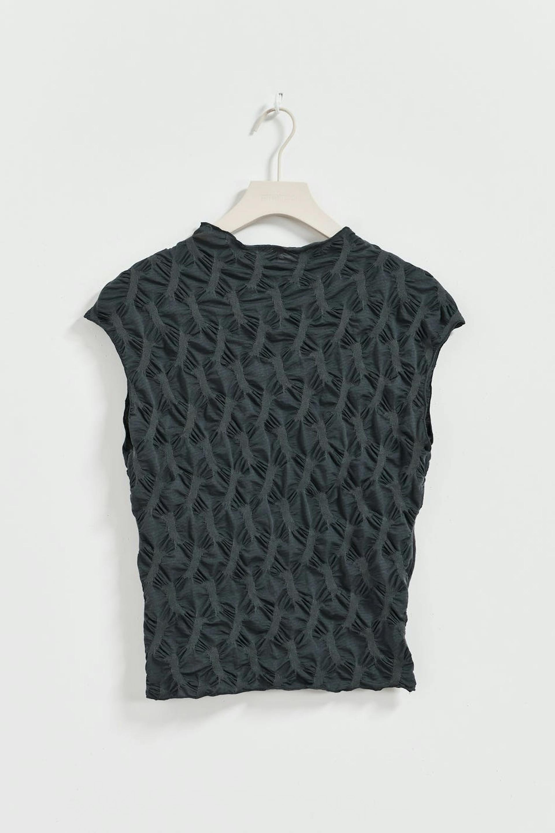 Mouwloos topje met hoge hals. Het topje is grijs en heeft nauwsluitende pasvorm. Het heeft elastische kwaliteit met textuur.