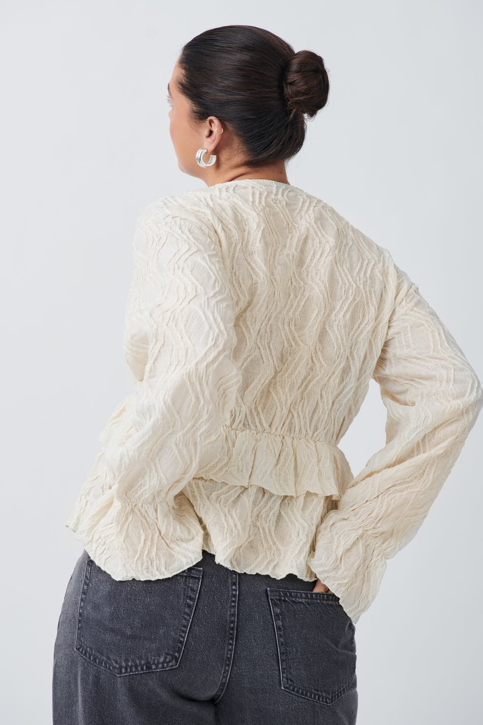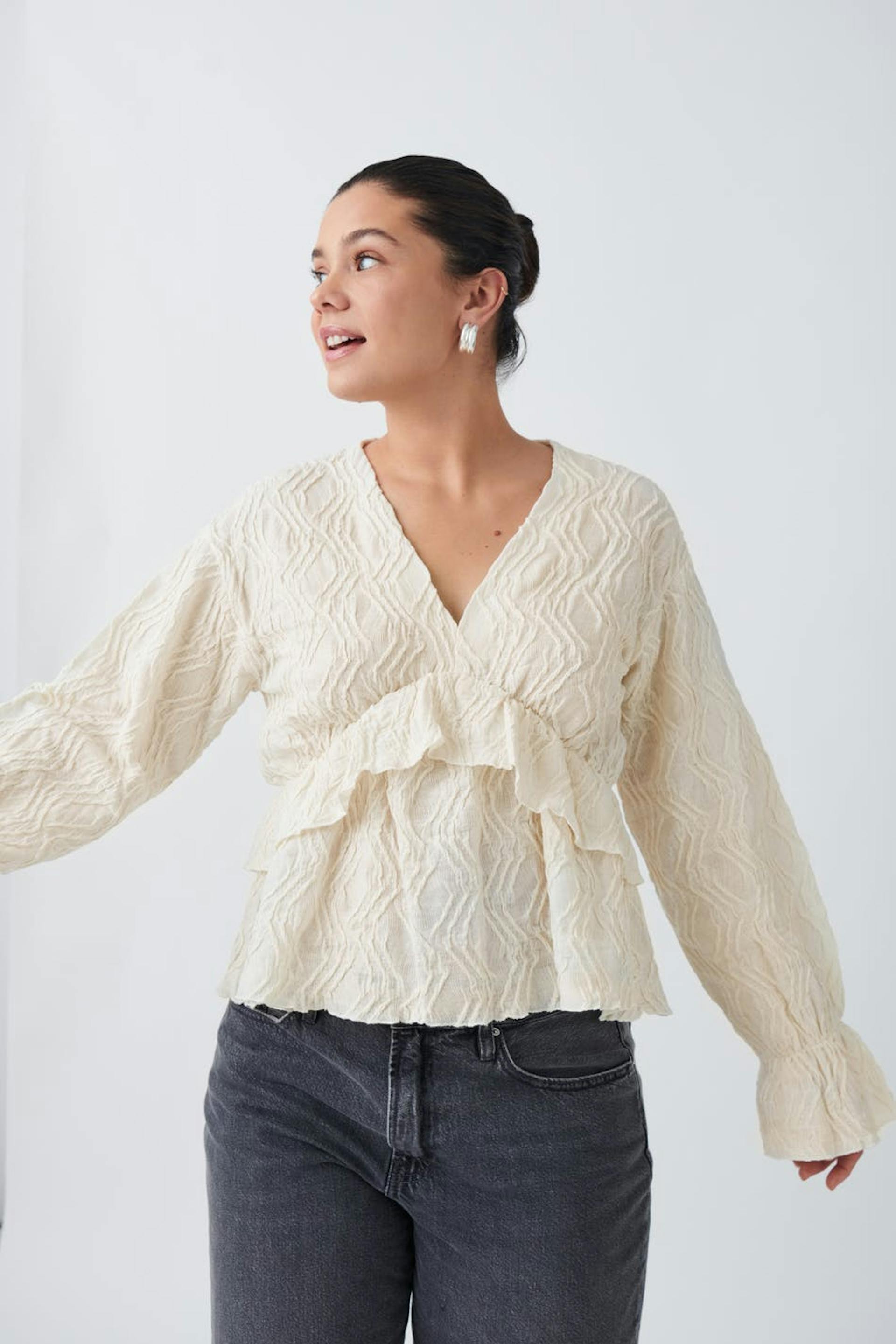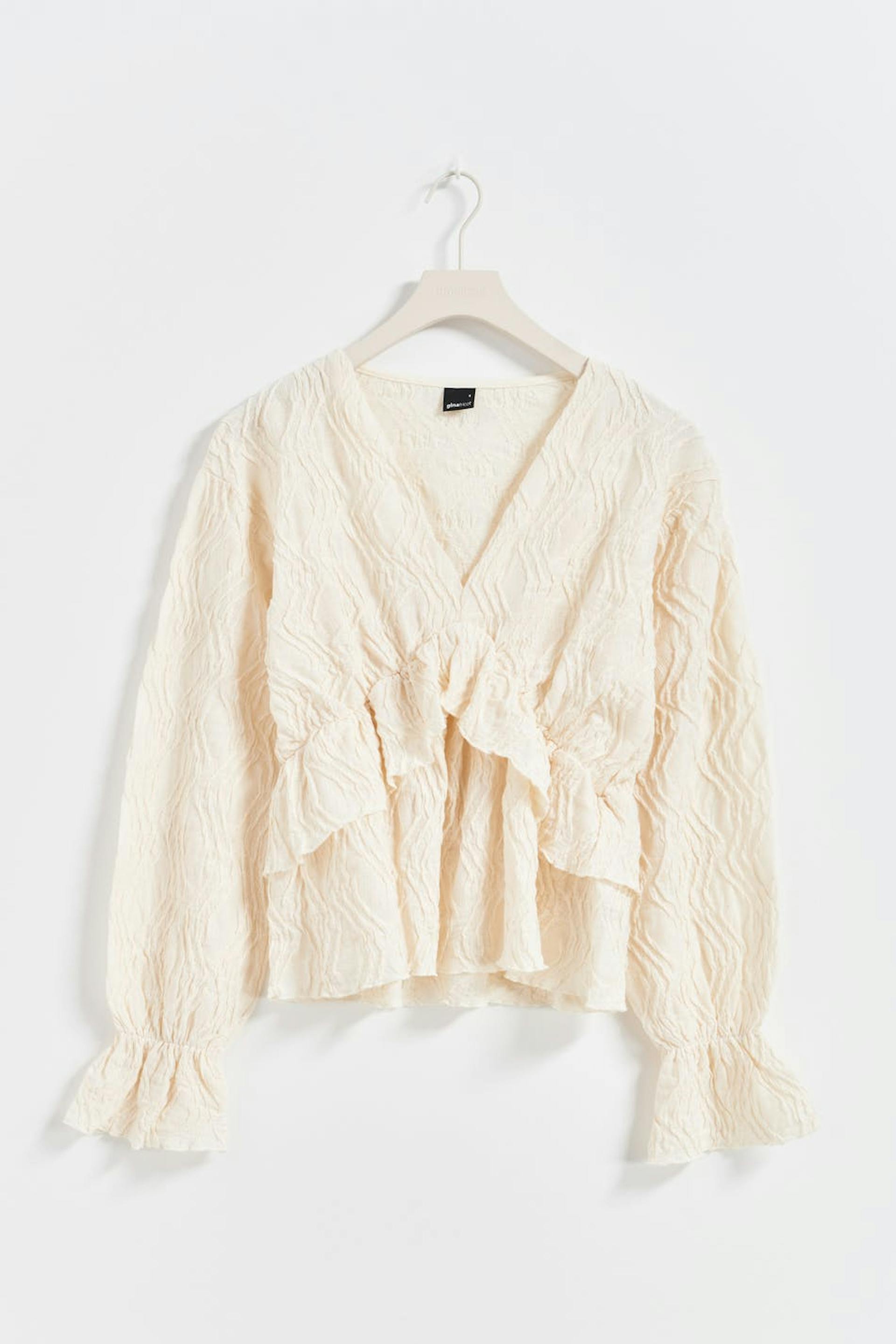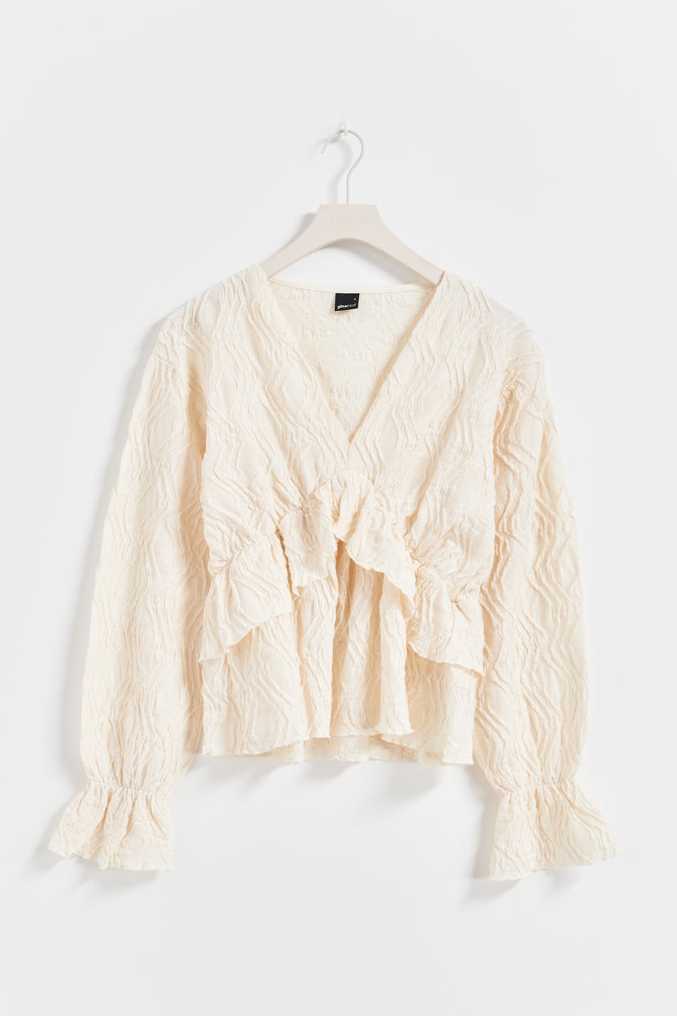 Bloes met lange mouwen met ruches. De bloes is wit en heeft v-hals. Het heeft normale pasvorm, gestructureerd materiaal en elastiek aan de uiteinden van de mouwen.