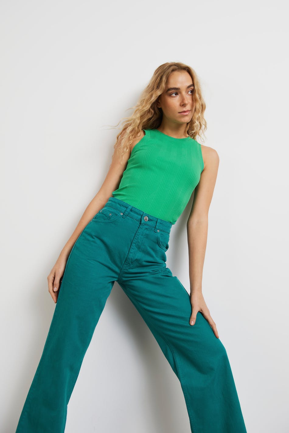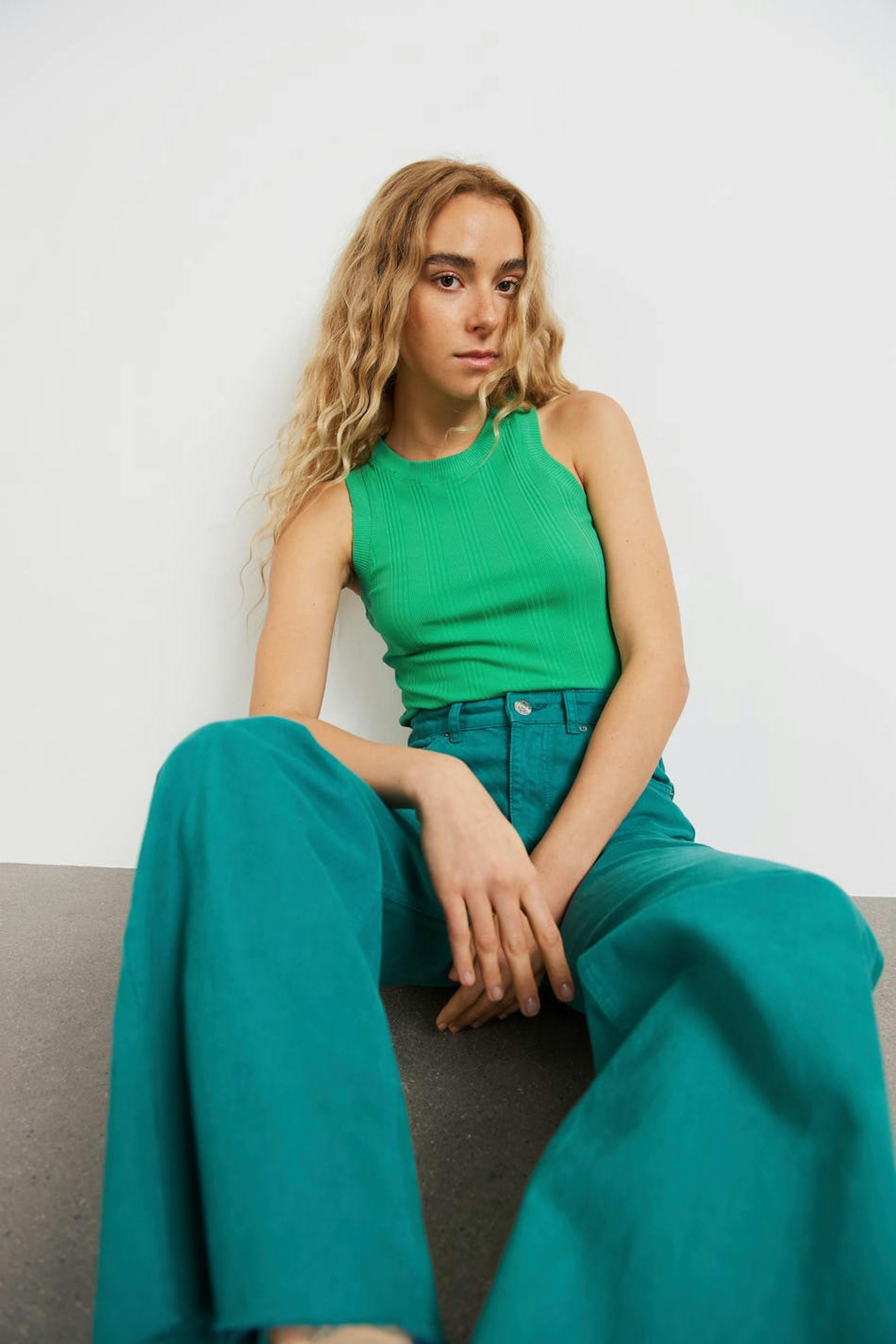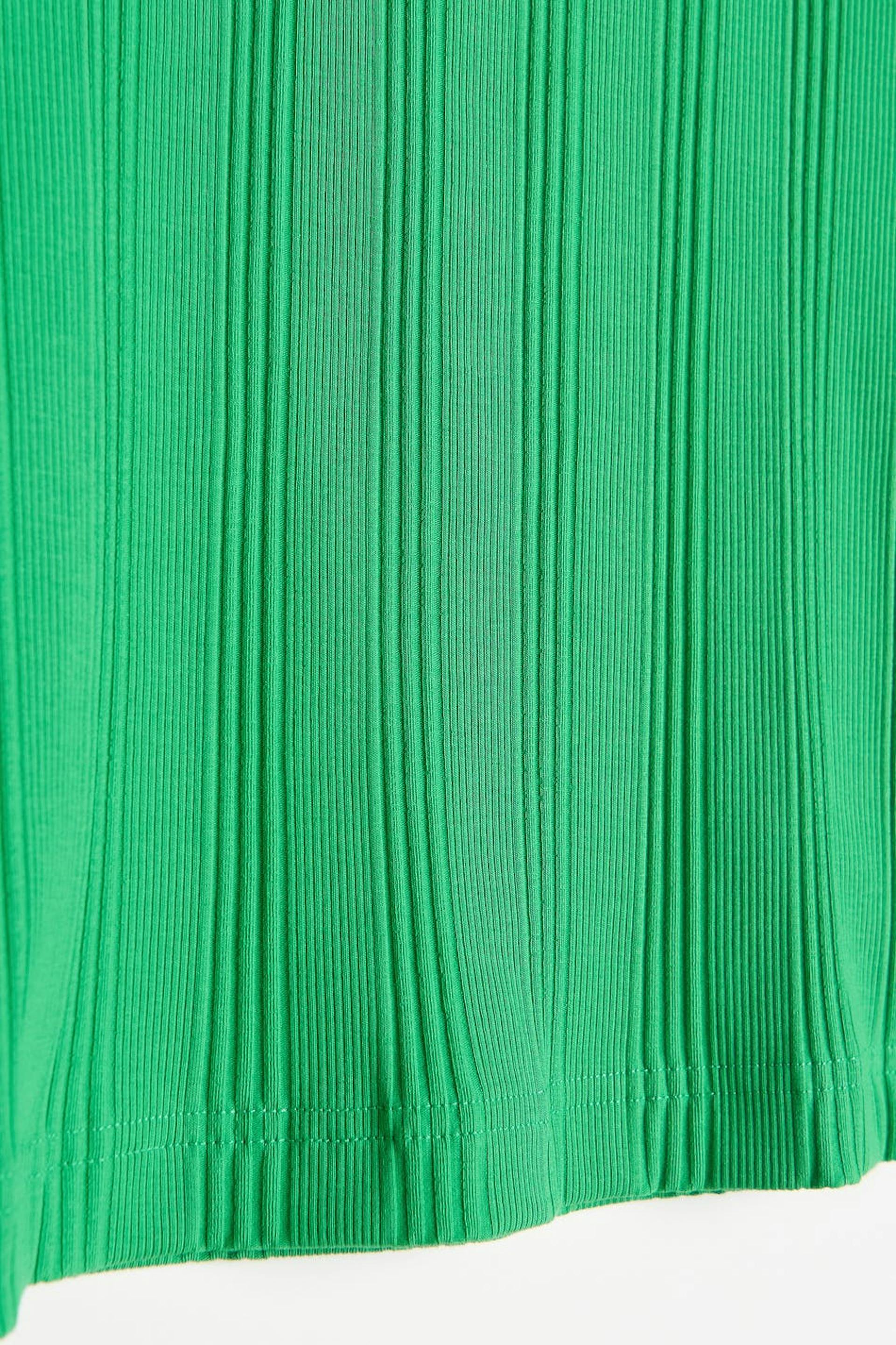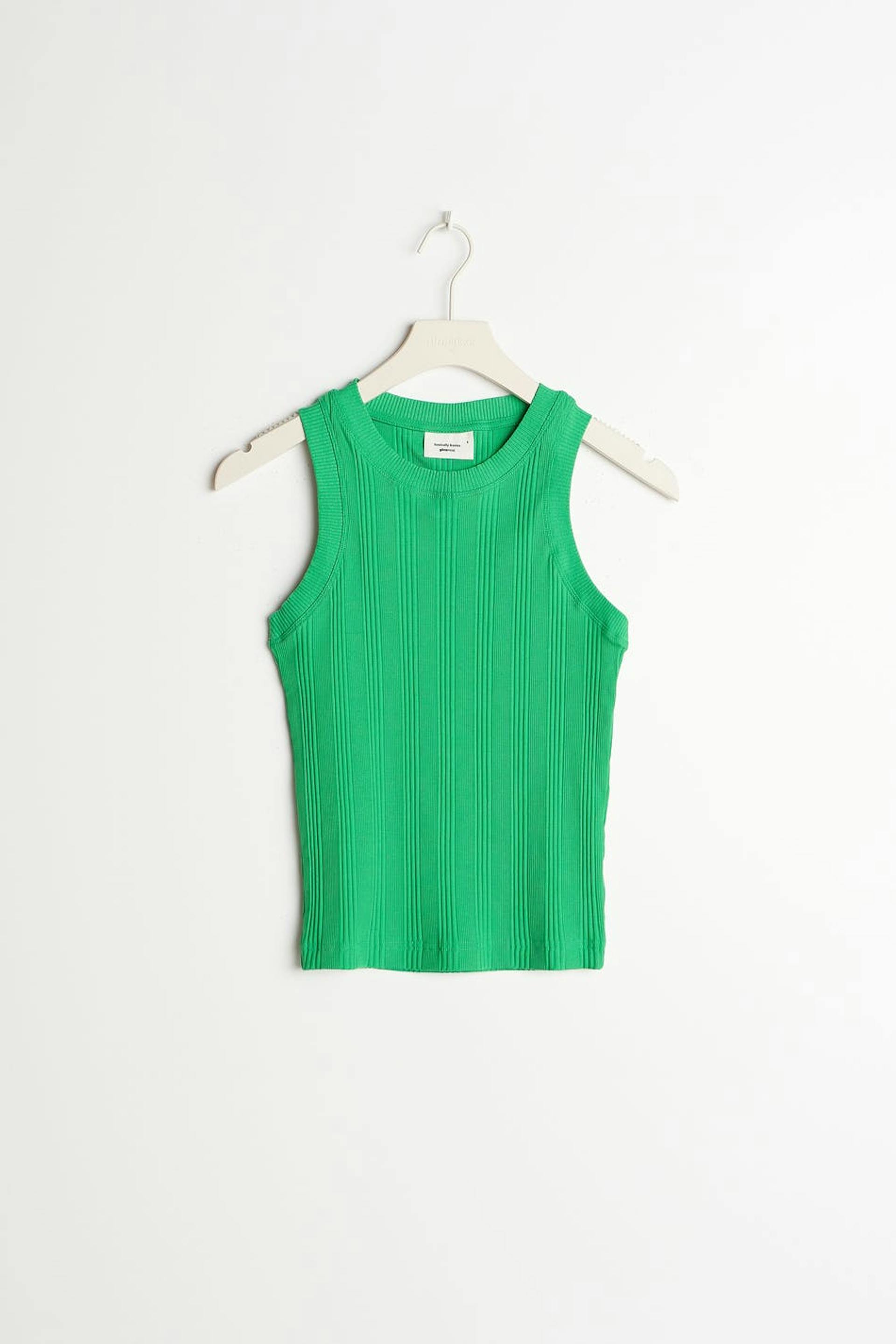 Geribbelde tank met een nauwsluitende pasvorm. De tank is groen en heeft een ronde halslijn. Het is gemaakt van tricot.