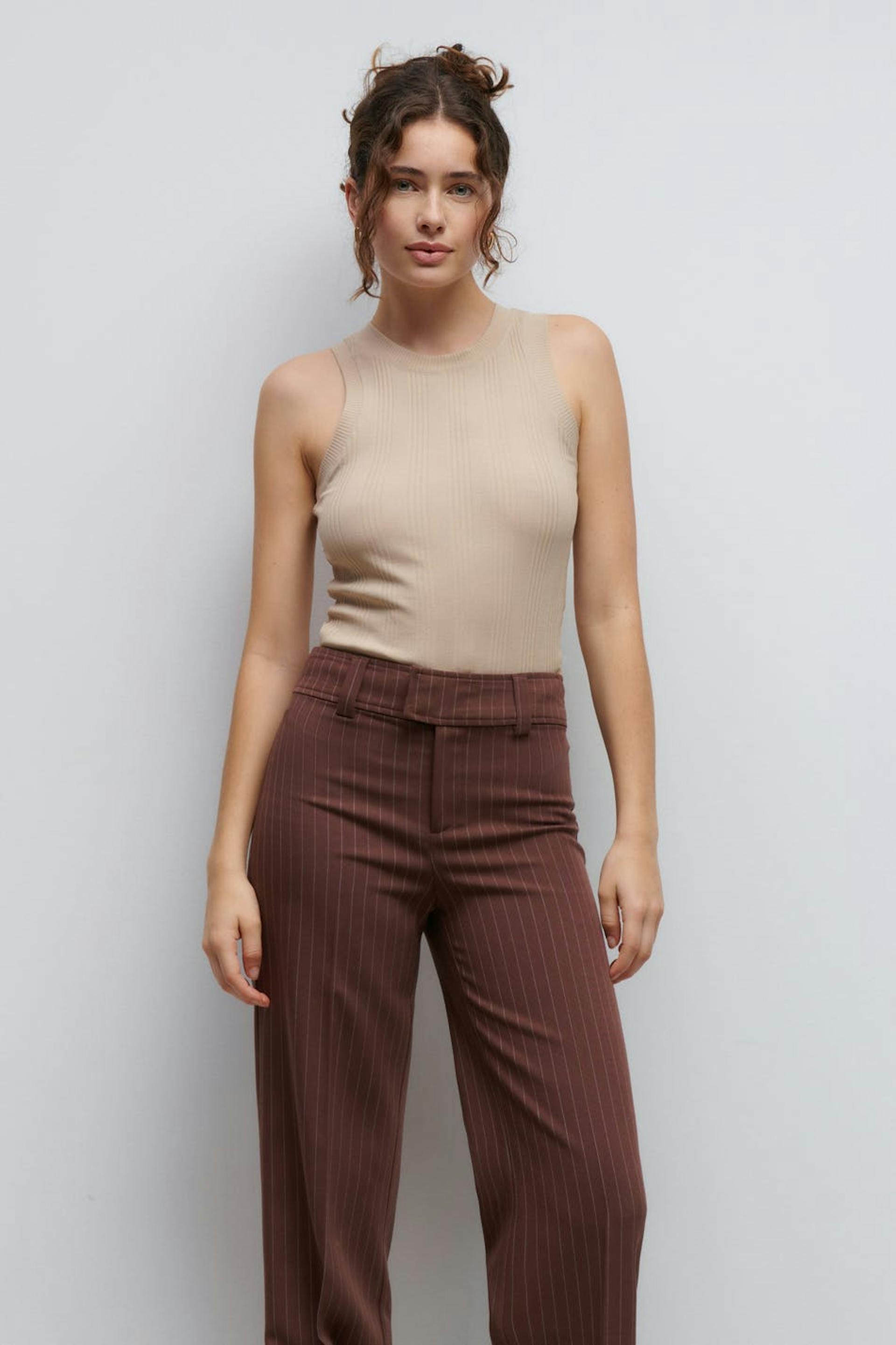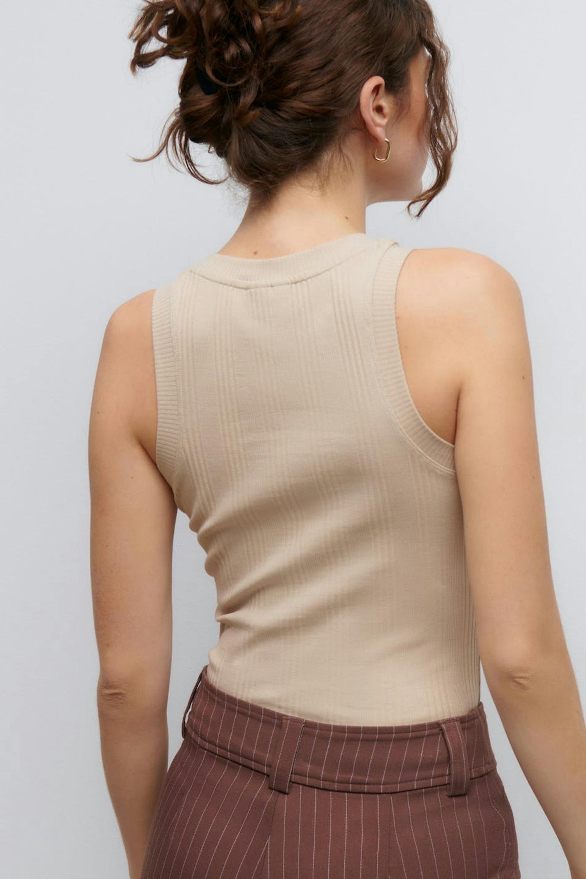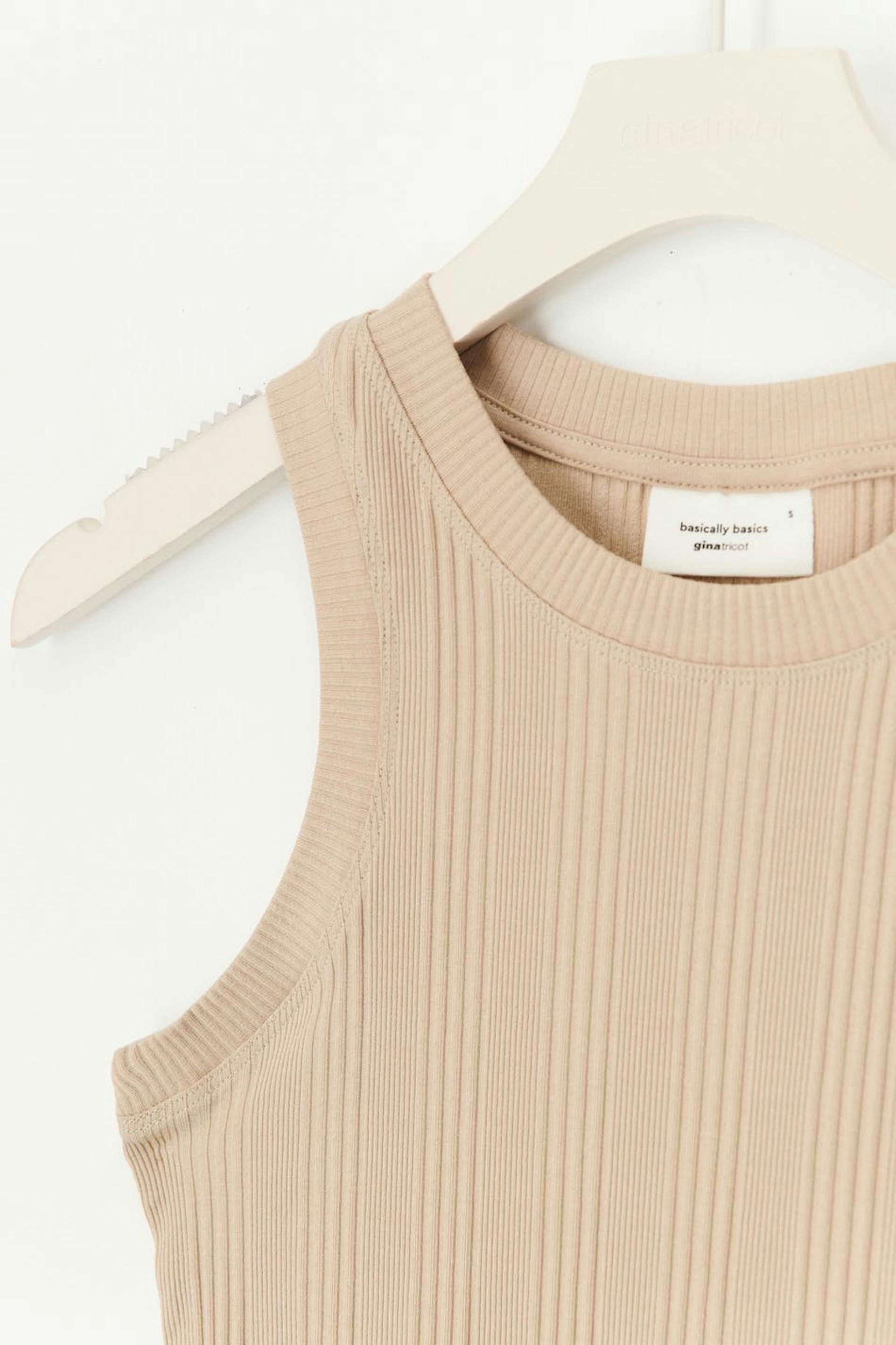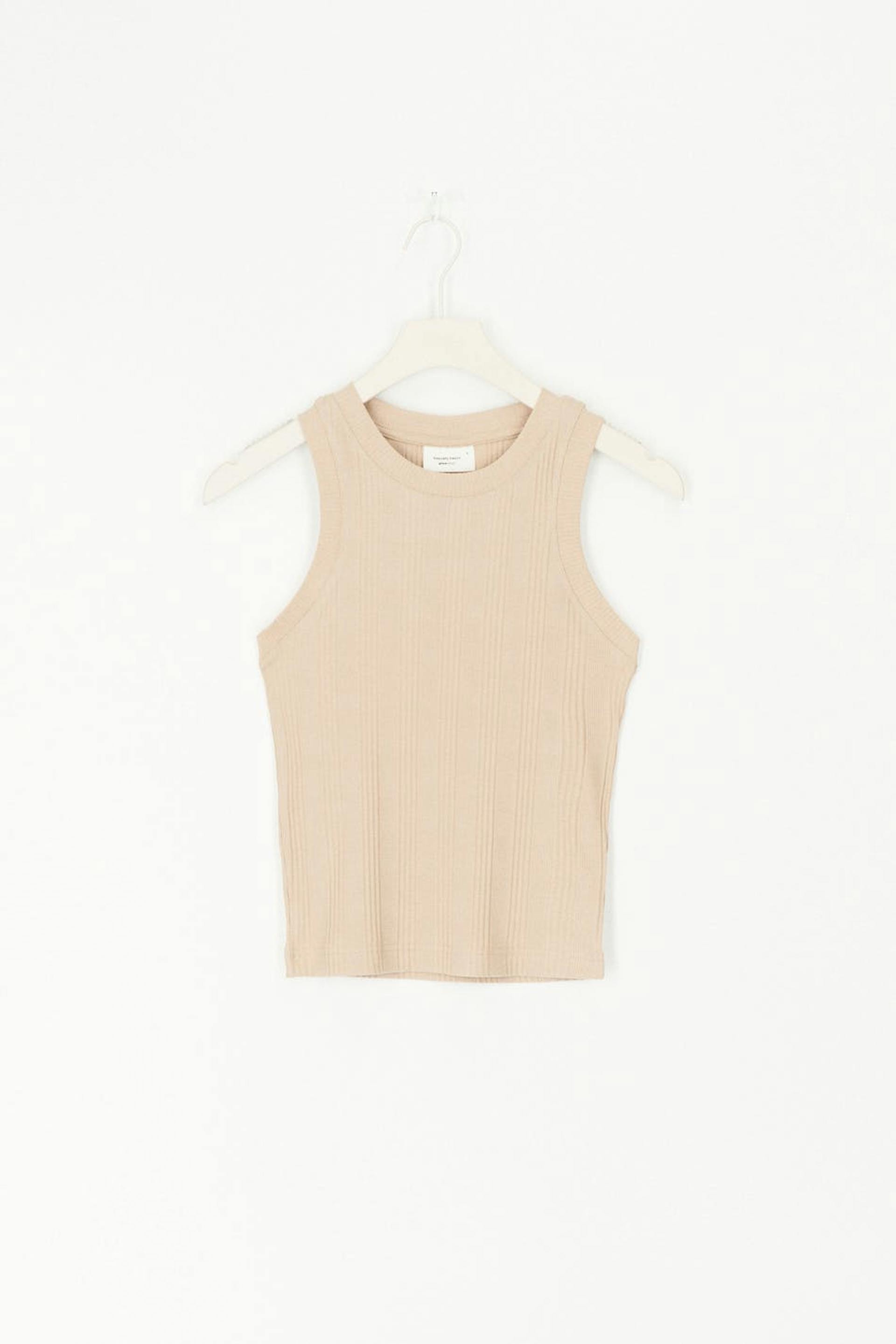 Geribbelde tank van tricot met nauwsluitende pasvorm. De tank is beige en heeft een ronde halslijn.