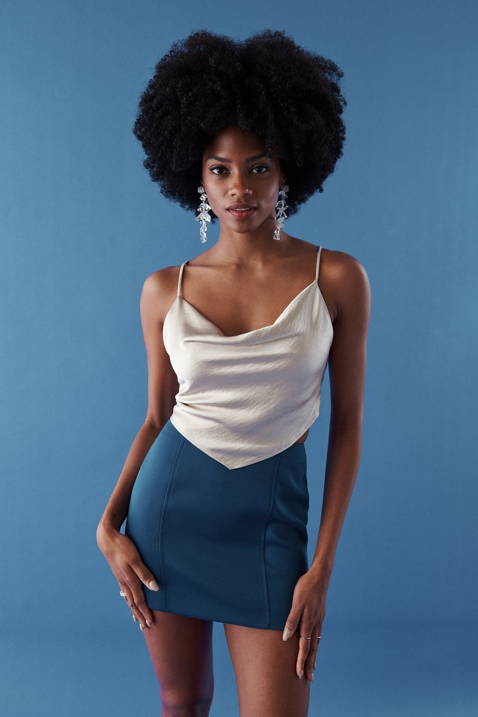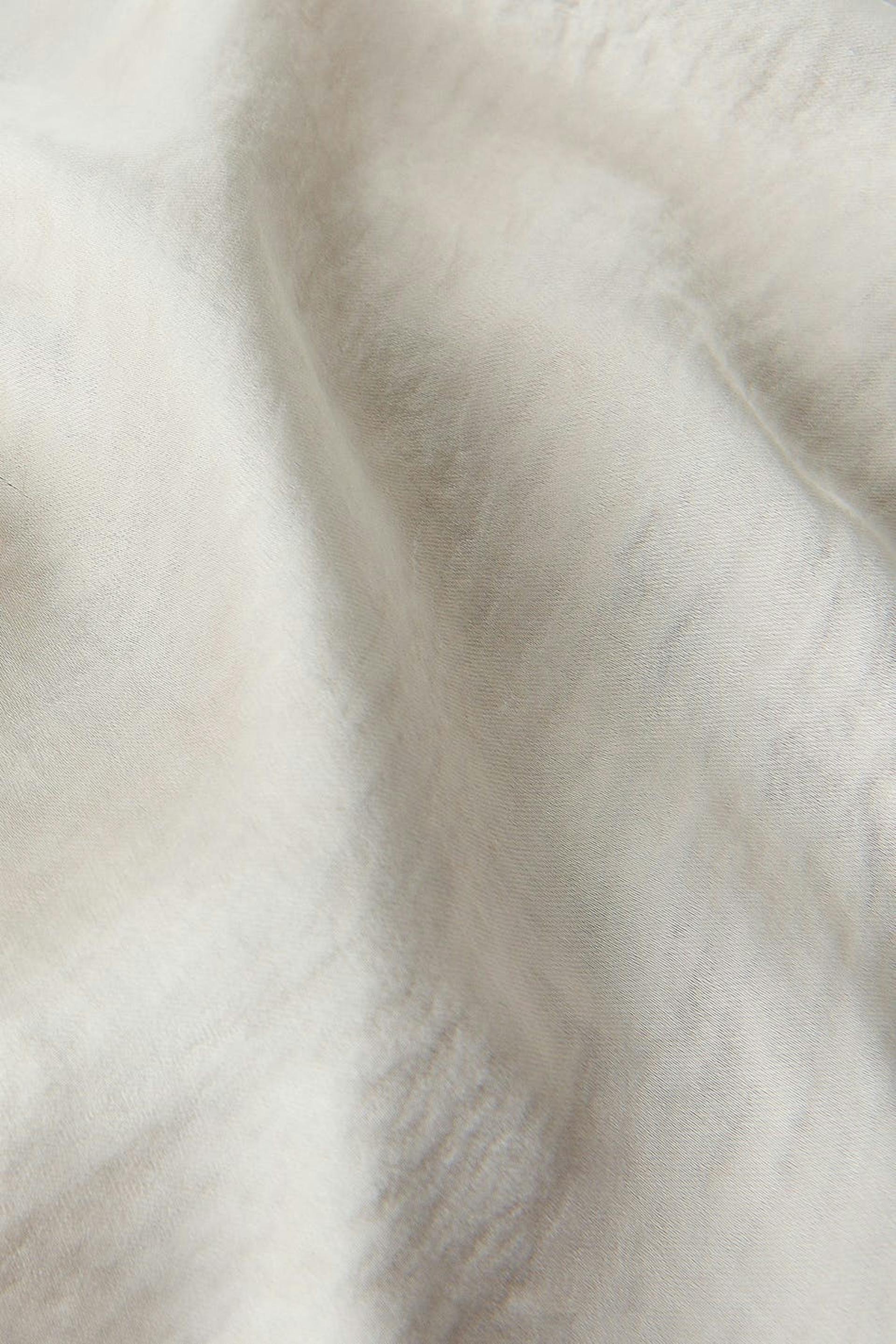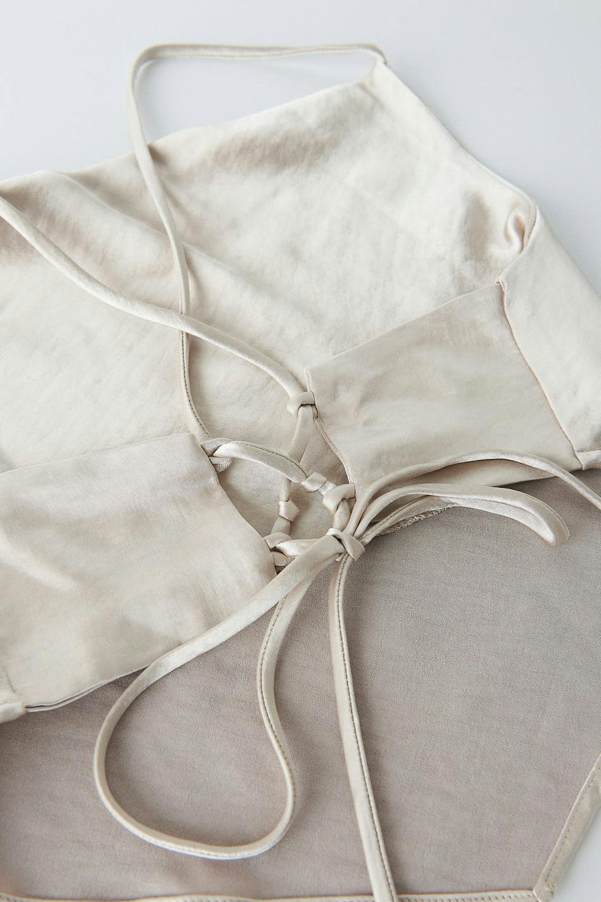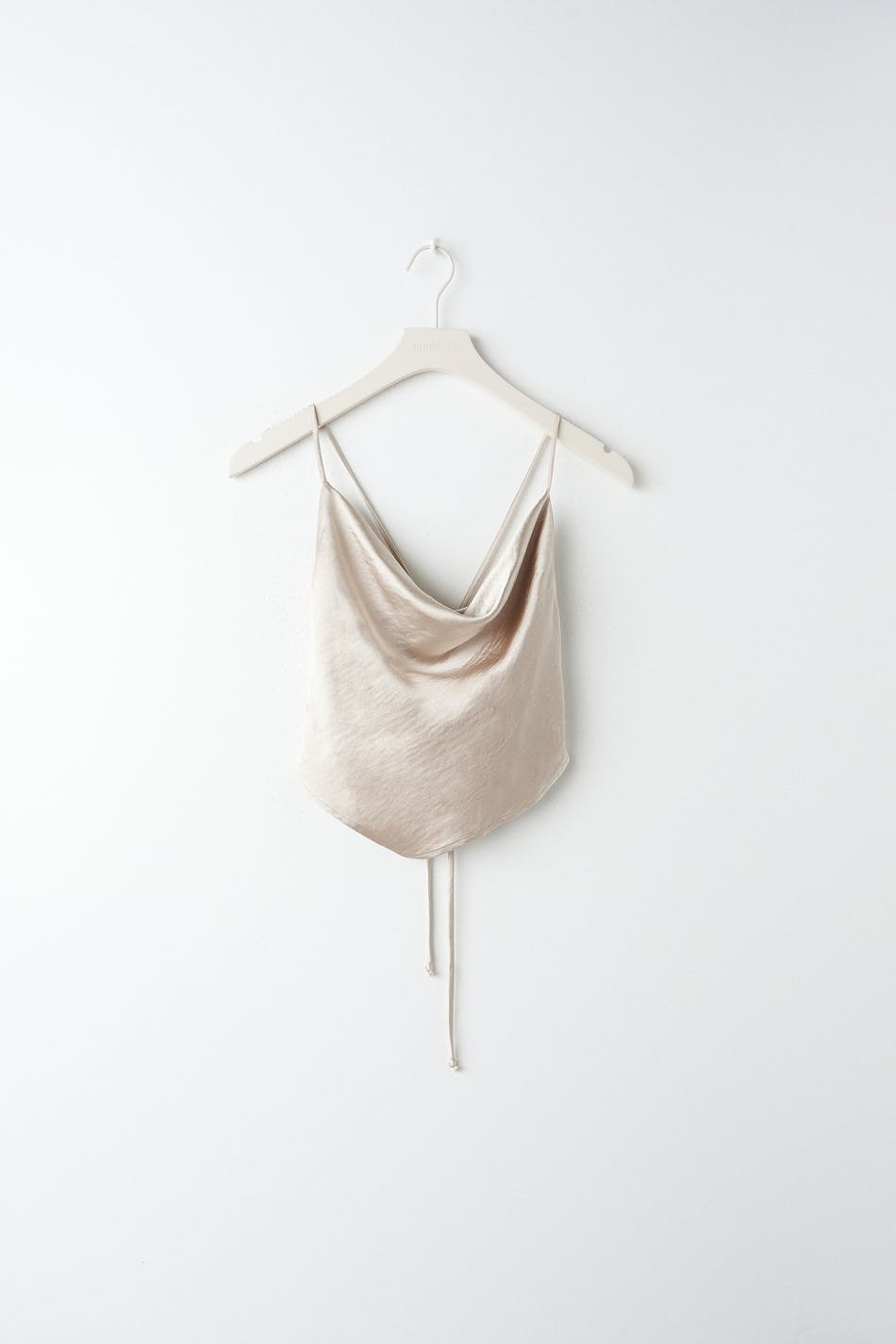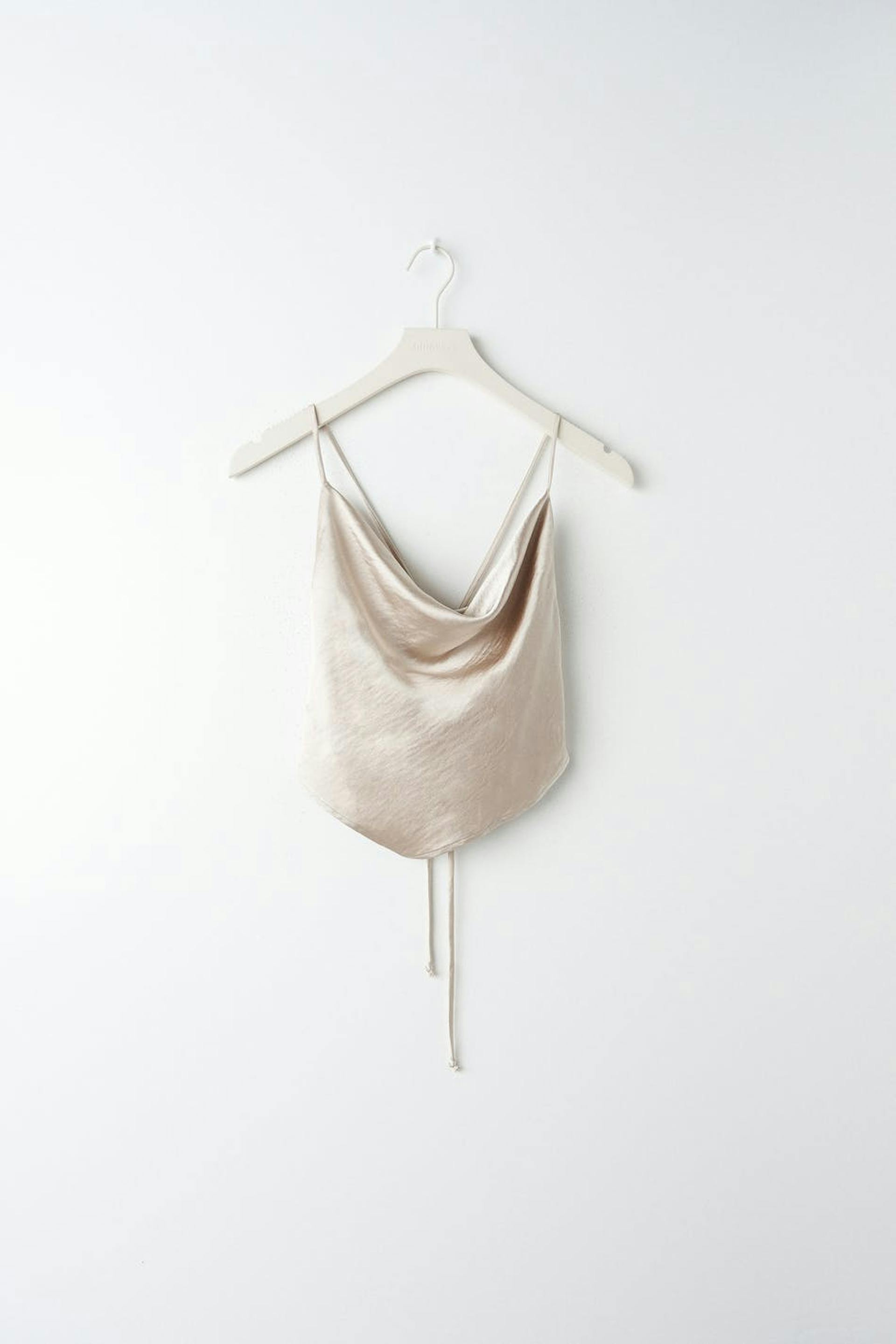 Afgesneden tank van gerecycleerd polyester met watervalhals. De tank is perfect voor het feest en beige en heeft een glimmend materiaal. Het heeft dunne schouderriemen en een model met strikken op de rug.