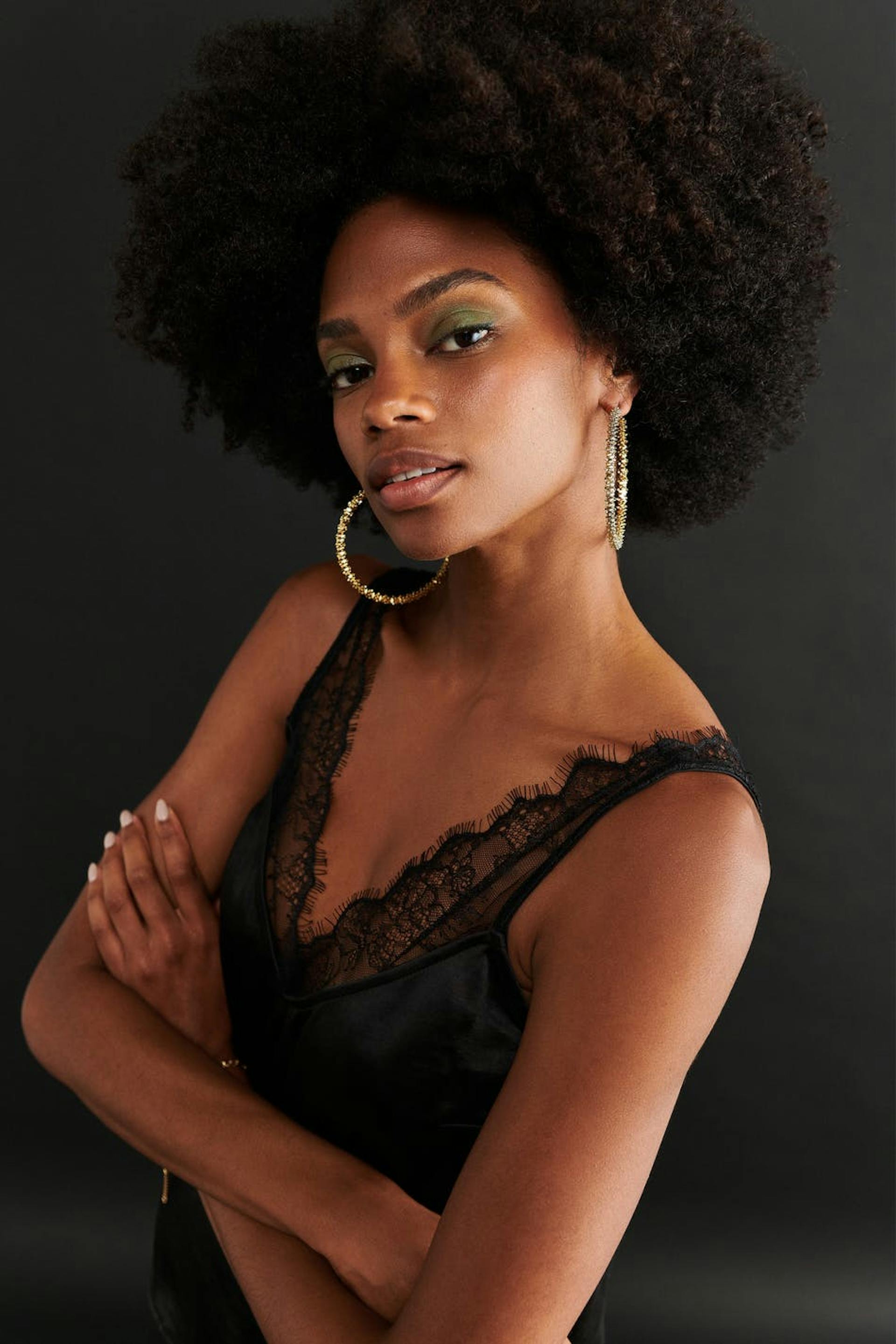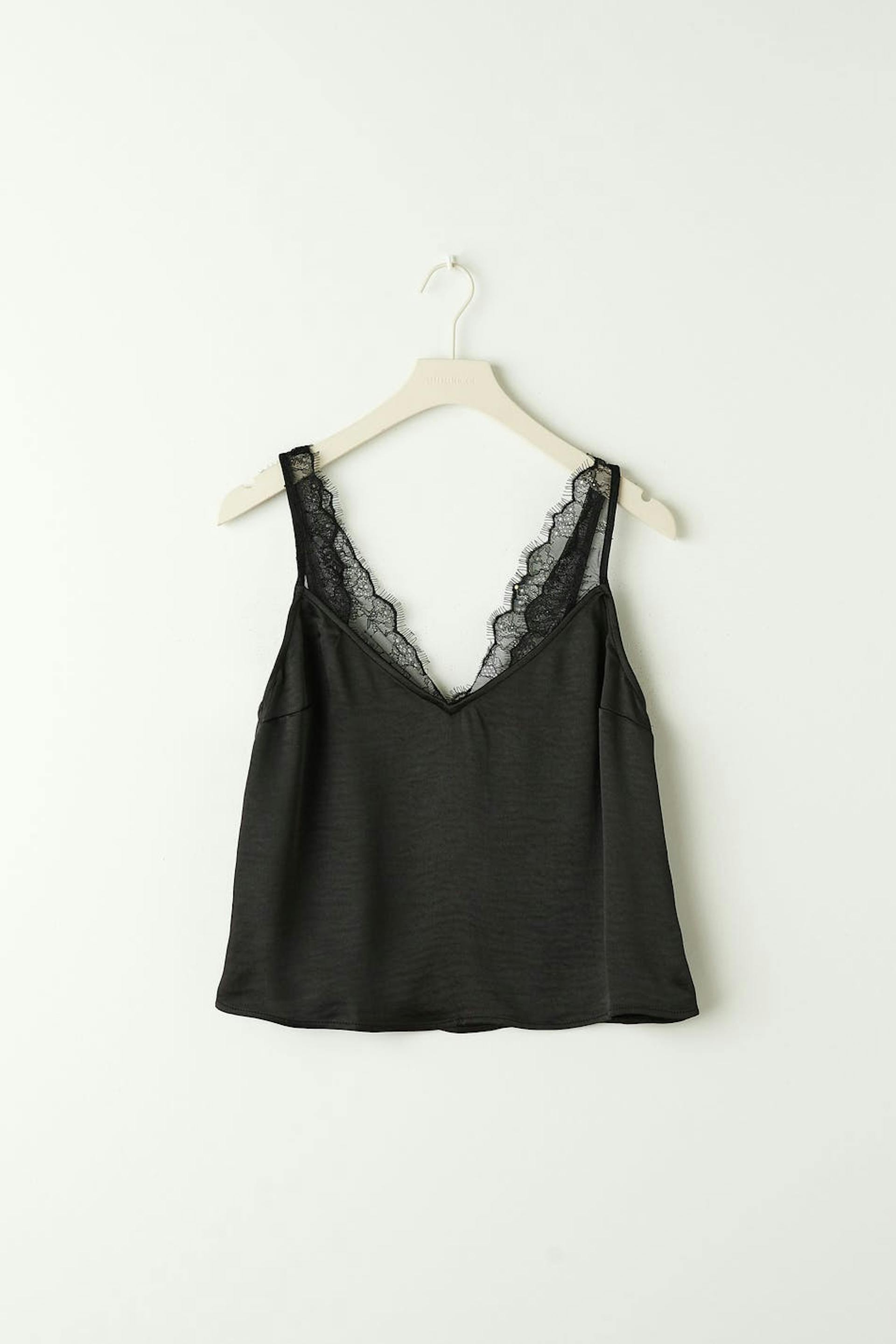 Tank van satijn met v-halslijn. De tank is zwart en heeft schouderriemen van kant.