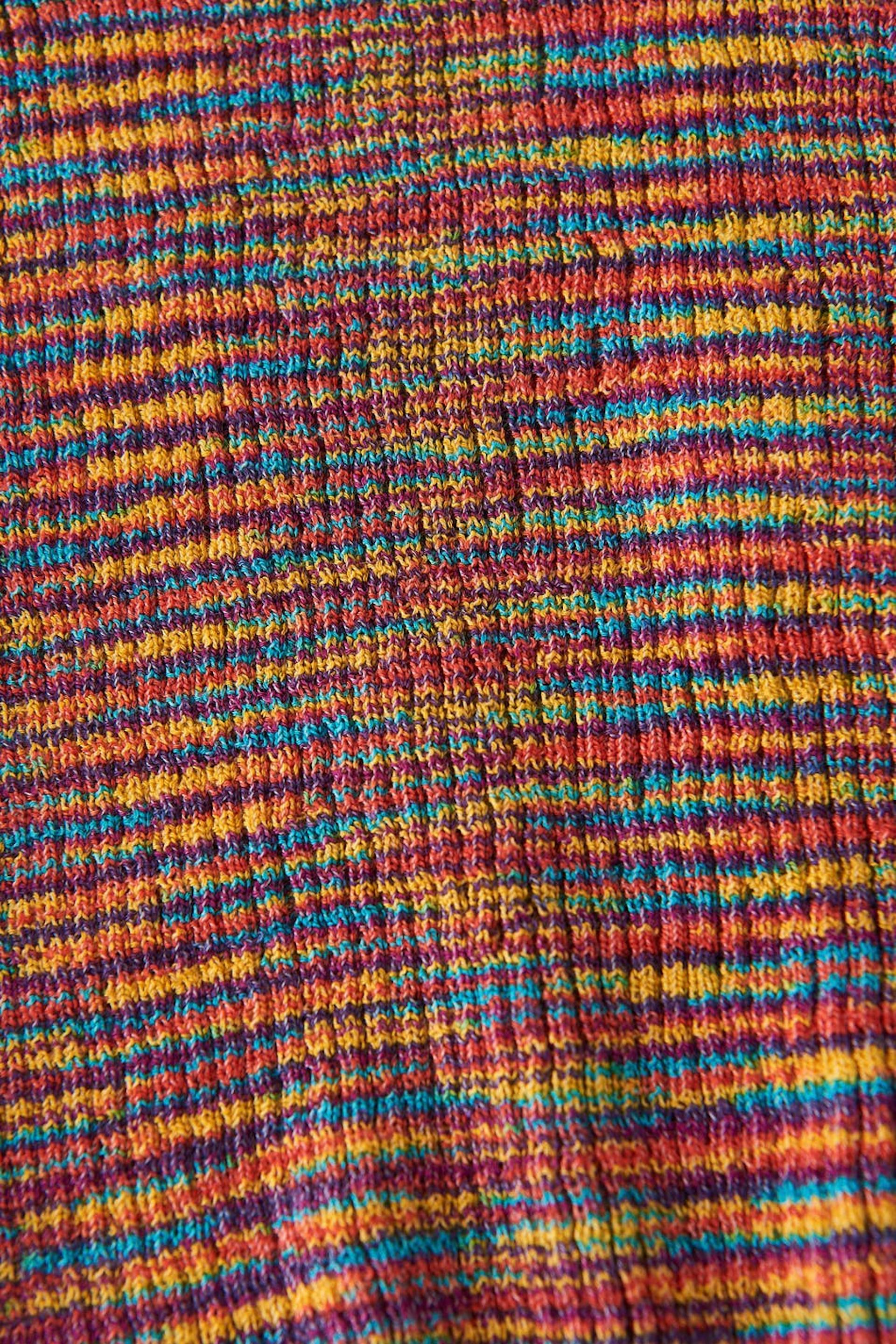 Gebreid haltertopje met open rug. Het topje is rood, afgesneden en geribbeld. Het heeft een u-hals en halternek banden met knooppas aan de hals.