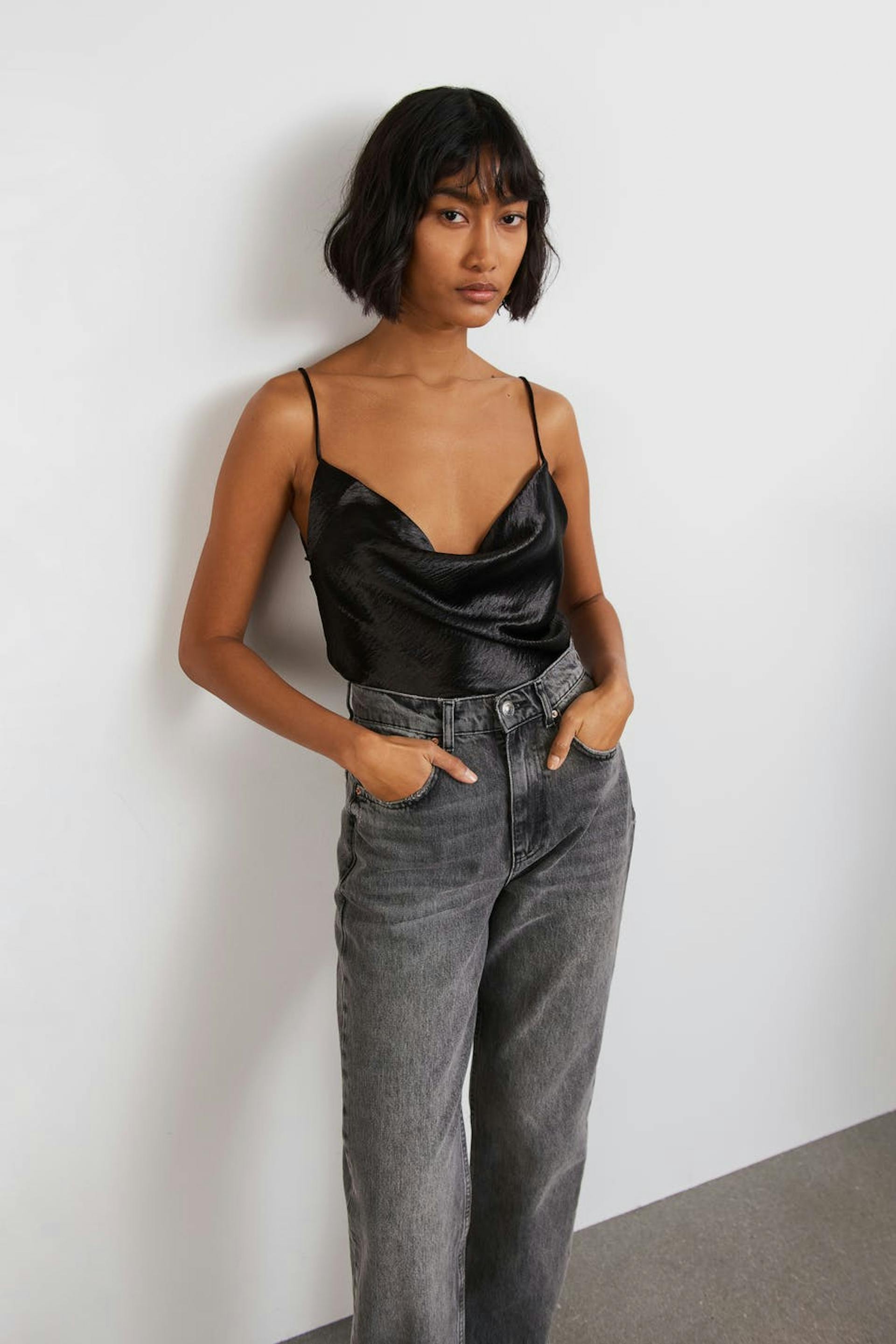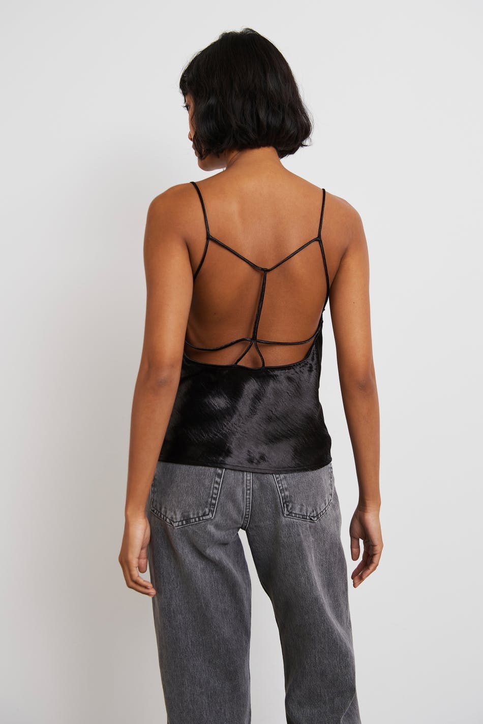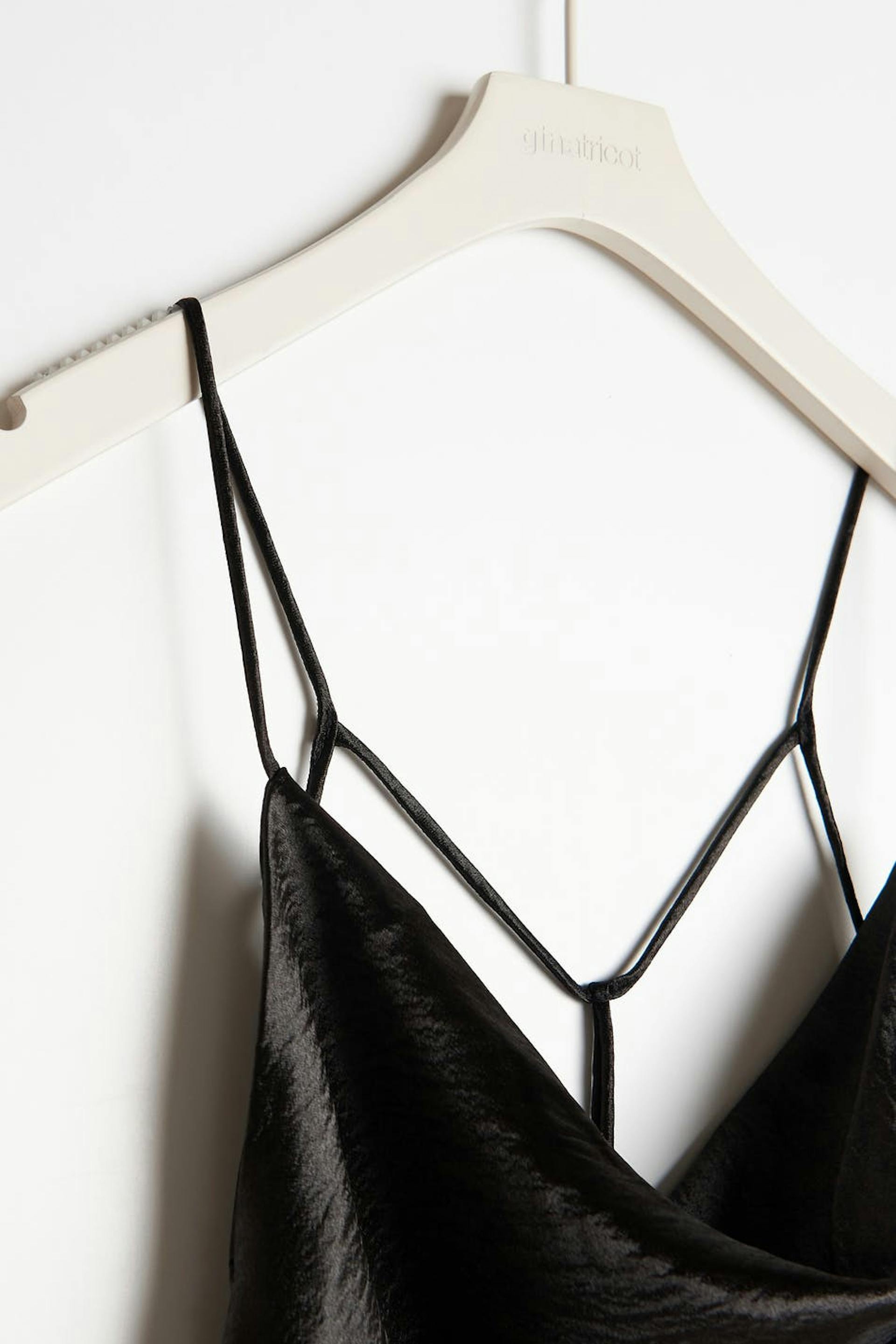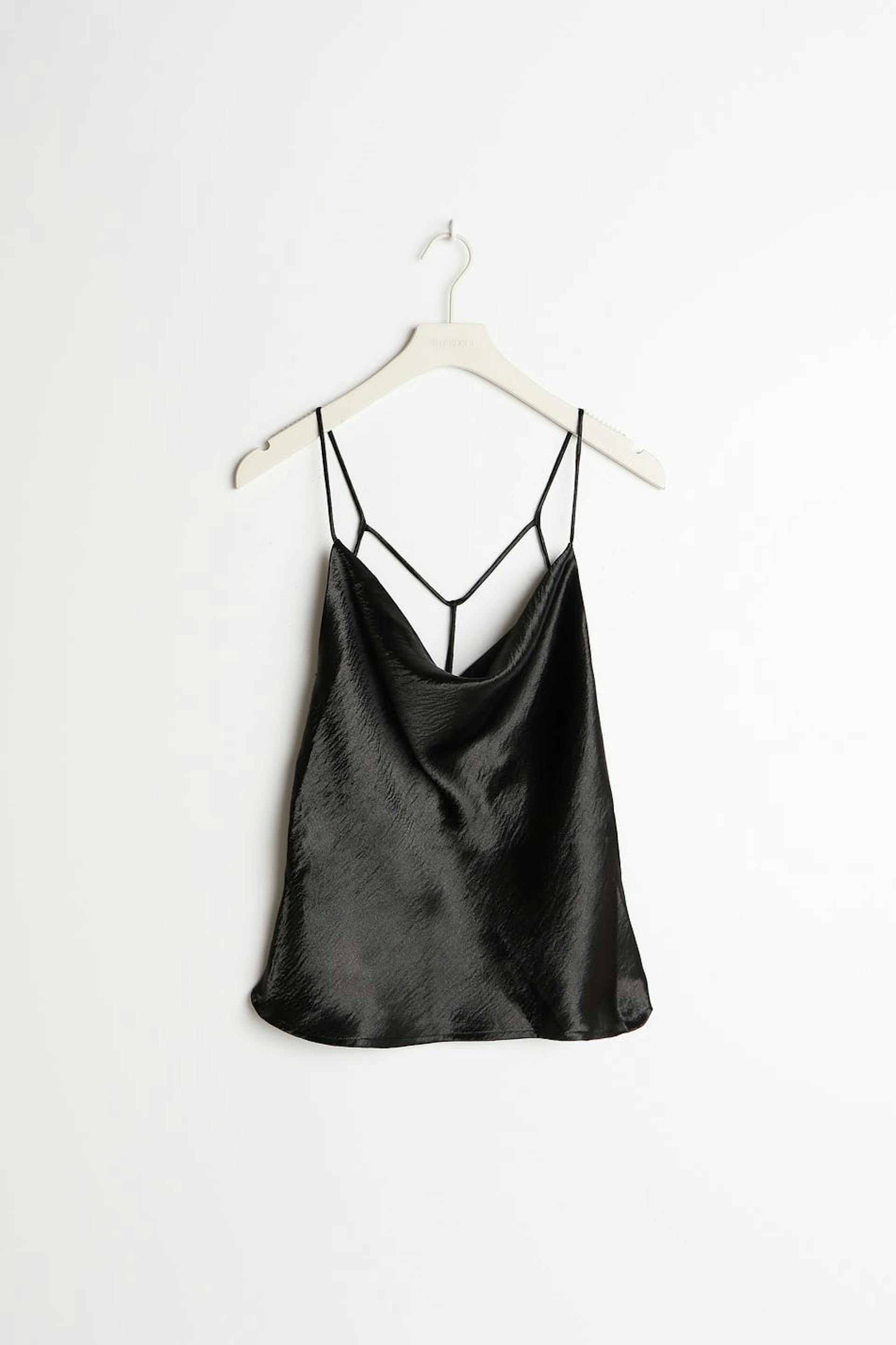 Topje met een open rug. Het topje is perfect voor het feest en zwart en heeft dunne en doorkruiste schouderriemen op de rug. Het heeft een losse pasvorm aan de voorkant.