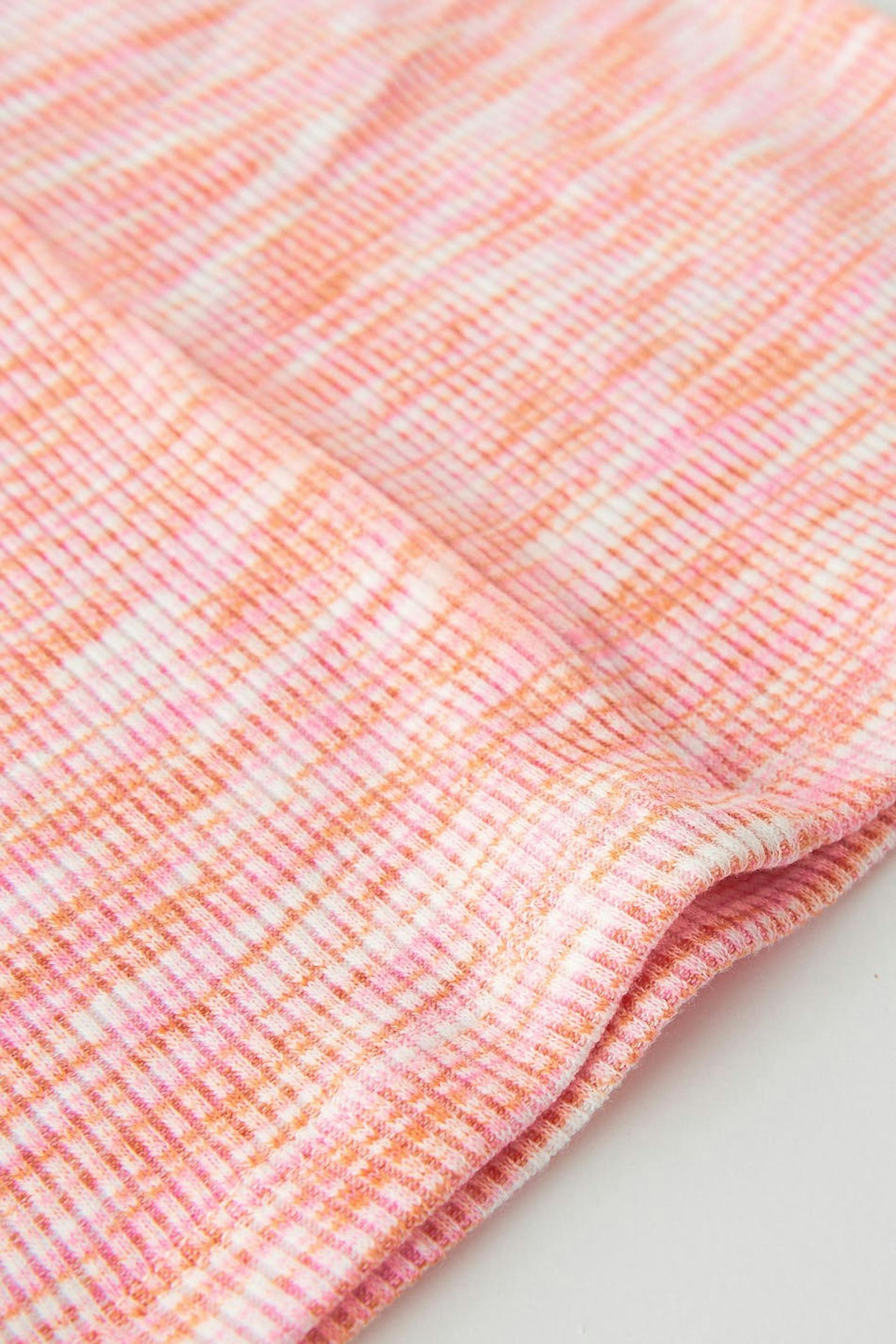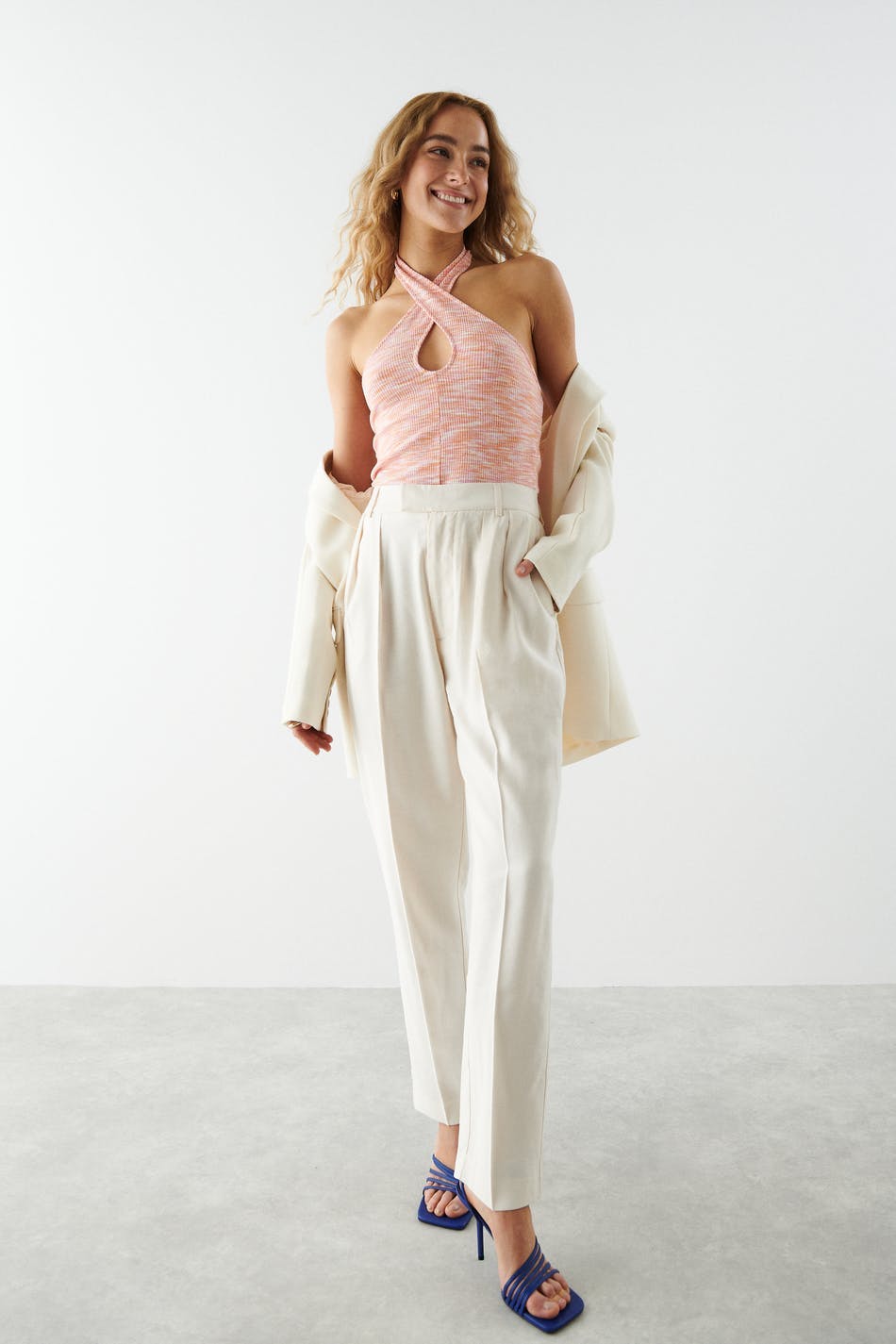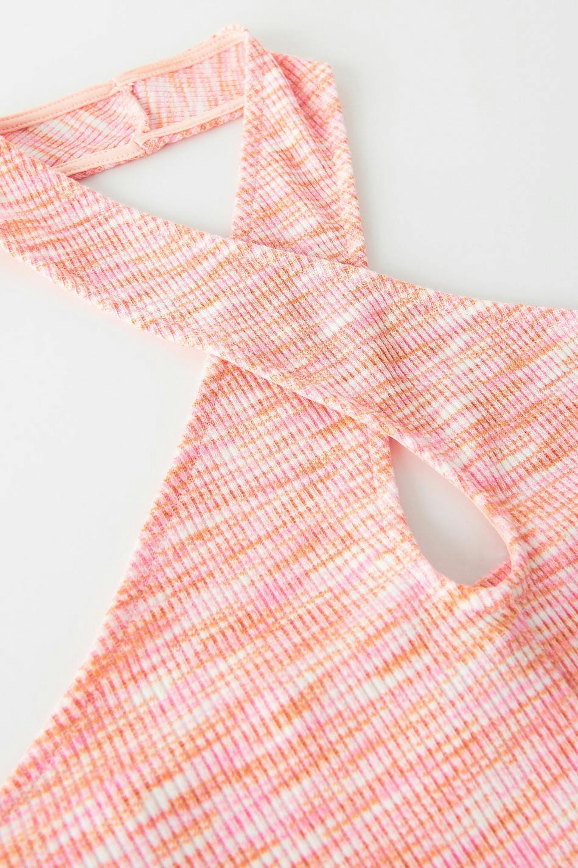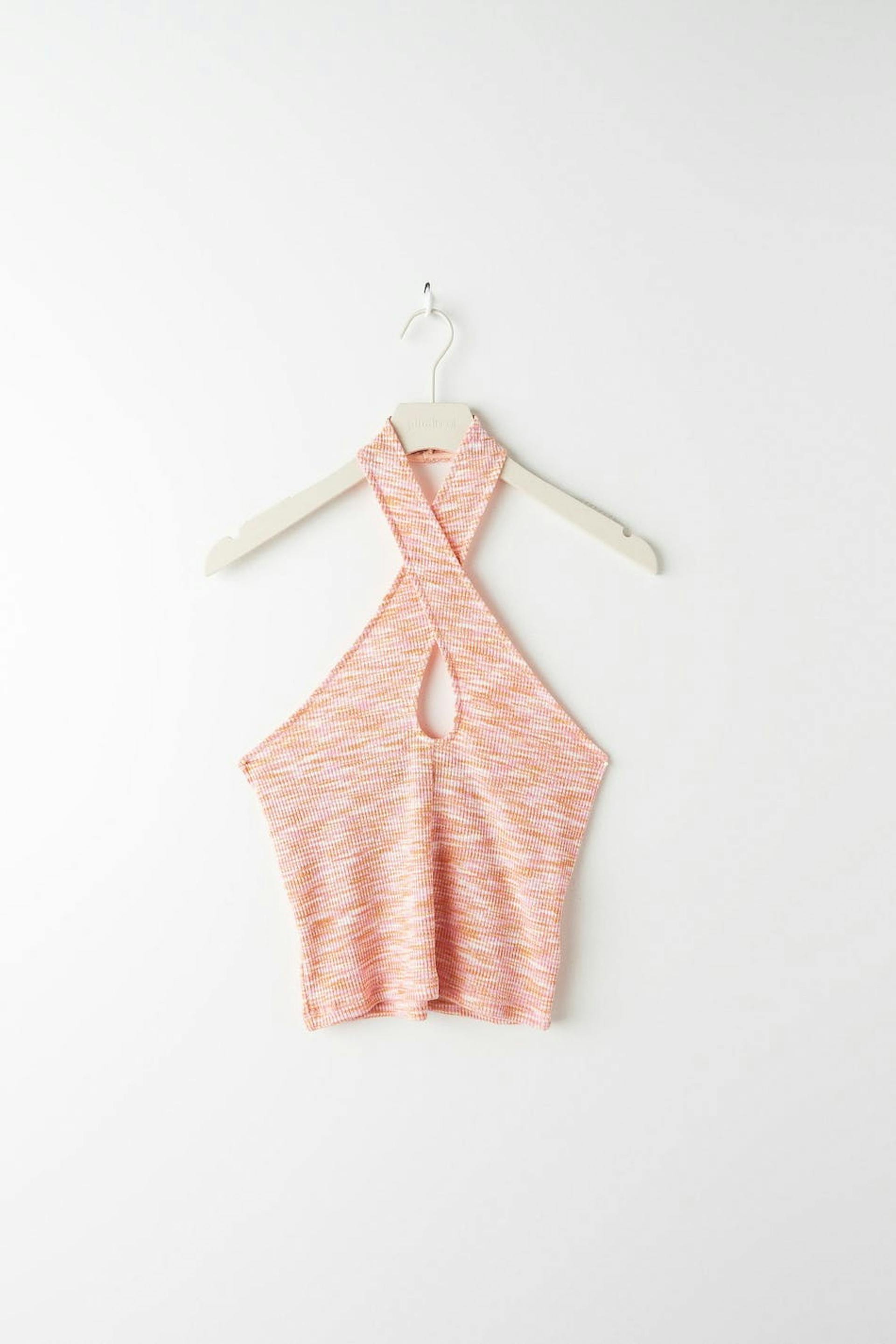Geribbeld haltertopje met open rug. Het topje is oranje en heeft een afgesneden lengte. Het heeft een nauwsluitende pasvorm en doorkruiste halternek banden aan de voorkant met sleutelgatopening.