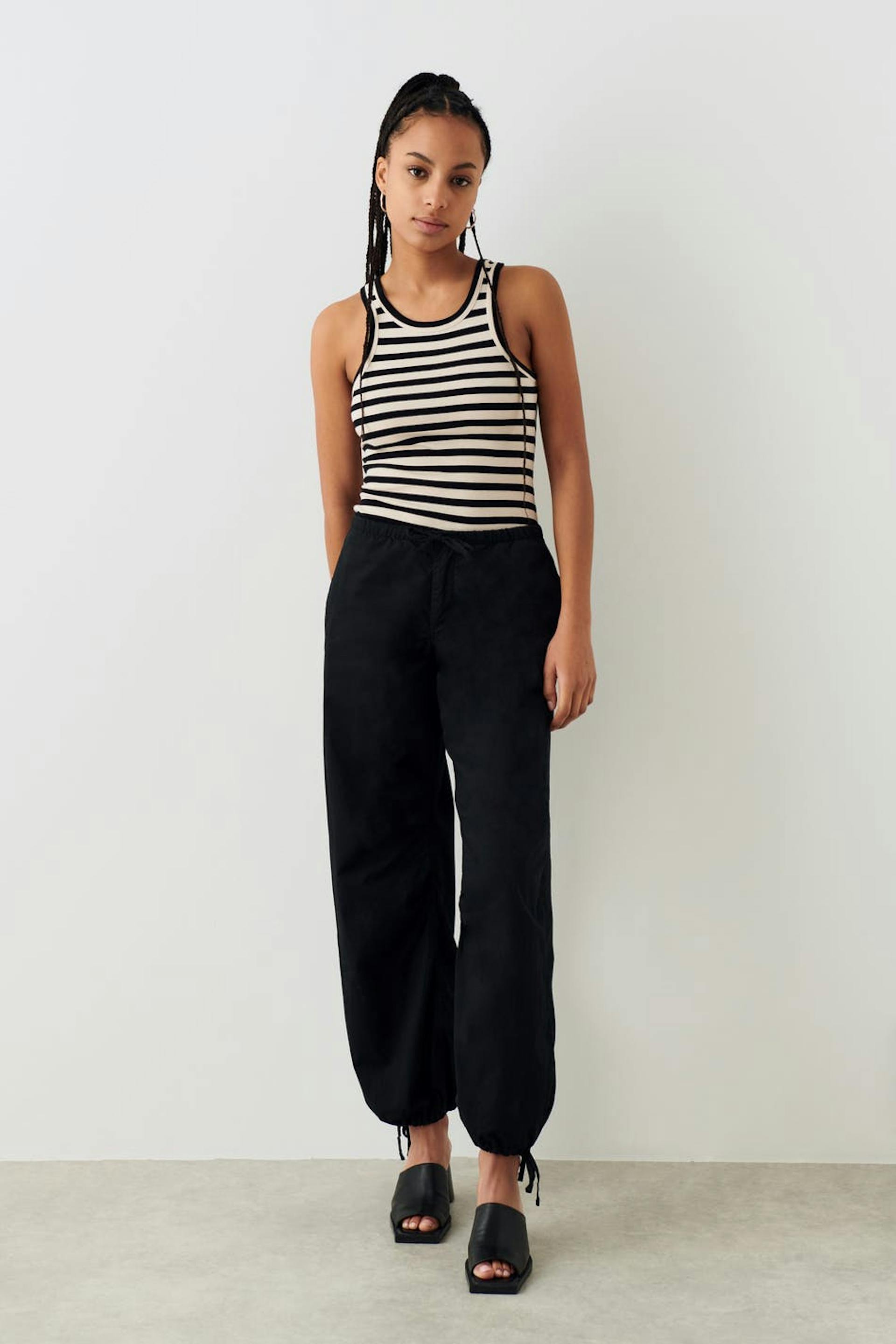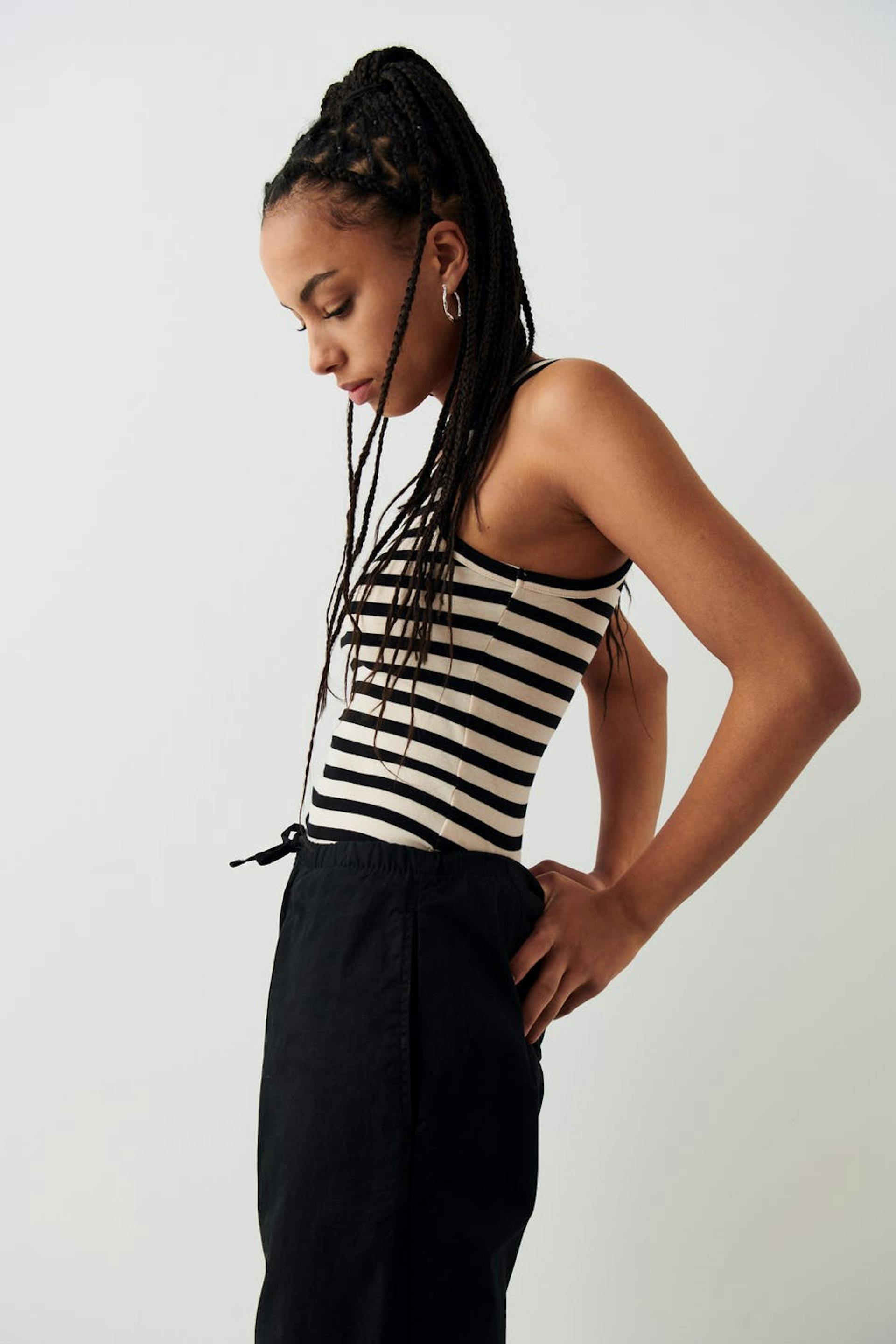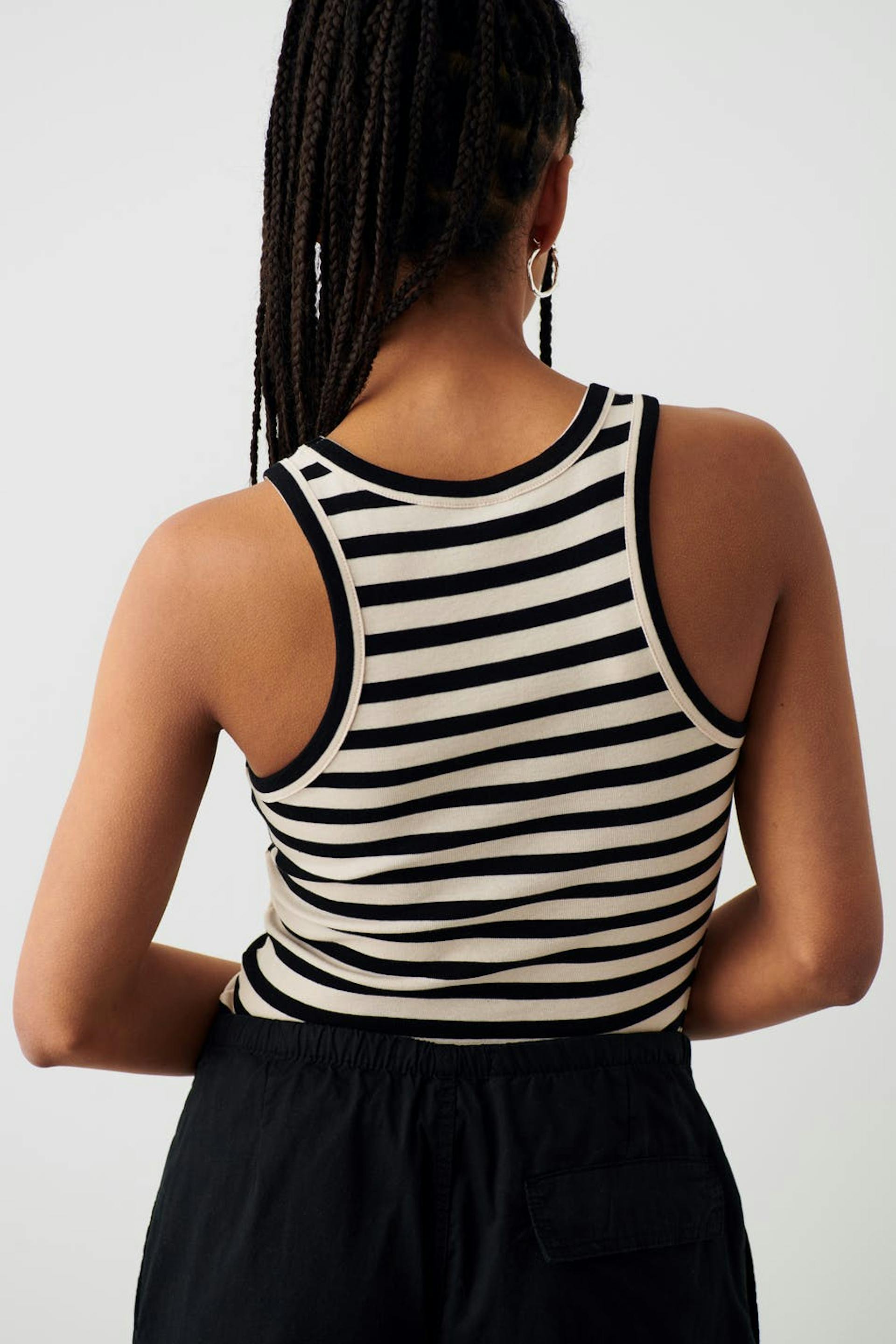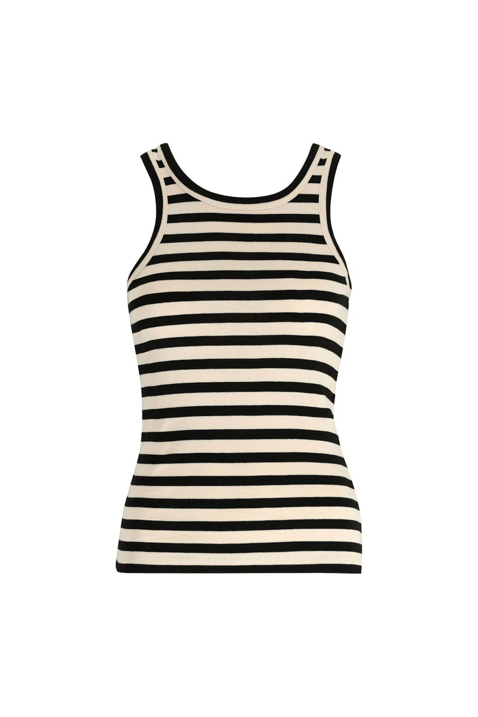 Gestreepte tank van tricot met nauwsluitende pasvorm. De tank is zwart en geribbeld en heeft normale lengte.