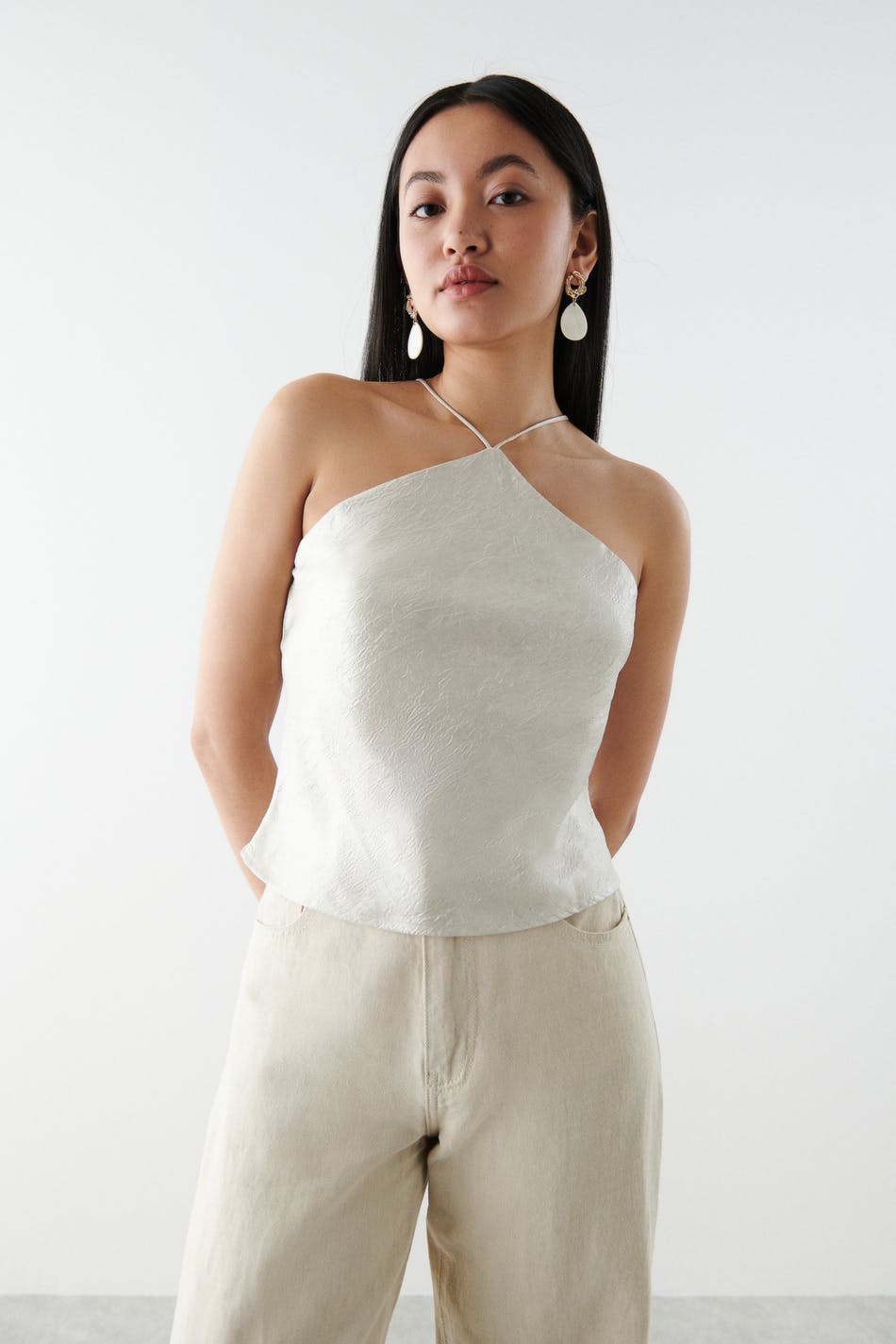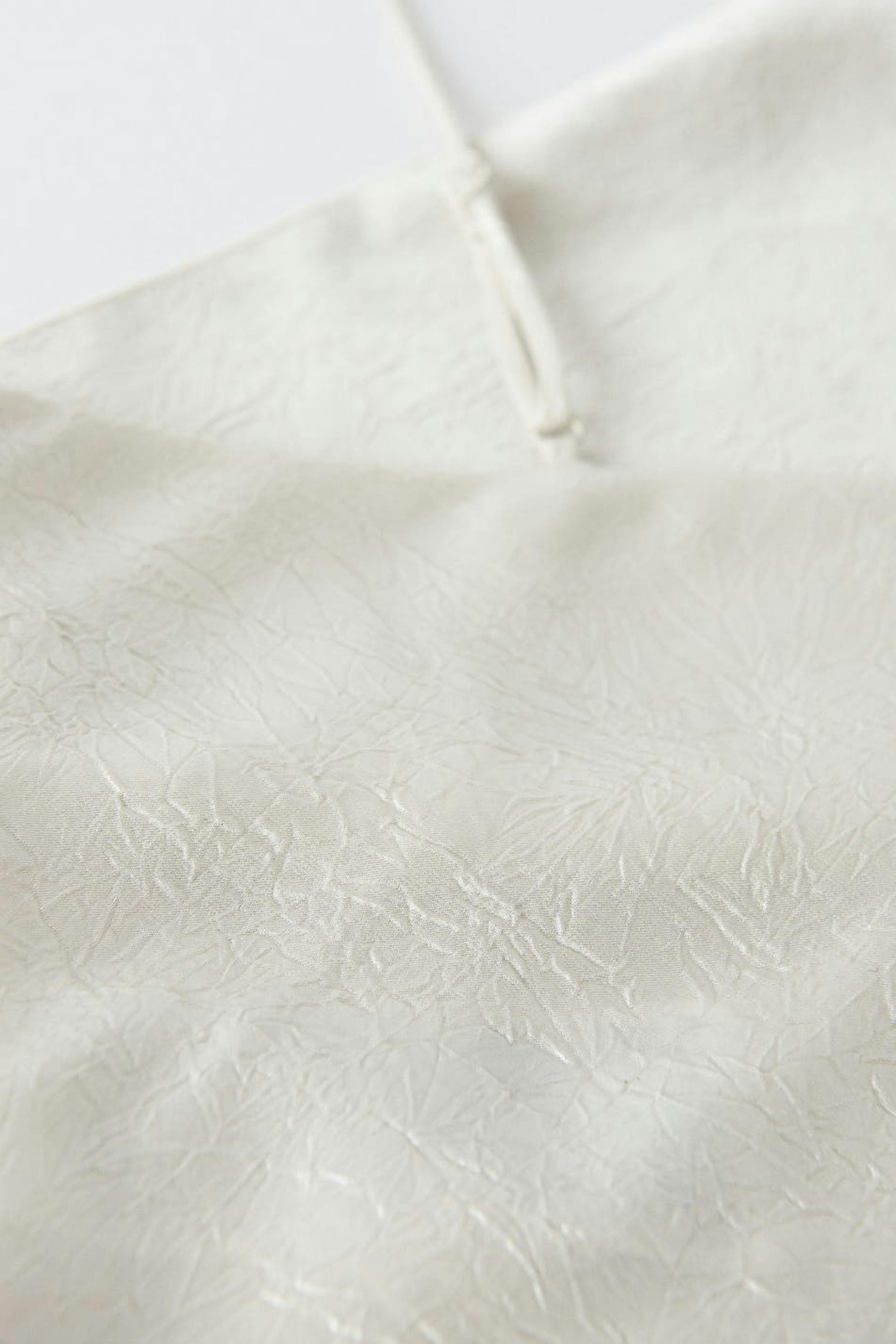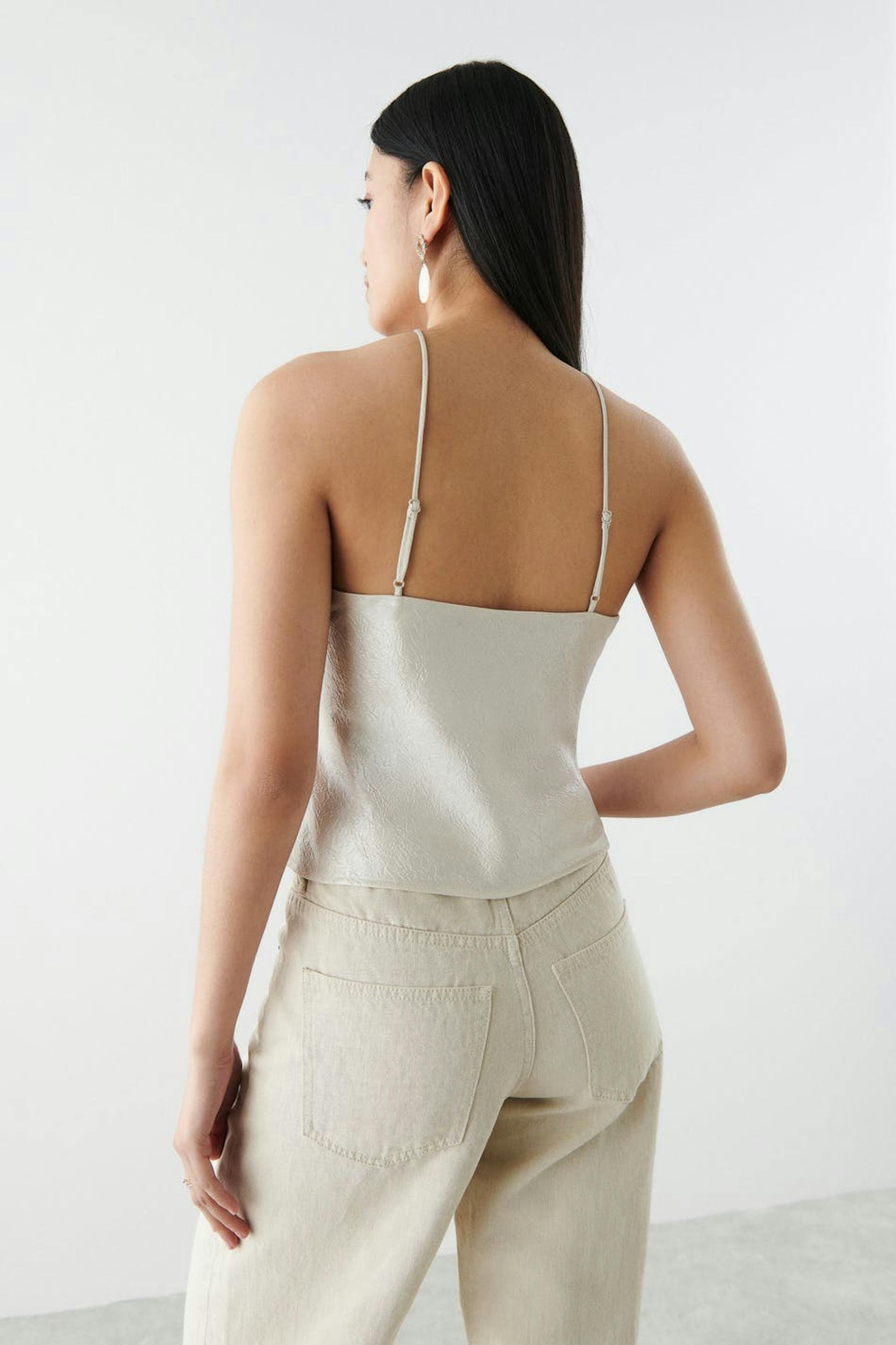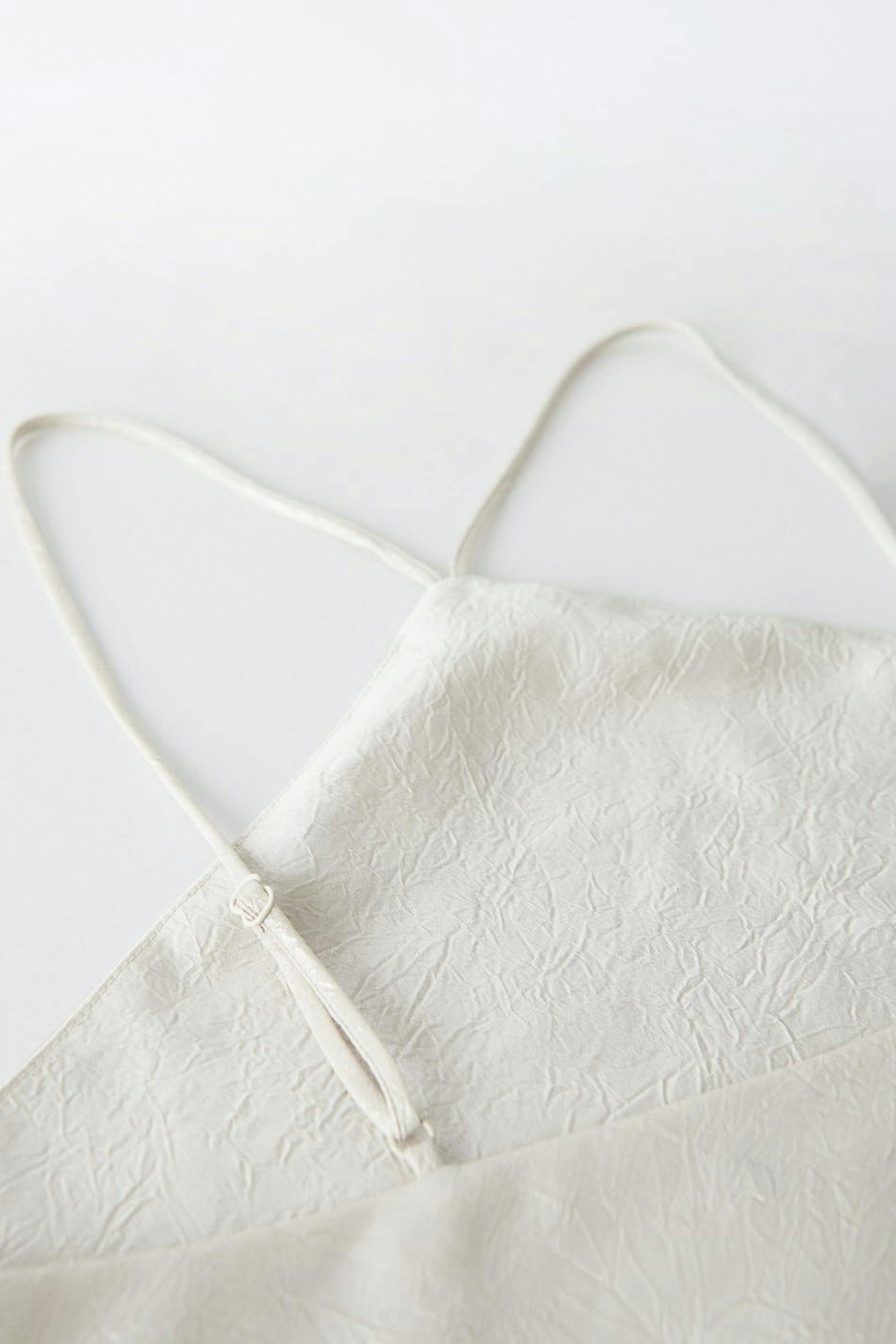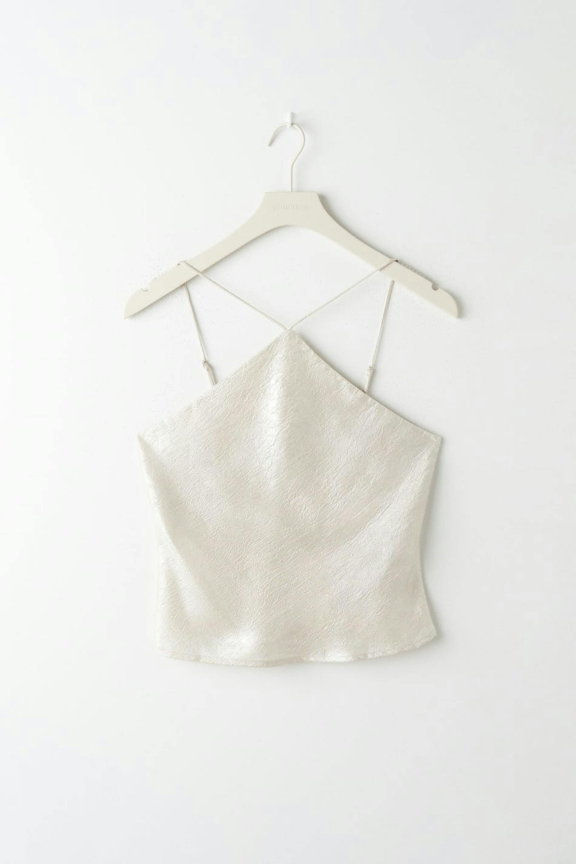 Tank met dunne en aanpasbare schouderriemen. De tank is perfect voor het feest en zilverkleurig en heeft een glimmend en gekreukt materiaal.