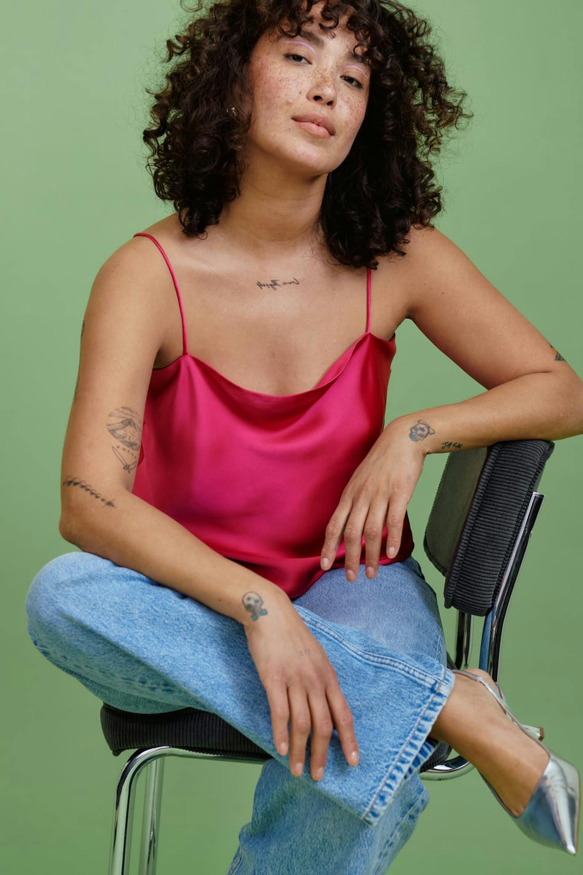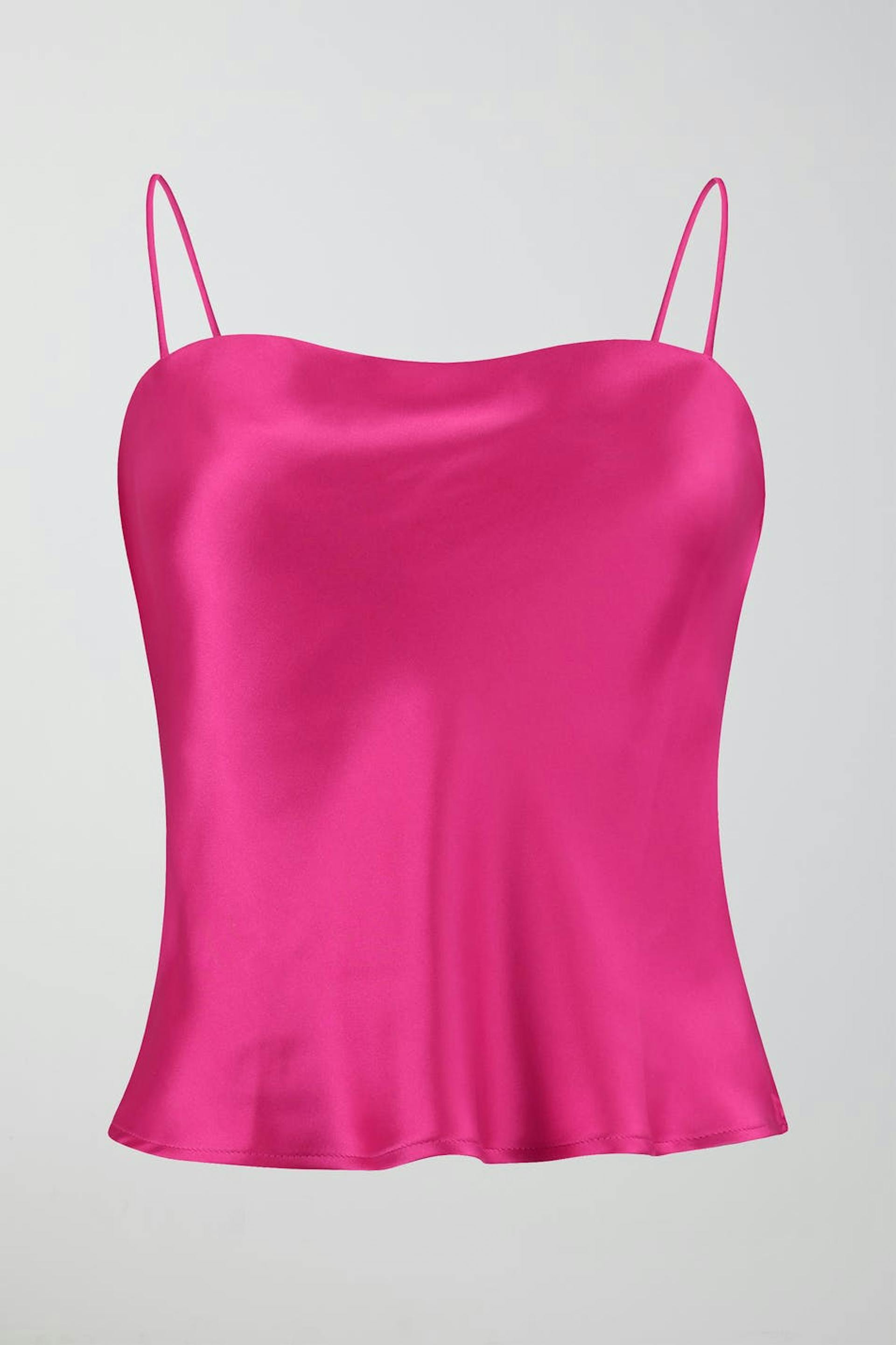 Hemdje van satijn met dunne en aanpasbare schouderriemen. Het hemdje is roze en heeft een glimmende kwaliteit.