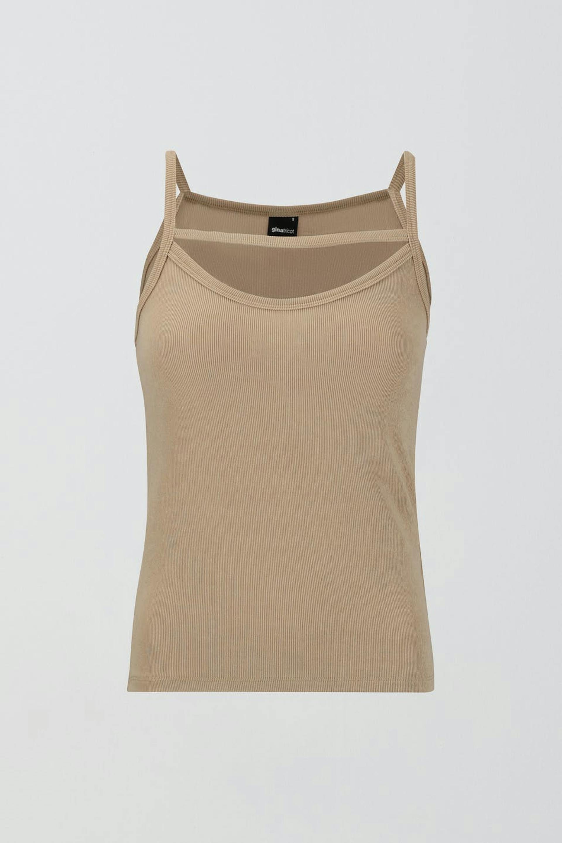 Geribbeld hemdje van tricot met nauwsluitende pasvorm. Het hemdje is beige en heeft dunne schouderriemen.