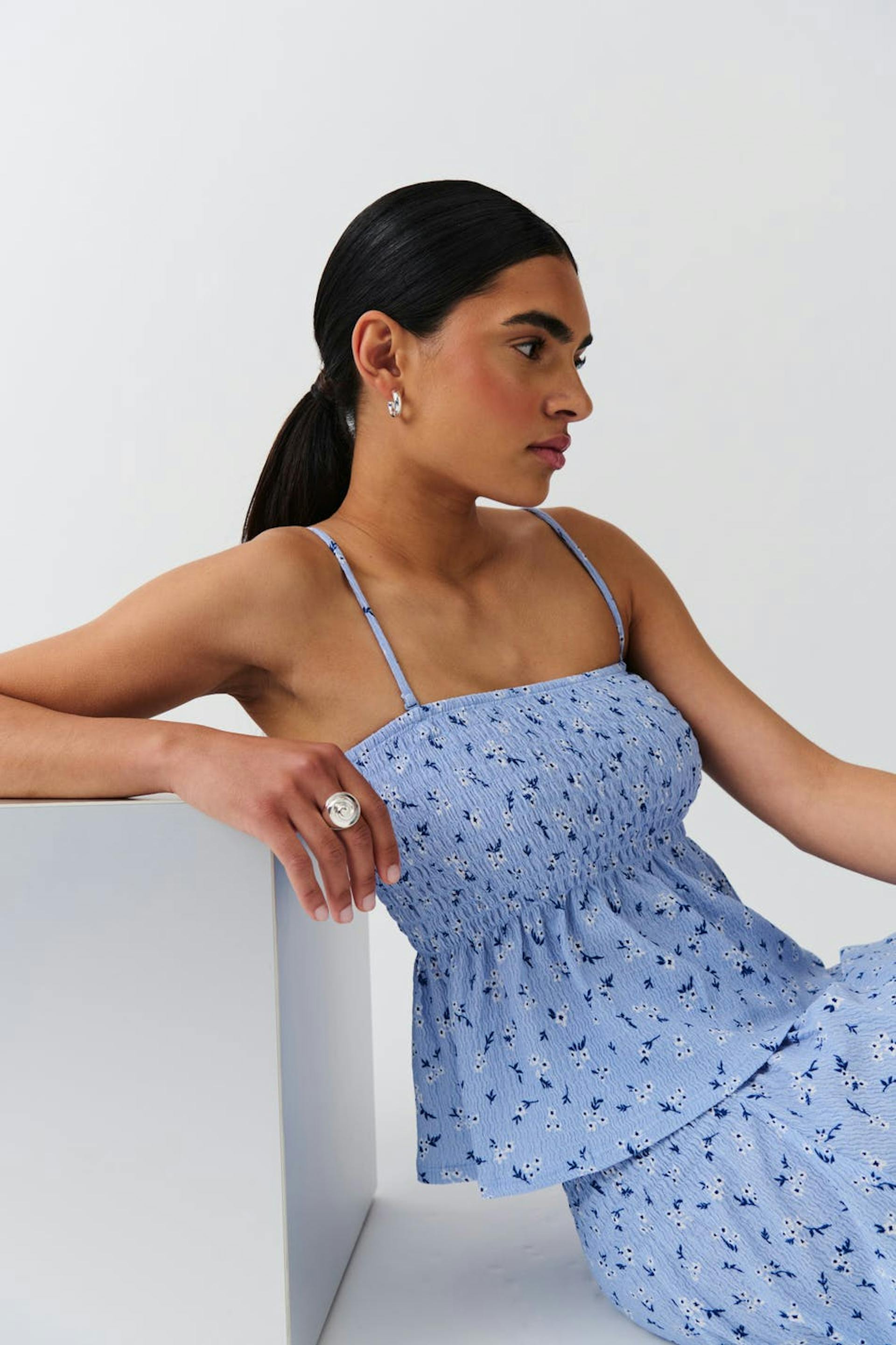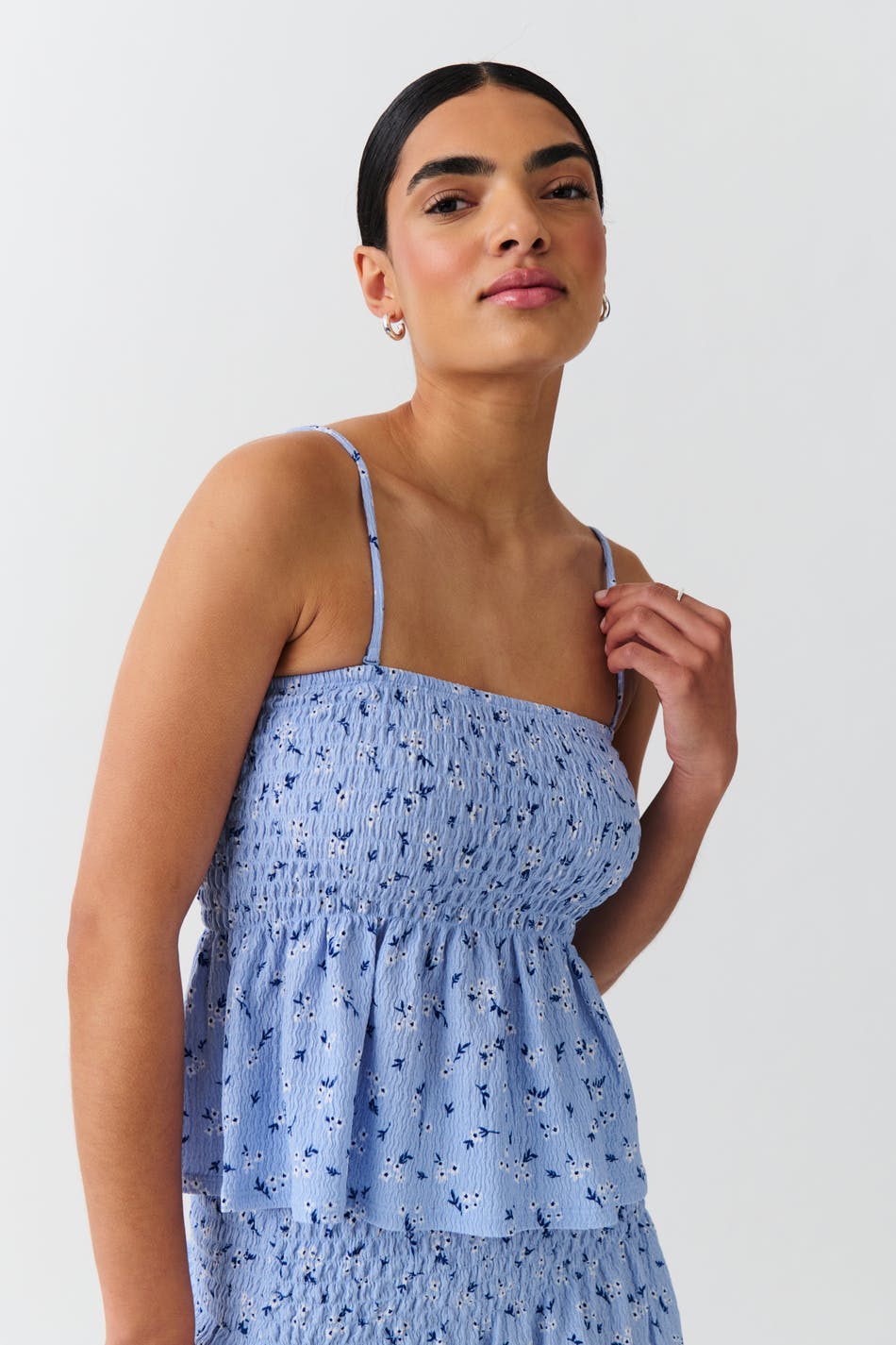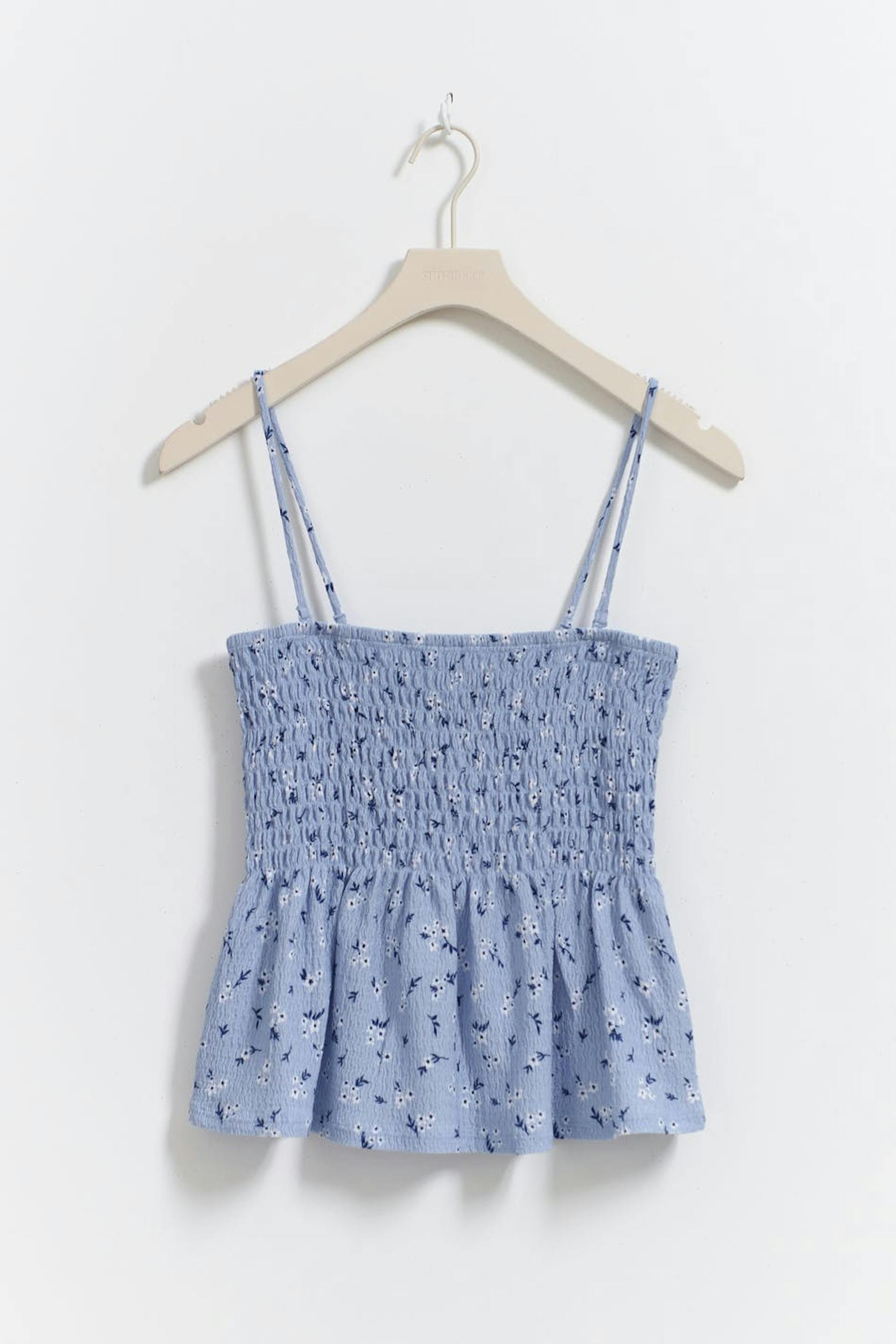Topje met een normale pasvorm. Het topje is blauw en heeft een smokwerk op de borst met verwijderbare en verstelbare schouderriemen.