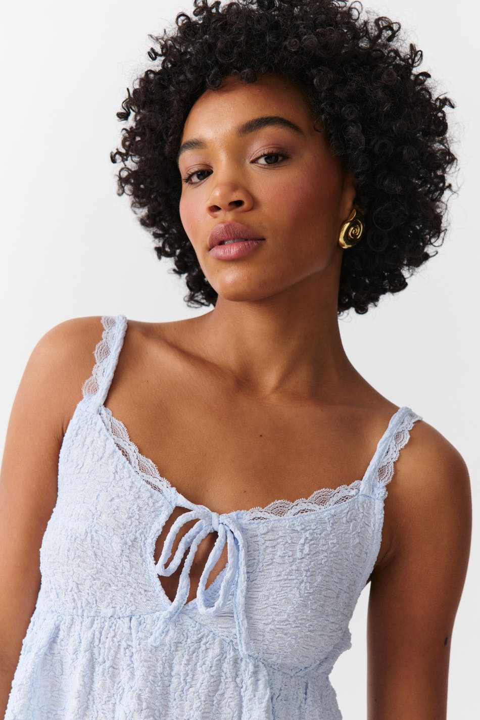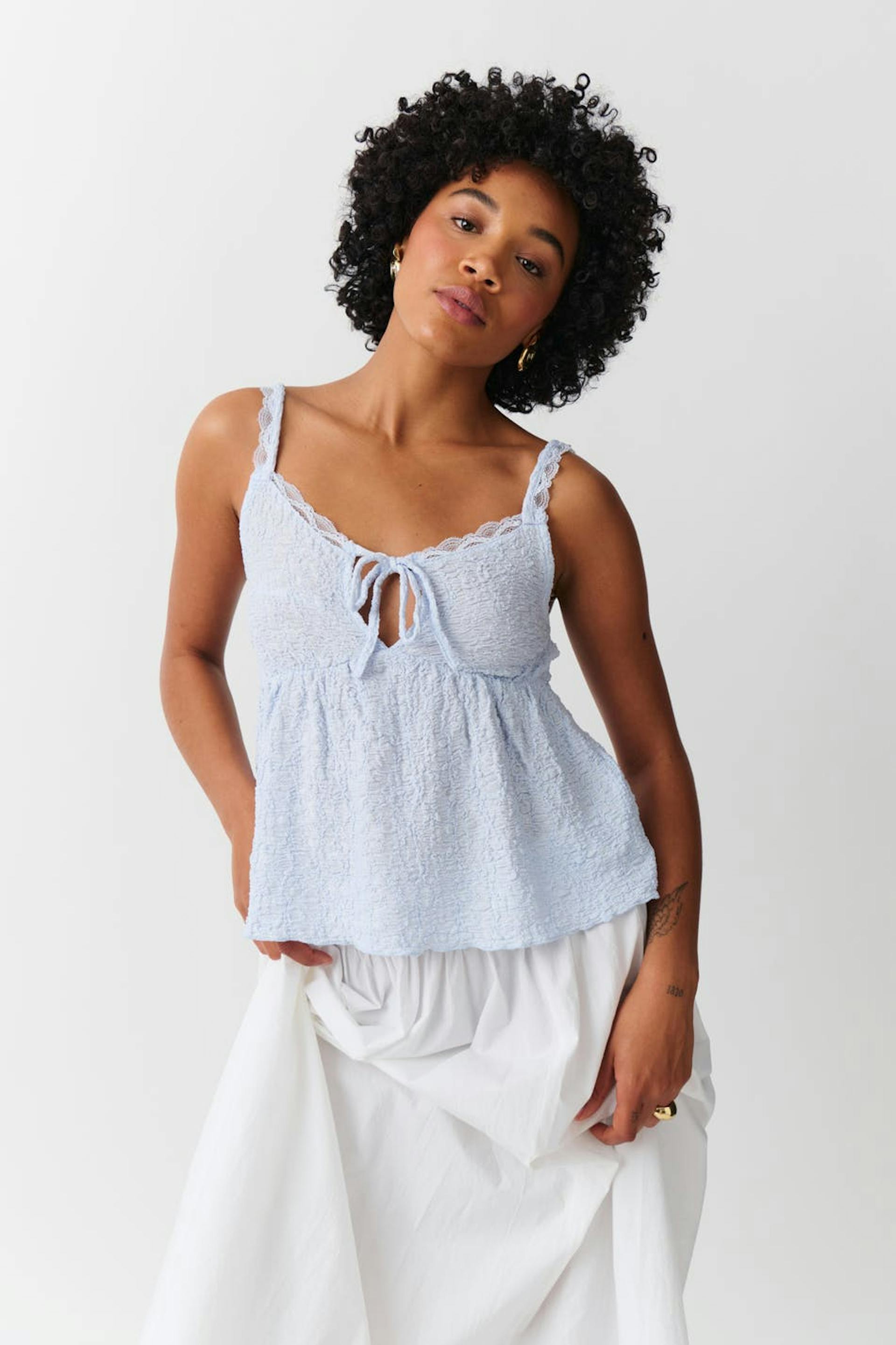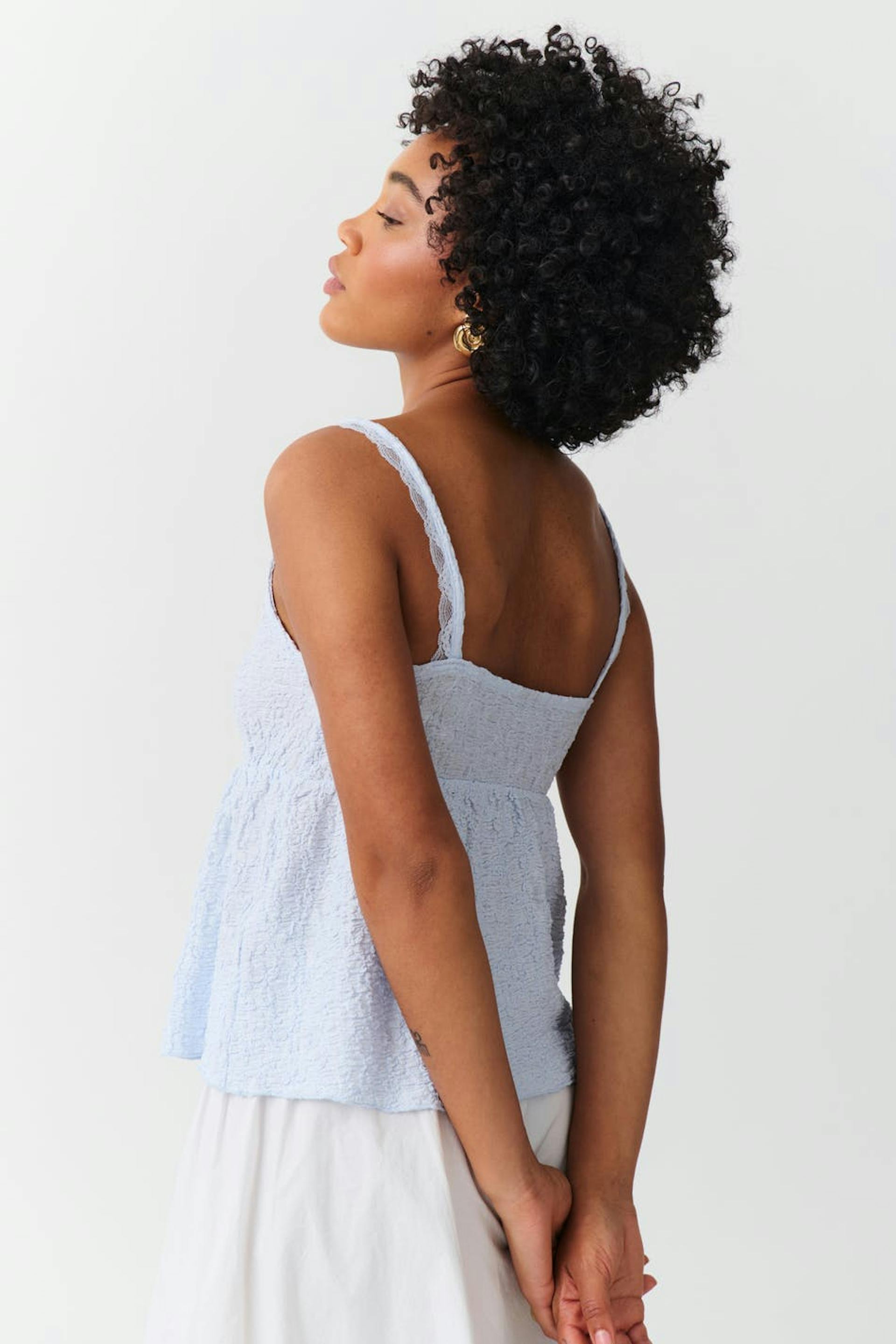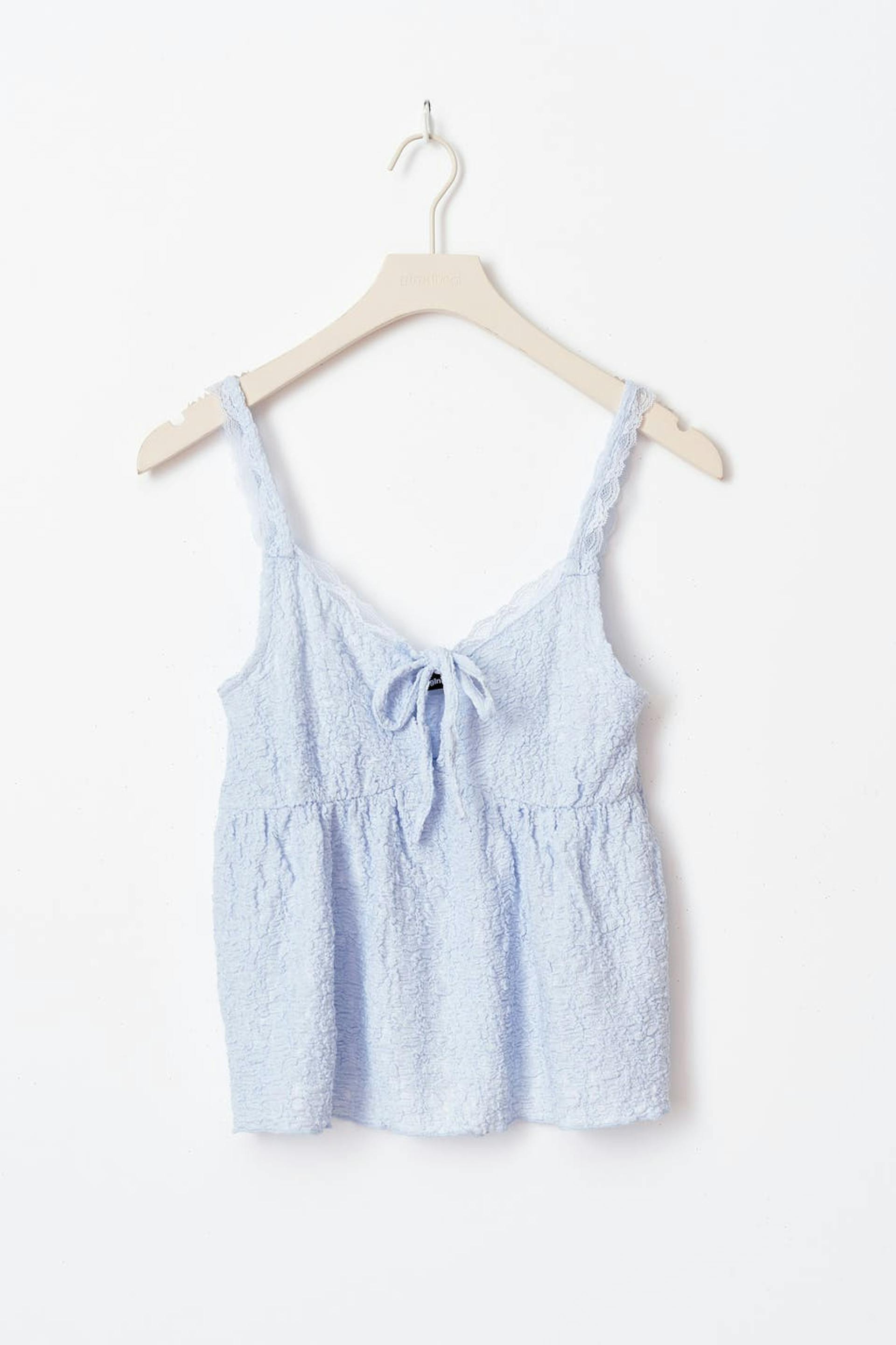 Gestructureerd hemdje met kant aan de halslijn. Het hemdje is blauw en heeft diepe neklijn met das-detail. Het heeft normale pasvorm, schouderriemen met een veter, gerimpelde naad onder de boezem en normale lengte.