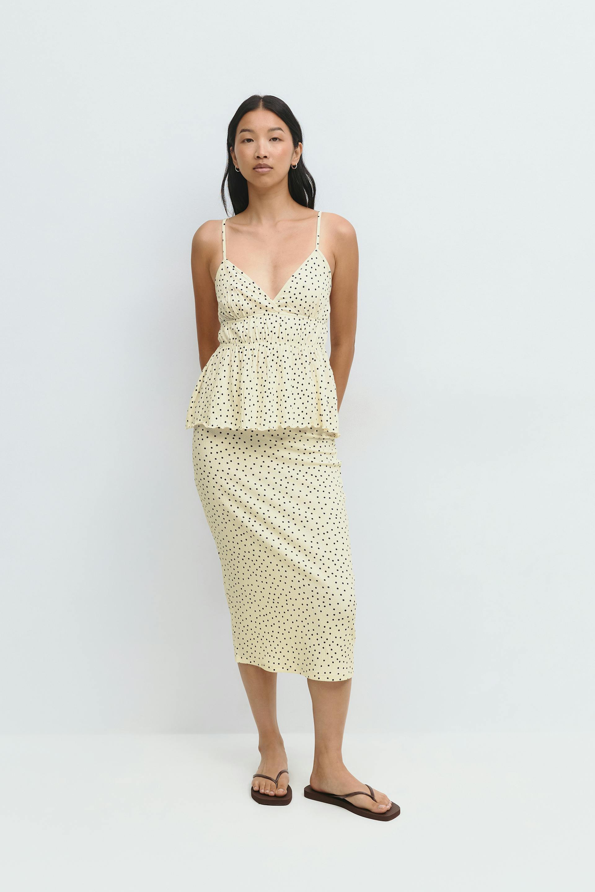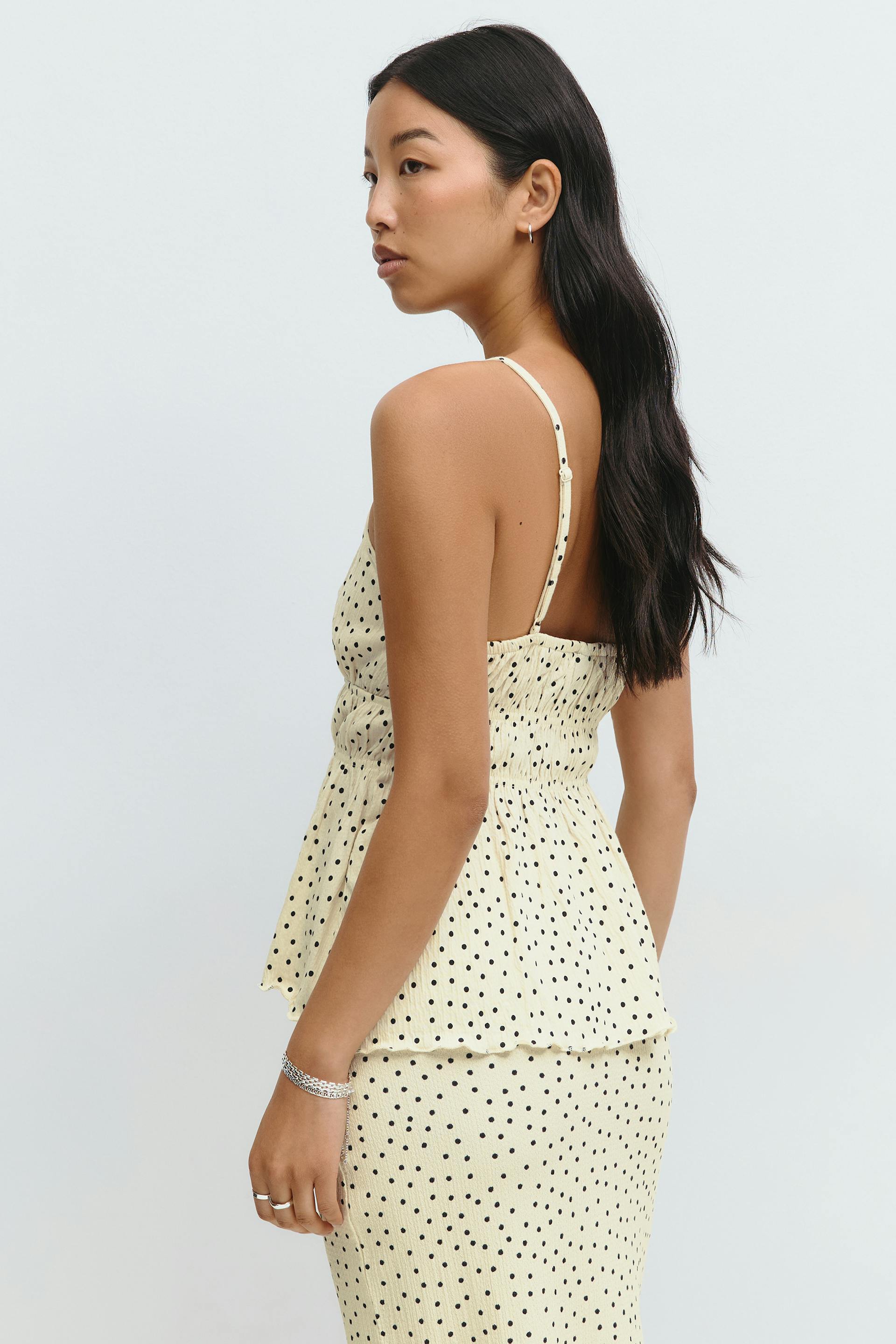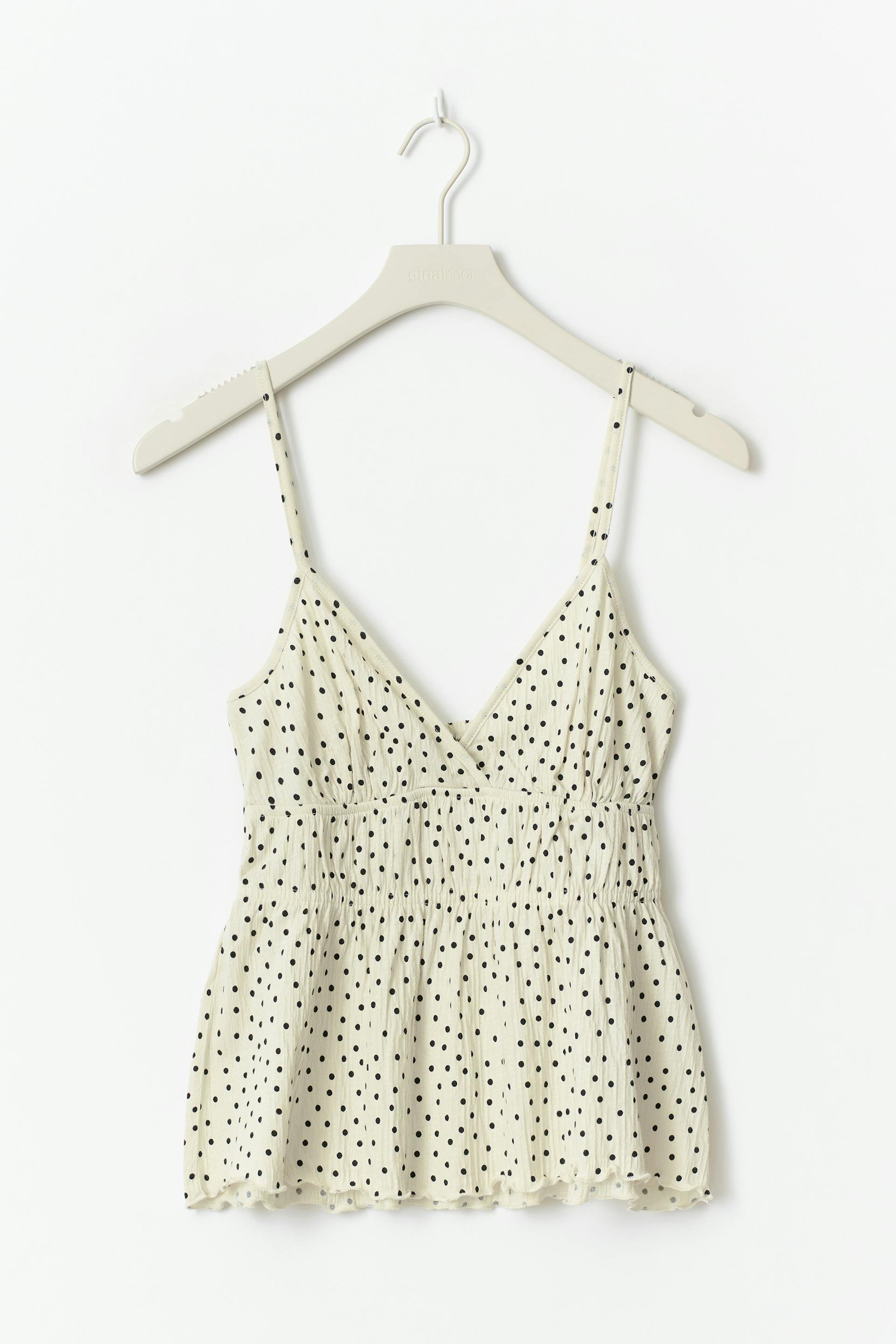 Gestippeld hemdje met diepe V-hals. Het hemdje heeft gesmokte taille. Het heeft verstelbare schouderriemen en normale pasvorm.