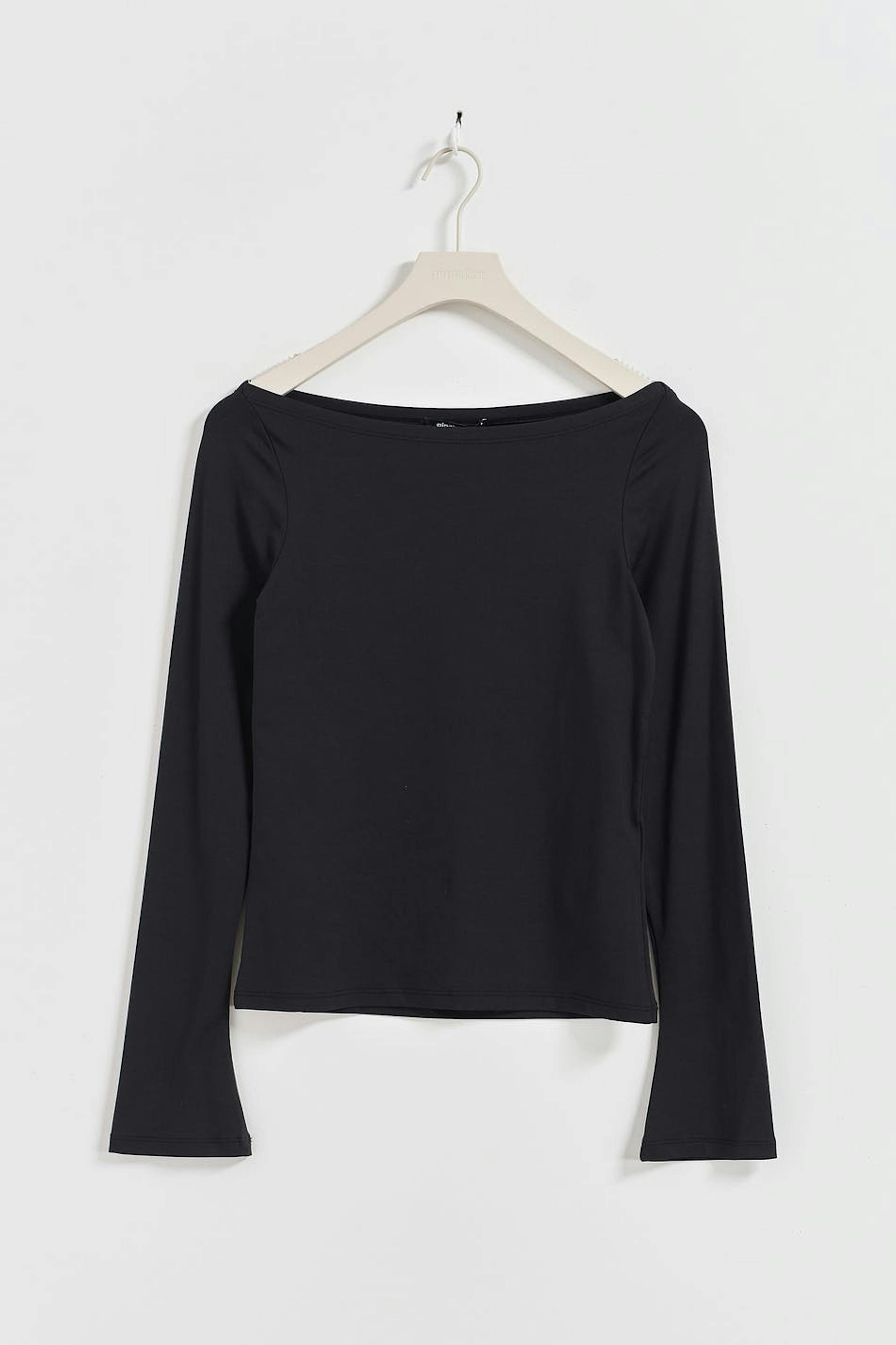 Topje met lange mouwen van tricot met boot halslijn. Het topje is zwart en heeft elastische kwaliteit. Het heeft nauwsluitende pasvorm.